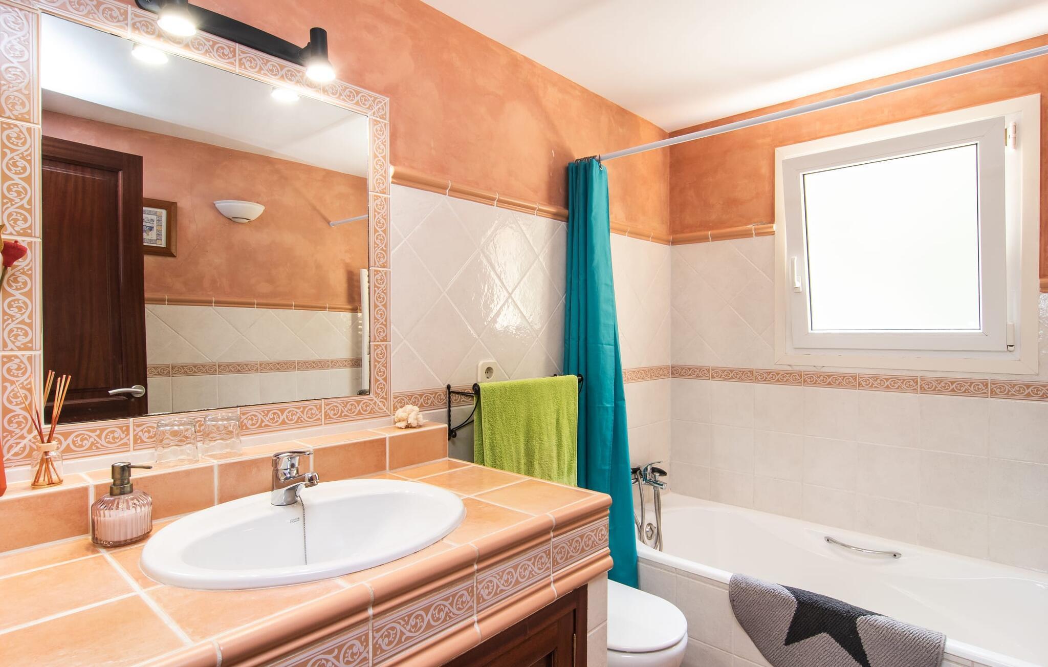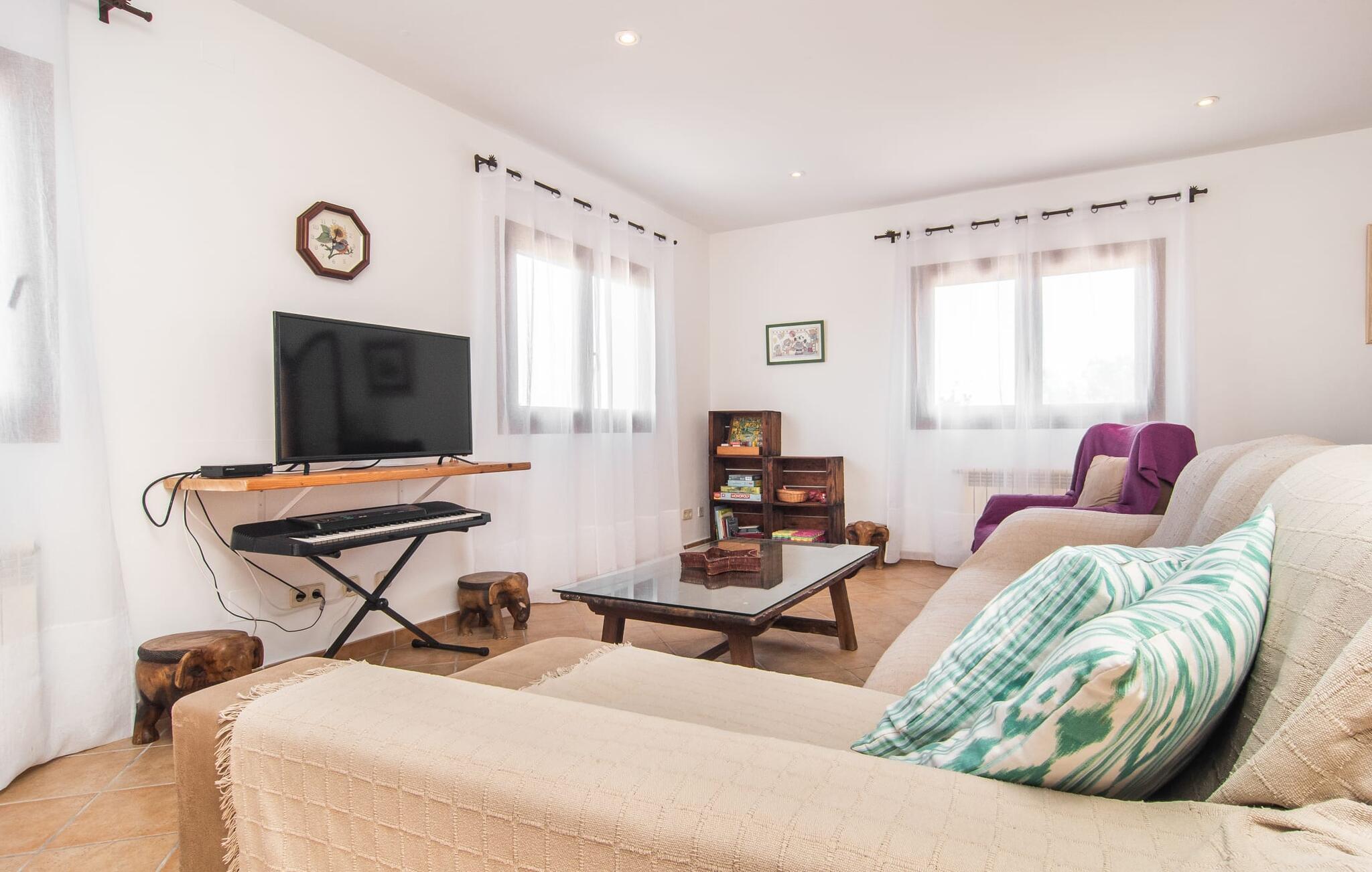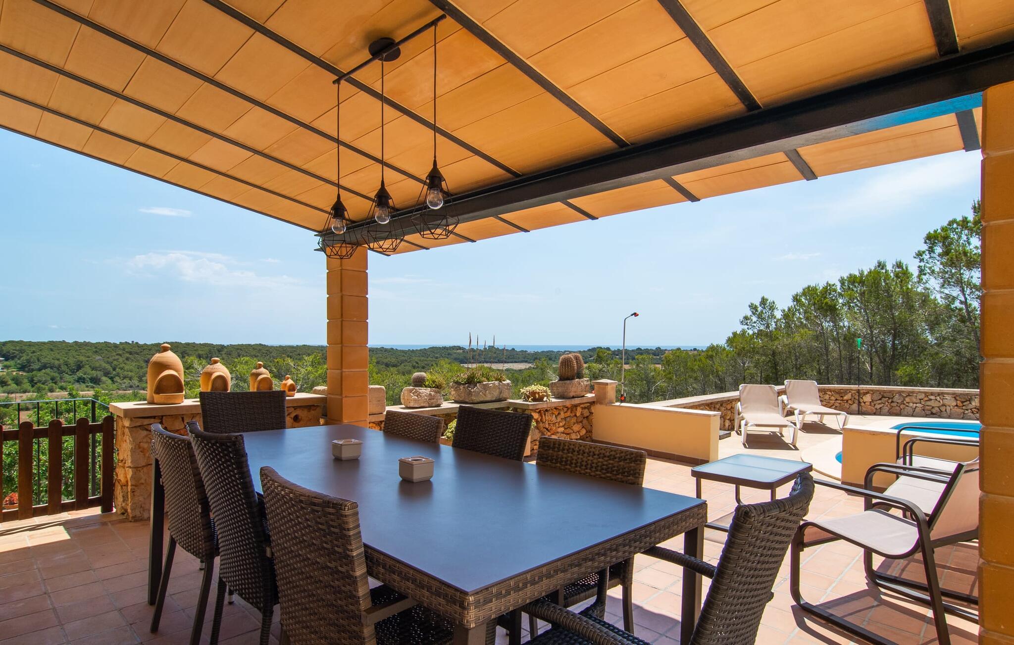 Det enestående kendetegn ved denne bondegård i det sydlige Mallorca er dens høje beliggenhed, som er ledsaget af en enestående panoramaudsigt. Fra de smukke terrasser, der strækker sig lige foran huset, kan man se havet i det fjerne. Når I spiser udendørs, har I valget mellem overdækket eller åbent rum og afstanden til huset er behagelig kort. Den organisk formede, lavvandede pool og den tilstødende solterrasse er særligt attraktive på varme dage og byder på flere komfortable liggestole. Gamle træer, herunder store fyrretræer, giver behagelig naturlig skygge afhængig af solens position. Beliggenheden i naturreservatet bringer afslappende fred og idyl til denne bondegård. Fra terrassen kan man gå direkte ind i husets hyggelige indretning, som er rummeligt. Store trævinduer slipper et behageligt lys ind, og komfortable møbler inviterer til afslapning. Udover en åben stue og spisestue er der en rummelig spisestue med langbord. Måltider tilberedes sammen i det fuldt udstyrede køkken, hvor I finder alt, hvad I behøver til selvforplejning. I stueetagen af denne bondegård på Mallorca er der to hyggelige dobbeltværelser og et badeværelse. Derfor finder I på øverste etage yderligere to soveværelser med dobbeltsenge og det andet badeværelse samt et praktisk vaskerum og en balkon. Stuehuset "Es Cau" ligger på en smuk bjergskråning i en absolut rolig beliggenhed i det sydlige Mallorca. Det er kun 10 minutters kørsel til den smukke fiskerlandsby Portocolom. Der er en strand- og havnepromenade samt rigtig gode barer og restauranter. Der er også flere små sandbugter og strande at opdage på den lokale kyst, herunder Cala Varques (ca. 9 km).