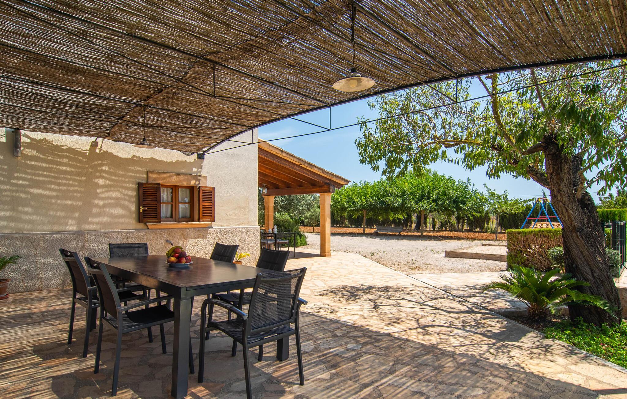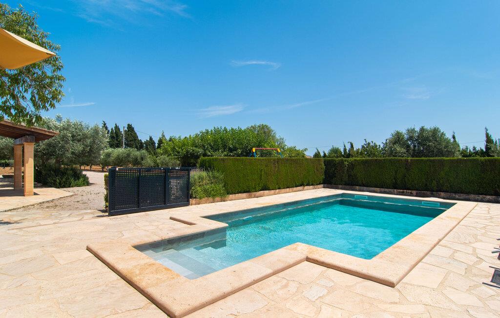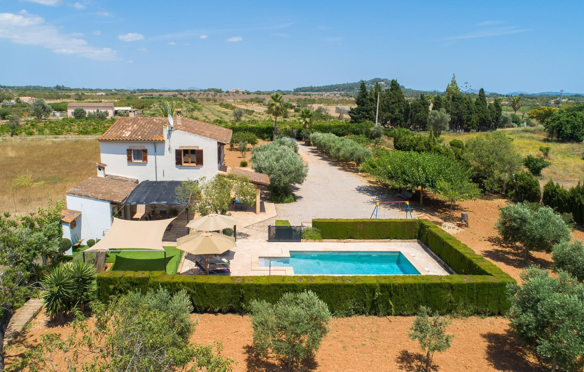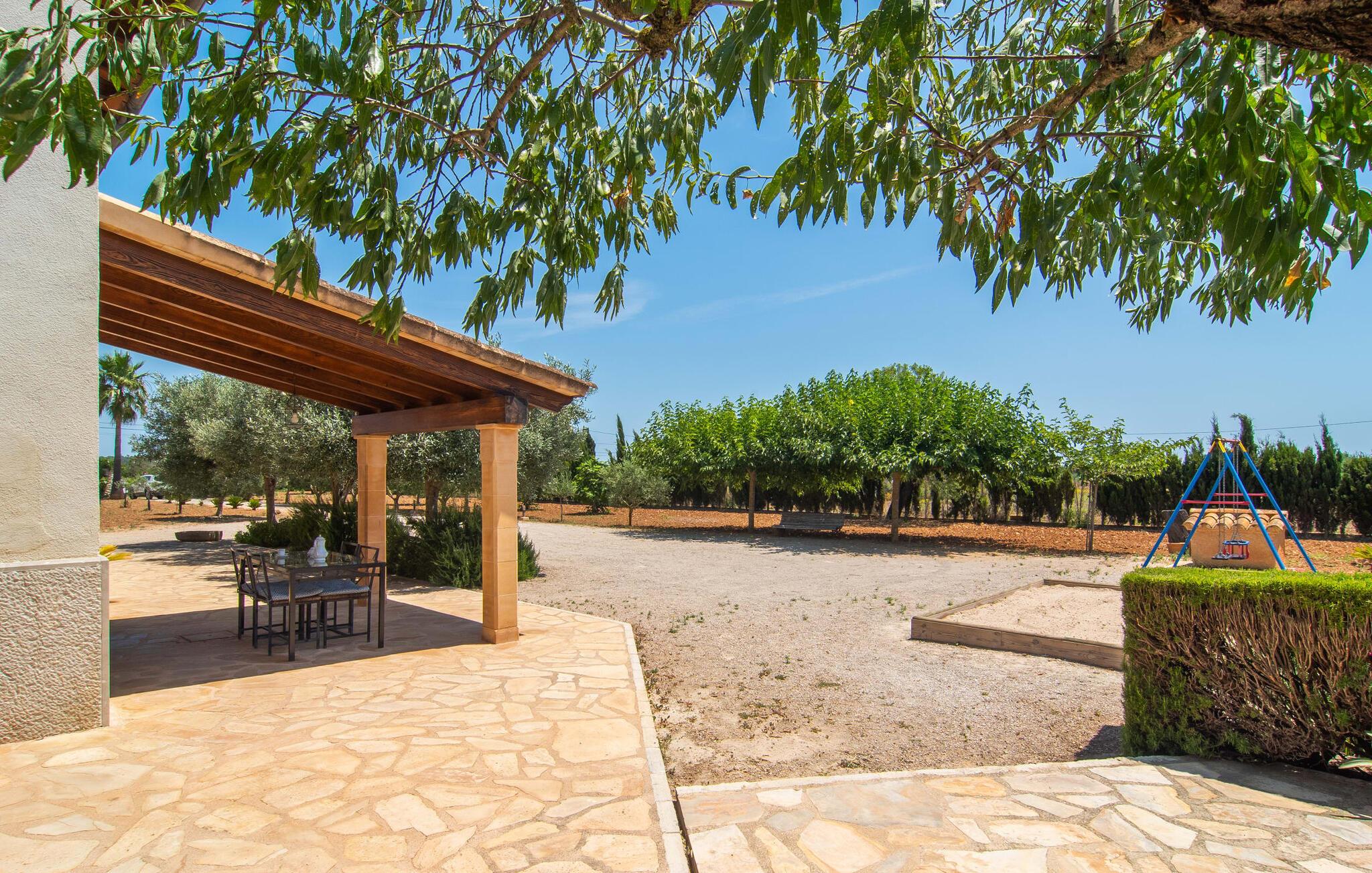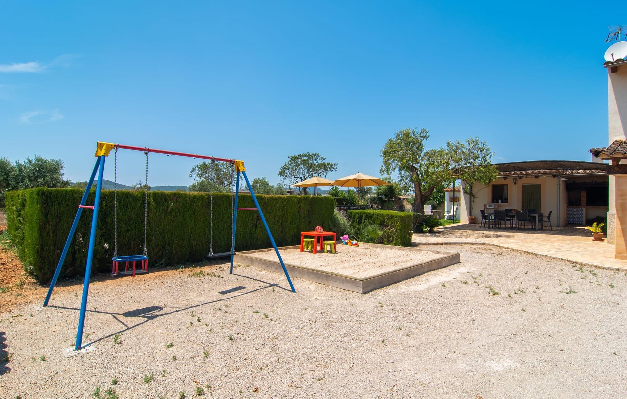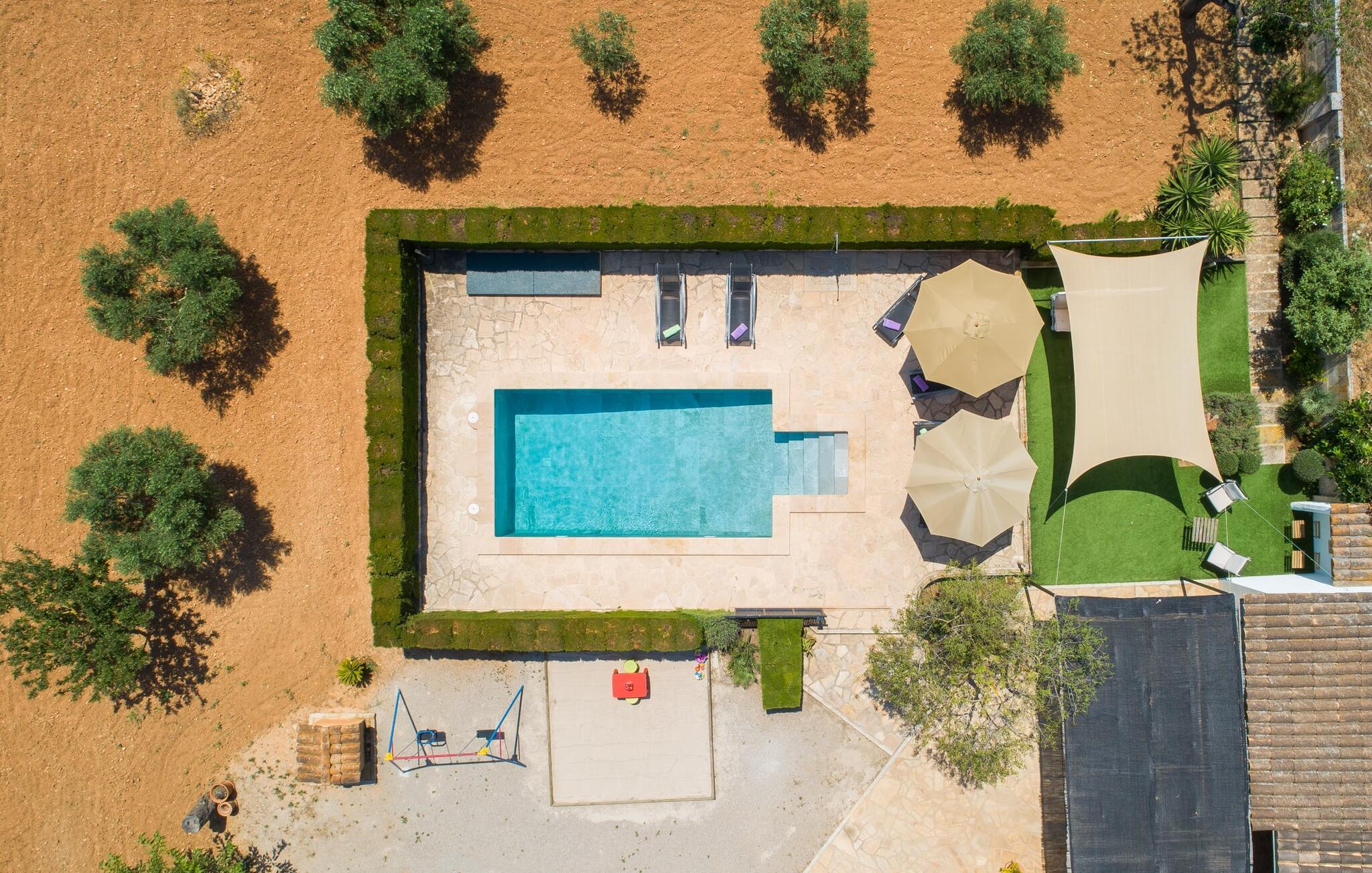 Den familievenlige villa "Es Cipres" vil glæde jer med sin smukke afsondrede beliggenhed på en 9.000 m² stor grund og, afhængigt af sæsonen, frodig vegetation. En række planter, omfattende grus- og terrassearealer samt indbydende nicher til at blive hængende giver denne ejendom en individuel charme. Rumfølelsen er imponerende og kan opleves direkte. Ved at dække huset har I mulighed for at nyde en række skønne steder at slappe af i solen eller i den luftige skygge, alt efter jeres præferencer. Komfortable liggestole inviterer jer til at slappe af og blive hængende, det samme gør de smagfulde siddeområder, hvor I kan spise sammen. Her kan I nyde den uhindrede udsigt til den dybblå morgenhimmel under morgenmaden eller lade endnu en tilfredsstillende feriedag slutte behageligt i aftenstemningen. Poolen vinkelret på villaen er sikret med et hegn til børn. Poolen er flisebelagt med smukke mosaiksten og varierer i dybden mellem 1 m og 1,90 m. Der er seks komfortable liggestole til rådighed for alle soldyrkere, og der er to parasoller til at beskytte jer mod lyse UV-stråler. Et andet skønt udendørs opholdsområde er placeret ovenpå, hvor en rummelig altan byder på en idyllisk udsigt. Forskellige legeredskaber gør det endnu mere attraktivt at tilbringe tid udendørs for vores små gæster. Det indre af villaen er smagfuldt indrettet. Lyse vægge, lofter og gulve kombineres med masser af træ og smuk belysning. Der blev brugt smagfuldt tilbehør i de rigtige proportioner, så den naturlige rumfornemmelse bevarer sine klare linjer og elegance. Forskellige buer sikrer en væsentlig harmoni af ejendommen. Husets midtpunkt er den åbne kombinerede stue/spisestue, som tilgås via en bred gang og rummer både en kæmpe spisegruppe og en lyst designet hjørnesofa med parabol-tv. På køligere aftener kan I slappe af her ved det hyggelige skær fra pejsen og varmen fra et bål. En anden spiseplads er i det rummelige og stilfulde køkken, som er fuldt udstyret og tilbyder gæsterne køleskab, ovn, gaskomfur, opvaskemaskine, Melitta kaffemaskine, elkedel og masser af opbevaringsplads. Her blev der også installeret en pejs, som giver ekstra hygge. Smukt designede soveværelser med et individuelt præg inviterer jer til en afslappende søvn. Behagelige farver kombineret med elegante møbler skaber en hyggelig atmosfære. De rummelige badeværelser er smagfuldt designet og udstyret med indretning af høj kvalitet. Et strygejern og en hårtørrer er til rådighed i huset, så I behøver ikke at tage dem med. Den lille, ret søvnige by Porreres ligger midt mellem marker, vinmarker og abrikosplantager. Kører I til Porreres en tirsdag morgen, vil I hurtigt bemærke, at halvdelen af landsbyen er på vej til det ugentlige marked. Udover frugt og grønt kan I også købe husholdningsartikler, tøj og sko der. De forskelligartede markedsboder strækker sig fra hovedtorvet ind i de smallere gader. Strandene på øst- og sydkysten kan nemt nås med bil, hvilket gør det til en afslappende dag på stranden. Den hyggelige villa "Es Cipres" ligger på en rummelig ejendom i et afsidesliggende landområde nær Porreres. Det er beliggende på en flad børnevenlig grund. Porreres ligger lige under hovedvejen mellem Llucmajor og Felanitx. I kan tilbringe en smuk dag ved havet, for eksempel i den lille havneby Colonia de Sant Jordi.