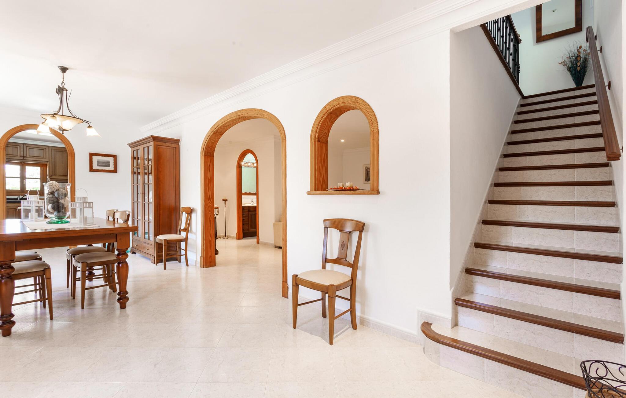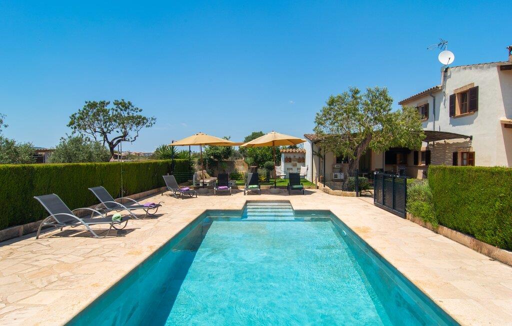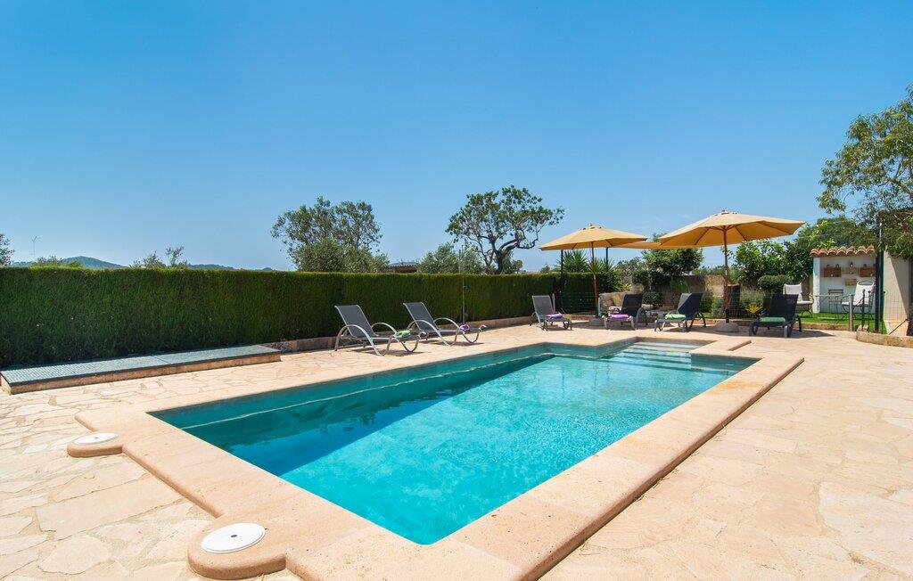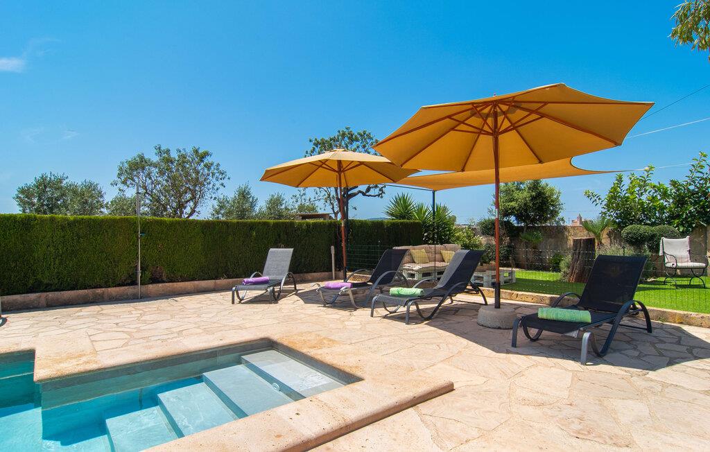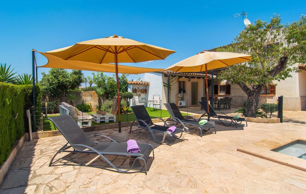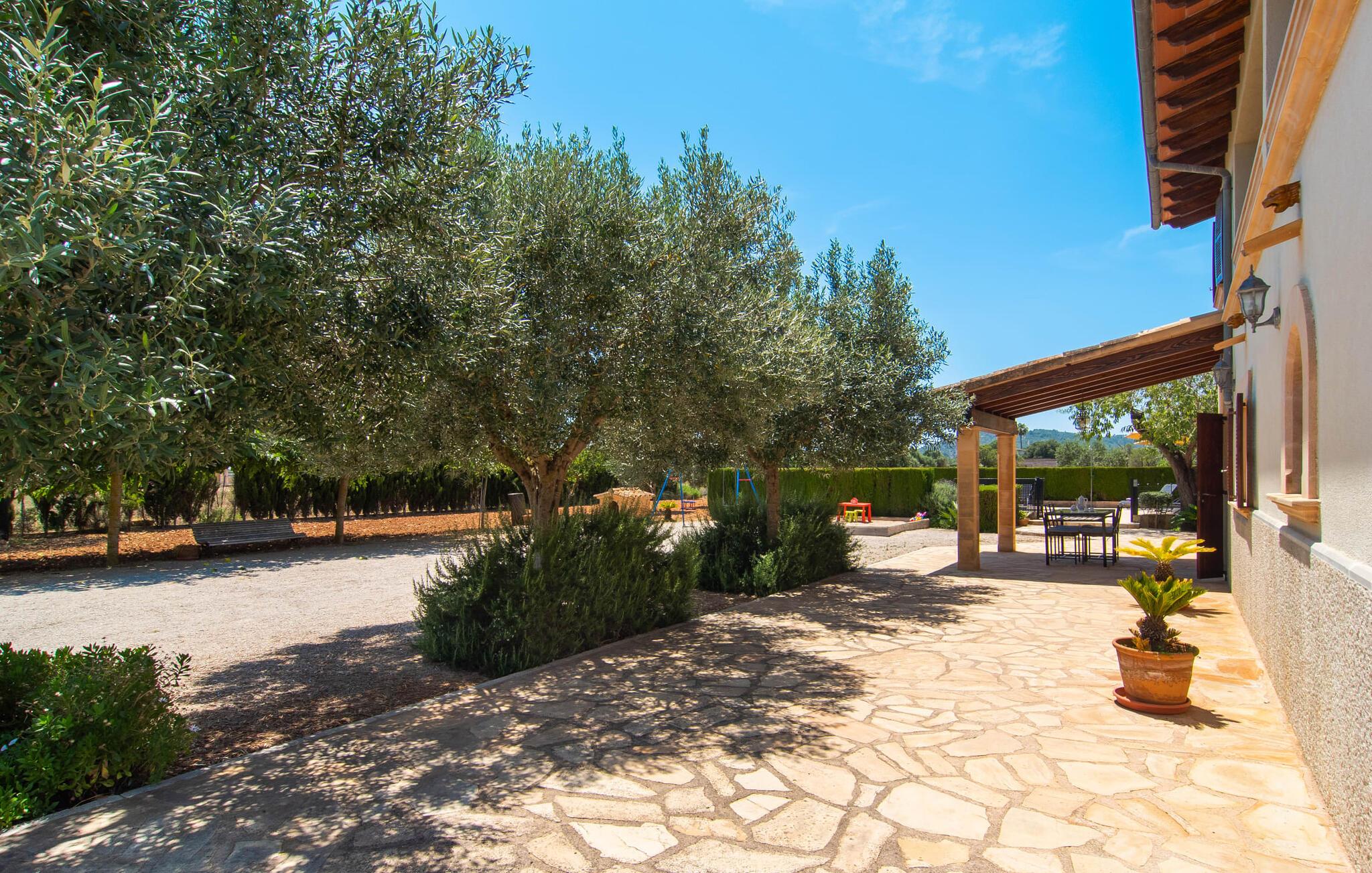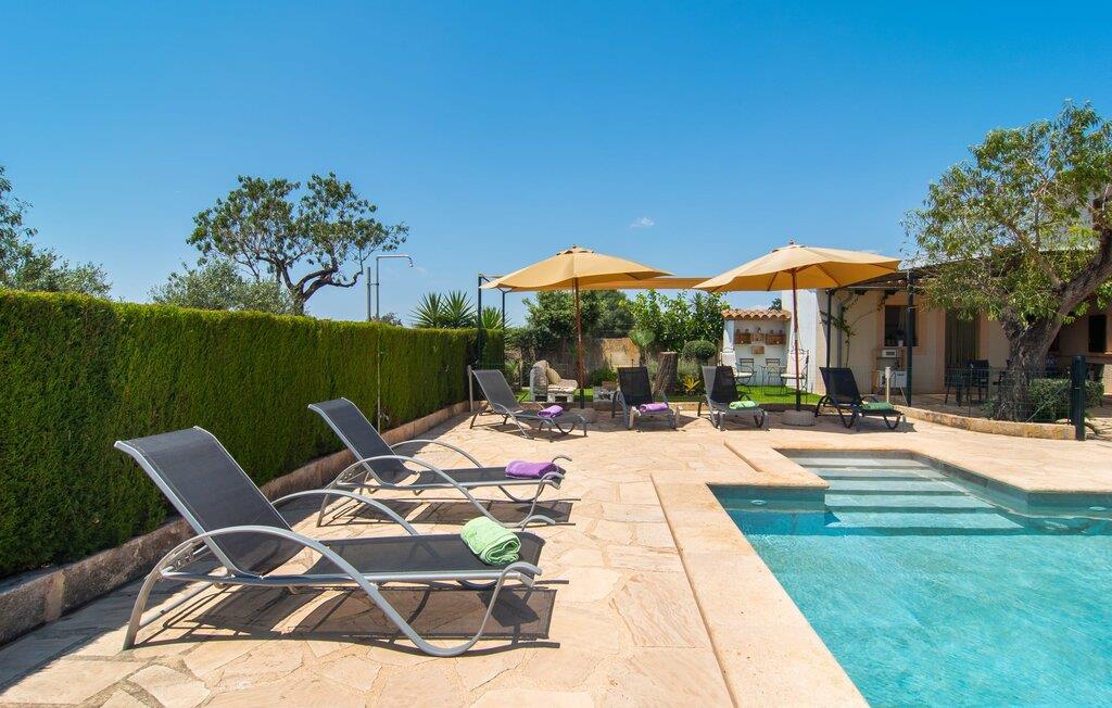 Den familievenlige villa "Es Cipres" vil glæde jer med sin smukke afsondrede beliggenhed på en 9.000 m² stor grund og, afhængigt af sæsonen, frodig vegetation. En række planter, omfattende grus- og terrassearealer samt indbydende nicher til at blive hængende giver denne ejendom en individuel charme. Rumfølelsen er imponerende og kan opleves direkte. Ved at dække huset har I mulighed for at nyde en række skønne steder at slappe af i solen eller i den luftige skygge, alt efter jeres præferencer. Komfortable liggestole inviterer jer til at slappe af og blive hængende, det samme gør de smagfulde siddeområder, hvor I kan spise sammen. Her kan I nyde den uhindrede udsigt til den dybblå morgenhimmel under morgenmaden eller lade endnu en tilfredsstillende feriedag slutte behageligt i aftenstemningen. Poolen vinkelret på villaen er sikret med et hegn til børn. Poolen er flisebelagt med smukke mosaiksten og varierer i dybden mellem 1 m og 1,90 m. Der er seks komfortable liggestole til rådighed for alle soldyrkere, og der er to parasoller til at beskytte jer mod lyse UV-stråler. Et andet skønt udendørs opholdsområde er placeret ovenpå, hvor en rummelig altan byder på en idyllisk udsigt. Forskellige legeredskaber gør det endnu mere attraktivt at tilbringe tid udendørs for vores små gæster. Det indre af villaen er smagfuldt indrettet. Lyse vægge, lofter og gulve kombineres med masser af træ og smuk belysning. Der blev brugt smagfuldt tilbehør i de rigtige proportioner, så den naturlige rumfornemmelse bevarer sine klare linjer og elegance. Forskellige buer sikrer en væsentlig harmoni af ejendommen. Husets midtpunkt er den åbne kombinerede stue/spisestue, som tilgås via en bred gang og rummer både en kæmpe spisegruppe og en lyst designet hjørnesofa med parabol-tv. På køligere aftener kan I slappe af her ved det hyggelige skær fra pejsen og varmen fra et bål. En anden spiseplads er i det rummelige og stilfulde køkken, som er fuldt udstyret og tilbyder gæsterne køleskab, ovn, gaskomfur, opvaskemaskine, Melitta kaffemaskine, elkedel og masser af opbevaringsplads. Her blev der også installeret en pejs, som giver ekstra hygge. Smukt designede soveværelser med et individuelt præg inviterer jer til en afslappende søvn. Behagelige farver kombineret med elegante møbler skaber en hyggelig atmosfære. De rummelige badeværelser er smagfuldt designet og udstyret med indretning af høj kvalitet. Et strygejern og en hårtørrer er til rådighed i huset, så I behøver ikke at tage dem med. Den lille, ret søvnige by Porreres ligger midt mellem marker, vinmarker og abrikosplantager. Kører I til Porreres en tirsdag morgen, vil I hurtigt bemærke, at halvdelen af landsbyen er på vej til det ugentlige marked. Udover frugt og grønt kan I også købe husholdningsartikler, tøj og sko der. De forskelligartede markedsboder strækker sig fra hovedtorvet ind i de smallere gader. Strandene på øst- og sydkysten kan nemt nås med bil, hvilket gør det til en afslappende dag på stranden. Den hyggelige villa "Es Cipres" ligger på en rummelig ejendom i et afsidesliggende landområde nær Porreres. Det er beliggende på en flad børnevenlig grund. Porreres ligger lige under hovedvejen mellem Llucmajor og Felanitx. I kan tilbringe en smuk dag ved havet, for eksempel i den lille havneby Colonia de Sant Jordi.
