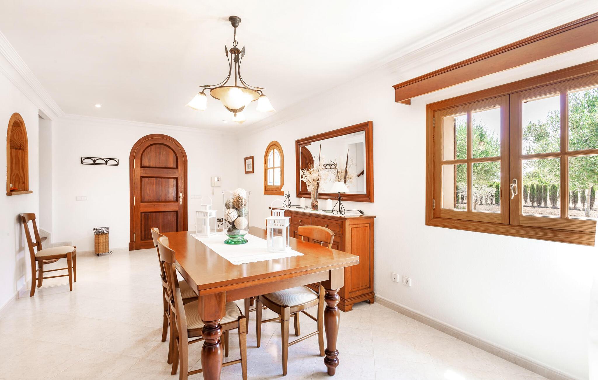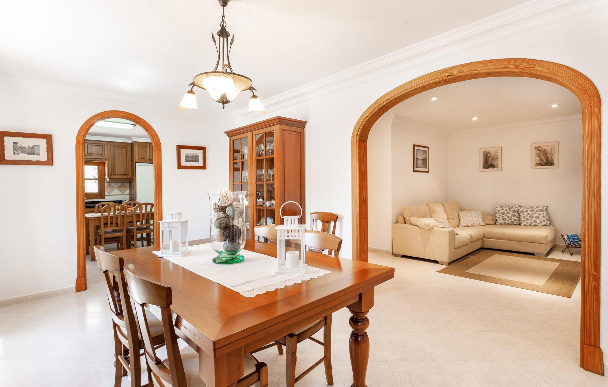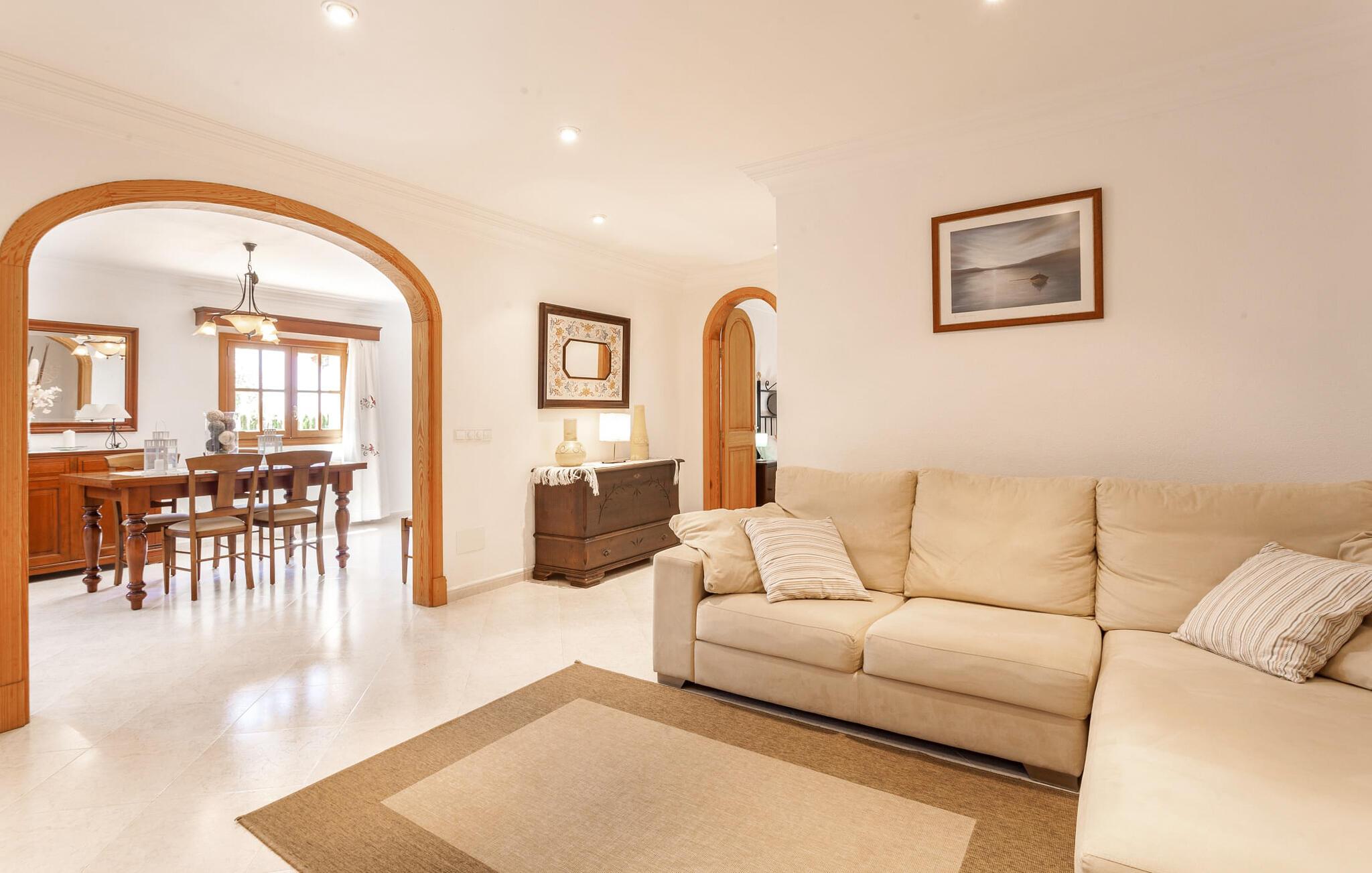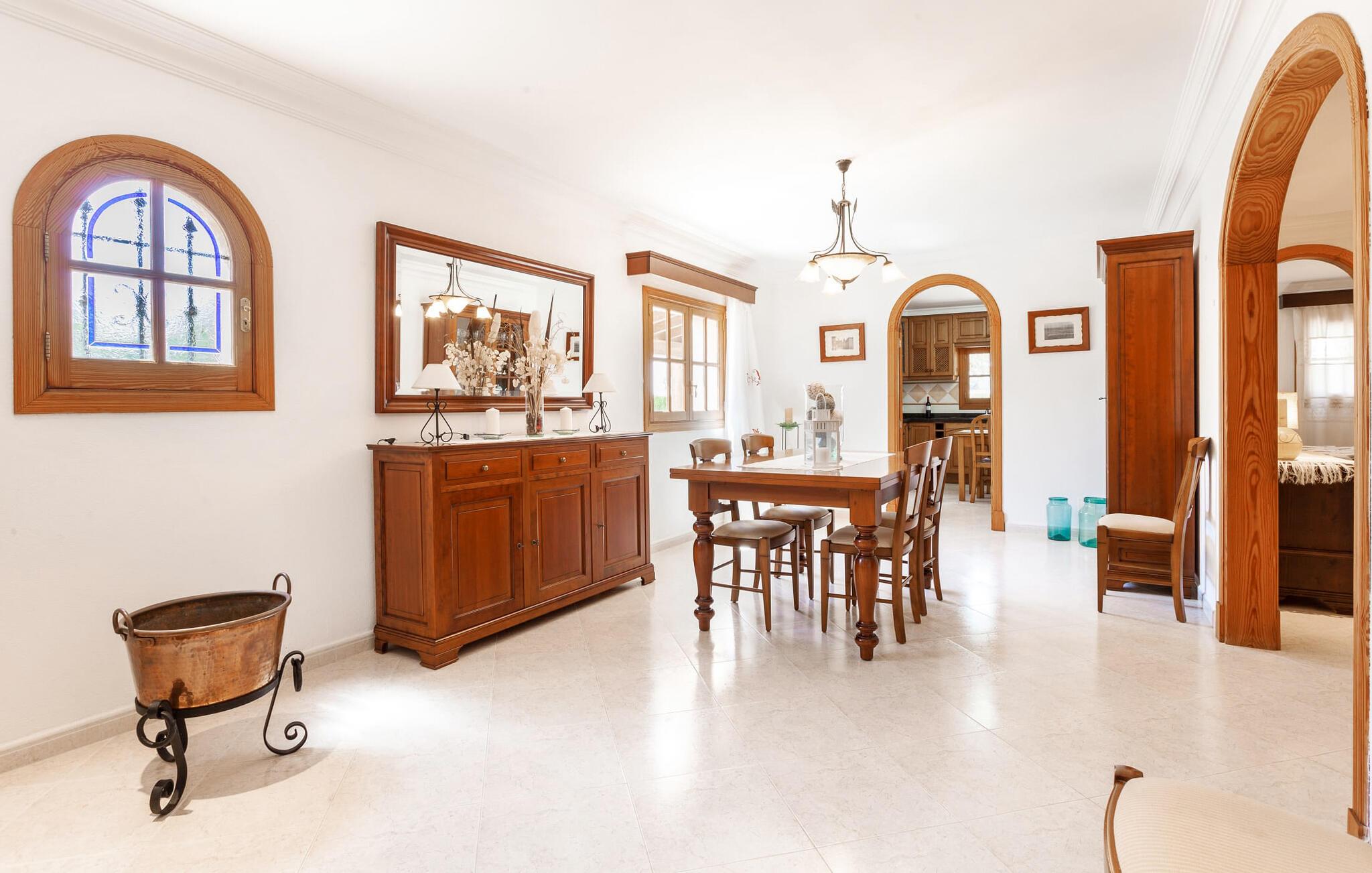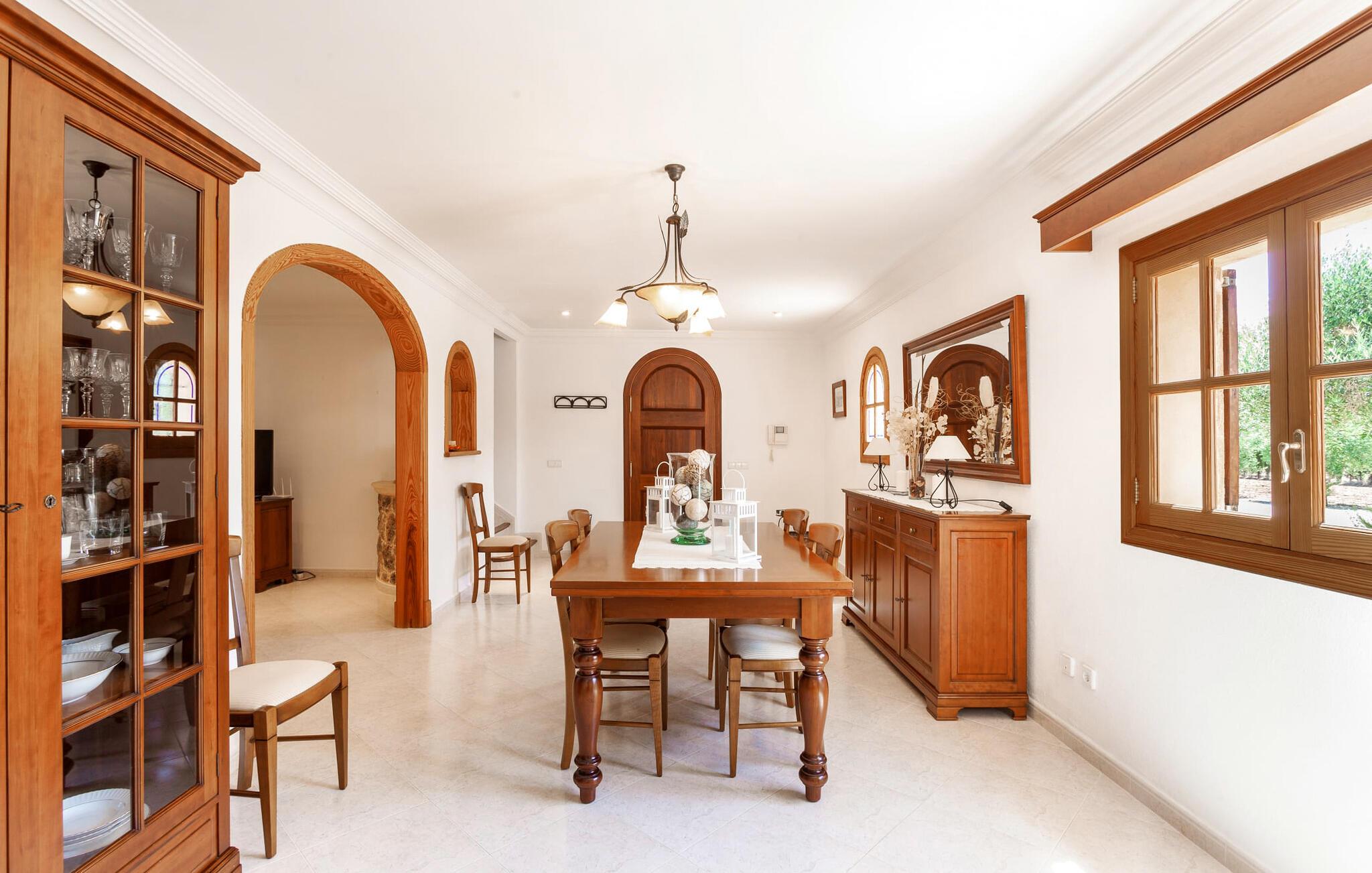 Den familievenlige villa "Es Cipres" vil glæde jer med sin smukke afsondrede beliggenhed på en 9.000 m² stor grund og, afhængigt af sæsonen, frodig vegetation. En række planter, omfattende grus- og terrassearealer samt indbydende nicher til at blive hængende giver denne ejendom en individuel charme. Rumfølelsen er imponerende og kan opleves direkte. Ved at dække huset har I mulighed for at nyde en række skønne steder at slappe af i solen eller i den luftige skygge, alt efter jeres præferencer. Komfortable liggestole inviterer jer til at slappe af og blive hængende, det samme gør de smagfulde siddeområder, hvor I kan spise sammen. Her kan I nyde den uhindrede udsigt til den dybblå morgenhimmel under morgenmaden eller lade endnu en tilfredsstillende feriedag slutte behageligt i aftenstemningen. Poolen vinkelret på villaen er sikret med et hegn til børn. Poolen er flisebelagt med smukke mosaiksten og varierer i dybden mellem 1 m og 1,90 m. Der er seks komfortable liggestole til rådighed for alle soldyrkere, og der er to parasoller til at beskytte jer mod lyse UV-stråler. Et andet skønt udendørs opholdsområde er placeret ovenpå, hvor en rummelig altan byder på en idyllisk udsigt. Forskellige legeredskaber gør det endnu mere attraktivt at tilbringe tid udendørs for vores små gæster. Det indre af villaen er smagfuldt indrettet. Lyse vægge, lofter og gulve kombineres med masser af træ og smuk belysning. Der blev brugt smagfuldt tilbehør i de rigtige proportioner, så den naturlige rumfornemmelse bevarer sine klare linjer og elegance. Forskellige buer sikrer en væsentlig harmoni af ejendommen. Husets midtpunkt er den åbne kombinerede stue/spisestue, som tilgås via en bred gang og rummer både en kæmpe spisegruppe og en lyst designet hjørnesofa med parabol-tv. På køligere aftener kan I slappe af her ved det hyggelige skær fra pejsen og varmen fra et bål. En anden spiseplads er i det rummelige og stilfulde køkken, som er fuldt udstyret og tilbyder gæsterne køleskab, ovn, gaskomfur, opvaskemaskine, Melitta kaffemaskine, elkedel og masser af opbevaringsplads. Her blev der også installeret en pejs, som giver ekstra hygge. Smukt designede soveværelser med et individuelt præg inviterer jer til en afslappende søvn. Behagelige farver kombineret med elegante møbler skaber en hyggelig atmosfære. De rummelige badeværelser er smagfuldt designet og udstyret med indretning af høj kvalitet. Et strygejern og en hårtørrer er til rådighed i huset, så I behøver ikke at tage dem med. Den lille, ret søvnige by Porreres ligger midt mellem marker, vinmarker og abrikosplantager. Kører I til Porreres en tirsdag morgen, vil I hurtigt bemærke, at halvdelen af landsbyen er på vej til det ugentlige marked. Udover frugt og grønt kan I også købe husholdningsartikler, tøj og sko der. De forskelligartede markedsboder strækker sig fra hovedtorvet ind i de smallere gader. Strandene på øst- og sydkysten kan nemt nås med bil, hvilket gør det til en afslappende dag på stranden. Den hyggelige villa "Es Cipres" ligger på en rummelig ejendom i et afsidesliggende landområde nær Porreres. Det er beliggende på en flad børnevenlig grund. Porreres ligger lige under hovedvejen mellem Llucmajor og Felanitx. I kan tilbringe en smuk dag ved havet, for eksempel i den lille havneby Colonia de Sant Jordi.