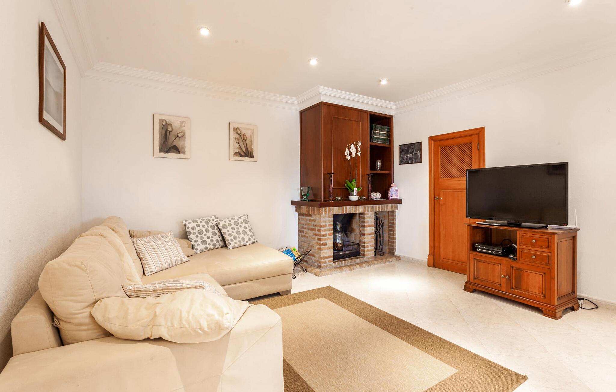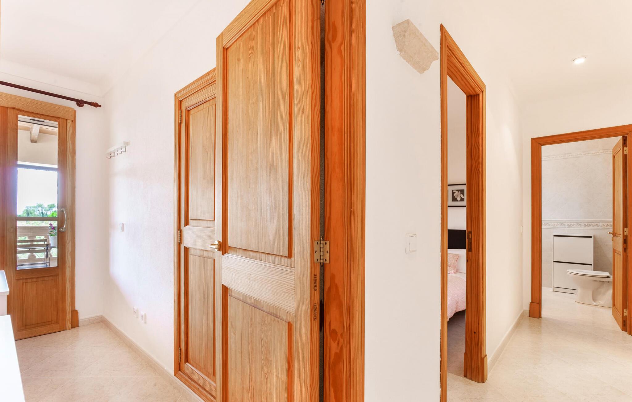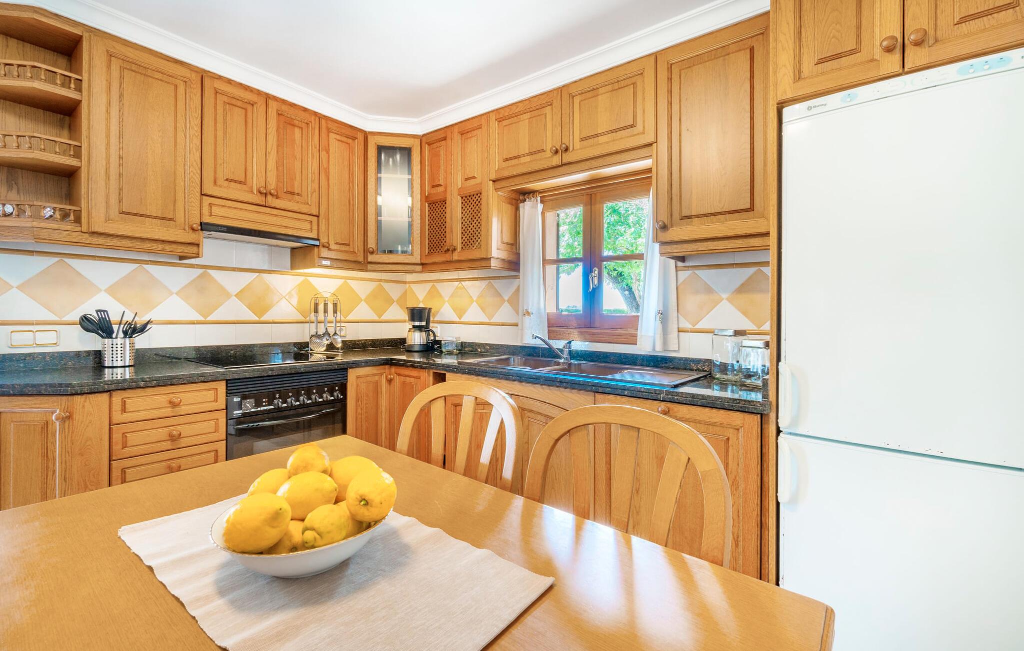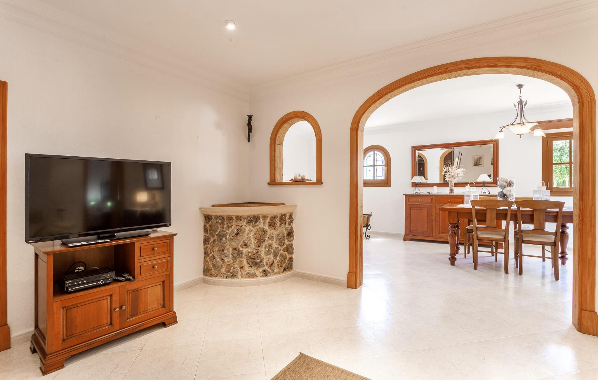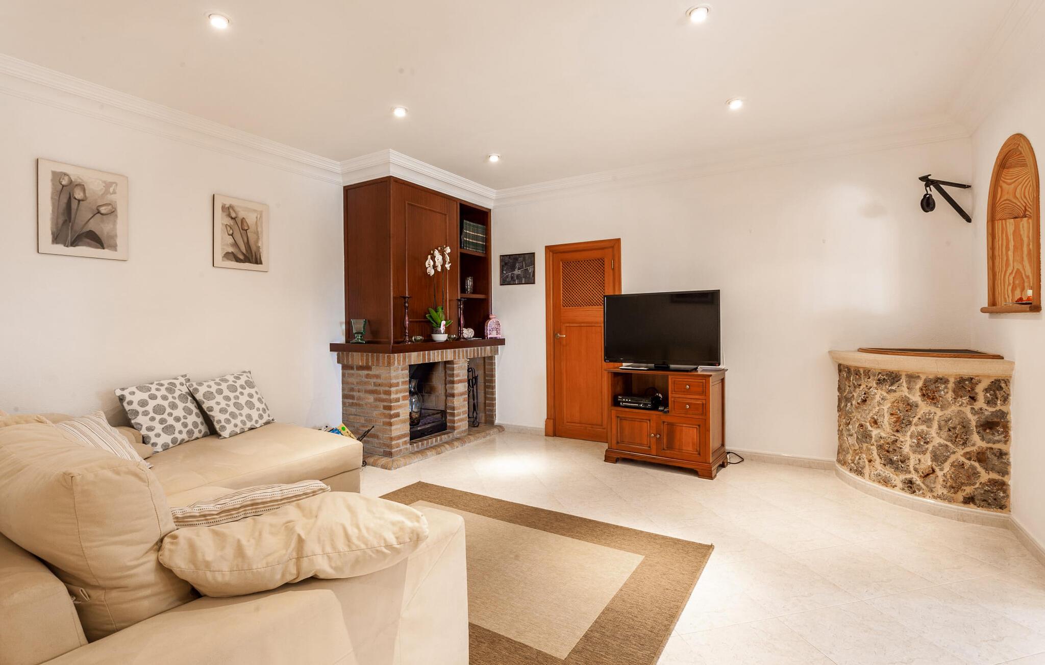 Den familievenlige villa "Es Cipres" vil glæde jer med sin smukke afsondrede beliggenhed på en 9.000 m² stor grund og, afhængigt af sæsonen, frodig vegetation. En række planter, omfattende grus- og terrassearealer samt indbydende nicher til at blive hængende giver denne ejendom en individuel charme. Rumfølelsen er imponerende og kan opleves direkte. Ved at dække huset har I mulighed for at nyde en række skønne steder at slappe af i solen eller i den luftige skygge, alt efter jeres præferencer. Komfortable liggestole inviterer jer til at slappe af og blive hængende, det samme gør de smagfulde siddeområder, hvor I kan spise sammen. Her kan I nyde den uhindrede udsigt til den dybblå morgenhimmel under morgenmaden eller lade endnu en tilfredsstillende feriedag slutte behageligt i aftenstemningen. Poolen vinkelret på villaen er sikret med et hegn til børn. Poolen er flisebelagt med smukke mosaiksten og varierer i dybden mellem 1 m og 1,90 m. Der er seks komfortable liggestole til rådighed for alle soldyrkere, og der er to parasoller til at beskytte jer mod lyse UV-stråler. Et andet skønt udendørs opholdsområde er placeret ovenpå, hvor en rummelig altan byder på en idyllisk udsigt. Forskellige legeredskaber gør det endnu mere attraktivt at tilbringe tid udendørs for vores små gæster. Det indre af villaen er smagfuldt indrettet. Lyse vægge, lofter og gulve kombineres med masser af træ og smuk belysning. Der blev brugt smagfuldt tilbehør i de rigtige proportioner, så den naturlige rumfornemmelse bevarer sine klare linjer og elegance. Forskellige buer sikrer en væsentlig harmoni af ejendommen. Husets midtpunkt er den åbne kombinerede stue/spisestue, som tilgås via en bred gang og rummer både en kæmpe spisegruppe og en lyst designet hjørnesofa med parabol-tv. På køligere aftener kan I slappe af her ved det hyggelige skær fra pejsen og varmen fra et bål. En anden spiseplads er i det rummelige og stilfulde køkken, som er fuldt udstyret og tilbyder gæsterne køleskab, ovn, gaskomfur, opvaskemaskine, Melitta kaffemaskine, elkedel og masser af opbevaringsplads. Her blev der også installeret en pejs, som giver ekstra hygge. Smukt designede soveværelser med et individuelt præg inviterer jer til en afslappende søvn. Behagelige farver kombineret med elegante møbler skaber en hyggelig atmosfære. De rummelige badeværelser er smagfuldt designet og udstyret med indretning af høj kvalitet. Et strygejern og en hårtørrer er til rådighed i huset, så I behøver ikke at tage dem med. Den lille, ret søvnige by Porreres ligger midt mellem marker, vinmarker og abrikosplantager. Kører I til Porreres en tirsdag morgen, vil I hurtigt bemærke, at halvdelen af landsbyen er på vej til det ugentlige marked. Udover frugt og grønt kan I også købe husholdningsartikler, tøj og sko der. De forskelligartede markedsboder strækker sig fra hovedtorvet ind i de smallere gader. Strandene på øst- og sydkysten kan nemt nås med bil, hvilket gør det til en afslappende dag på stranden. Den hyggelige villa "Es Cipres" ligger på en rummelig ejendom i et afsidesliggende landområde nær Porreres. Det er beliggende på en flad børnevenlig grund. Porreres ligger lige under hovedvejen mellem Llucmajor og Felanitx. I kan tilbringe en smuk dag ved havet, for eksempel i den lille havneby Colonia de Sant Jordi.