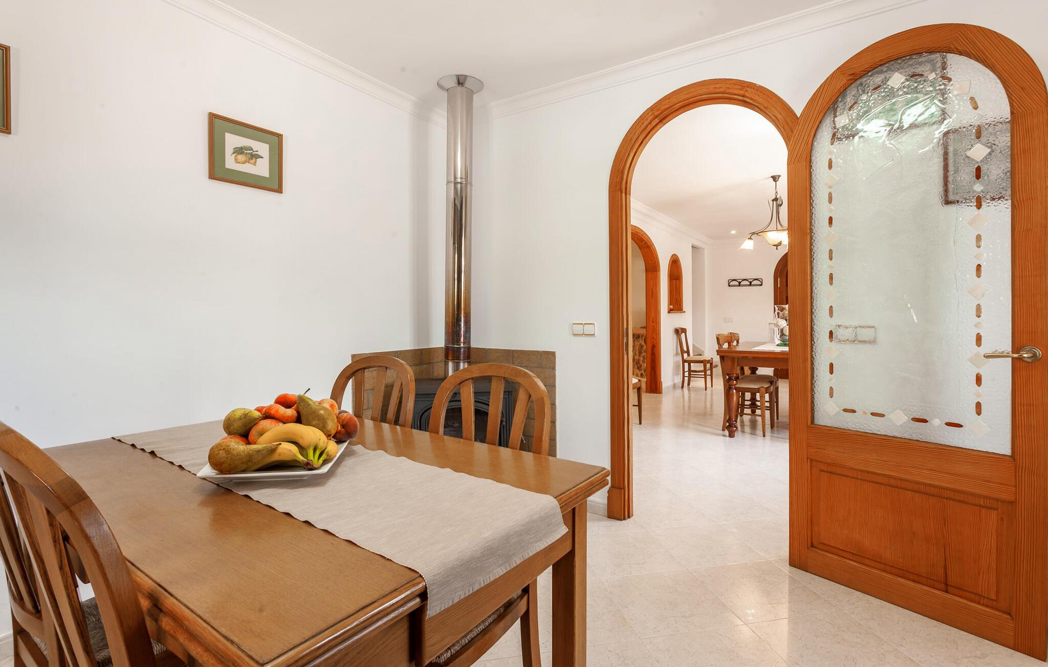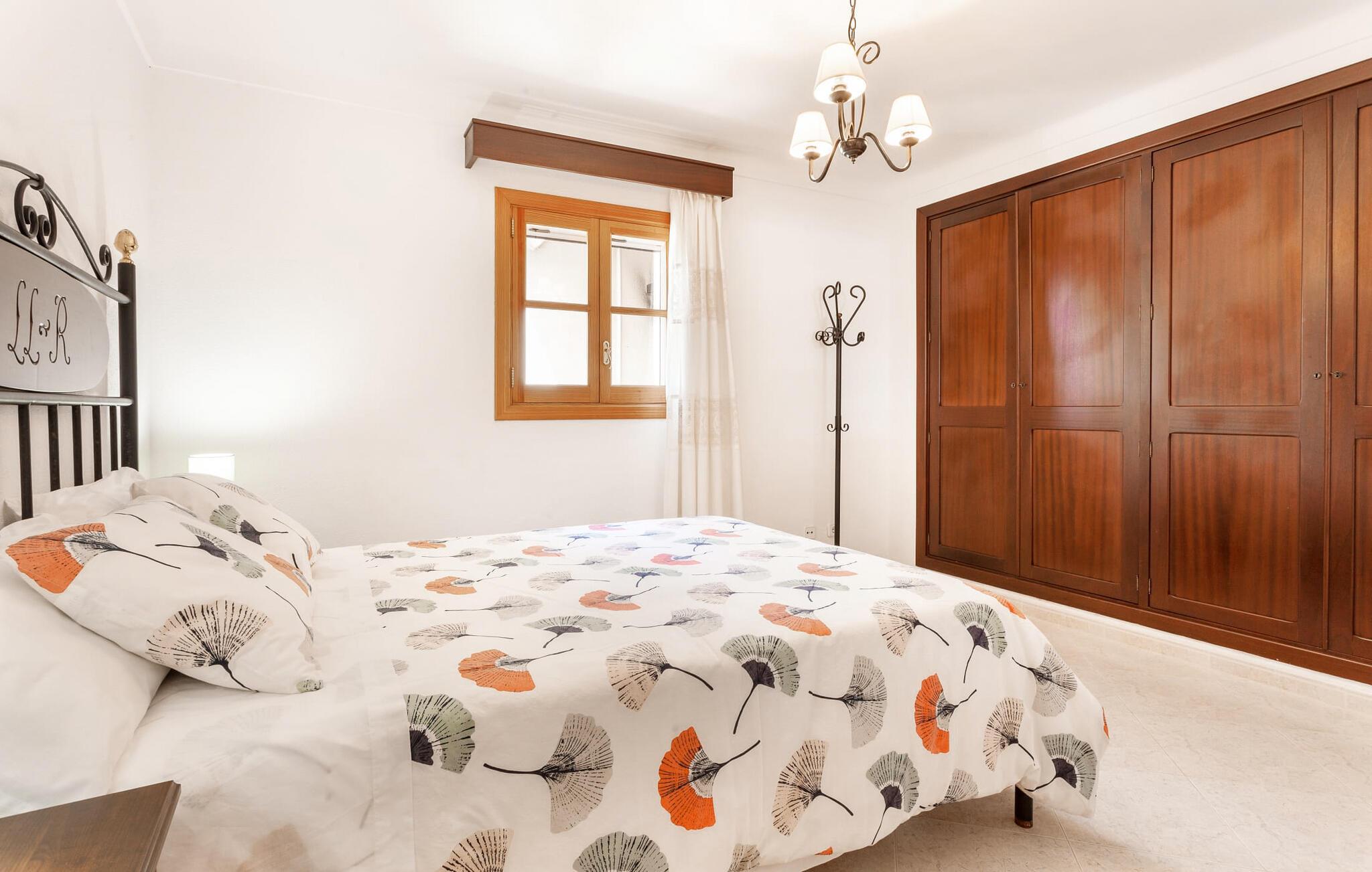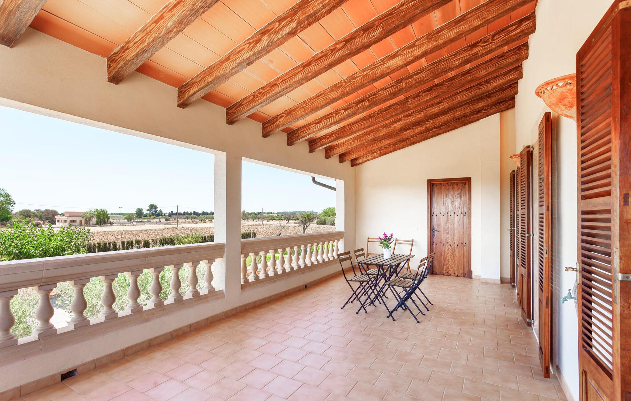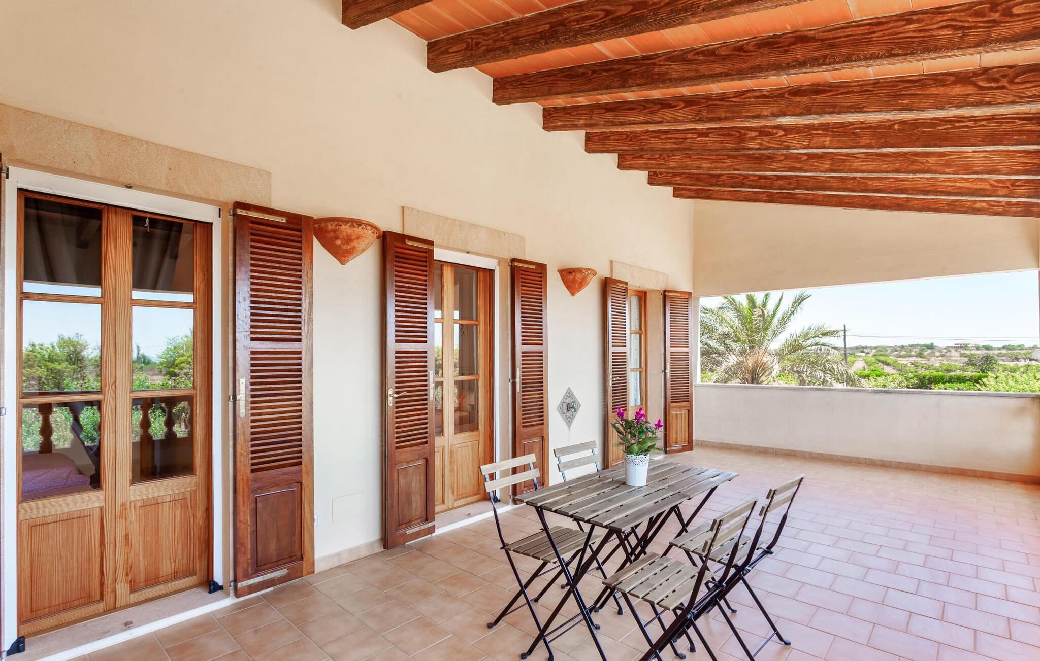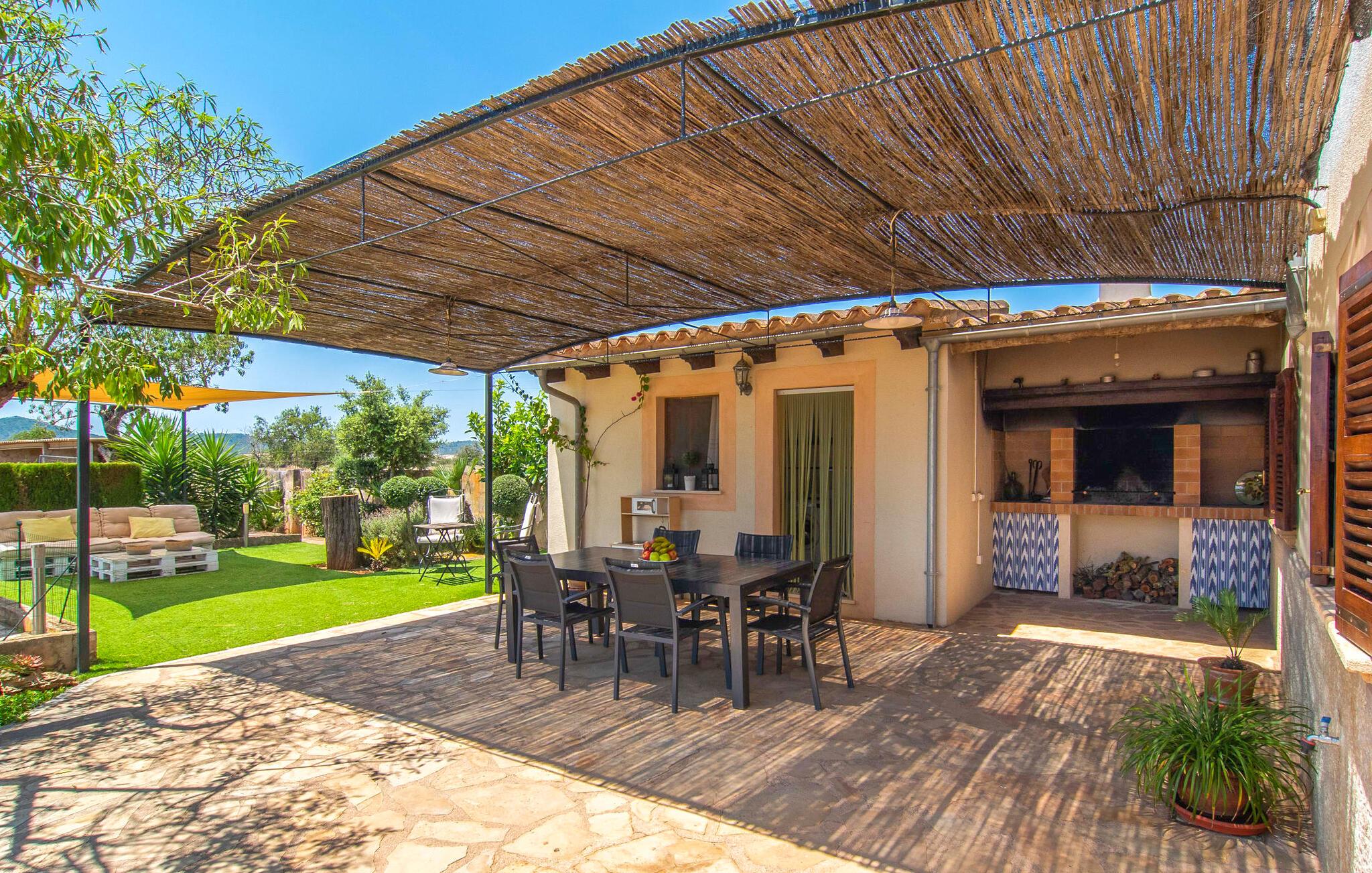 Den familievenlige villa "Es Cipres" vil glæde jer med sin smukke afsondrede beliggenhed på en 9.000 m² stor grund og, afhængigt af sæsonen, frodig vegetation. En række planter, omfattende grus- og terrassearealer samt indbydende nicher til at blive hængende giver denne ejendom en individuel charme. Rumfølelsen er imponerende og kan opleves direkte. Ved at dække huset har I mulighed for at nyde en række skønne steder at slappe af i solen eller i den luftige skygge, alt efter jeres præferencer. Komfortable liggestole inviterer jer til at slappe af og blive hængende, det samme gør de smagfulde siddeområder, hvor I kan spise sammen. Her kan I nyde den uhindrede udsigt til den dybblå morgenhimmel under morgenmaden eller lade endnu en tilfredsstillende feriedag slutte behageligt i aftenstemningen. Poolen vinkelret på villaen er sikret med et hegn til børn. Poolen er flisebelagt med smukke mosaiksten og varierer i dybden mellem 1 m og 1,90 m. Der er seks komfortable liggestole til rådighed for alle soldyrkere, og der er to parasoller til at beskytte jer mod lyse UV-stråler. Et andet skønt udendørs opholdsområde er placeret ovenpå, hvor en rummelig altan byder på en idyllisk udsigt. Forskellige legeredskaber gør det endnu mere attraktivt at tilbringe tid udendørs for vores små gæster. Det indre af villaen er smagfuldt indrettet. Lyse vægge, lofter og gulve kombineres med masser af træ og smuk belysning. Der blev brugt smagfuldt tilbehør i de rigtige proportioner, så den naturlige rumfornemmelse bevarer sine klare linjer og elegance. Forskellige buer sikrer en væsentlig harmoni af ejendommen. Husets midtpunkt er den åbne kombinerede stue/spisestue, som tilgås via en bred gang og rummer både en kæmpe spisegruppe og en lyst designet hjørnesofa med parabol-tv. På køligere aftener kan I slappe af her ved det hyggelige skær fra pejsen og varmen fra et bål. En anden spiseplads er i det rummelige og stilfulde køkken, som er fuldt udstyret og tilbyder gæsterne køleskab, ovn, gaskomfur, opvaskemaskine, Melitta kaffemaskine, elkedel og masser af opbevaringsplads. Her blev der også installeret en pejs, som giver ekstra hygge. Smukt designede soveværelser med et individuelt præg inviterer jer til en afslappende søvn. Behagelige farver kombineret med elegante møbler skaber en hyggelig atmosfære. De rummelige badeværelser er smagfuldt designet og udstyret med indretning af høj kvalitet. Et strygejern og en hårtørrer er til rådighed i huset, så I behøver ikke at tage dem med. Den lille, ret søvnige by Porreres ligger midt mellem marker, vinmarker og abrikosplantager. Kører I til Porreres en tirsdag morgen, vil I hurtigt bemærke, at halvdelen af landsbyen er på vej til det ugentlige marked. Udover frugt og grønt kan I også købe husholdningsartikler, tøj og sko der. De forskelligartede markedsboder strækker sig fra hovedtorvet ind i de smallere gader. Strandene på øst- og sydkysten kan nemt nås med bil, hvilket gør det til en afslappende dag på stranden. Den hyggelige villa "Es Cipres" ligger på en rummelig ejendom i et afsidesliggende landområde nær Porreres. Det er beliggende på en flad børnevenlig grund. Porreres ligger lige under hovedvejen mellem Llucmajor og Felanitx. I kan tilbringe en smuk dag ved havet, for eksempel i den lille havneby Colonia de Sant Jordi.