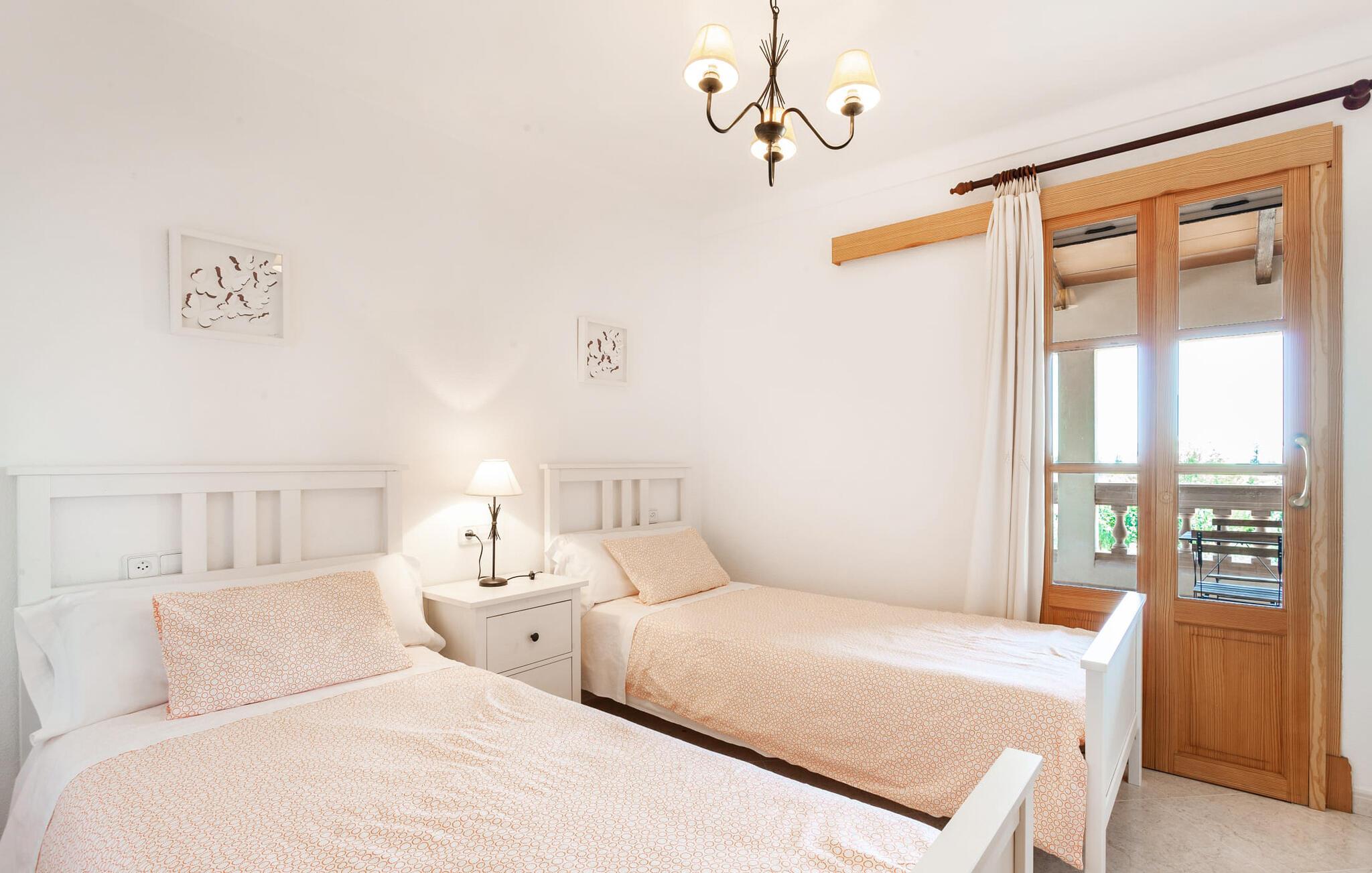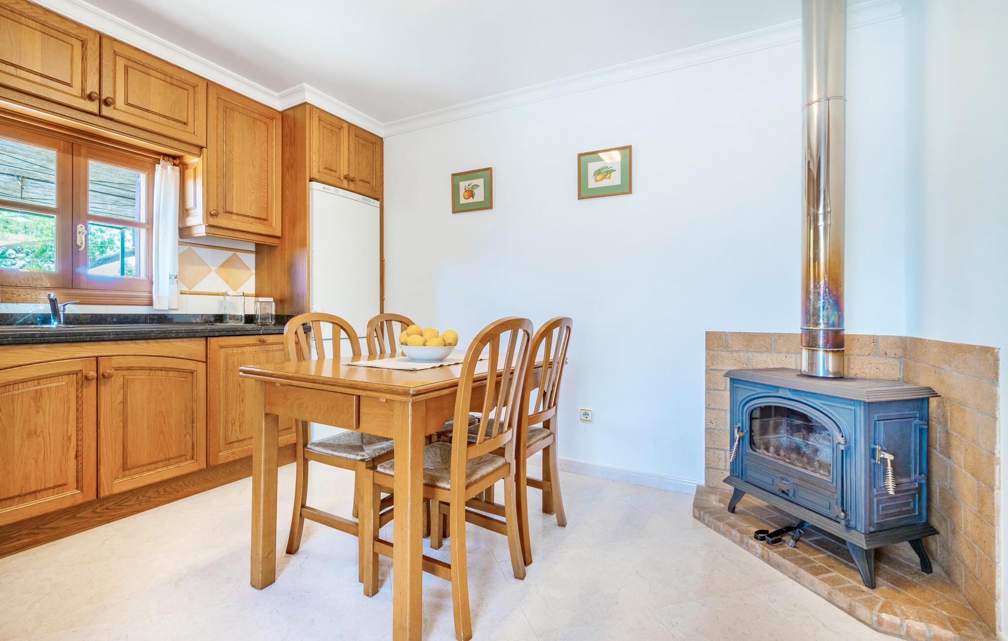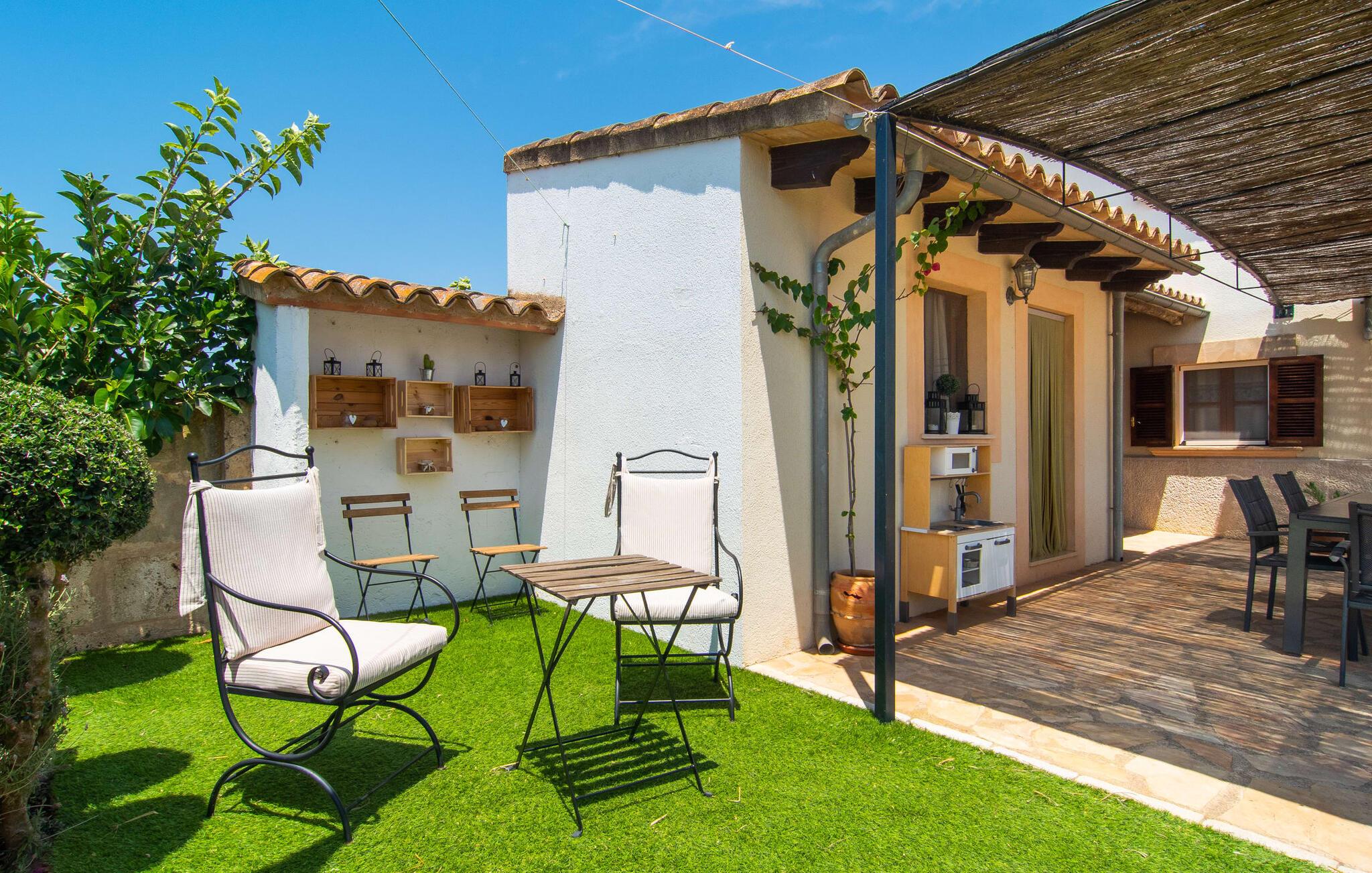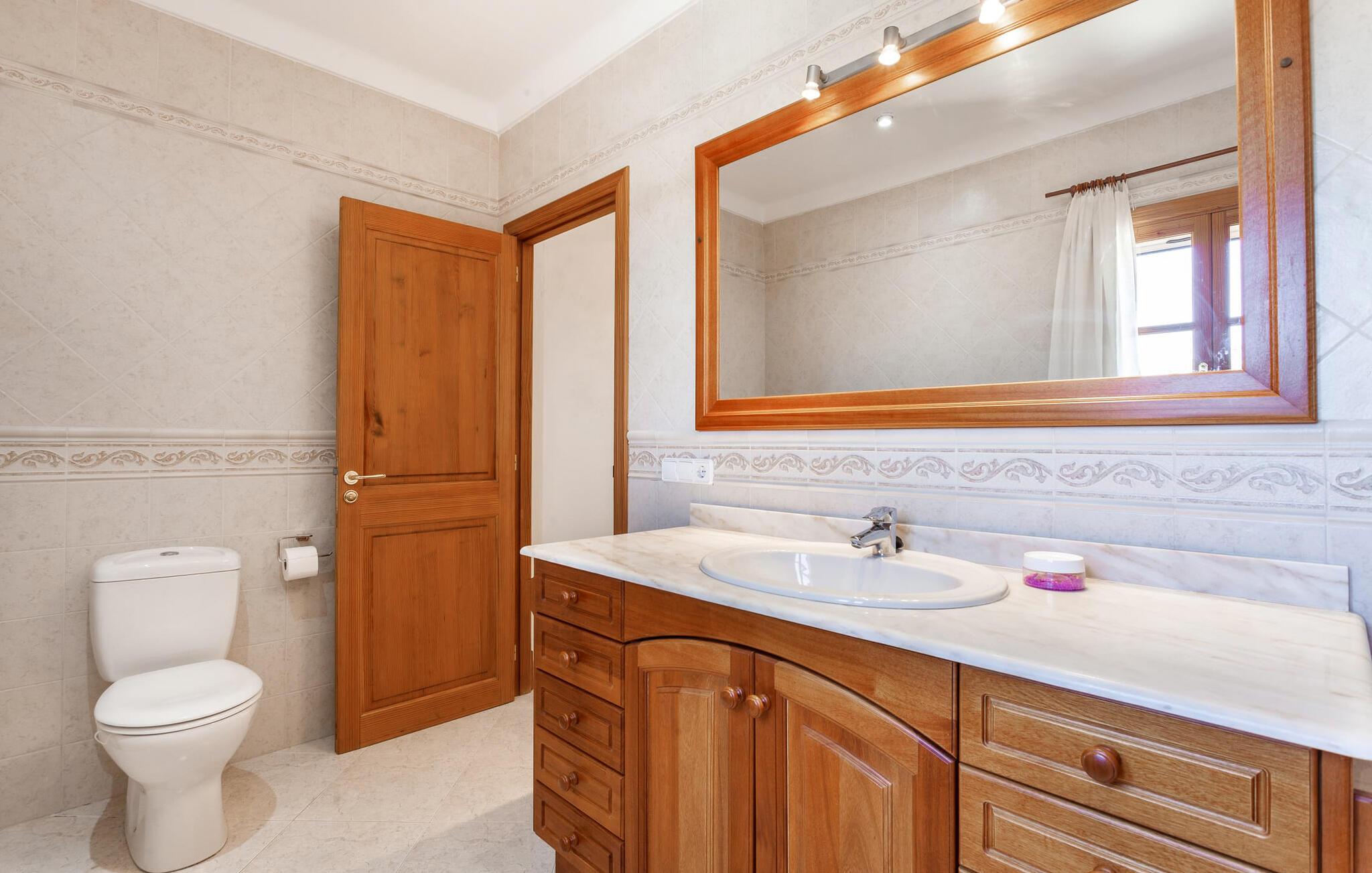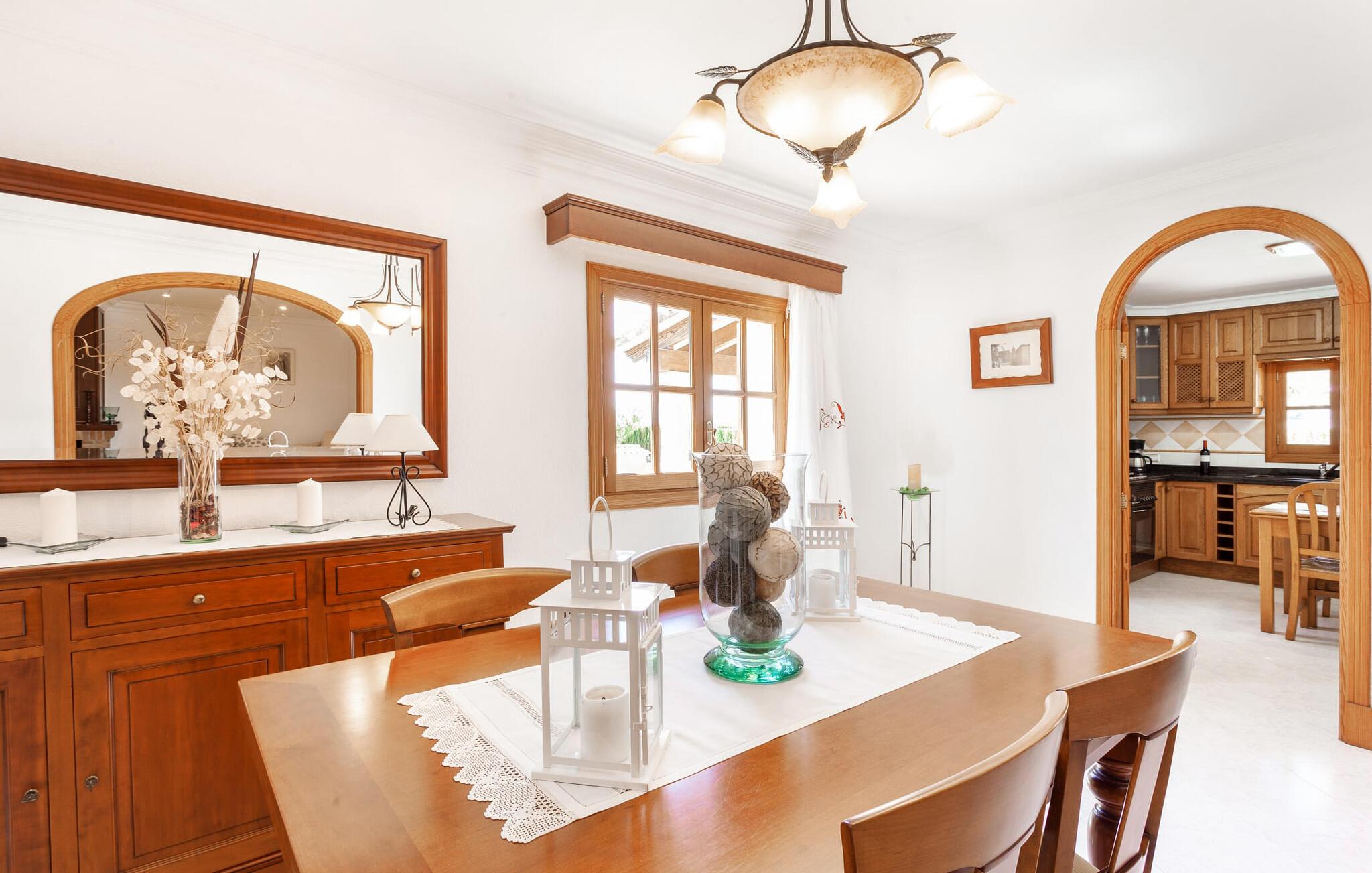 Den familievenlige villa "Es Cipres" vil glæde jer med sin smukke afsondrede beliggenhed på en 9.000 m² stor grund og, afhængigt af sæsonen, frodig vegetation. En række planter, omfattende grus- og terrassearealer samt indbydende nicher til at blive hængende giver denne ejendom en individuel charme. Rumfølelsen er imponerende og kan opleves direkte. Ved at dække huset har I mulighed for at nyde en række skønne steder at slappe af i solen eller i den luftige skygge, alt efter jeres præferencer. Komfortable liggestole inviterer jer til at slappe af og blive hængende, det samme gør de smagfulde siddeområder, hvor I kan spise sammen. Her kan I nyde den uhindrede udsigt til den dybblå morgenhimmel under morgenmaden eller lade endnu en tilfredsstillende feriedag slutte behageligt i aftenstemningen. Poolen vinkelret på villaen er sikret med et hegn til børn. Poolen er flisebelagt med smukke mosaiksten og varierer i dybden mellem 1 m og 1,90 m. Der er seks komfortable liggestole til rådighed for alle soldyrkere, og der er to parasoller til at beskytte jer mod lyse UV-stråler. Et andet skønt udendørs opholdsområde er placeret ovenpå, hvor en rummelig altan byder på en idyllisk udsigt. Forskellige legeredskaber gør det endnu mere attraktivt at tilbringe tid udendørs for vores små gæster. Det indre af villaen er smagfuldt indrettet. Lyse vægge, lofter og gulve kombineres med masser af træ og smuk belysning. Der blev brugt smagfuldt tilbehør i de rigtige proportioner, så den naturlige rumfornemmelse bevarer sine klare linjer og elegance. Forskellige buer sikrer en væsentlig harmoni af ejendommen. Husets midtpunkt er den åbne kombinerede stue/spisestue, som tilgås via en bred gang og rummer både en kæmpe spisegruppe og en lyst designet hjørnesofa med parabol-tv. På køligere aftener kan I slappe af her ved det hyggelige skær fra pejsen og varmen fra et bål. En anden spiseplads er i det rummelige og stilfulde køkken, som er fuldt udstyret og tilbyder gæsterne køleskab, ovn, gaskomfur, opvaskemaskine, Melitta kaffemaskine, elkedel og masser af opbevaringsplads. Her blev der også installeret en pejs, som giver ekstra hygge. Smukt designede soveværelser med et individuelt præg inviterer jer til en afslappende søvn. Behagelige farver kombineret med elegante møbler skaber en hyggelig atmosfære. De rummelige badeværelser er smagfuldt designet og udstyret med indretning af høj kvalitet. Et strygejern og en hårtørrer er til rådighed i huset, så I behøver ikke at tage dem med. Den lille, ret søvnige by Porreres ligger midt mellem marker, vinmarker og abrikosplantager. Kører I til Porreres en tirsdag morgen, vil I hurtigt bemærke, at halvdelen af landsbyen er på vej til det ugentlige marked. Udover frugt og grønt kan I også købe husholdningsartikler, tøj og sko der. De forskelligartede markedsboder strækker sig fra hovedtorvet ind i de smallere gader. Strandene på øst- og sydkysten kan nemt nås med bil, hvilket gør det til en afslappende dag på stranden. Den hyggelige villa "Es Cipres" ligger på en rummelig ejendom i et afsidesliggende landområde nær Porreres. Det er beliggende på en flad børnevenlig grund. Porreres ligger lige under hovedvejen mellem Llucmajor og Felanitx. I kan tilbringe en smuk dag ved havet, for eksempel i den lille havneby Colonia de Sant Jordi.