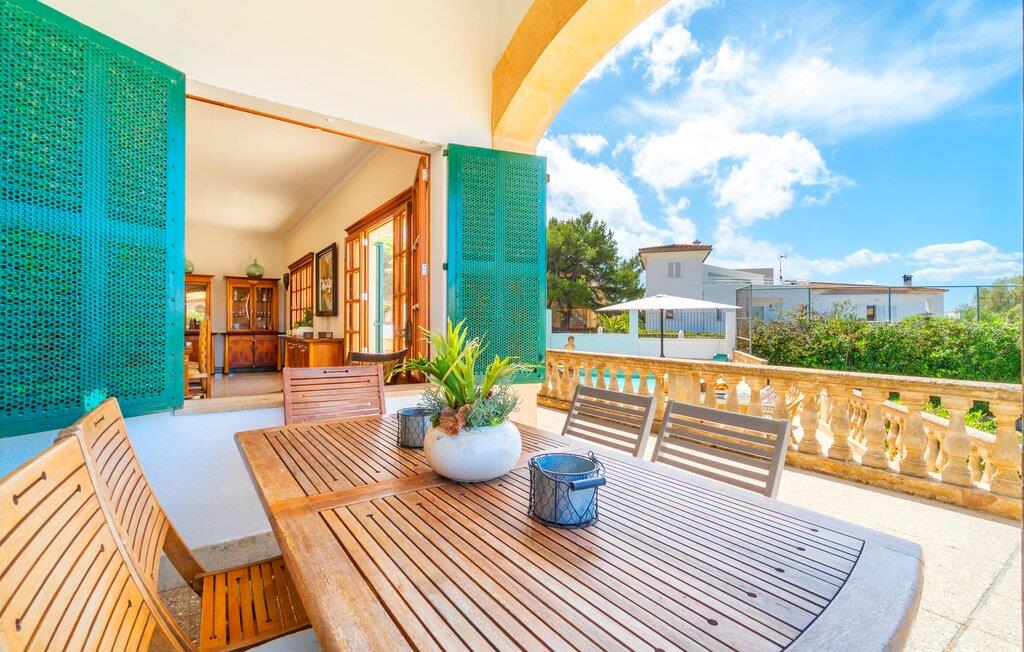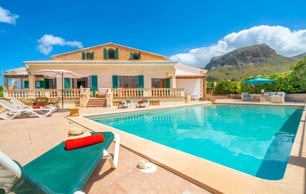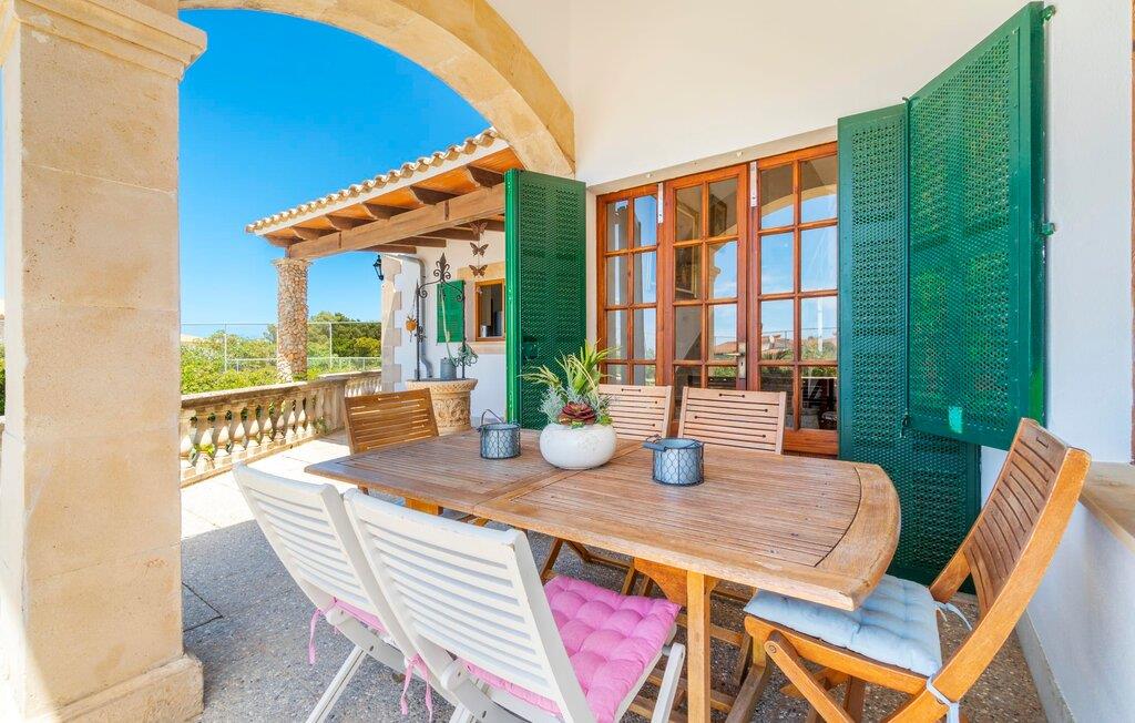 Villaen "Es Ferrutx" har meget at byde på: Det klassiske feriehus lavet af sand og natursten med de smukke grønne træskodder scorer særligt godt med sin fantastiske beliggenhed på Mallorca.