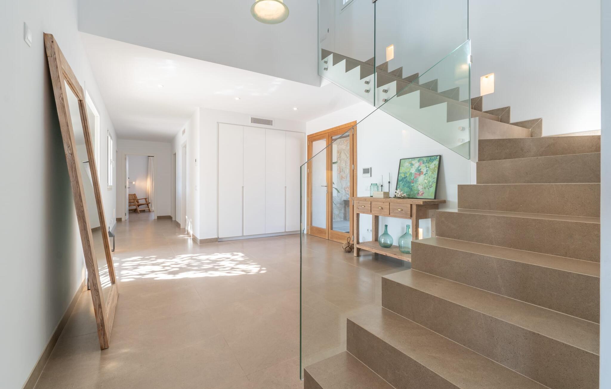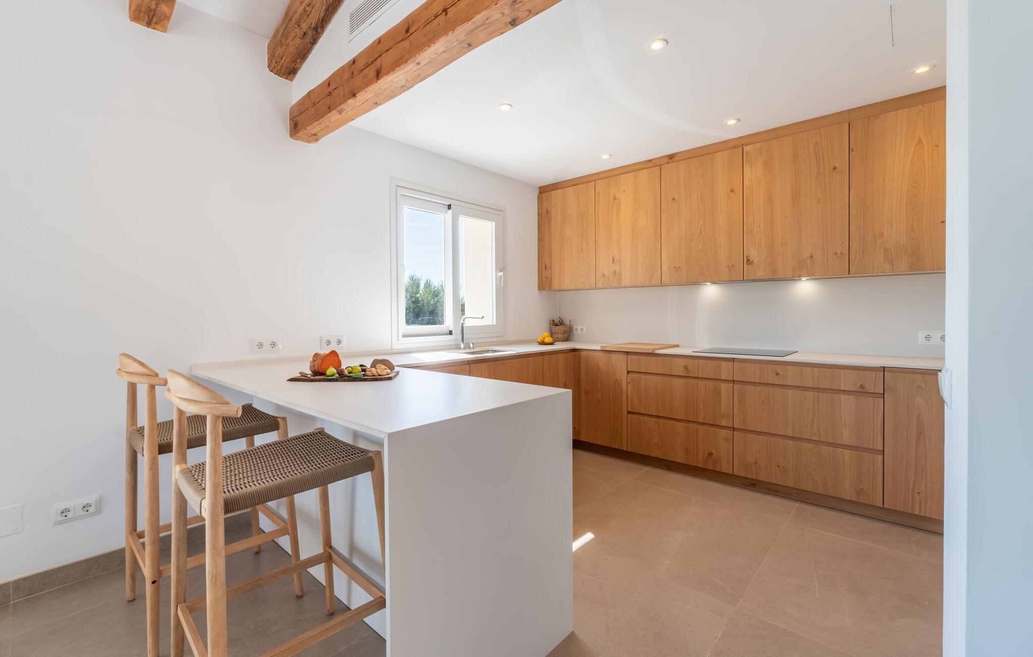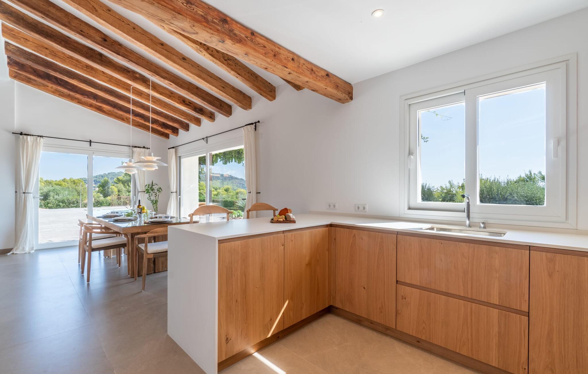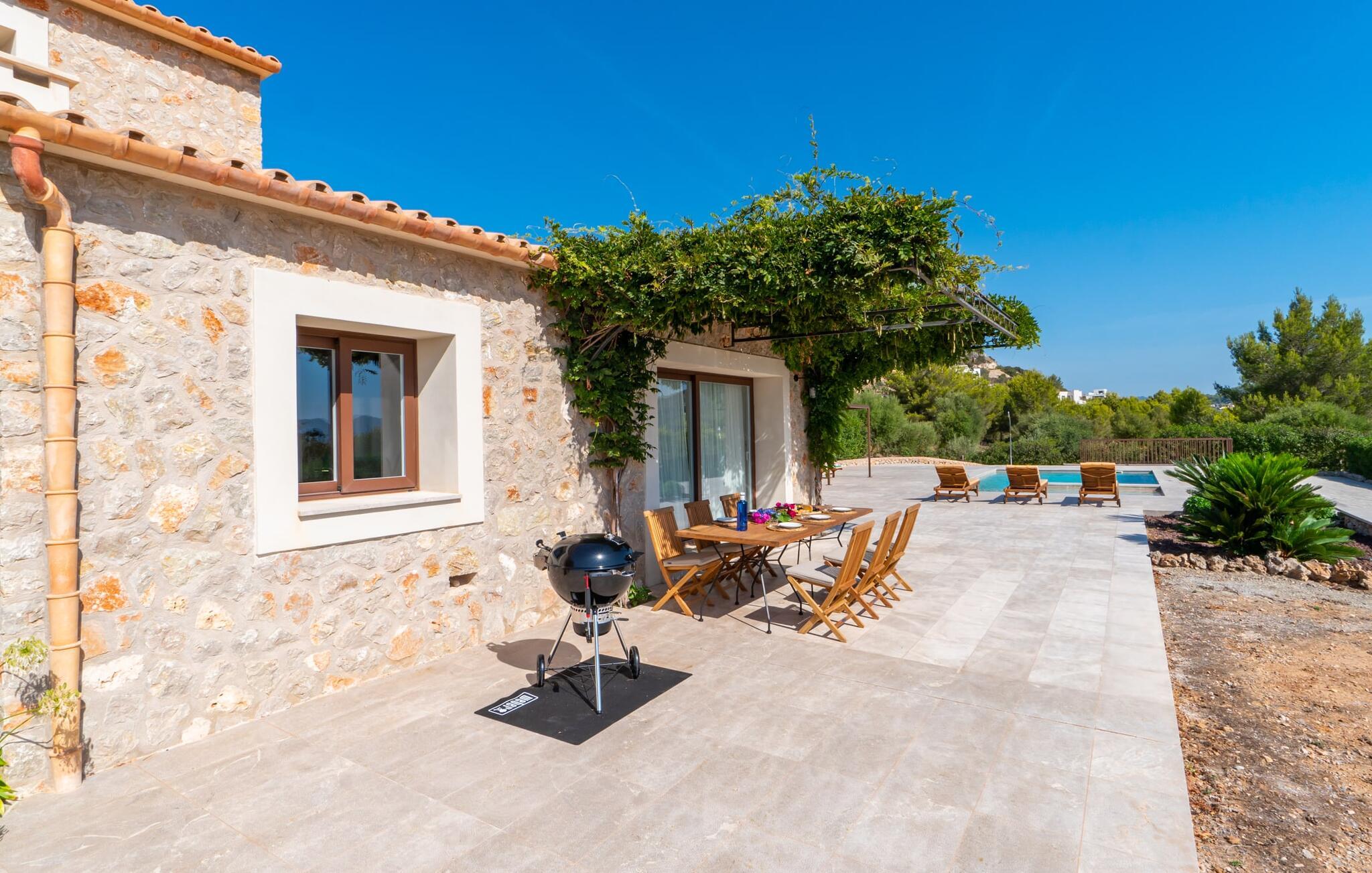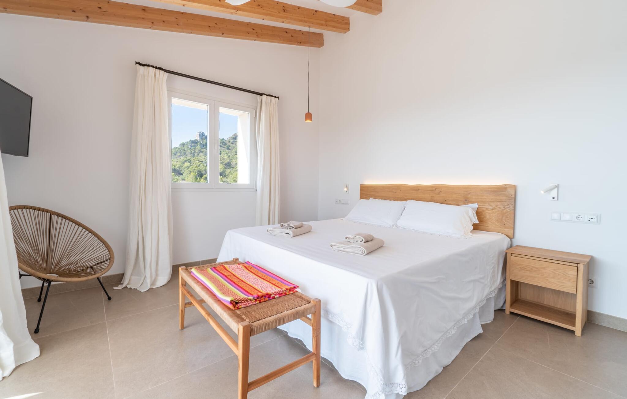 Beliggende i det maleriske landskab nær Mallorcas østkyst tilbyder naturstensfincaen "Es Llorer de na Penyal" et roligt tilflugtssted for jeres ferie. Fra den elegante poolterrasse kan I nyde en vidunderlig udsigt over det blidt bølgende landskab. Den rummelige, lavvandede pool er let tilgængelig og har kvalitets liggestole til solbadning og en slående pergola til afslapning i skyggen. Solterrassen flyder problemfrit ind i en smuk spiseplads og giver naturlig skygge til vidunderlige grillaftener, suppleret med subtil udendørs belysning, der beriger stemningen. Brede glasskydedøre giver masser af naturligt lys ind i den åbne stue-spisestue, hvilket skaber en harmonisk blanding af indendørs og udendørs rum. Det stilrene design med træmøbler af høj kvalitet og smagfulde naturmaterialer skaber en varm og indbydende atmosfære. I stueetagen finder I to charmerende dobbeltværelser, hver med eget badeværelse og gæstetoilet. Over. Der er et rummeligt soveværelse med påklædningsværelse og stort badeværelse. Den tilstødende terrasse byder på en betagende udsigt over havet. Både soveværelserne og opholdsstuen er udstyret med aircondition, mens hele huset har gulvvarme, hvilket sikrer jeres komfort under hele jeres ophold. Fincaen er omgivet af natur i udkanten af Son Servera nær Mallorcas østkyst. Der er et supermarked 1 km derfra. Feriestedet Cala Millor med sin sandstrand ligger 2 km væk; Son Servera Golfklub ligger 7,5 km derfra. Andre smukke strande kan nås inden for 10-15 minutter i bil.