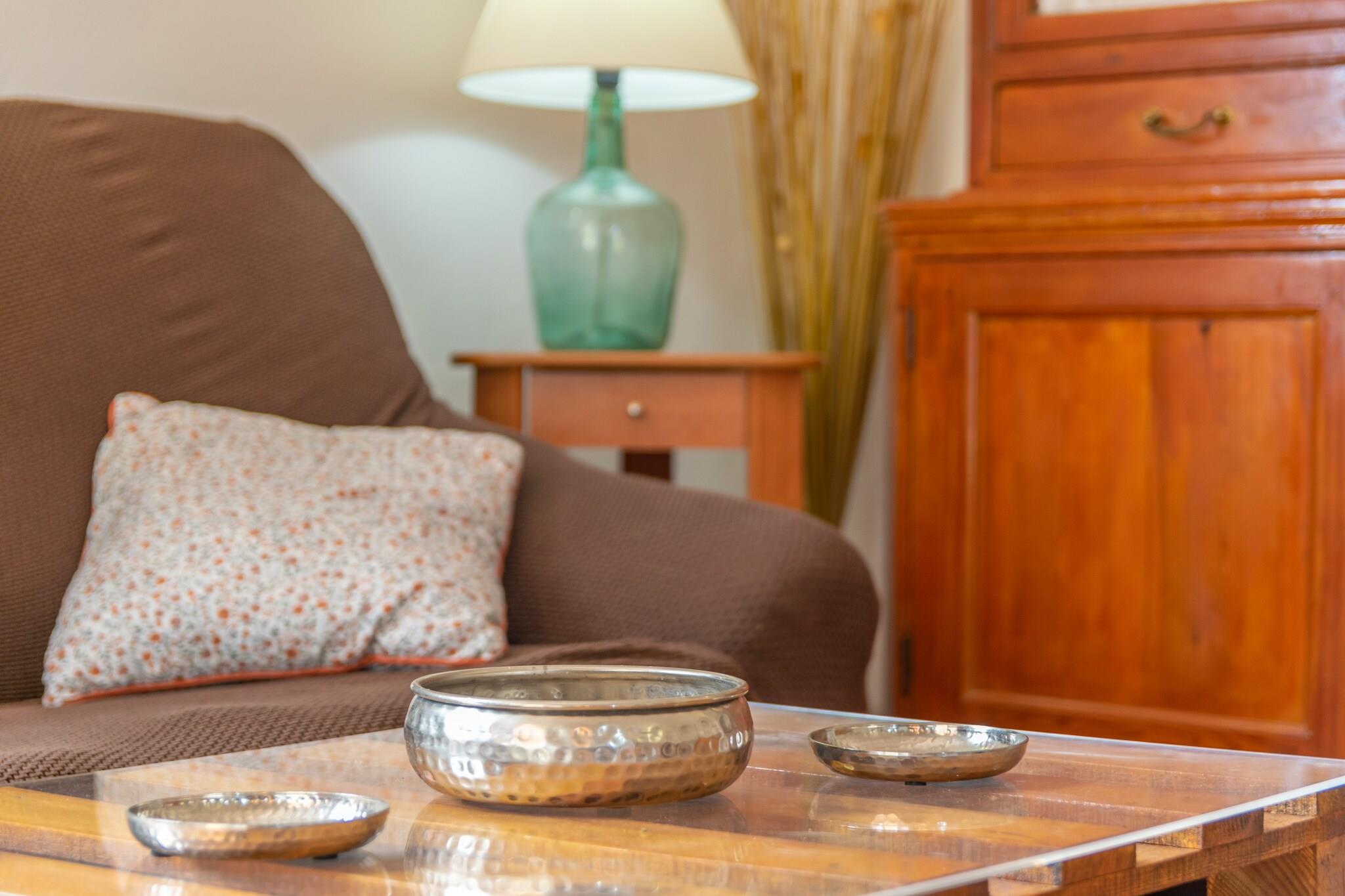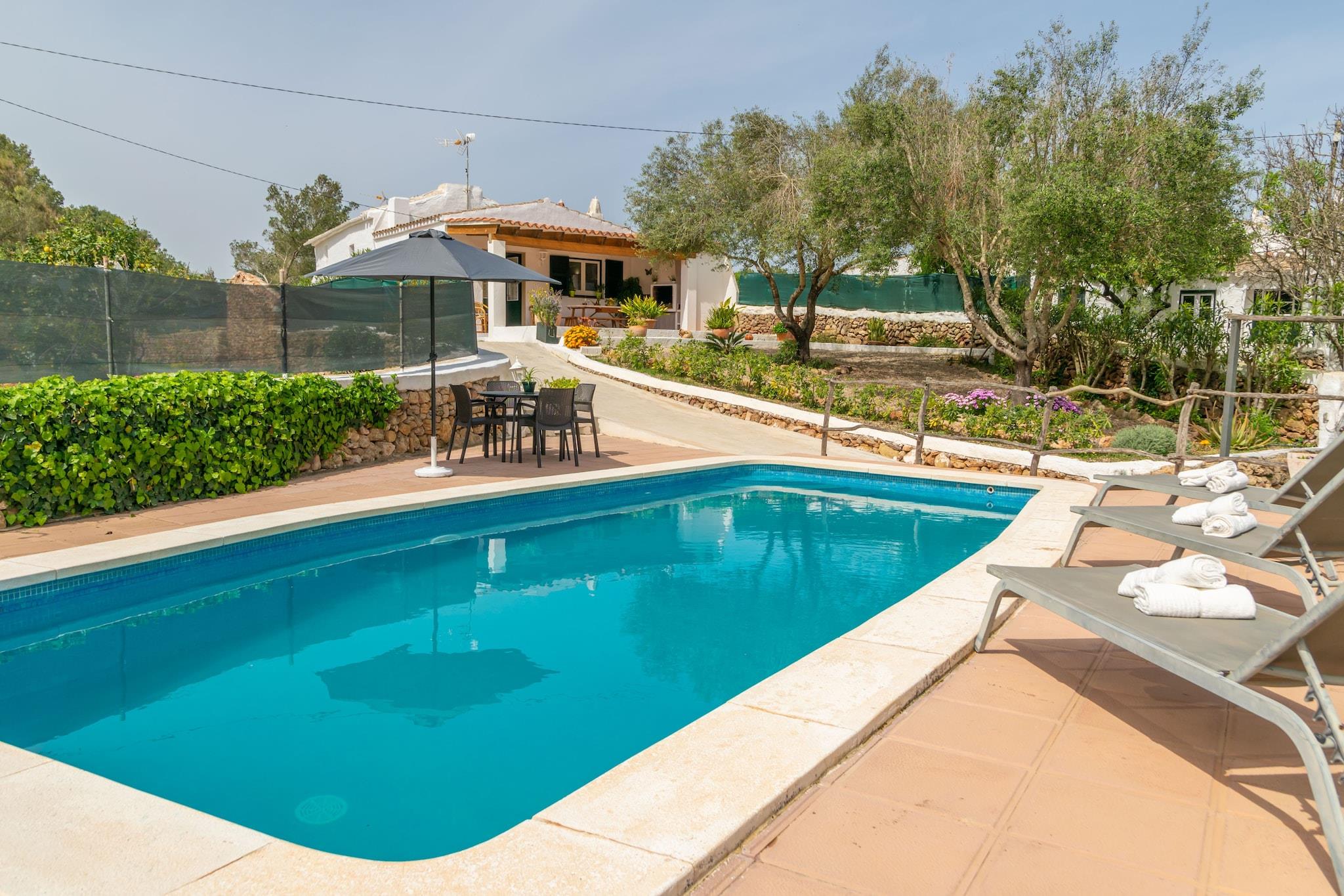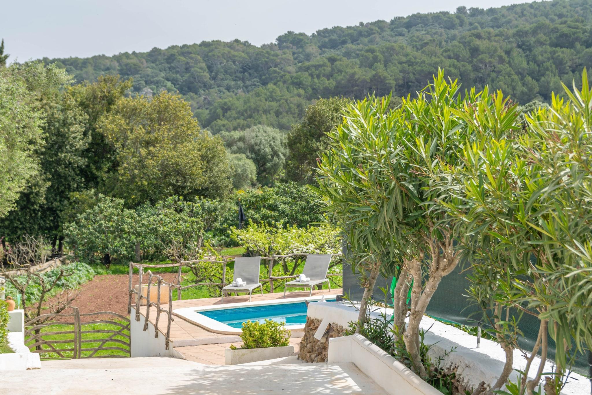 Omgivet af frugttræer og fuldstændig privatliv tilbyder dette charmerende landsted et fredeligt tilflugtssted. Udendørs kan gæsterne slappe af ved den 9x3 m store klorpool (1,4-1,8 m dybde), slappe af på liggestole eller nyde måltider på verandaen med en grill. Den indhegnede ejendom sikrer et roligt og sikkert miljø, ideelt for familier. Indvendigt har to-etagers hjem en åben stueetage med et keramisk kogeplader køkken, spiseplads og hyggelig stue med pejs og tv. Ovenpå er der et soveværelse med dobbeltseng og et enkeltværelse, begge med ventilatorer, plus et badeværelse med badekar. Babyudstyr såsom en barneseng og højstol er tilgængelige efter anmodning. Beliggende nær Es Mercadal, er huset tæt på Menorcas kulturelle perler og naturlige skønhed. Udforsk landsbyens hvidkalkede charme, besøg El Toro for panoramaudsigt, eller oplev den fantastiske naturpark Macar de Sa Llosa. Kæledyr og arrangementer er ikke tilladt. Udvendig parkering til to biler er tilgængelig. Turistskat og eventuelle gebyrer pålægges.