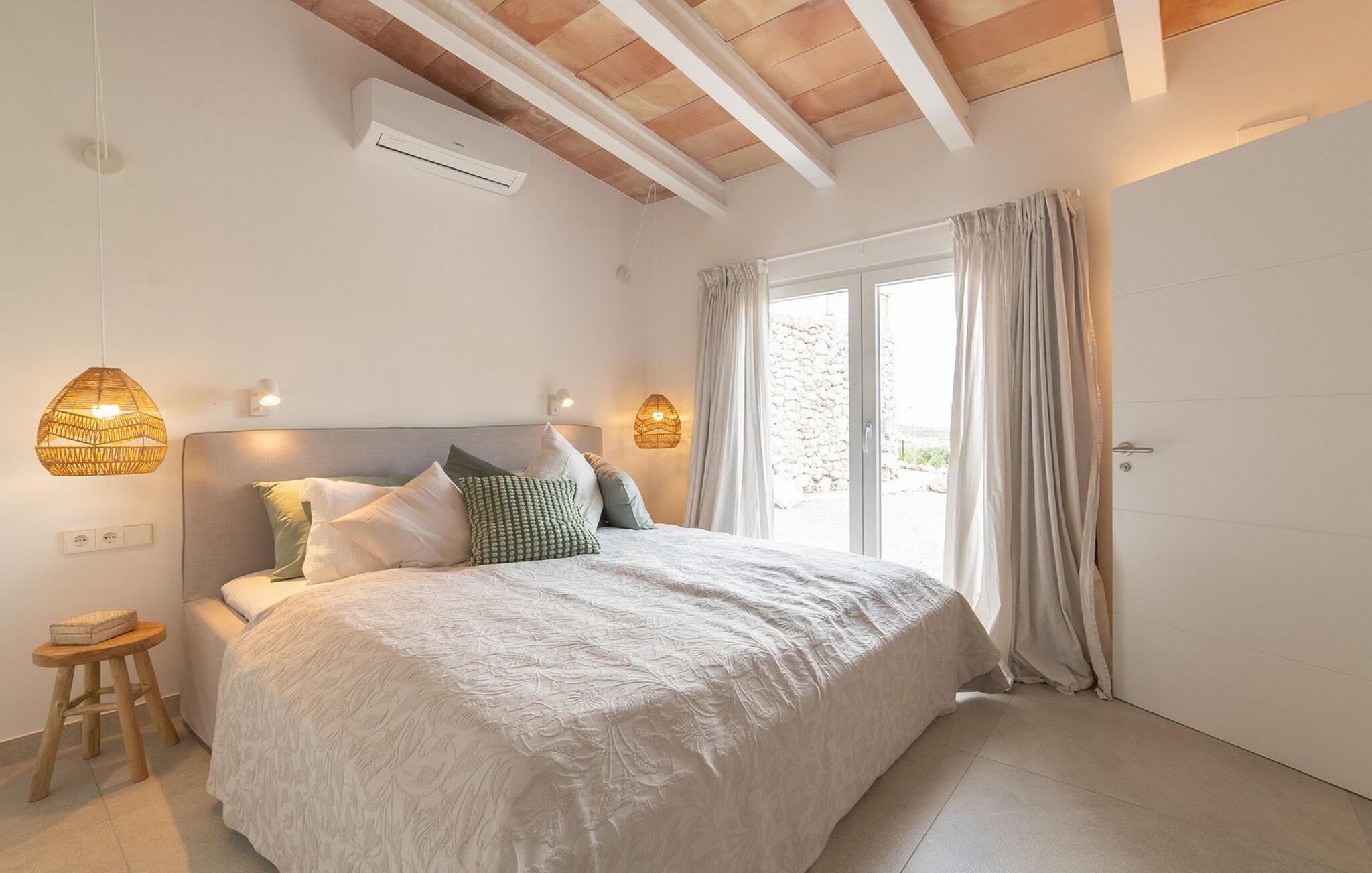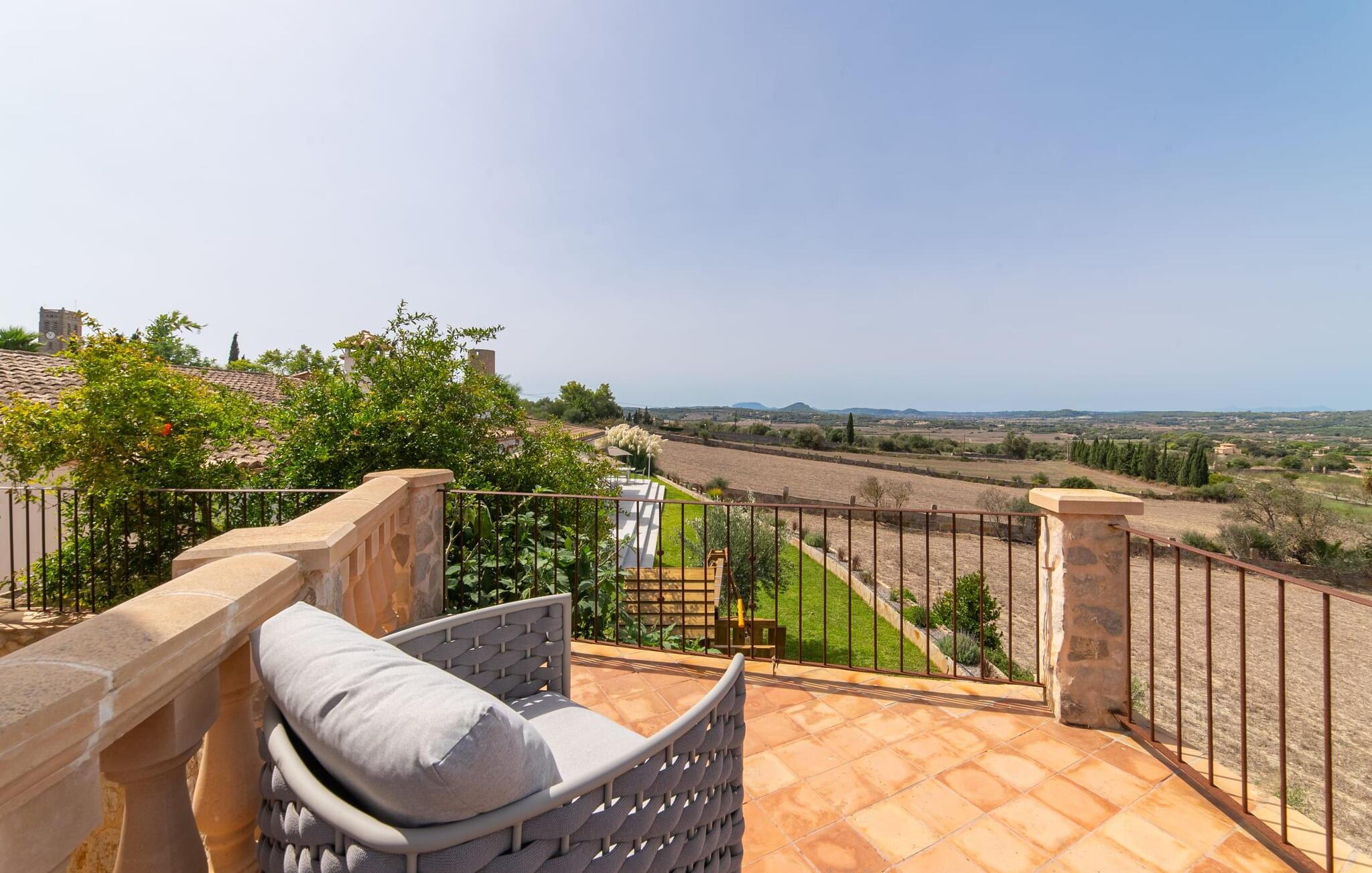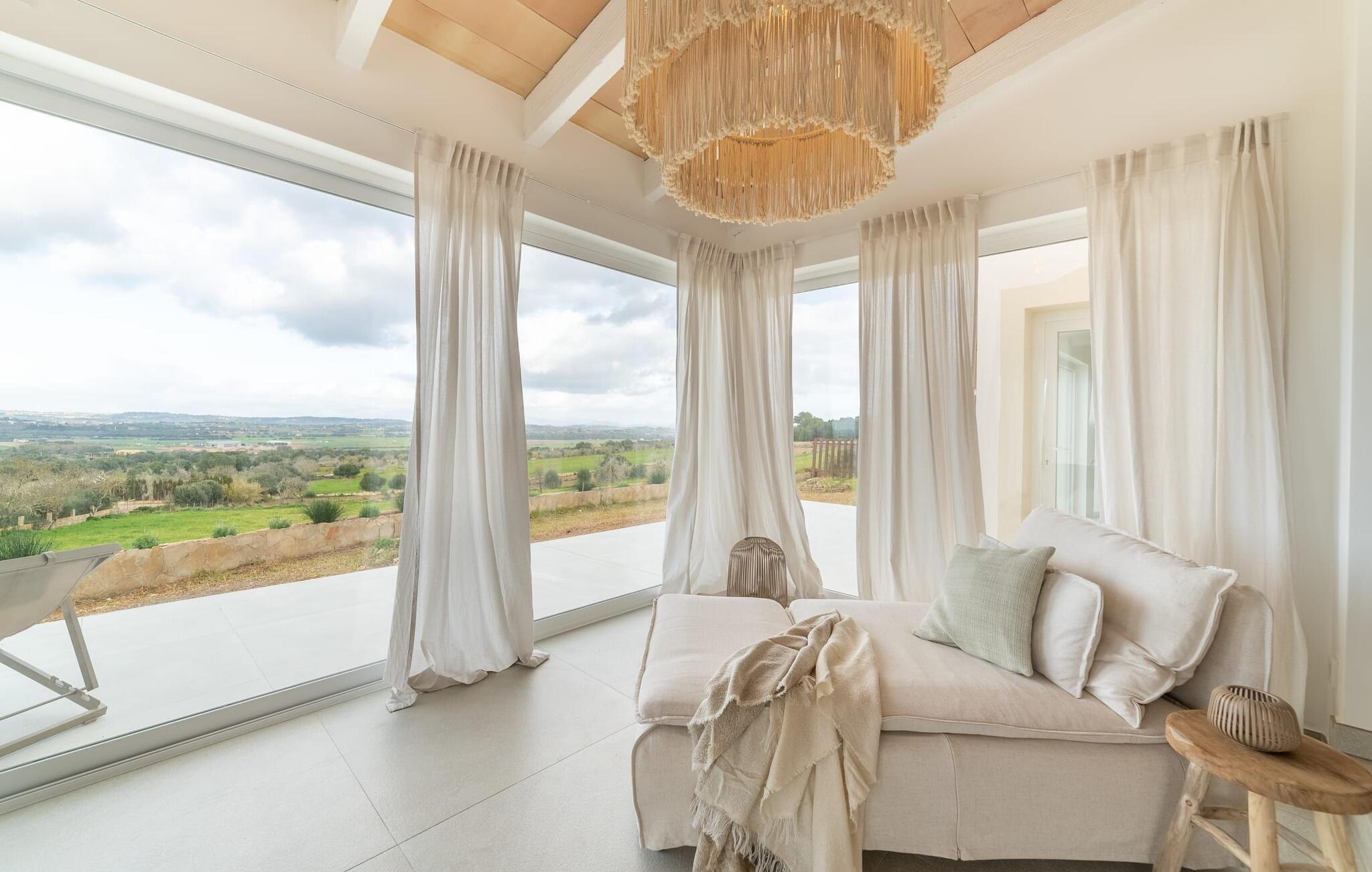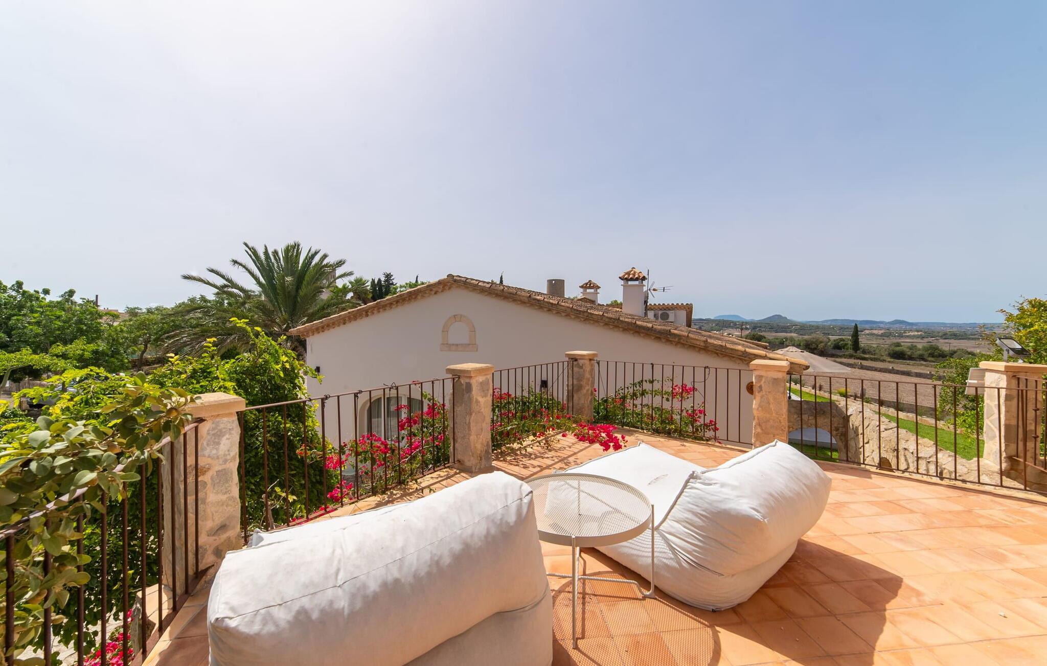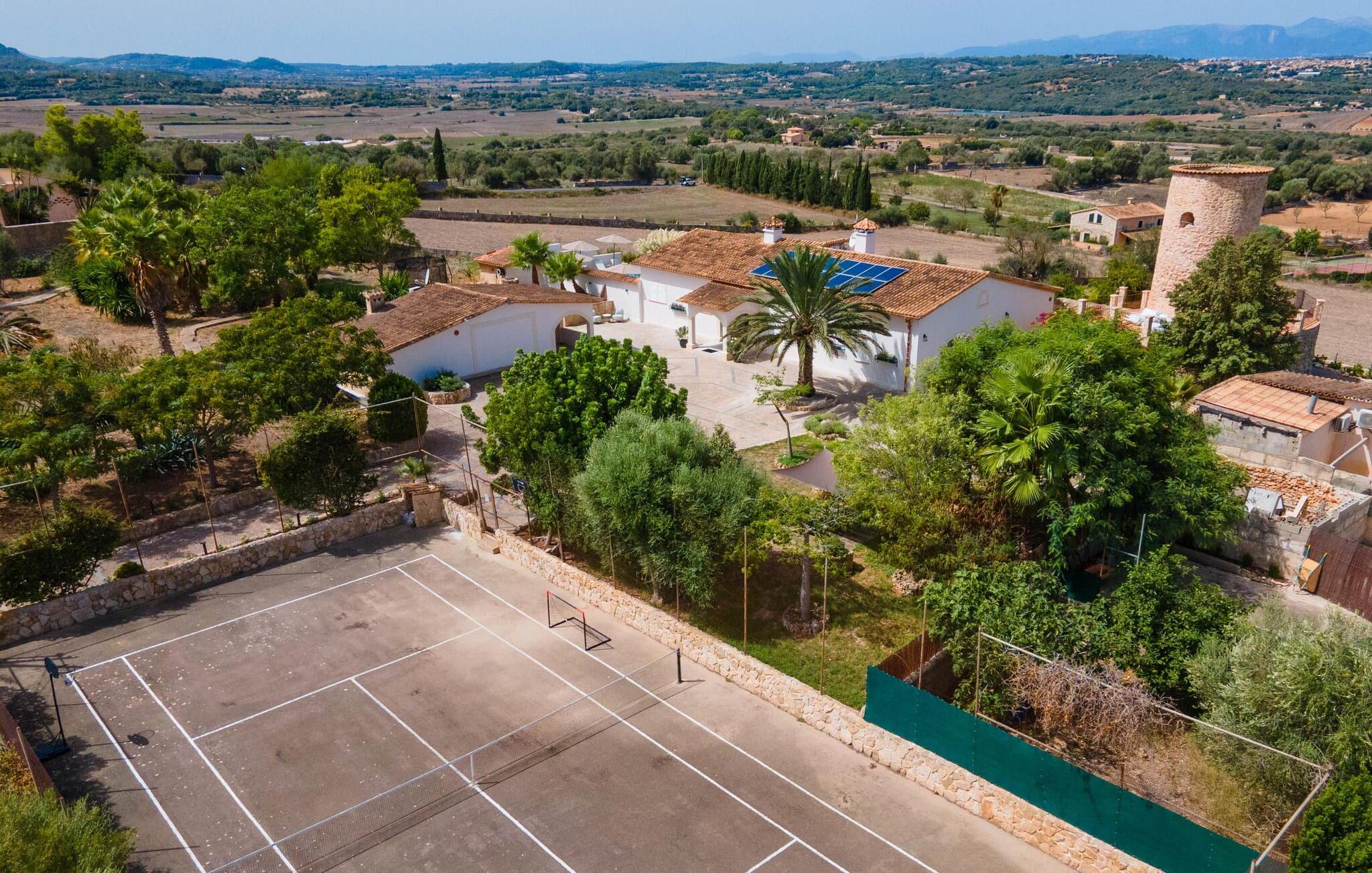 Stuehuset "Es Moli Ariany" er et usædvanligt æstetisk feriehus på Mallorca. Med hensyn til beliggenhed, indretning og stil opfylder denne ejendom selv de højeste standarder. En flot hvid stil præger poolen og solterrassen, hvorfra man kan nyde en vidunderlig udsigt over det brede landskab mod Tramuntana. Smukke daybeds og komfortable liggestole er tilgængelige for afslappende timer under middelhavshimlen. I kan også nyde den smukke udsigt fra den 11 m lange pool. I kan forberede selskabelige grillaftener i det overdækkede udekøkken med grill. Bagefter kan I spise lige ved siden af ved det dekorative langbord under det naturlige tag. Sportsentusiaster vil elske basketballkurven og tennisbanen. Det oprindelige mølletårn med en omgivende terrasse var dygtigt iscenesat. Bag flere gulv-til-loft-vinduer afslører interiøret et trendy, eftertrykkeligt stilrent boligmiljø. Lyse, harmoniske farver kendetegner det elegante interiør, som består af smarte møbler og originalt tilbehør. Alt finder en fremragende plads i den behagelige rummelighed. Den store stue byder ikke kun på maksimal komfort, men også en fantastisk udsigt over husets vidder. I det store køkken, fuldt udstyret til en høj standard med Bora-induktion, luksuriøse elektriske apparater, stenbordplader osv., kan I tilberede måltider sammen og spise ved det store spisebord med en fantastisk udsigt over Tramuntana-bjergene. Tre komfortable dobbeltværelser (med luksuriøse boxmadrasser), to af dem med private badeværelser, og et andet badeværelse fuldender husets indbydende rum. Der er yderligere to helt uafhængige områder, hver med et soveværelse med dobbeltseng, en privat opholdsstue med stilfuld morgenmadsbar, et moderne brusebad og et privat udendørs område til afslapning. Dette hus er ideelt for en større gruppe rejsende, der værdsætter en god beliggenhed, omfattende faciliteter af høj kvalitet og et højt niveau af stil og privatliv. Dette stilfulde bondehus på Mallorca ligger i den vestlige udkant af landsbyen Ariany i centrum af øen. Den meget velmoderniserede historiske feriebolig med et smukt udendørsområde og en sensationel panoramaudsigt ligger også i en attraktiv infrastrukturel beliggenhed: I kan gøre jeres indkøb i Santa Margalida (8 km) og Petra (7 km), den nærmeste strand er Can Picafort - er ca. 17 km væk. Bemærk venligst, at denne ejendom ikke accepterer ungdomsgrupper eller polterabender. En ungdomsgruppe på denne ejendom består af personer på 25 år eller derunder. Book ikke denne ejendom, hvis I er en ungdomsgruppe eller en polterabendgruppe, da jeres reservation vil blive afvist, når den er booket, hvilket også kan være tilfældet ved ankomst til ejendommen eller under jeres ophold, og I vil ikke modtage en refusion.