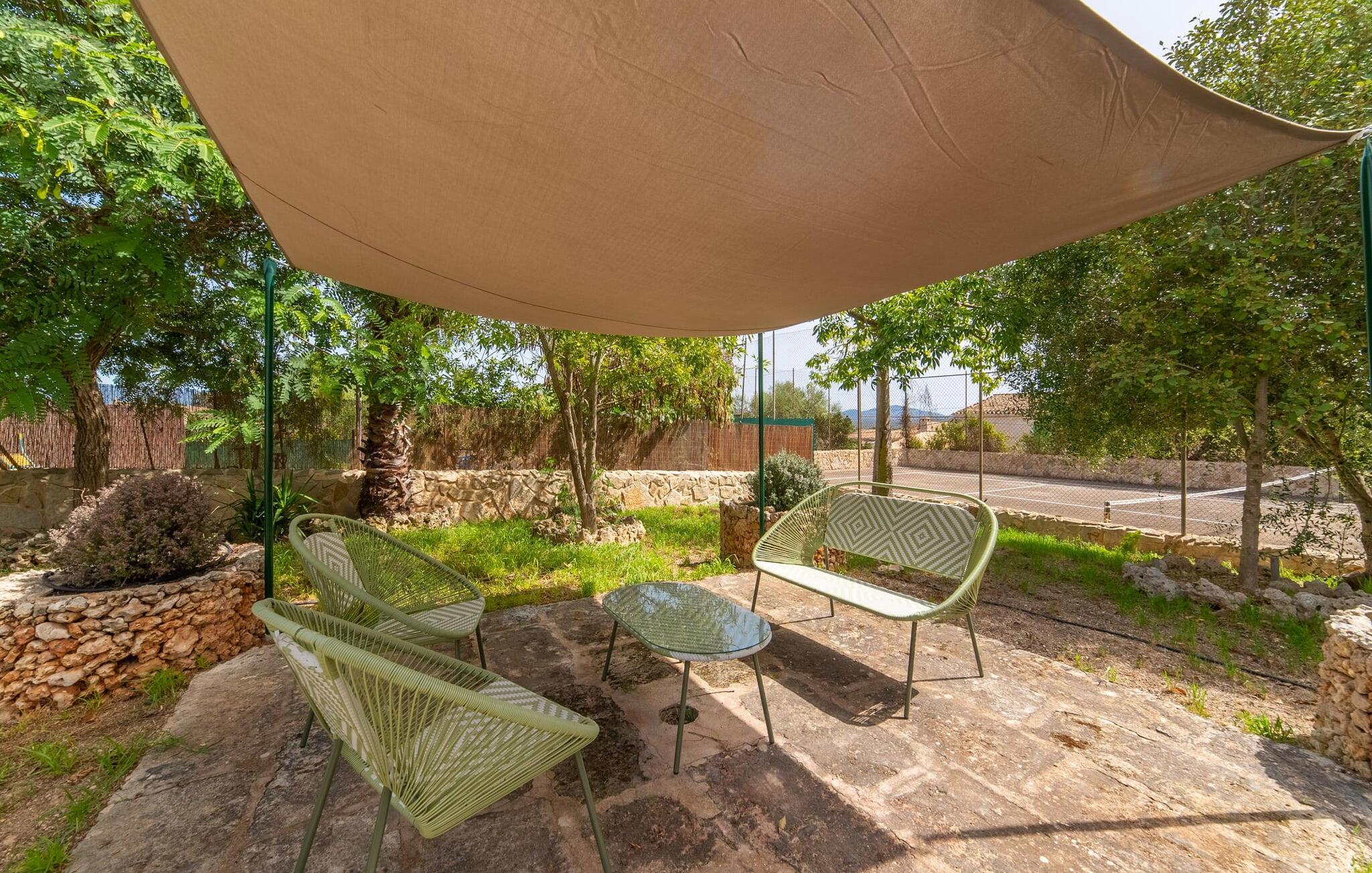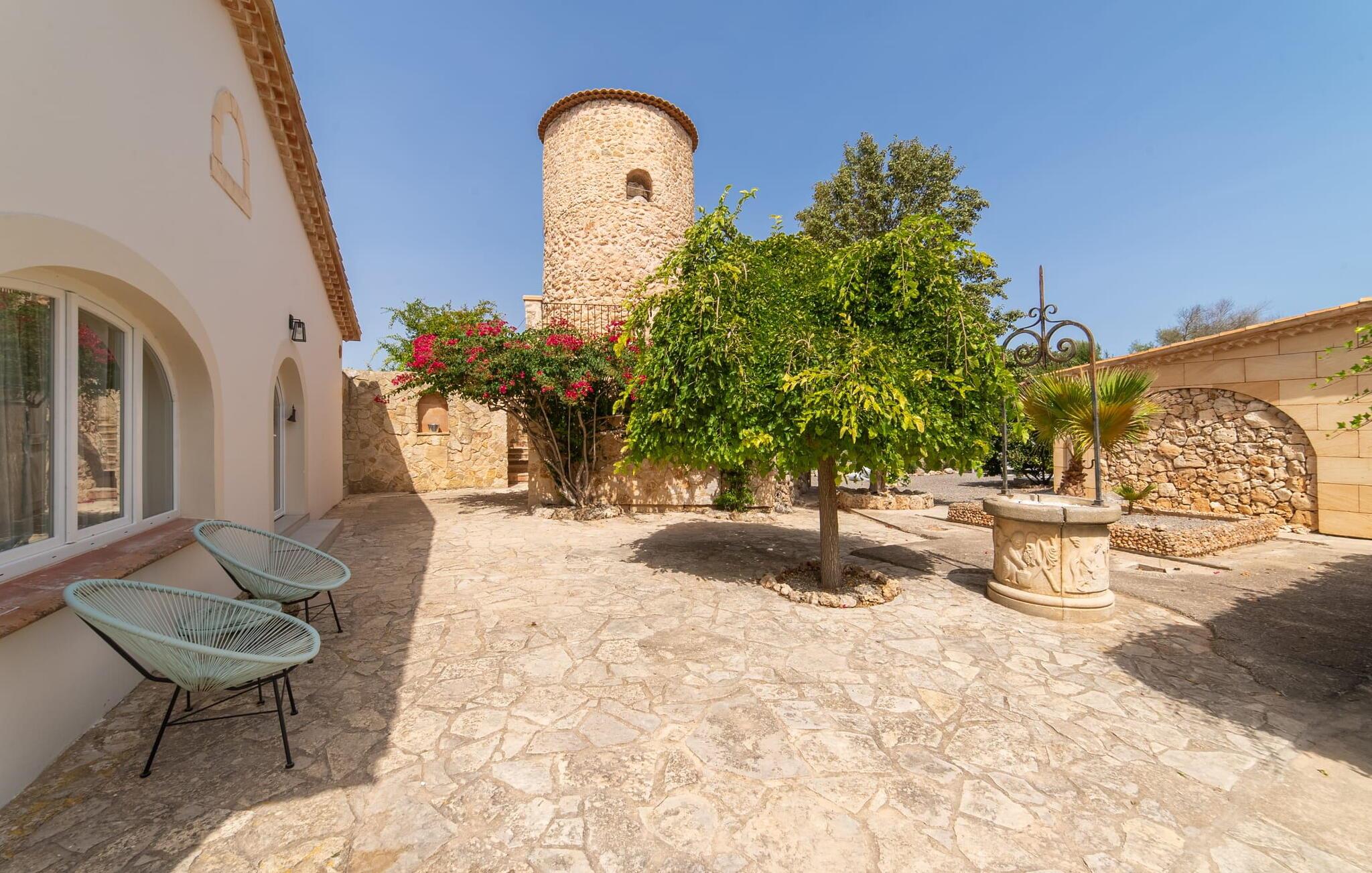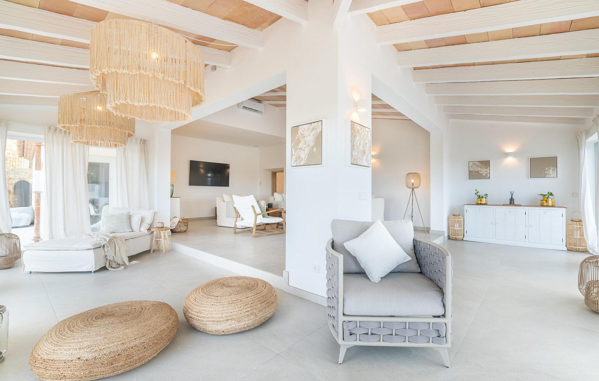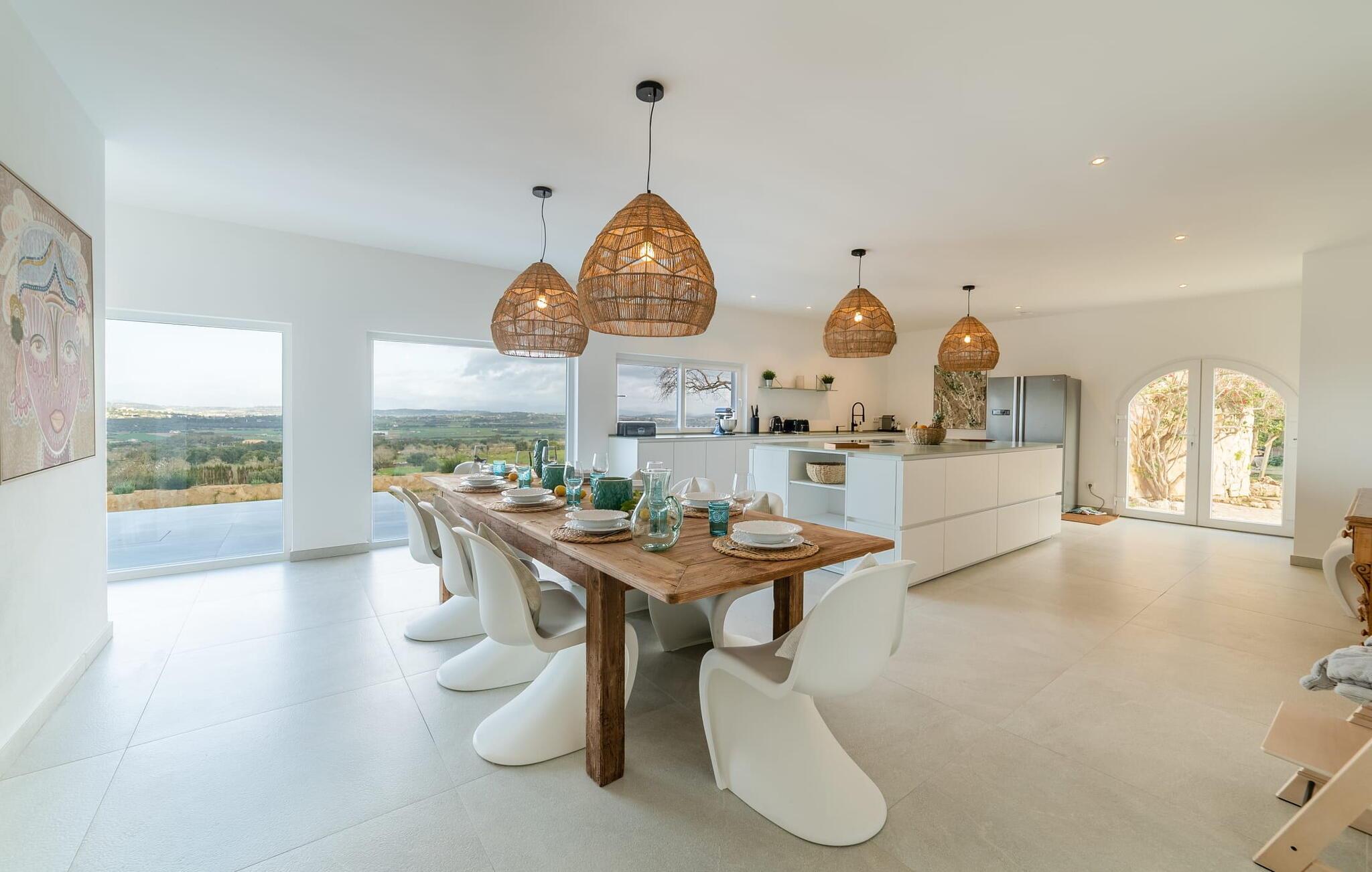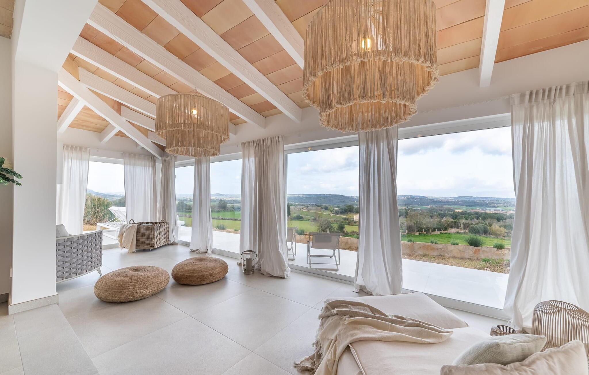Stuehuset "Es Moli Ariany" er et usædvanligt æstetisk feriehus på Mallorca. Med hensyn til beliggenhed, indretning og stil opfylder denne ejendom selv de højeste standarder. En flot hvid stil præger poolen og solterrassen, hvorfra man kan nyde en vidunderlig udsigt over det brede landskab mod Tramuntana. Smukke daybeds og komfortable liggestole er tilgængelige for afslappende timer under middelhavshimlen. I kan også nyde den smukke udsigt fra den 11 m lange pool. I kan forberede selskabelige grillaftener i det overdækkede udekøkken med grill. Bagefter kan I spise lige ved siden af ved det dekorative langbord under det naturlige tag. Sportsentusiaster vil elske basketballkurven og tennisbanen. Det oprindelige mølletårn med en omgivende terrasse var dygtigt iscenesat. Bag flere gulv-til-loft-vinduer afslører interiøret et trendy, eftertrykkeligt stilrent boligmiljø. Lyse, harmoniske farver kendetegner det elegante interiør, som består af smarte møbler og originalt tilbehør. Alt finder en fremragende plads i den behagelige rummelighed. Den store stue byder ikke kun på maksimal komfort, men også en fantastisk udsigt over husets vidder. I det store køkken, fuldt udstyret til en høj standard med Bora-induktion, luksuriøse elektriske apparater, stenbordplader osv., kan I tilberede måltider sammen og spise ved det store spisebord med en fantastisk udsigt over Tramuntana-bjergene. Tre komfortable dobbeltværelser (med luksuriøse boxmadrasser), to af dem med private badeværelser, og et andet badeværelse fuldender husets indbydende rum. Der er yderligere to helt uafhængige områder, hver med et soveværelse med dobbeltseng, en privat opholdsstue med stilfuld morgenmadsbar, et moderne brusebad og et privat udendørs område til afslapning. Dette hus er ideelt for en større gruppe rejsende, der værdsætter en god beliggenhed, omfattende faciliteter af høj kvalitet og et højt niveau af stil og privatliv. Dette stilfulde bondehus på Mallorca ligger i den vestlige udkant af landsbyen Ariany i centrum af øen. Den meget velmoderniserede historiske feriebolig med et smukt udendørsområde og en sensationel panoramaudsigt ligger også i en attraktiv infrastrukturel beliggenhed: I kan gøre jeres indkøb i Santa Margalida (8 km) og Petra (7 km), den nærmeste strand er Can Picafort - er ca. 17 km væk. Bemærk venligst, at denne ejendom ikke accepterer ungdomsgrupper eller polterabender. En ungdomsgruppe på denne ejendom består af personer på 25 år eller derunder. Book ikke denne ejendom, hvis I er en ungdomsgruppe eller en polterabendgruppe, da jeres reservation vil blive afvist, når den er booket, hvilket også kan være tilfældet ved ankomst til ejendommen eller under jeres ophold, og I vil ikke modtage en refusion.