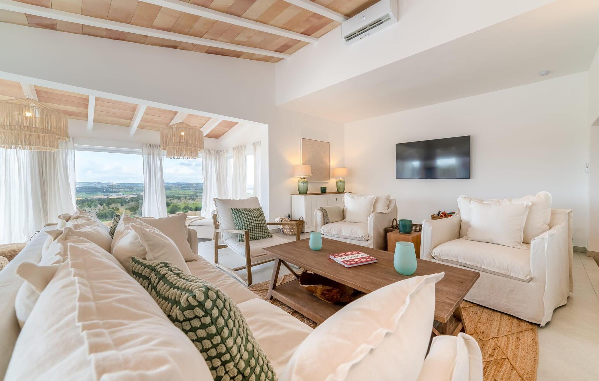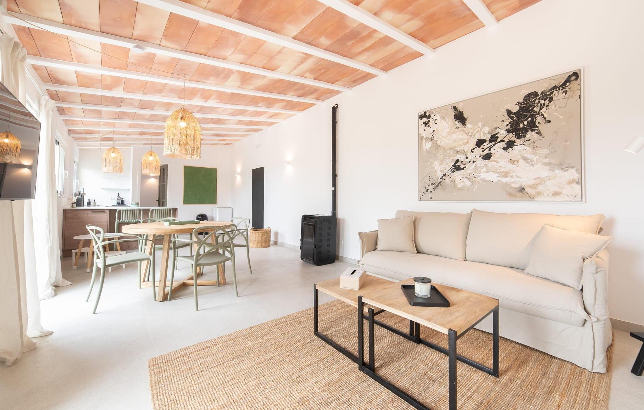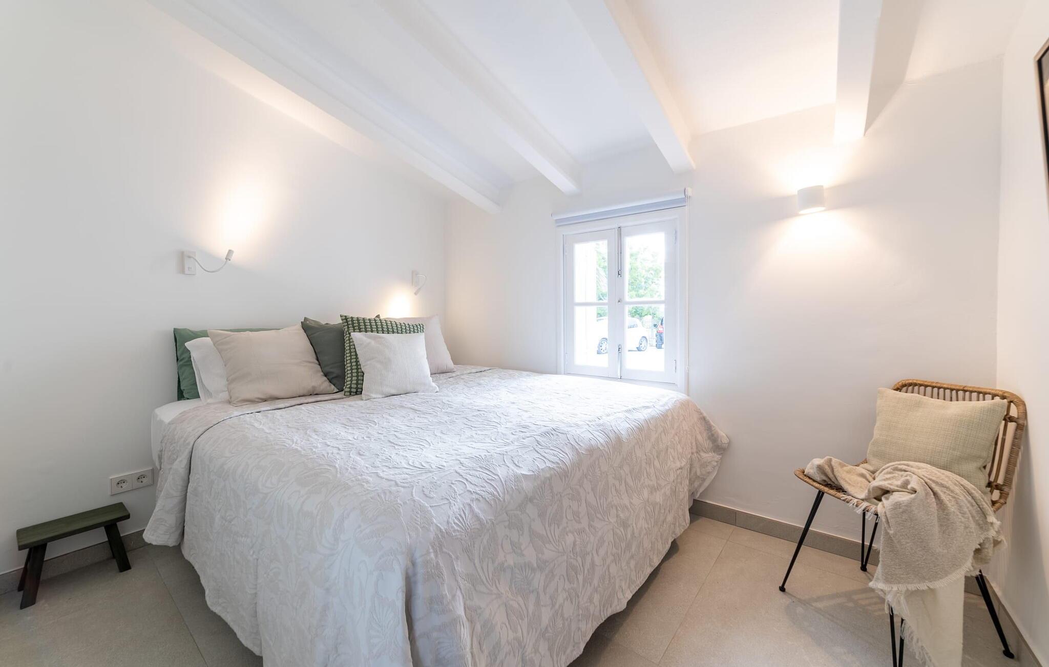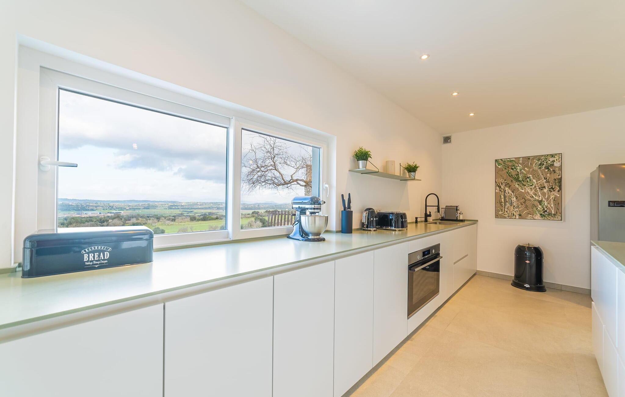 Stuehuset "Es Moli Ariany" er et usædvanligt æstetisk feriehus på Mallorca. Med hensyn til beliggenhed, indretning og stil opfylder denne ejendom selv de højeste standarder. En flot hvid stil præger poolen og solterrassen, hvorfra man kan nyde en vidunderlig udsigt over det brede landskab mod Tramuntana. Smukke daybeds og komfortable liggestole er tilgængelige for afslappende timer under middelhavshimlen. I kan også nyde den smukke udsigt fra den 11 m lange pool. I kan forberede selskabelige grillaftener i det overdækkede udekøkken med grill. Bagefter kan I spise lige ved siden af ved det dekorative langbord under det naturlige tag. Sportsentusiaster vil elske basketballkurven og tennisbanen. Det oprindelige mølletårn med en omgivende terrasse var dygtigt iscenesat. Bag flere gulv-til-loft-vinduer afslører interiøret et trendy, eftertrykkeligt stilrent boligmiljø. Lyse, harmoniske farver kendetegner det elegante interiør, som består af smarte møbler og originalt tilbehør. Alt finder en fremragende plads i den behagelige rummelighed. Den store stue byder ikke kun på maksimal komfort, men også en fantastisk udsigt over husets vidder. I det store køkken, fuldt udstyret til en høj standard med Bora-induktion, luksuriøse elektriske apparater, stenbordplader osv., kan I tilberede måltider sammen og spise ved det store spisebord med en fantastisk udsigt over Tramuntana-bjergene. Tre komfortable dobbeltværelser (med luksuriøse boxmadrasser), to af dem med private badeværelser, og et andet badeværelse fuldender husets indbydende rum. Der er yderligere to helt uafhængige områder, hver med et soveværelse med dobbeltseng, en privat opholdsstue med stilfuld morgenmadsbar, et moderne brusebad og et privat udendørs område til afslapning. Dette hus er ideelt for en større gruppe rejsende, der værdsætter en god beliggenhed, omfattende faciliteter af høj kvalitet og et højt niveau af stil og privatliv. Dette stilfulde bondehus på Mallorca ligger i den vestlige udkant af landsbyen Ariany i centrum af øen. Den meget velmoderniserede historiske feriebolig med et smukt udendørsområde og en sensationel panoramaudsigt ligger også i en attraktiv infrastrukturel beliggenhed: I kan gøre jeres indkøb i Santa Margalida (8 km) og Petra (7 km), den nærmeste strand er Can Picafort - er ca. 17 km væk. Bemærk venligst, at denne ejendom ikke accepterer ungdomsgrupper eller polterabender. En ungdomsgruppe på denne ejendom består af personer på 25 år eller derunder. Book ikke denne ejendom, hvis I er en ungdomsgruppe eller en polterabendgruppe, da jeres reservation vil blive afvist, når den er booket, hvilket også kan være tilfældet ved ankomst til ejendommen eller under jeres ophold, og I vil ikke modtage en refusion.