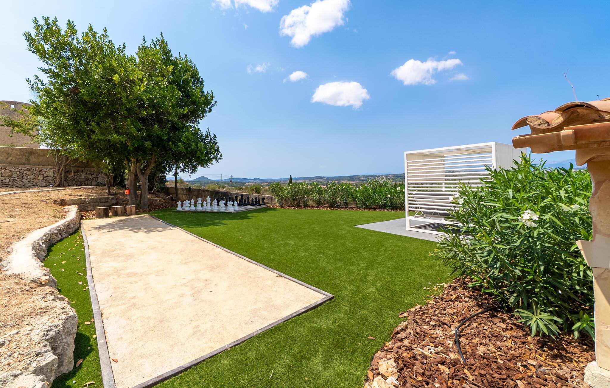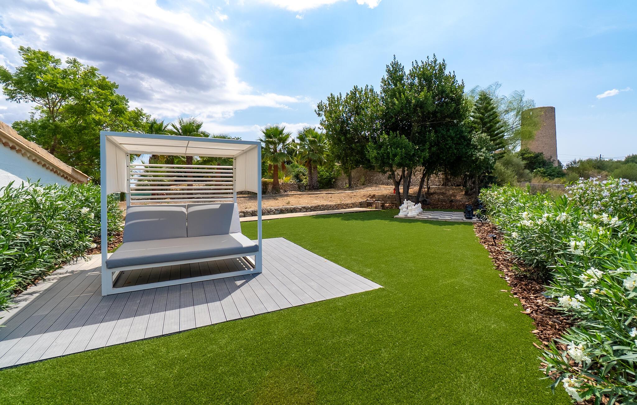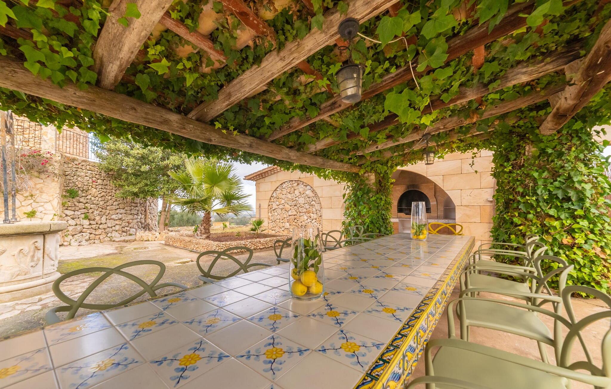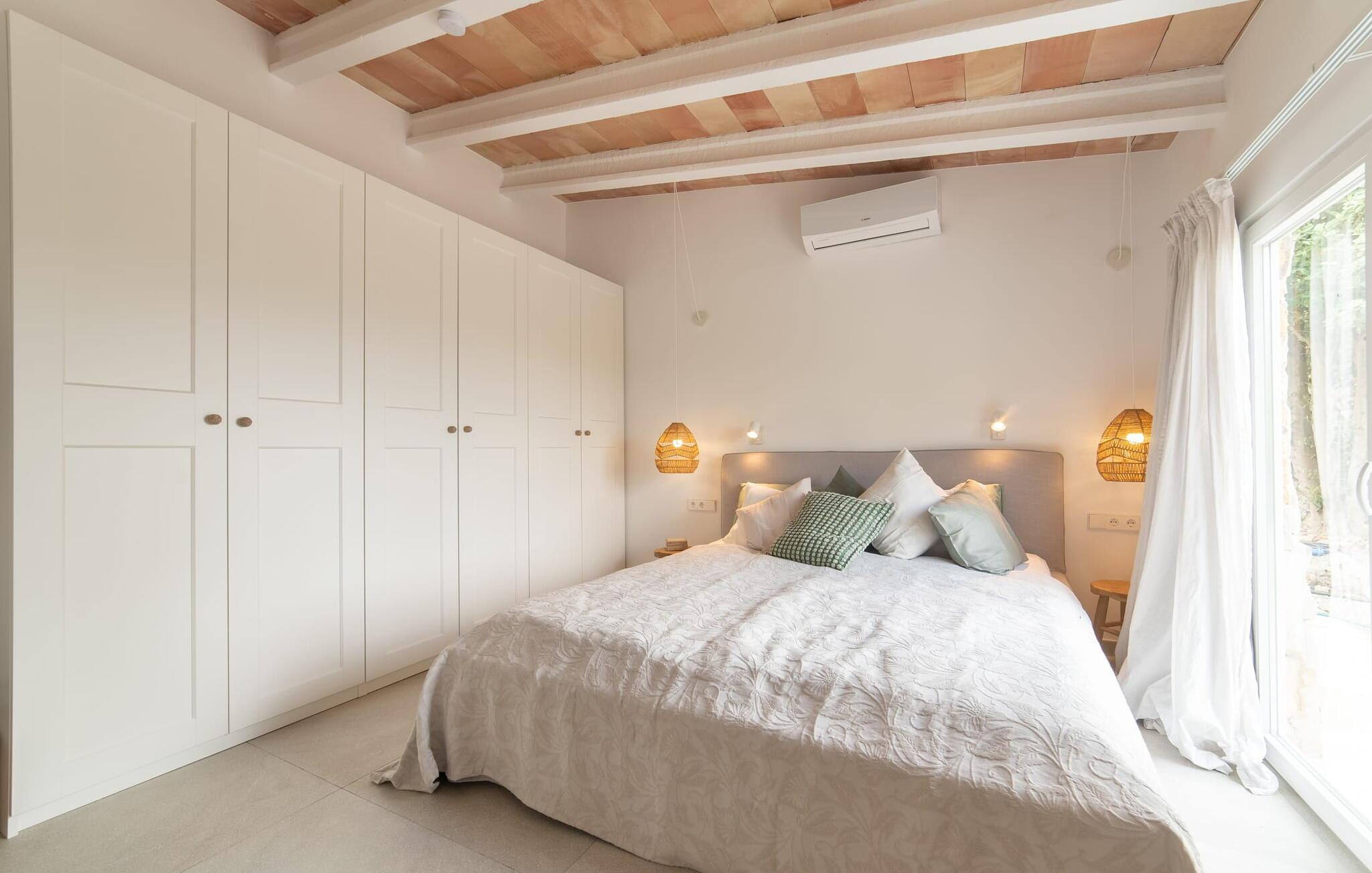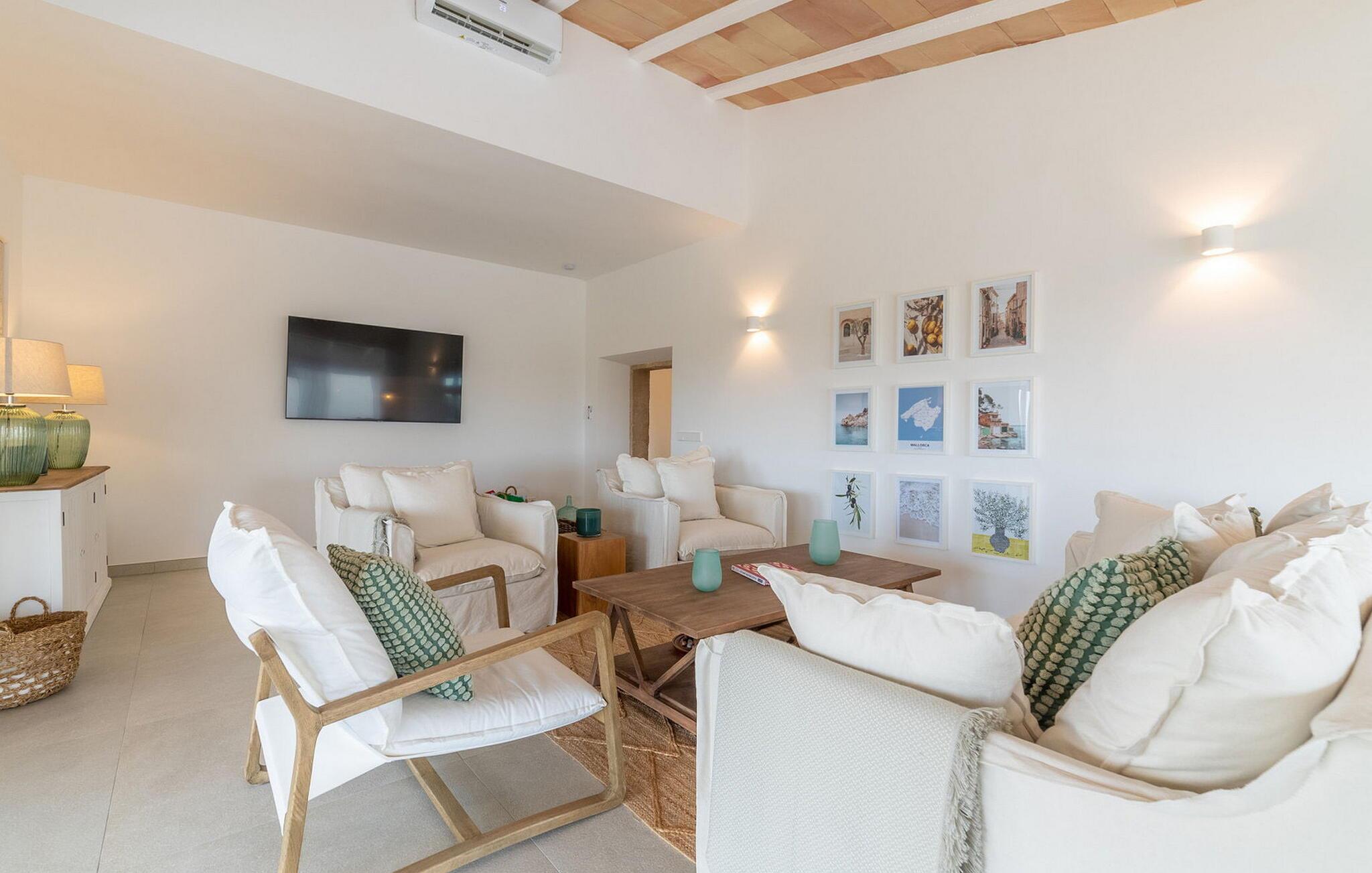 Stuehuset "Es Moli Ariany" er et usædvanligt æstetisk feriehus på Mallorca. Med hensyn til beliggenhed, indretning og stil opfylder denne ejendom selv de højeste standarder. En flot hvid stil præger poolen og solterrassen, hvorfra man kan nyde en vidunderlig udsigt over det brede landskab mod Tramuntana. Smukke daybeds og komfortable liggestole er tilgængelige for afslappende timer under middelhavshimlen. I kan også nyde den smukke udsigt fra den 11 m lange pool. I kan forberede selskabelige grillaftener i det overdækkede udekøkken med grill. Bagefter kan I spise lige ved siden af ved det dekorative langbord under det naturlige tag. Sportsentusiaster vil elske basketballkurven og tennisbanen. Det oprindelige mølletårn med en omgivende terrasse var dygtigt iscenesat. Bag flere gulv-til-loft-vinduer afslører interiøret et trendy, eftertrykkeligt stilrent boligmiljø. Lyse, harmoniske farver kendetegner det elegante interiør, som består af smarte møbler og originalt tilbehør. Alt finder en fremragende plads i den behagelige rummelighed. Den store stue byder ikke kun på maksimal komfort, men også en fantastisk udsigt over husets vidder. I det store køkken, fuldt udstyret til en høj standard med Bora-induktion, luksuriøse elektriske apparater, stenbordplader osv., kan I tilberede måltider sammen og spise ved det store spisebord med en fantastisk udsigt over Tramuntana-bjergene. Tre komfortable dobbeltværelser (med luksuriøse boxmadrasser), to af dem med private badeværelser, og et andet badeværelse fuldender husets indbydende rum. Der er yderligere to helt uafhængige områder, hver med et soveværelse med dobbeltseng, en privat opholdsstue med stilfuld morgenmadsbar, et moderne brusebad og et privat udendørs område til afslapning. Dette hus er ideelt for en større gruppe rejsende, der værdsætter en god beliggenhed, omfattende faciliteter af høj kvalitet og et højt niveau af stil og privatliv. Dette stilfulde bondehus på Mallorca ligger i den vestlige udkant af landsbyen Ariany i centrum af øen. Den meget velmoderniserede historiske feriebolig med et smukt udendørsområde og en sensationel panoramaudsigt ligger også i en attraktiv infrastrukturel beliggenhed: I kan gøre jeres indkøb i Santa Margalida (8 km) og Petra (7 km), den nærmeste strand er Can Picafort - er ca. 17 km væk. Bemærk venligst, at denne ejendom ikke accepterer ungdomsgrupper eller polterabender. En ungdomsgruppe på denne ejendom består af personer på 25 år eller derunder. Book ikke denne ejendom, hvis I er en ungdomsgruppe eller en polterabendgruppe, da jeres reservation vil blive afvist, når den er booket, hvilket også kan være tilfældet ved ankomst til ejendommen eller under jeres ophold, og I vil ikke modtage en refusion.