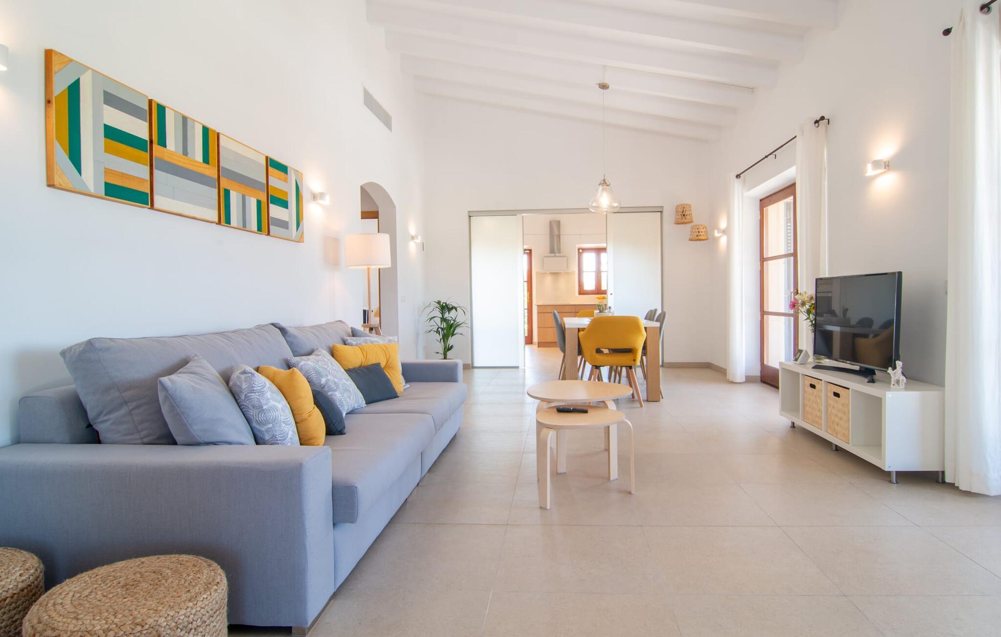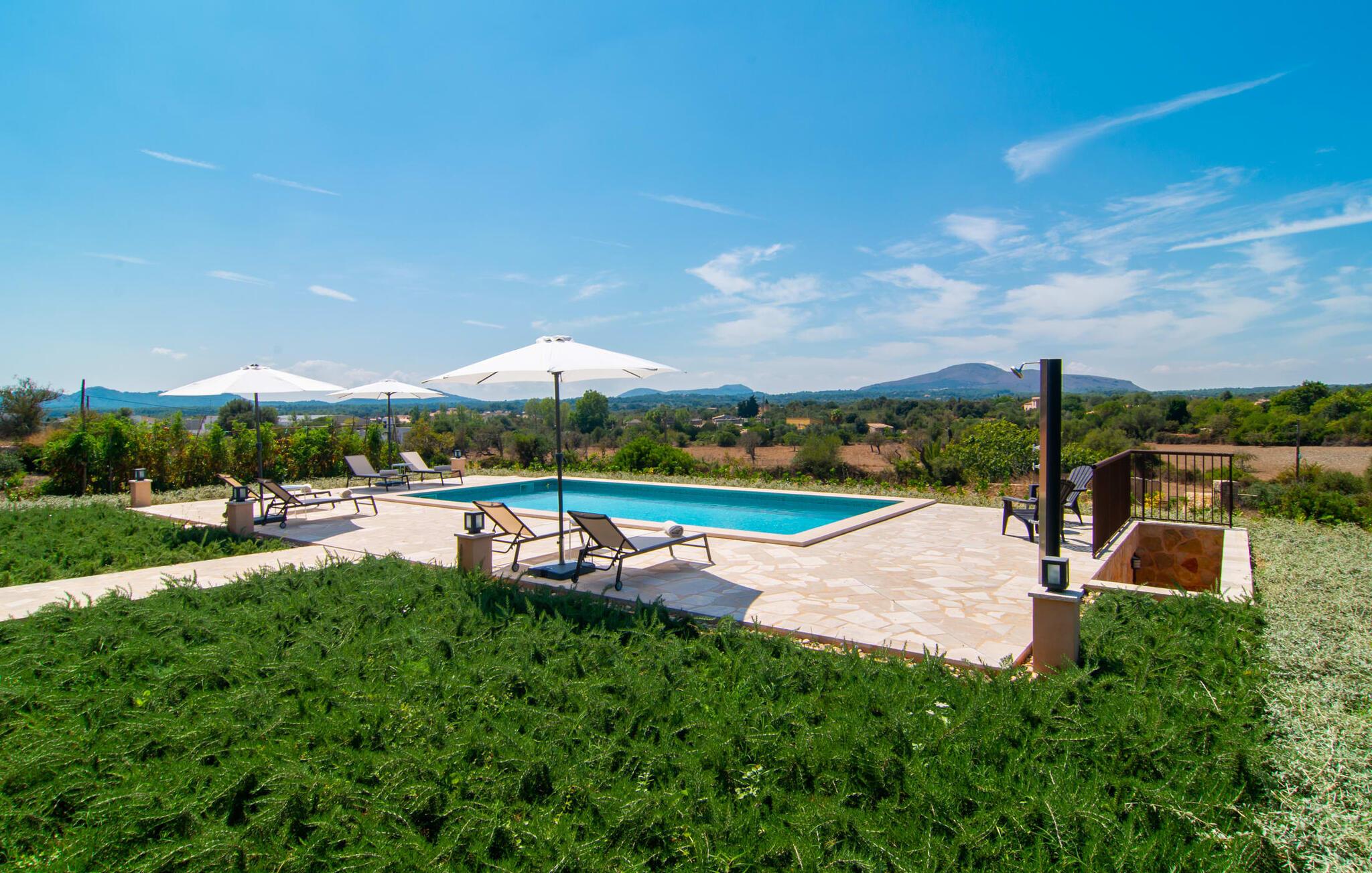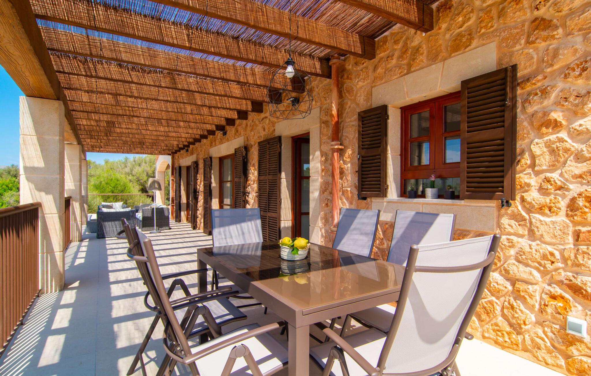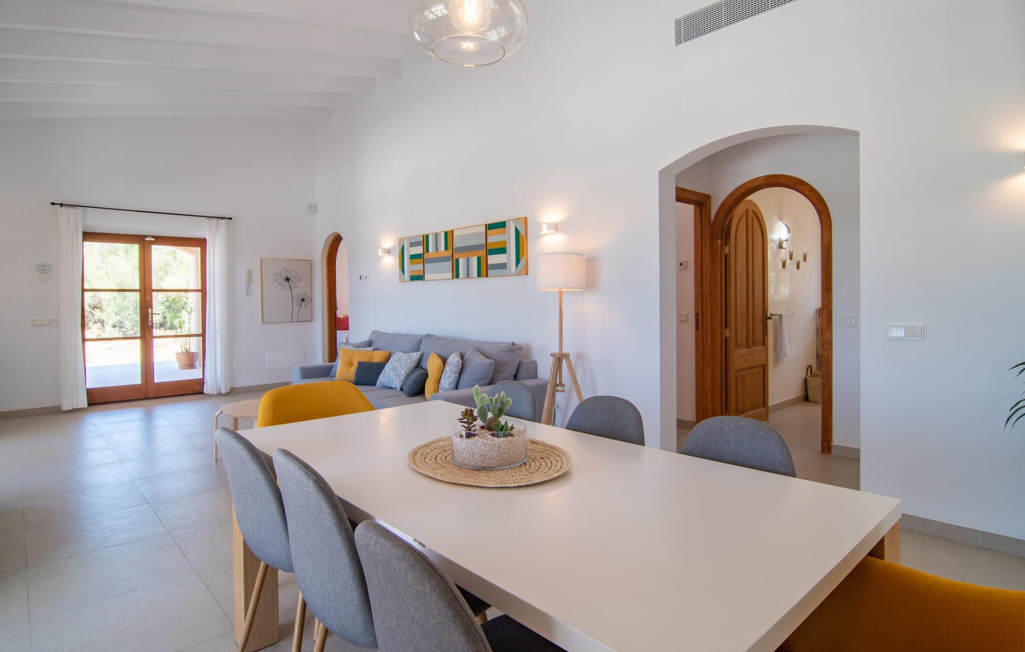 Villaen "Es Pou des Rafal" i den østlige del af Mallorca byder på vidunderlige kontraster: Stueetagen, let hævet naturstensvilla ser rustik ud udefra, men er meget chik og moderne og udstyret med alle de bekvemmeligheder, I kan ønske jer på ferien . Det imponerer med sin smukke landlige beliggenhed uden umiddelbare naboer på en kæmpe ejendom, der inviterer jer til at udforske meget. Lige bag huset, som har en stor, overdækket terrasse med spisebord med tilhørende stole og behagelige udendørs siddepladser, venter poolen på jer og byder på forfriskende kølighed. Efter jeres svømmetur kan I nyde en velfortjent siesta med en lækker drink eller en god bog på en af de komfortable liggestole, hvorfra I kan nyde en fantastisk udsigt over det omkringliggende landskab. Interiøret i jeres sommerhus er muntert og moderne: enkle møbler af høj kvalitet, lyse farver, stilfulde lamper samt trævinduer og dørkarme, der bevarer villaens landlige karakter - en overbevisende kombination! Alle værelser er i ét plan - her finder I ingen trapper. Opholds- og spiseafdelingen strækker sig over et enkelt, stort værelse: Den komfortable sofa med masser af hynder indbyder til hyggelige aftener med at se tv, mens I og jeres medrejsende kan nyde kulinariske delikatesser med et glas eller to vin i den elegante spisning. bord og polstrede designerstole. Det stilfulde køkken er et praktisk sted at tilberede måltider - I behøver ikke at bøje jer for at nå ovnen eller mikrobølgeovnen. Alle tre soveværelser lover søde drømme, alle hyggeligt diskret indrettet, hver med et stort skab, TV og gulv til loft vinduer, der giver en vidunderlig udsigt over naturen omkring huset. Boligkomforten suppleres af to moderne badeværelser, hvoraf det ene er en-suite. Her bor I idyllisk midt ude på landet - så I skal ikke gå glip af lange gåture eller en cykeltur! Dette hjørne af øen imponerer med sin frodige, typiske middelhavsvegetation, oliven-, mandel- og figentræslundene og de enorme gamle rosmarinbuske i siden af vejen. Foretrækker I at køre ind til byen, hvad enten det er til daglige indkøb, for at gå på restaurant eller bare for en hurtig indkøbstur, kan I køre de 1,5 km på landevejen, som afhængig af trafikken kan være hørbar vind ind i smukke by Arta. Smalle gader, masser af interessant arkitektur, kunst og kultur – Artà har bevaret sine traditioner. To forskellige markeder finder sted her hver tirsdag. Men der er heller ikke langt til stranden "Es Pou des Rafal": den fine sandstrand Canyamel, som er omgivet af natur, men som stadig byder på rigtig god infrastruktur, kan nås efter 11,5 km kørsel. Landliv med forbindelse til byen: Dette er den uovertrufne kombination, som naturstensvillaen i stueetagen "Es Pou de Rafal", kun 1,5 km fra Artàs porte, tilbyder. Huset ligger let forhøjet på en kæmpe grund i den østlige del af Mallorca. Der er en pool foran den overdækkede terrasse, som byder på en vidunderlig udsigt over det omkringliggende landskab, men I kan også bruge jeres tid på liggestolene omkring den. Canyamel Strand ligger kun 11,5 km derfra.