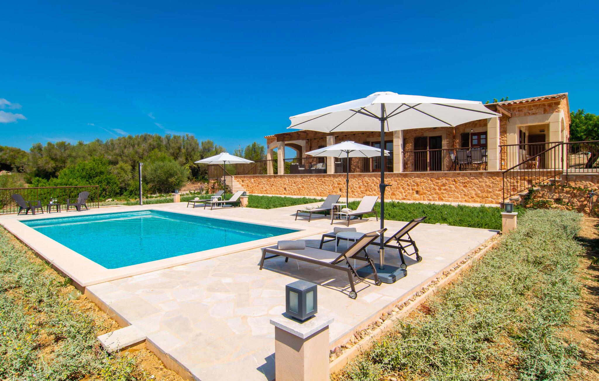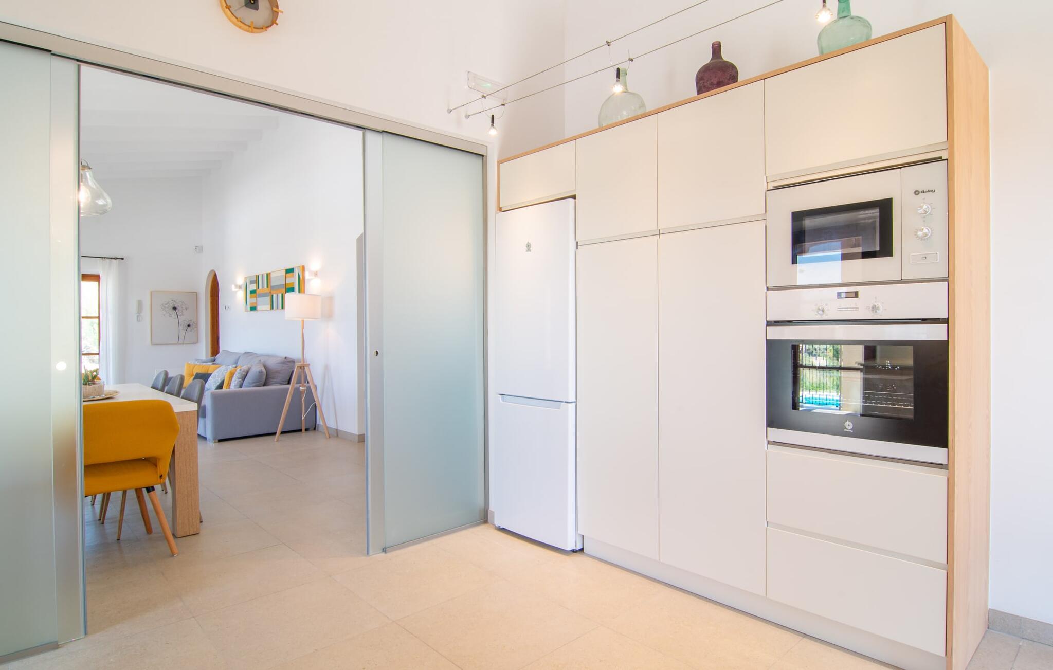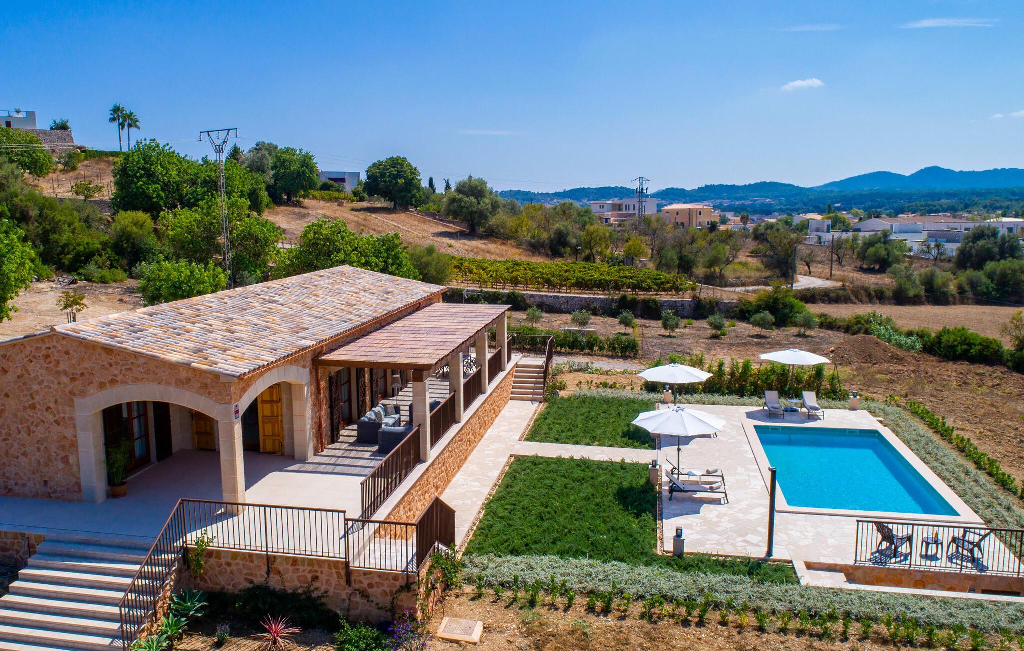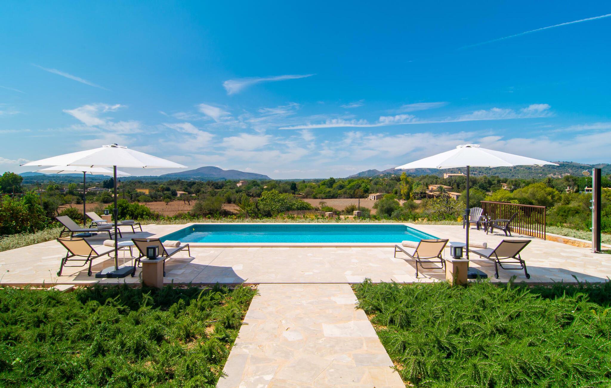 Villaen "Es Pou des Rafal" i den østlige del af Mallorca byder på vidunderlige kontraster: Stueetagen, let hævet naturstensvilla ser rustik ud udefra, men er meget chik og moderne og udstyret med alle de bekvemmeligheder, I kan ønske jer på ferien . Det imponerer med sin smukke landlige beliggenhed uden umiddelbare naboer på en kæmpe ejendom, der inviterer jer til at udforske meget. Lige bag huset, som har en stor, overdækket terrasse med spisebord med tilhørende stole og behagelige udendørs siddepladser, venter poolen på jer og byder på forfriskende kølighed. Efter jeres svømmetur kan I nyde en velfortjent siesta med en lækker drink eller en god bog på en af de komfortable liggestole, hvorfra I kan nyde en fantastisk udsigt over det omkringliggende landskab. Interiøret i jeres sommerhus er muntert og moderne: enkle møbler af høj kvalitet, lyse farver, stilfulde lamper samt trævinduer og dørkarme, der bevarer villaens landlige karakter - en overbevisende kombination! Alle værelser er i ét plan - her finder I ingen trapper. Opholds- og spiseafdelingen strækker sig over et enkelt, stort værelse: Den komfortable sofa med masser af hynder indbyder til hyggelige aftener med at se tv, mens I og jeres medrejsende kan nyde kulinariske delikatesser med et glas eller to vin i den elegante spisning. bord og polstrede designerstole. Det stilfulde køkken er et praktisk sted at tilberede måltider - I behøver ikke at bøje jer for at nå ovnen eller mikrobølgeovnen. Alle tre soveværelser lover søde drømme, alle hyggeligt diskret indrettet, hver med et stort skab, TV og gulv til loft vinduer, der giver en vidunderlig udsigt over naturen omkring huset. Boligkomforten suppleres af to moderne badeværelser, hvoraf det ene er en-suite. Her bor I idyllisk midt ude på landet - så I skal ikke gå glip af lange gåture eller en cykeltur! Dette hjørne af øen imponerer med sin frodige, typiske middelhavsvegetation, oliven-, mandel- og figentræslundene og de enorme gamle rosmarinbuske i siden af vejen. Foretrækker I at køre ind til byen, hvad enten det er til daglige indkøb, for at gå på restaurant eller bare for en hurtig indkøbstur, kan I køre de 1,5 km på landevejen, som afhængig af trafikken kan være hørbar vind ind i smukke by Arta. Smalle gader, masser af interessant arkitektur, kunst og kultur – Artà har bevaret sine traditioner. To forskellige markeder finder sted her hver tirsdag. Men der er heller ikke langt til stranden "Es Pou des Rafal": den fine sandstrand Canyamel, som er omgivet af natur, men som stadig byder på rigtig god infrastruktur, kan nås efter 11,5 km kørsel. Landliv med forbindelse til byen: Dette er den uovertrufne kombination, som naturstensvillaen i stueetagen "Es Pou de Rafal", kun 1,5 km fra Artàs porte, tilbyder. Huset ligger let forhøjet på en kæmpe grund i den østlige del af Mallorca. Der er en pool foran den overdækkede terrasse, som byder på en vidunderlig udsigt over det omkringliggende landskab, men I kan også bruge jeres tid på liggestolene omkring den. Canyamel Strand ligger kun 11,5 km derfra.