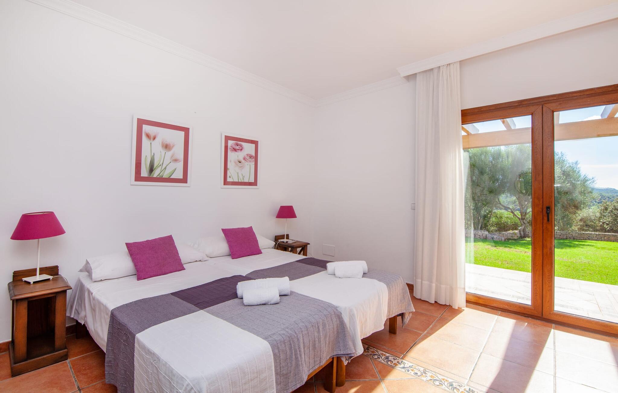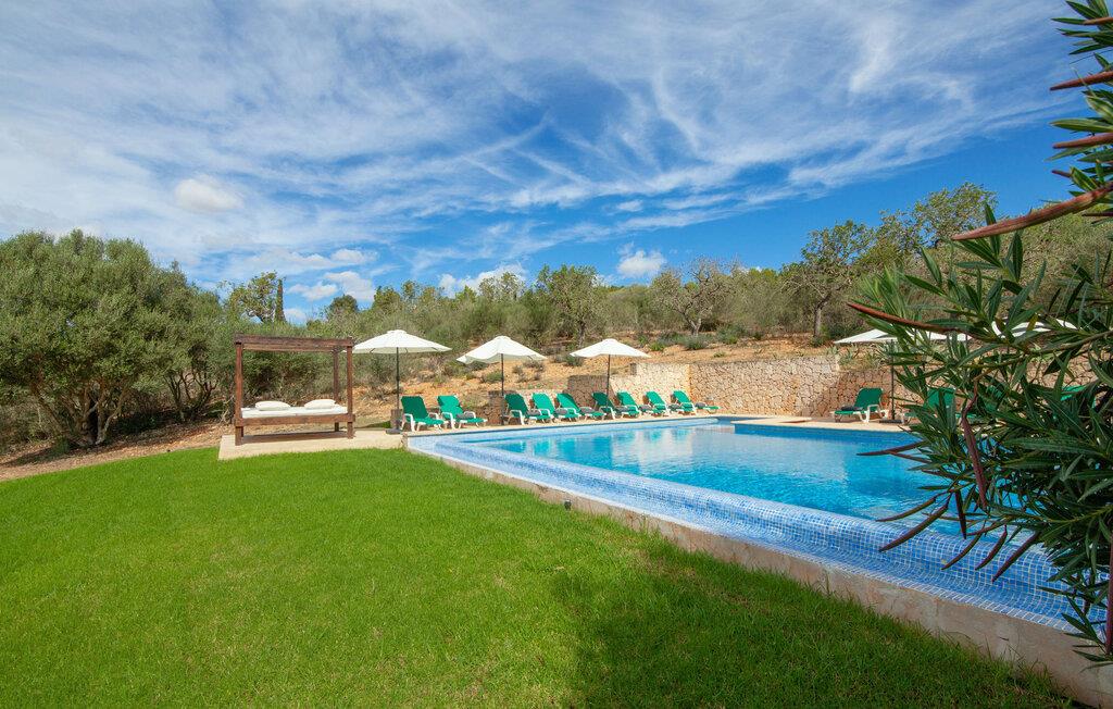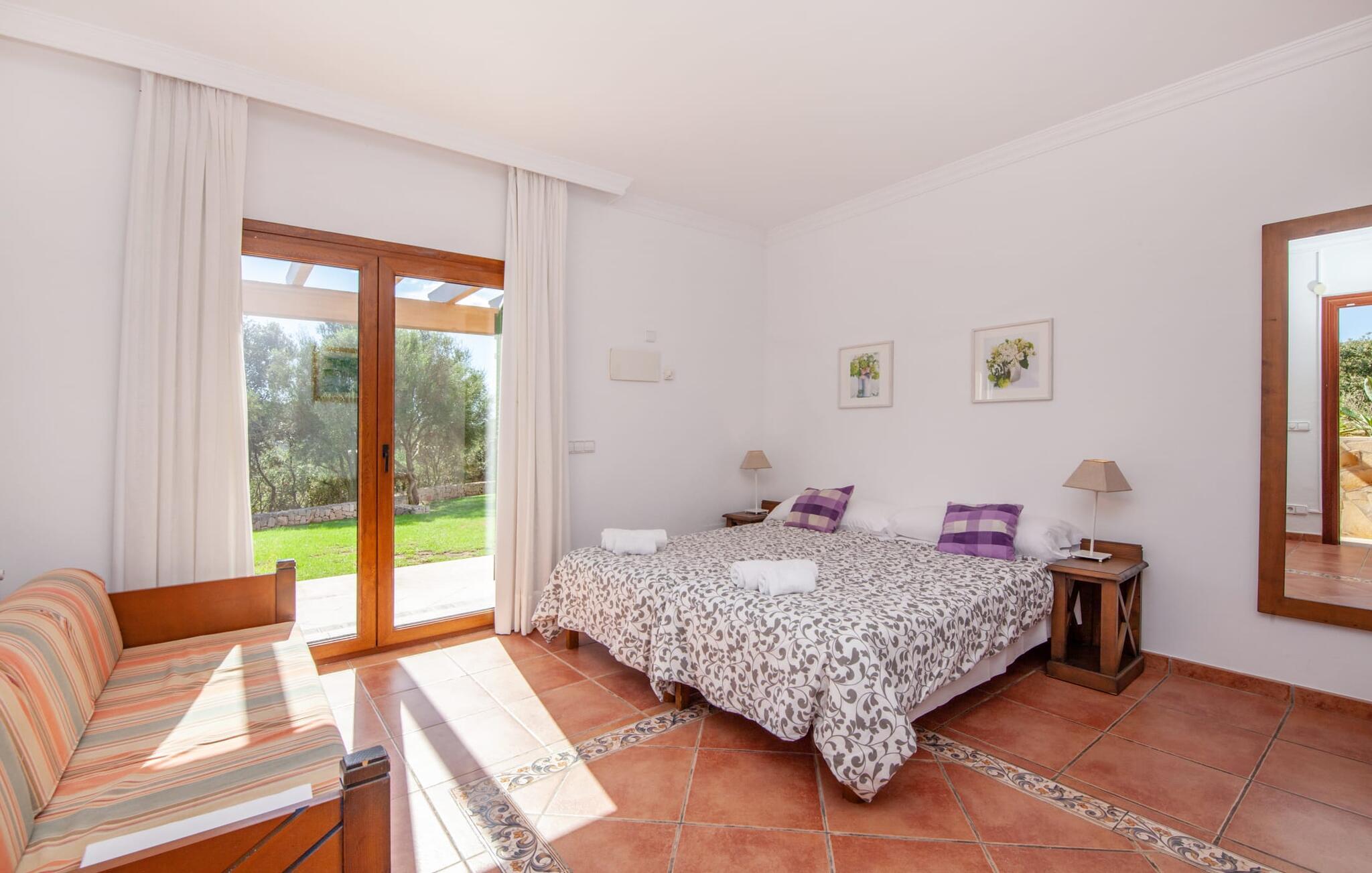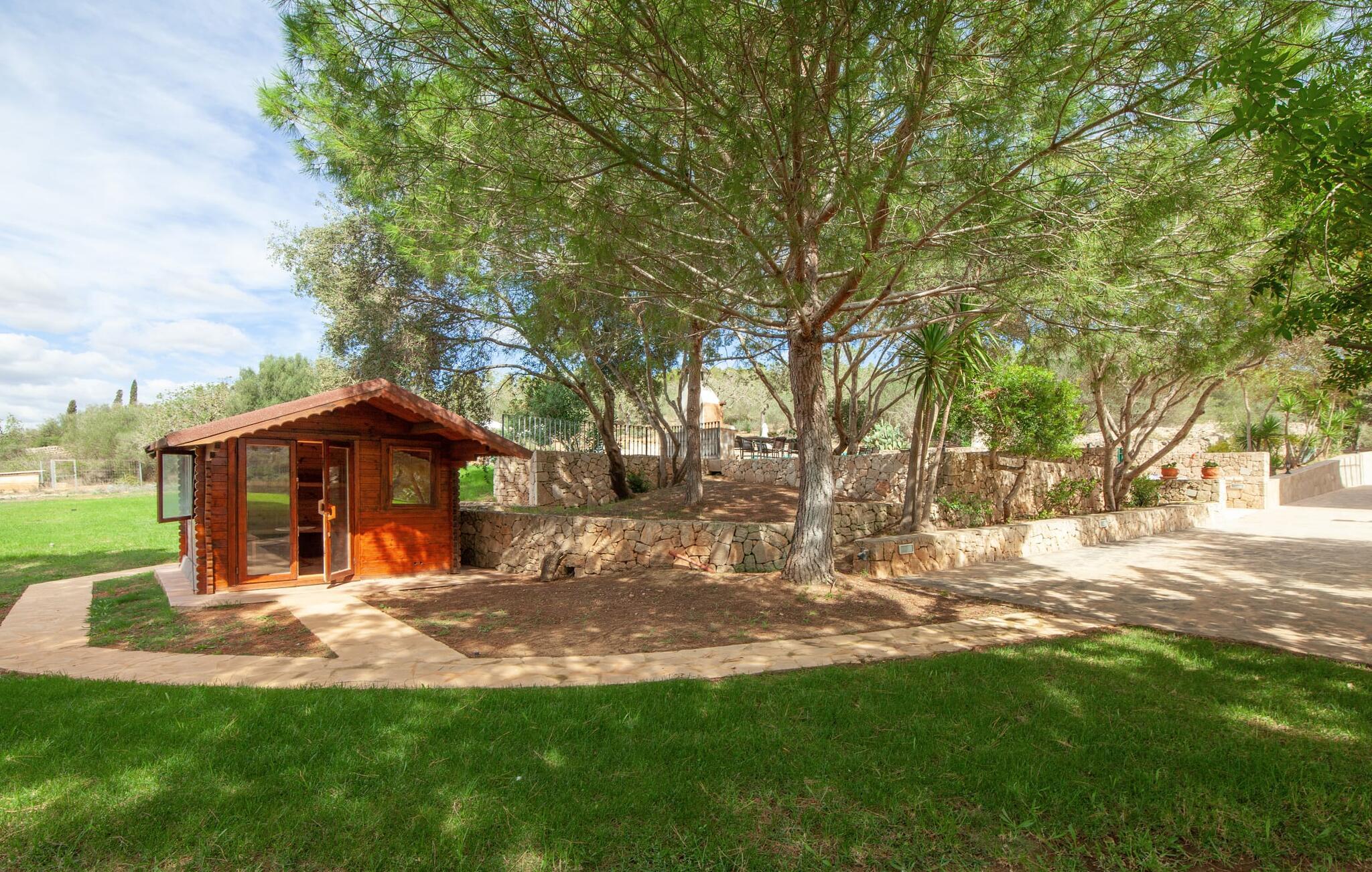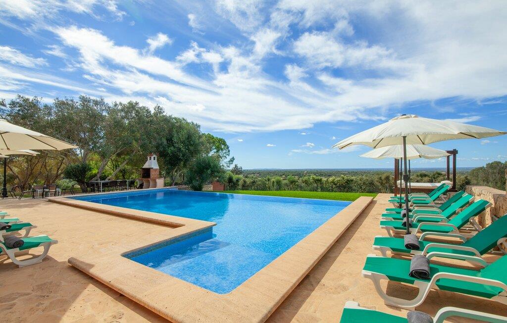 Oplev en uforglemmelig bondegårdsferie på "Es Puig d'es Call" på Mallorca, perfekt for familie og venner. Dette rummelige bondehus kan rumme op til atten gæster og ligger på en smukt vedligeholdt bjergskråning nær Felanitx. Udendørsområdet har store græsplæner til børn, charmerende brolagte terrasser og balkoner med en fantastisk udsigt over landskabet. Nyd en stor pool omgivet af komfortable liggestole og en fantastisk rustik grillplads, ideel til at nyde Mallorcas solrige klima. Parkeringspladser er tilgængelige ved huset i skyggen af træer. Stuehuset byder på masser af plads til privatlivets fred og masser af naturligt lys kommer gennem adskillige vinduer. Interiøret udstråler en varm, sommerlig atmosfære, forstærket af lyse farver og nøje udvalgt indretning, samt rustikke mallorcanske elementer som en muret pejs og en naturstensvæg. Fællesarealer, herunder en hyggelig spisestue, stue og veludstyret køkken, er designet til komfort. Ejendommen har ni stilfulde soveværelser med dobbeltsenge fordelt på to etager, suppleret med ni moderne badeværelser, hvoraf syv er en suite, herunder et med jacuzzi for ultimativ afslapning. Det store, velholdte bondehus "Es Puig d'es Call" ligger på en rummelig, grøn grund på den sydlige del af øen. På trods af den landlige beliggenhed kan den næste by med butikker og restauranter hurtigt nås: Felanitx ligger kun 2,5 km væk med lejebil på den nærliggende landevej. Smukke strande som Cala Gran eller Cala d'Or ligger kun omkring 14 km væk.