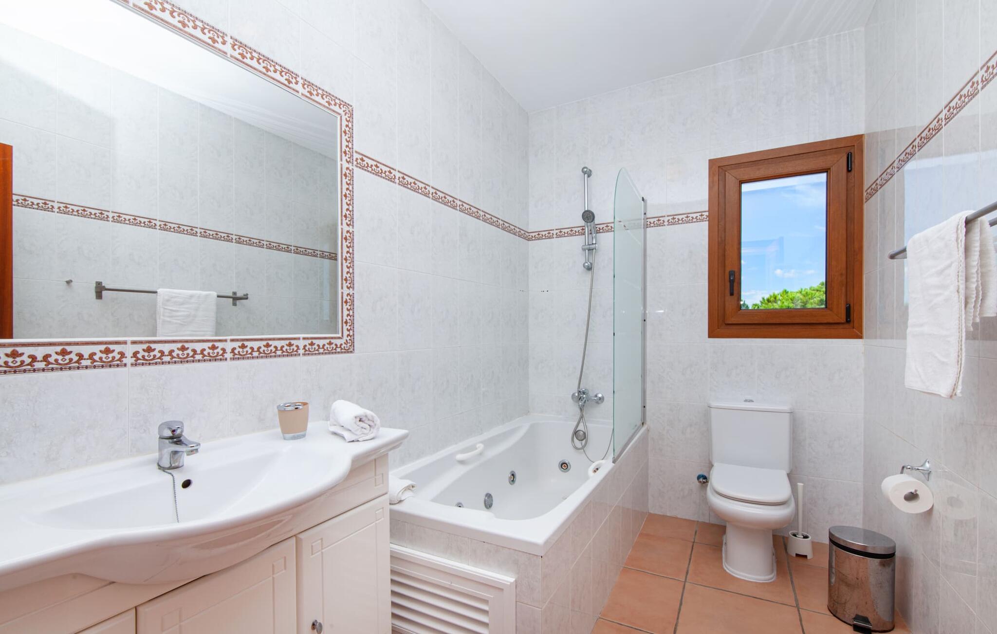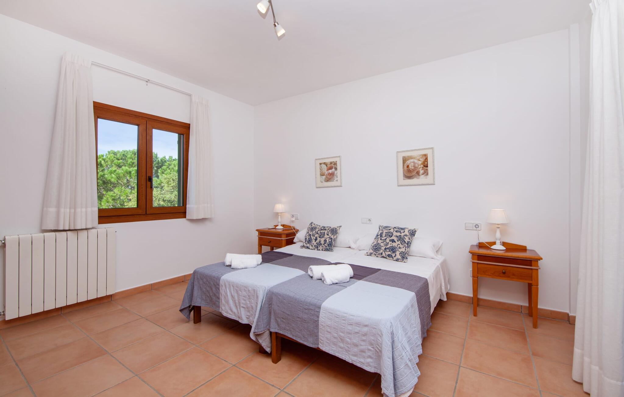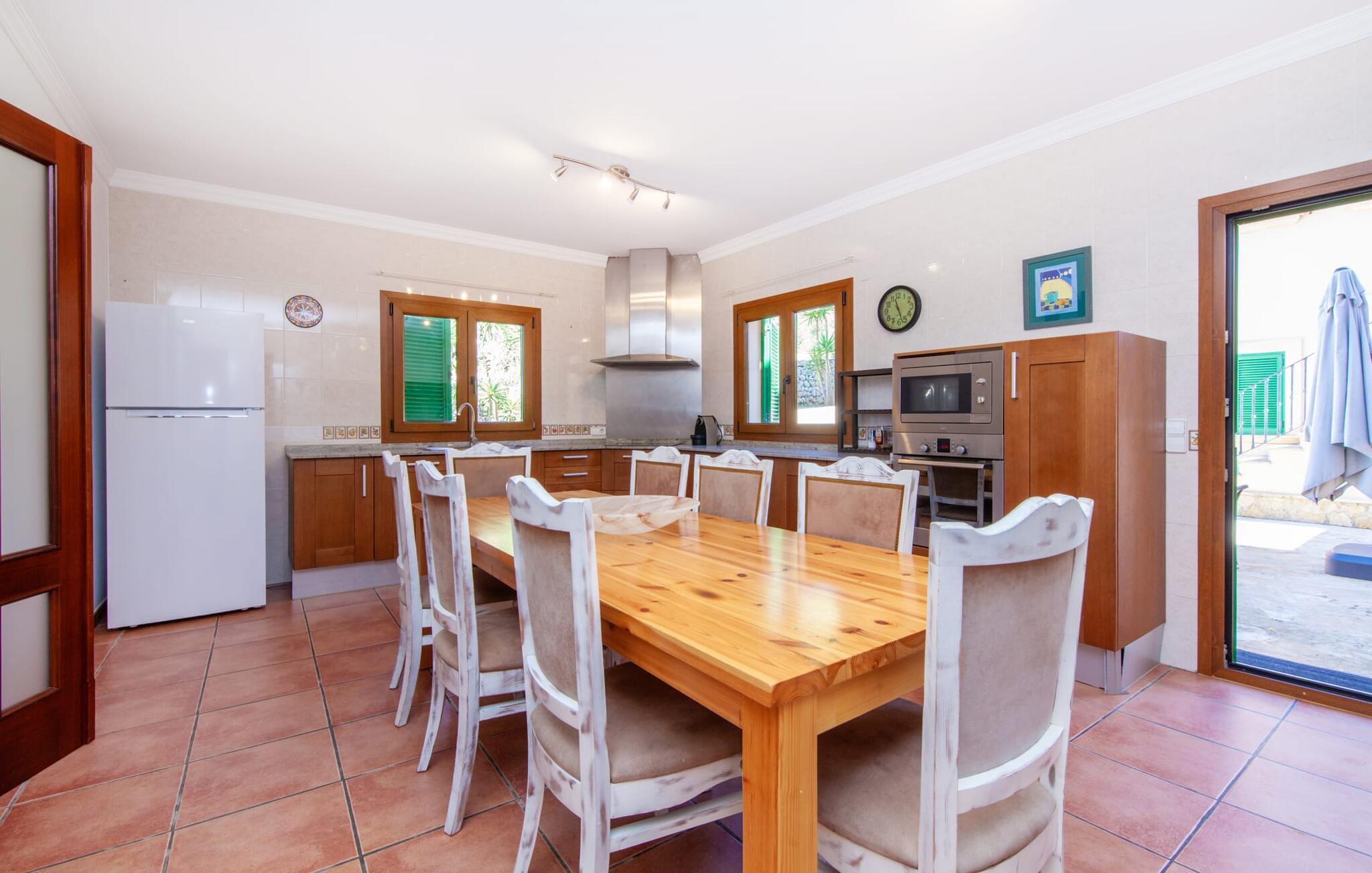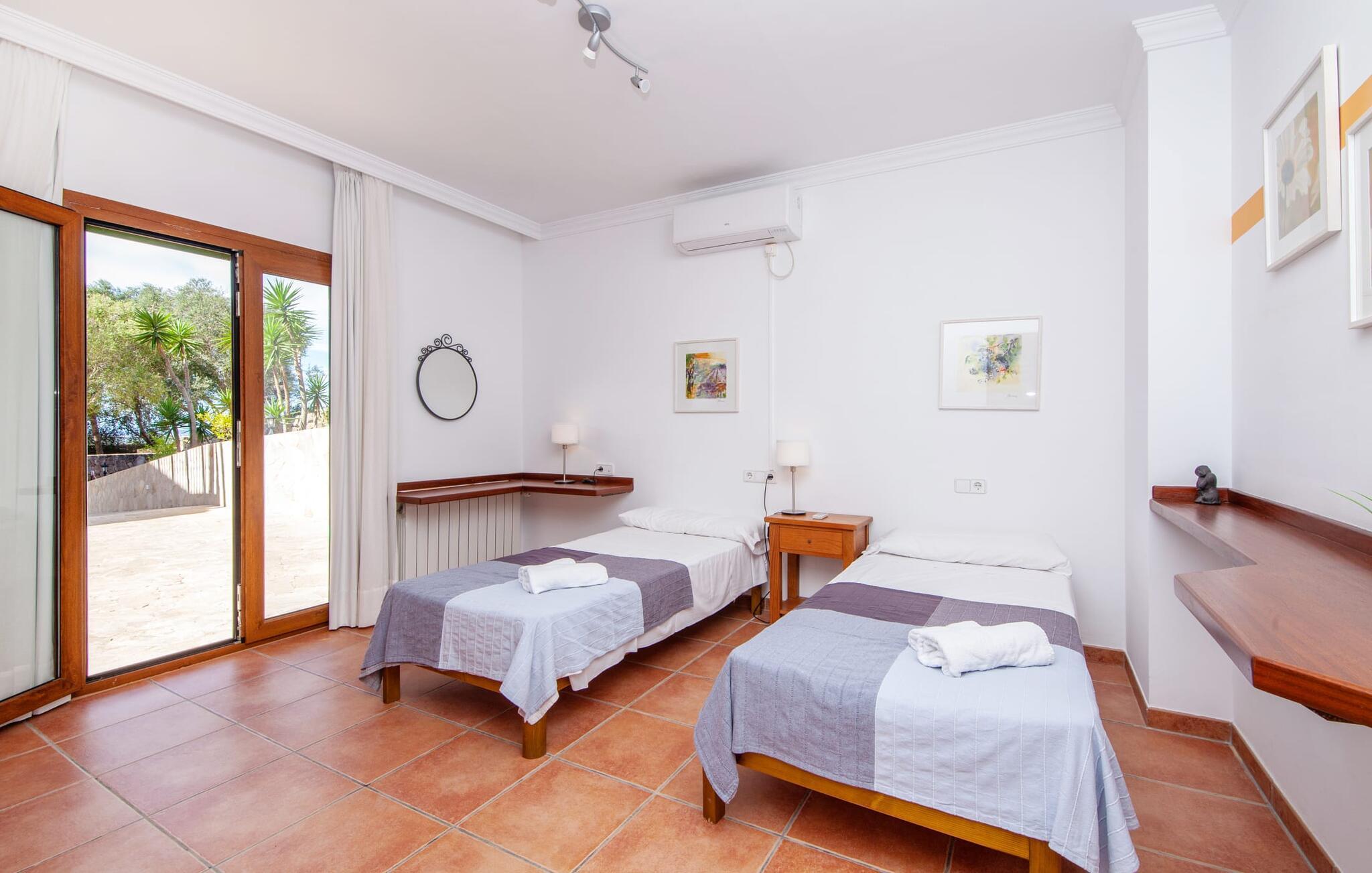 Oplev en uforglemmelig bondegårdsferie på "Es Puig d'es Call" på Mallorca, perfekt for familie og venner. Dette rummelige bondehus kan rumme op til atten gæster og ligger på en smukt vedligeholdt bjergskråning nær Felanitx. Udendørsområdet har store græsplæner til børn, charmerende brolagte terrasser og balkoner med en fantastisk udsigt over landskabet. Nyd en stor pool omgivet af komfortable liggestole og en fantastisk rustik grillplads, ideel til at nyde Mallorcas solrige klima. Parkeringspladser er tilgængelige ved huset i skyggen af træer. Stuehuset byder på masser af plads til privatlivets fred og masser af naturligt lys kommer gennem adskillige vinduer. Interiøret udstråler en varm, sommerlig atmosfære, forstærket af lyse farver og nøje udvalgt indretning, samt rustikke mallorcanske elementer som en muret pejs og en naturstensvæg. Fællesarealer, herunder en hyggelig spisestue, stue og veludstyret køkken, er designet til komfort. Ejendommen har ni stilfulde soveværelser med dobbeltsenge fordelt på to etager, suppleret med ni moderne badeværelser, hvoraf syv er en suite, herunder et med jacuzzi for ultimativ afslapning. Det store, velholdte bondehus "Es Puig d'es Call" ligger på en rummelig, grøn grund på den sydlige del af øen. På trods af den landlige beliggenhed kan den næste by med butikker og restauranter hurtigt nås: Felanitx ligger kun 2,5 km væk med lejebil på den nærliggende landevej. Smukke strande som Cala Gran eller Cala d'Or ligger kun omkring 14 km væk.