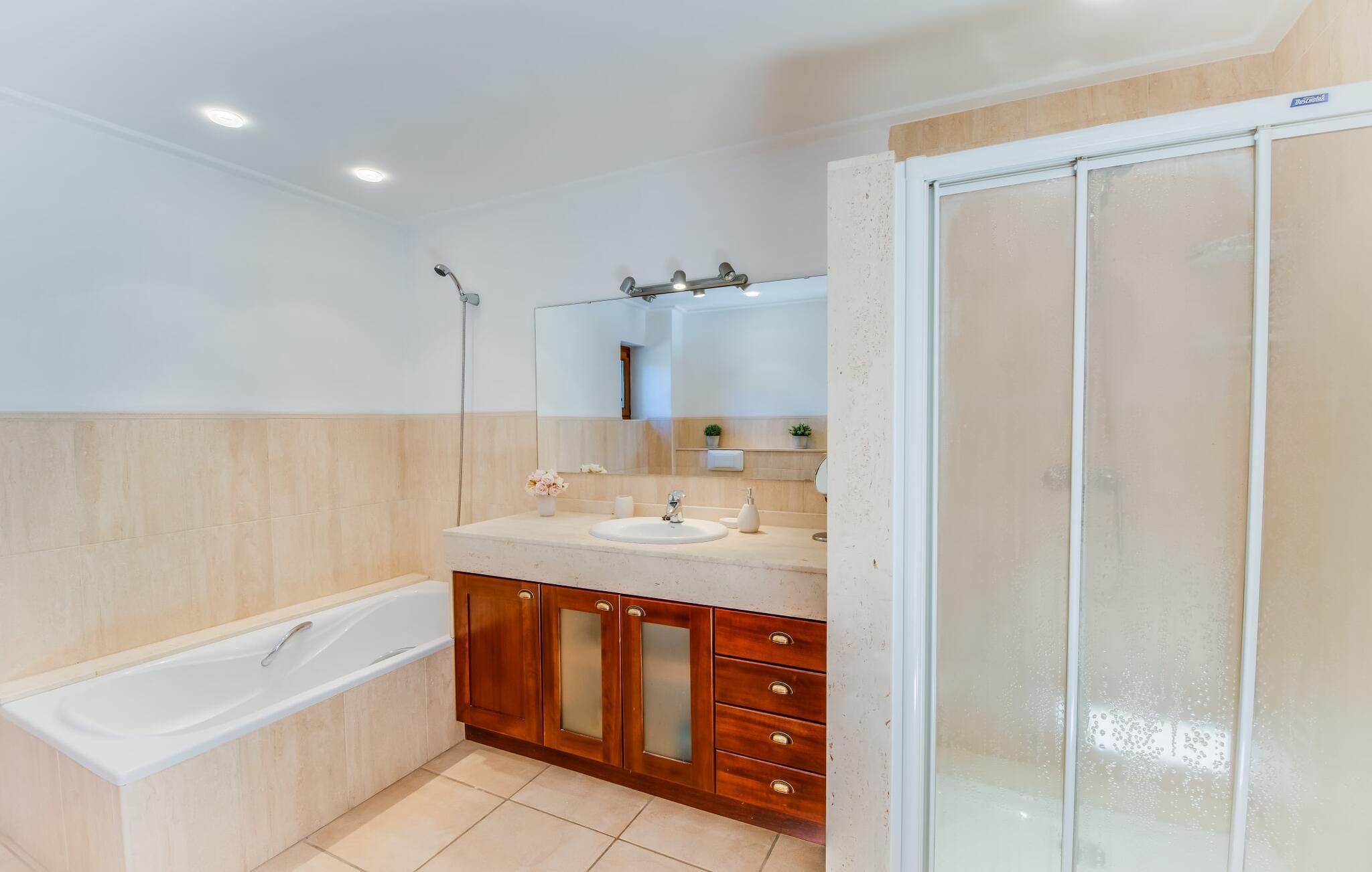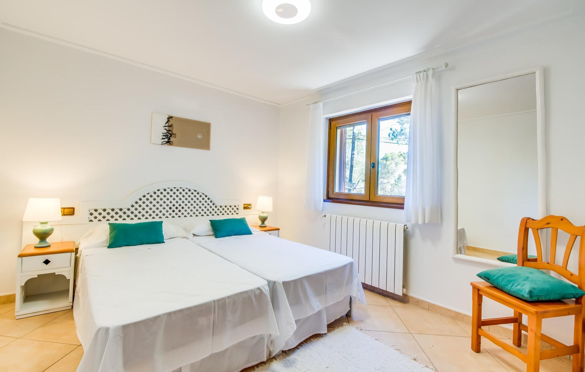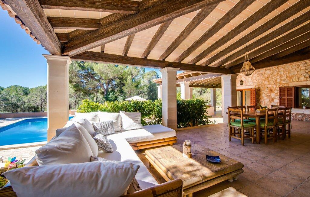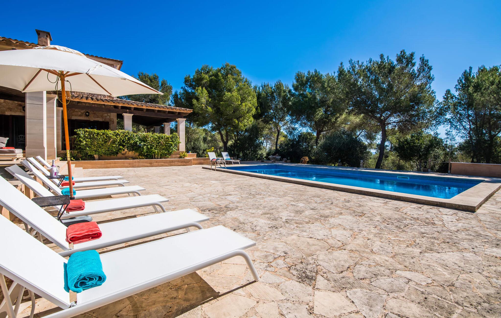 Den stilfulde "Es Puig de Portocolom" lover et roligt tilflugtssted omgivet af natur, der tilbyder fuldstændig privatliv og mulighed for større forsamlinger. Denne vidtstrakte ejendom, beliggende i en frodig fyrreskov, består af flere rummelige villaer, hver med sin egen indgang og parkeringsplads, der tilbyder masser af plads til gæster og udlejningsbiler. Den to-etagers villa har en omsluttende terrasse med komfortable loungeområder, herunder plyspuder, kurvestole og bambus-accenter. Poolområdet, omgivet af rattan-solsenge, tilbyder det perfekte sted at slappe af omgivet af natur. For mere privatliv kan I trække jer tilbage til et roligt hjørne af haven, hvor et gammelt oliventræ giver skygge og fred. Indvendigt har villaen et lyst, skandinavisk-inspireret design med opholdsarealer i åbent plan. I stueetagen er der en rummelig opholdsstue med pejs, fladskærms-tv og spiseplads. Det separate køkken er veludstyret til store grupper, med lange bordplader og nem adgang til terrassen. Et gæstesoveværelse i stueetagen giver ekstra komfort. Ovenpå byder to soveværelser på masser af plads og deler badeværelse, mens det tredje soveværelse har en stor 1,80 cm bred seng og eget badeværelse. Mellem Portocolom på kysten og Felanitx i hjertet af øen tilbyder "Es Puig de Portocolom" afslapning i naturen og det højeste niveau af privatliv. Det er kun 6 km til calas på den sydøstlige kyst, et par minutter i bil til Vall d'Or golfbanen og kun en halv time til Toscana Mallorcas omkring Santanyí. Butikker, caféer og restauranter findes overalt i området. For større indkøbsture kan I tage til Manacor.