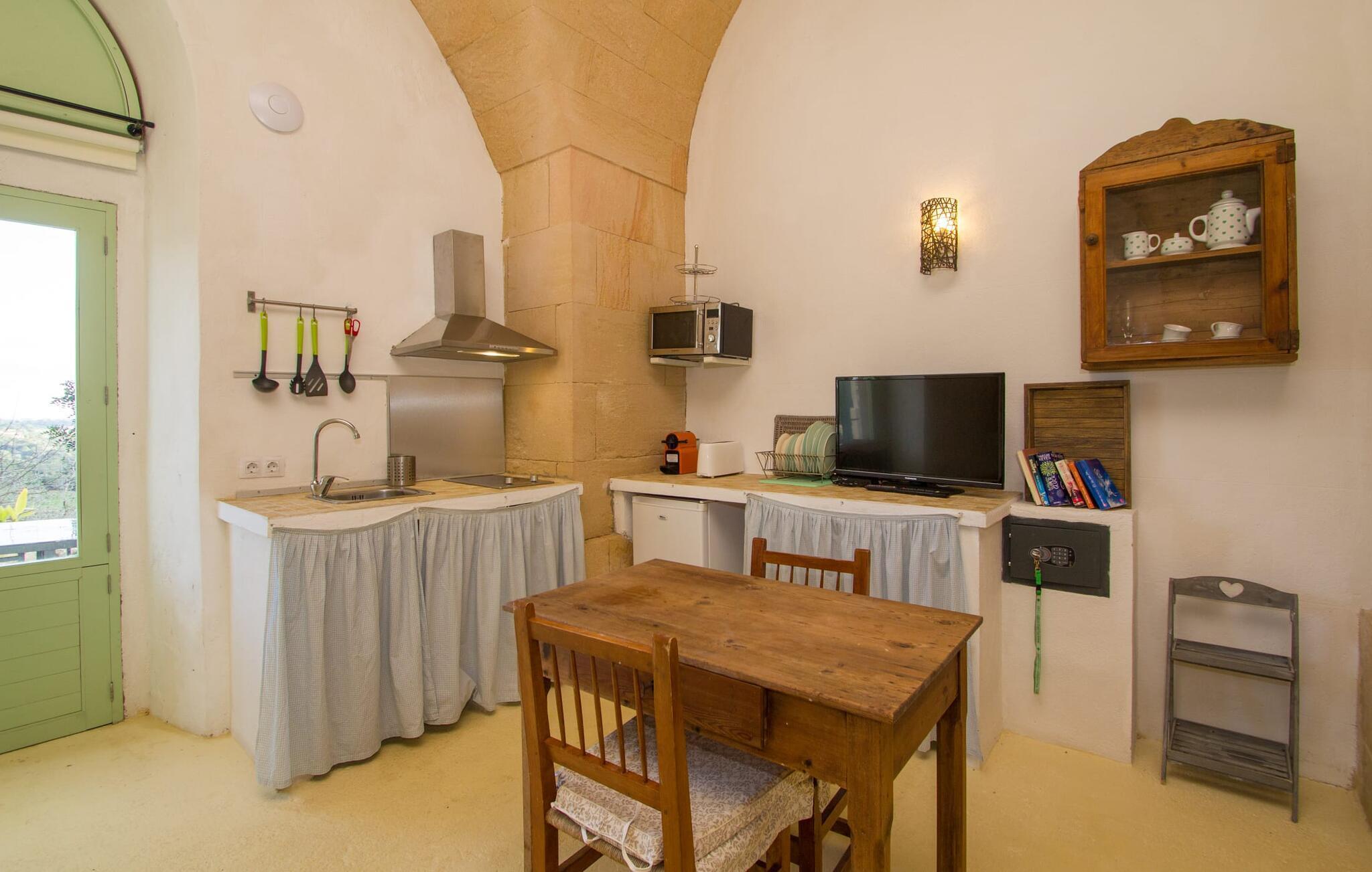 "Es Pujol Ametlera" tilbyder en unik oplevelse med sin blanding af komfort og originalitet. Beliggende i det betagende landskab på det sydlige Mallorca, tæt på kysten, ligger dette elegant designede tilflugtssted. Dette er et feriehus i Fincallorca. Det er omgivet af en smukt anlagt have og kombinerer charmen fra en traditionel mallorcansk agroturismo med et hotels bekvemmeligheder, hvilket gør det til et ideelt valg for dem, der leder efter fred og ro uden at ofre komfort. Udeområdet har forskellige siddepladser til afslapning samt legeplads og aktiviteter for børn. Den fælles pool, der er åben fra maj til oktober, er perfekt til svømning, mens panoramaterrassen med liggestole tilbyder et fredeligt sted at slappe af. En møbleret udendørs spiseplads er ideel til spisning under åben himmel. Indvendigt kombinerer hytten rustik charme med moderne stil med buer, lyse vægge og antikke accenter. Det store, åbne, airconditionerede opholds-, spise- og soveområde har et moderne badeværelse, der er ideelt for par. Dette er en af otte ejendomme på ejendommen, herunder "Es Pujol Alejandra", "Es Pujol Pedrito", "Es Pujol Paissa", "Es Pujol Carlota", "Es Pujol Botiga", "Es Pujol Cas Amitger" og "Es Pujol Peladora", som kan bookes via vores hjemmeside. Denne ejendom har en rolig beliggenhed tæt på stranden i Cala d'Or, som ligger 15 minutters kørsel derfra. Nyd havnepromenaden, butikker, barer og restauranter eller tilbring en sjov dag på stranden i byens bugt. Calonge (3,5 km) og S'Alqueria Blanca (2,6 km) er ideelle til daglige indkøb, mens Santanyi, kun 8 km væk, byder på adskillige shoppingmuligheder, nattelivsmuligheder og restauranter.