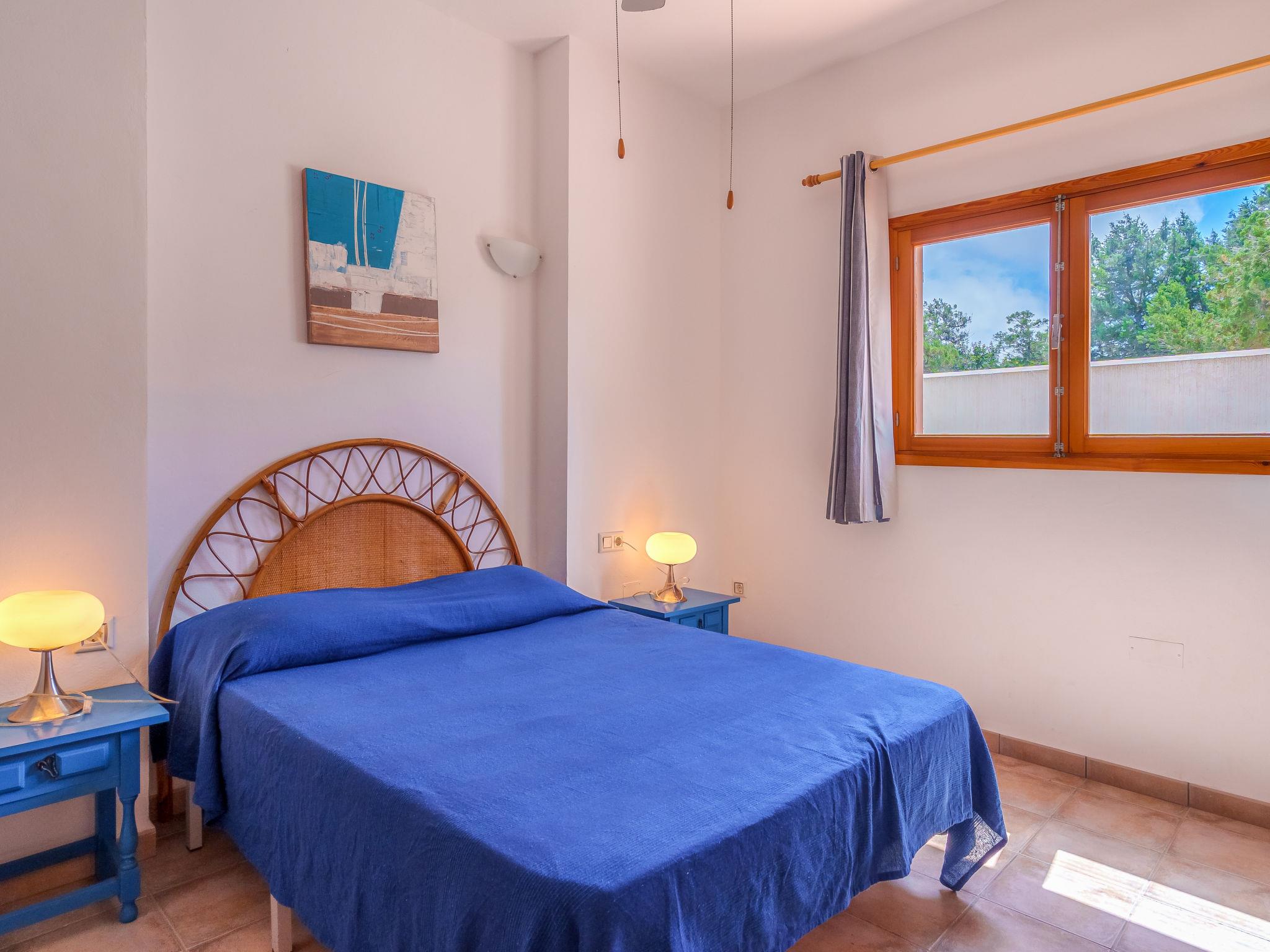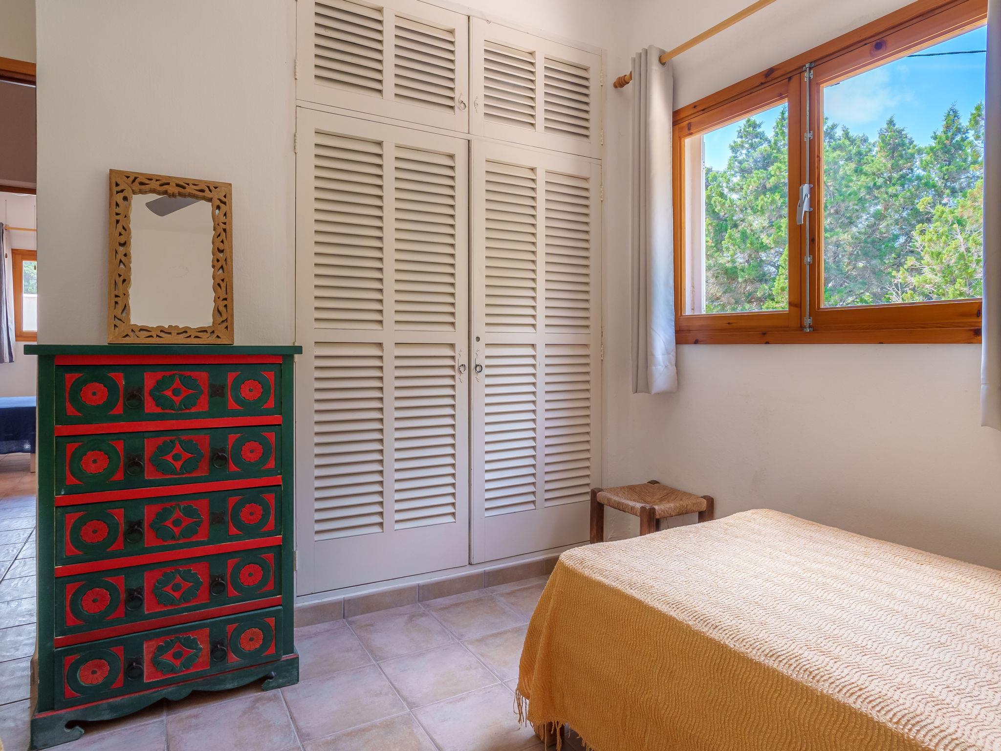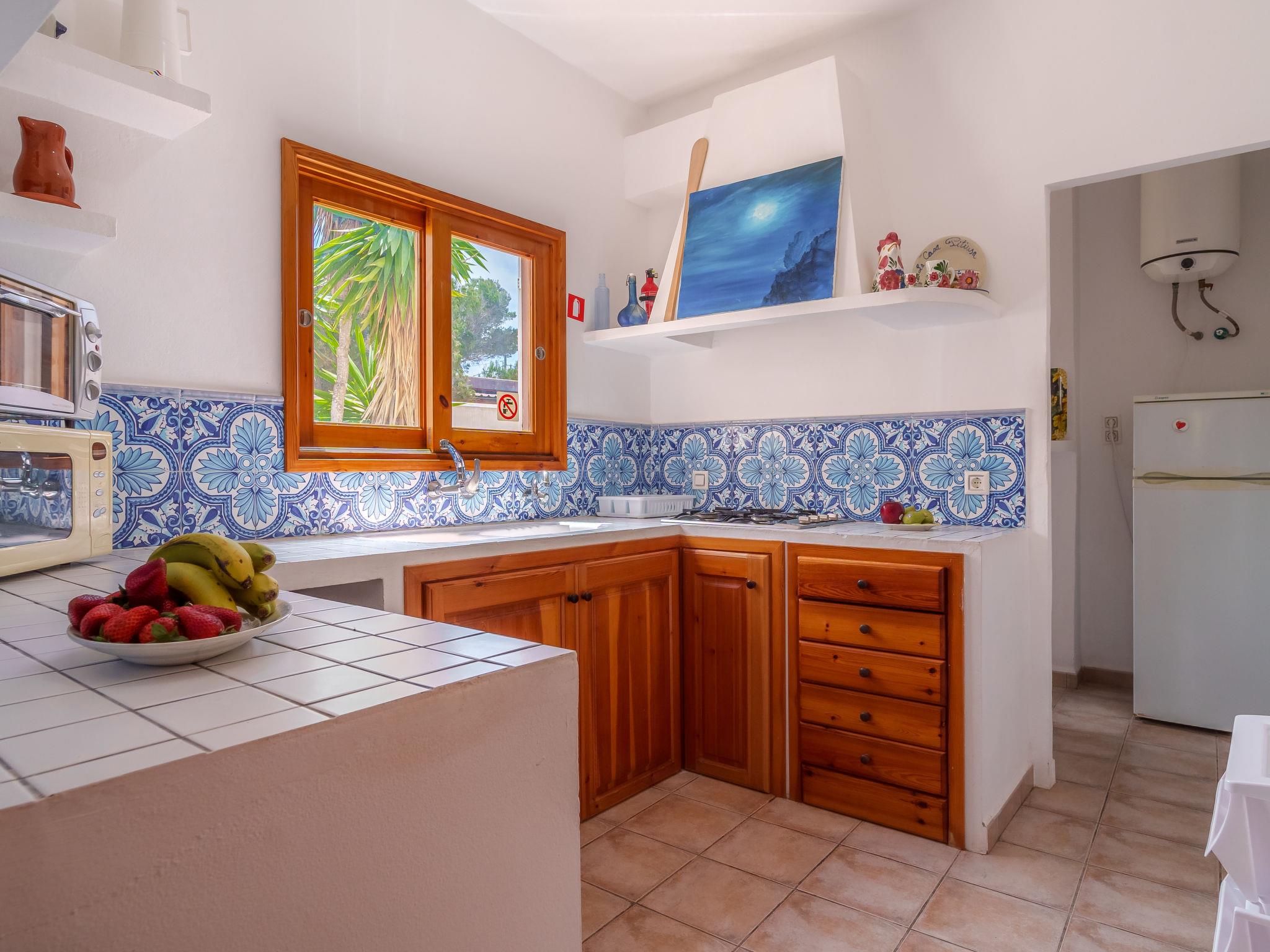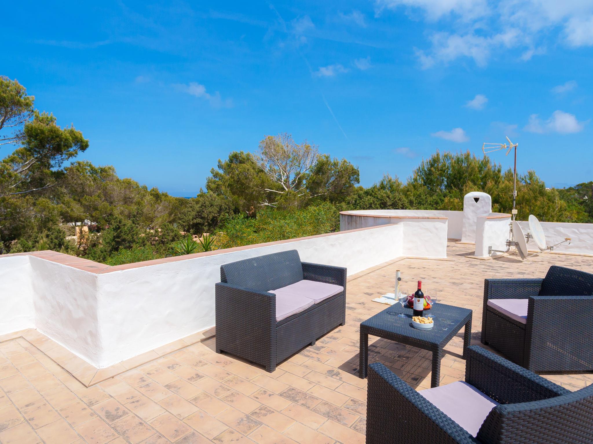 "Es Pujols", 5-room house 100 m2. Object suitable for 6 adults. Practical and cosy furnishings: open large dining room with dining table, digital TV and fan. Exit to the patio. 1 large double bedroom with 1 french bed (150 cm, length 200 cm), fan. 1 large double bedroom with 2 beds (90 cm, length 200 cm), fan. 1 large double bedroom with 1 french bed (150 cm, length 200 cm), fan. Kitchen (3 hot plates, oven, dishwasher, toaster, kettle, microwave, freezer, electric coffee machine). 2 showers/WC. View of the sea, the garden, the countryside, the resort and the forest. Facilities: washing machine, iron, children's high chair, baby cot for up to 2 year olds, hair dryer. Internet (WiFi, free). Suitable for families. ET7554