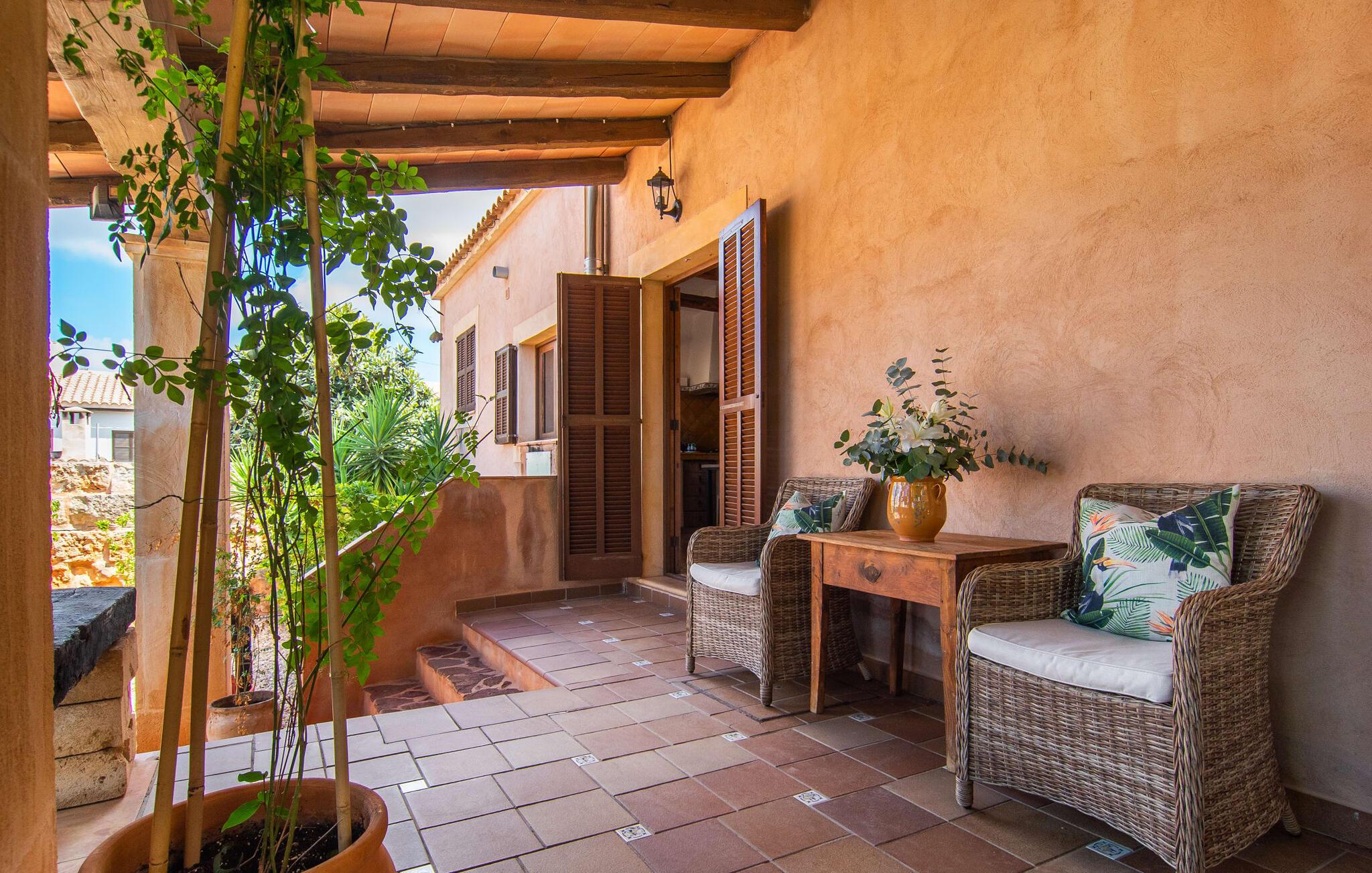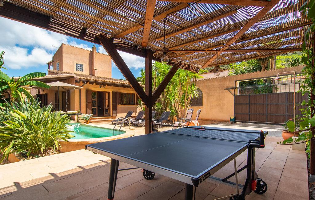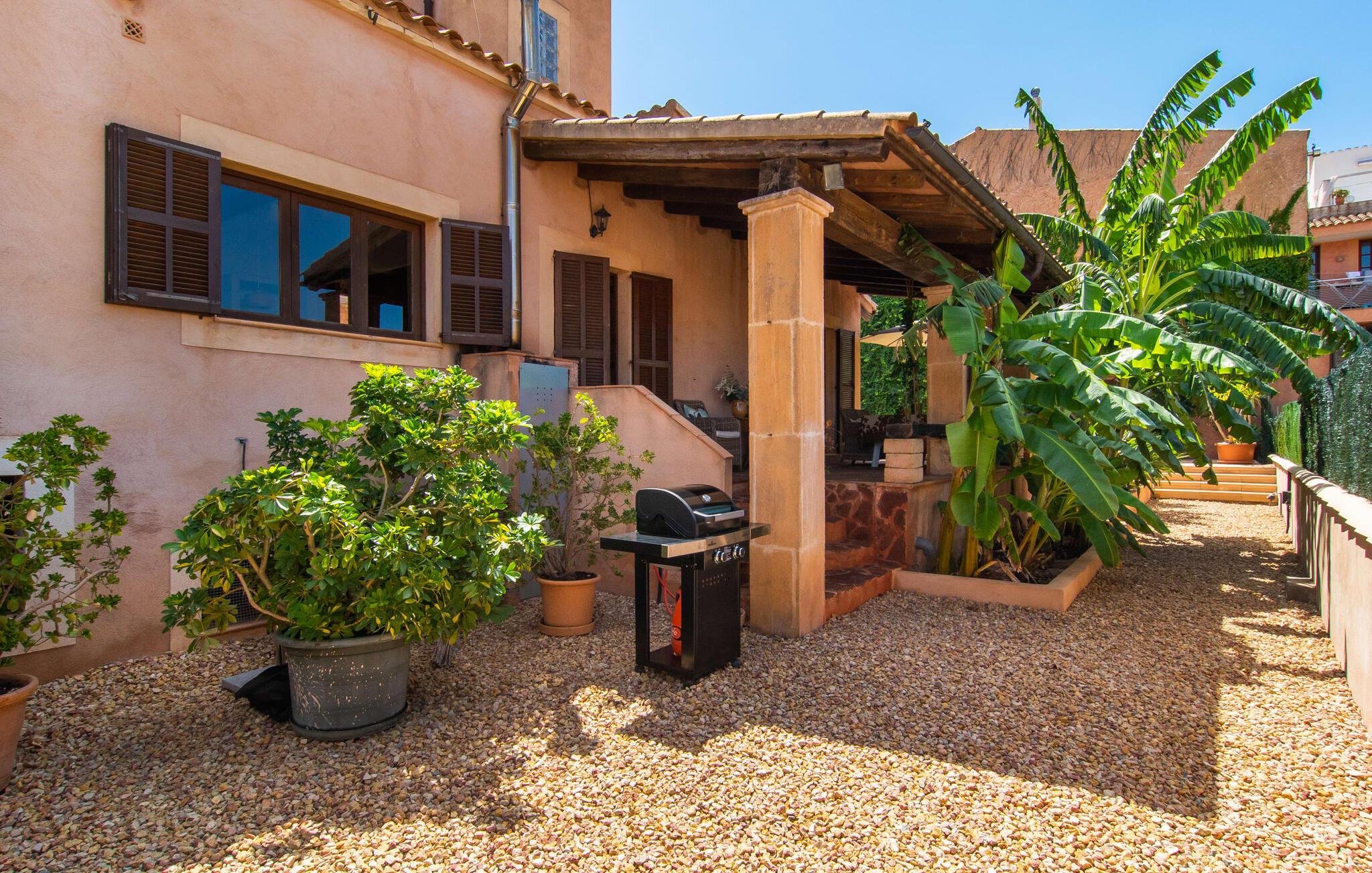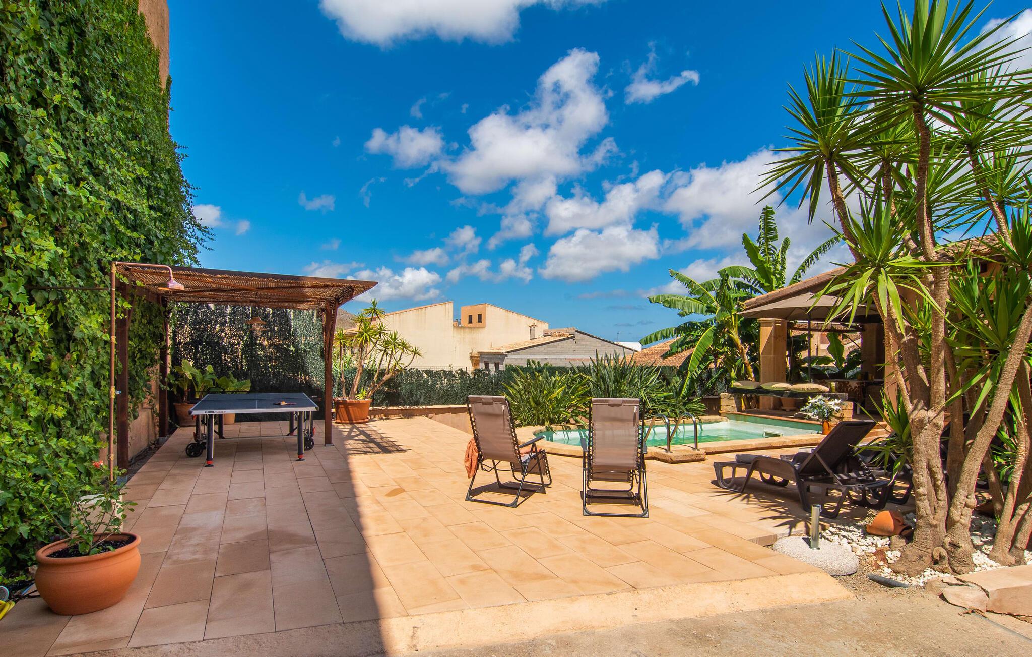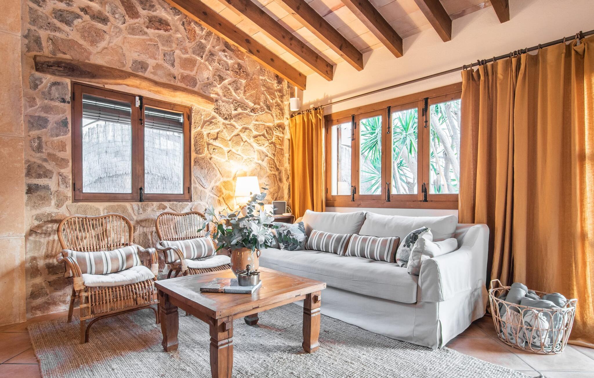Tingene I kan finde gemt i gårdhaverne! Nabohusets væg er beklædt med klatreplanter, så jeres have føles som en juvel beskyttet fra alle sider, når I sidder på den rustikke gamle træbjælke, der knejser over den hyggelige pool. Hvis I vil perfektionere jeres kravlefærdigheder på ferien, er det bedre at tage til den nærmeste strand, men hvis I bare sætter pris på følelsen af afslapning, som en pool giver, vil I tilbringe mange salige timer i denne gårdhave brolagt med lokalt grus og fliser i den traditionelt smukke mallorcanske farve . Hvis I vil være aktiv, er bordtennisbordet med skygge af en pergola praktisk. I har valget mellem, hvor I vil nyde øens sol: enten direkte ved poolen eller ved siden af huset. Med BBQ'en skaber I et kulinarisk højdepunkt, så ikke kun jeres hud og sjæl, men også jeres gane bliver forkælet under jeres ferie. En overdækket terrasse inviterer jer til at blive hængende og slappe af i skyggen. Når mørket falder på, tænder den udvendige belysning som ved et trylleslag, og haven får straks en anden form. Benyt lejligheden til at opleve det, mens I har det sjovt med et spil skak eller et rimeligt udfordrende puslespil. Med stor sans for detaljer har ejeren også formået at skabe et unikt look i interiøret. Små, nænsomt arrangerede detaljer understreger det særlige ved spisestuen, der har spisebord og teknisk set er en del af udearealet, når terrassedøren er helt åben, så ø-luften kan strømme ind. De antikke møblers ædle mørke trætone i kombination med det beherskede udvalg af dekorative genstande skaber en behagelig atmosfære, som rundes af af pejsens blide knitren. En af stuevæggene har typisk mallorcansk arkitektur med natursten og træbjælker, som også kan findes i loftet. Stueetagen rummer også køkkenet, som er udstyret til max med farverige gule klinker. Der er et træbord i midten af køkkenet, som giver jer plads nok til at tilberede større måltider. Adgang til de to soveværelser og to badeværelser sker via den dekorative gang med stenmosaikgulve. Et af soveværelserne har en dobbeltseng, det andet har to enkeltsenge. Et af badeværelserne har også et badekar, der giver mulighed for et hyggeligt badekar med levende lys. En trappe fører fra stuen op til et vaskerum og en idyllisk tagterrasse, delvist overdækket af en pergola, der automatisk oplyses ved mørkets frembrud. En loungegruppe inviterer jer til at nyde, men denne gang med en bonusudsigt over havet af røde tage og slottet. På grund af sin placering i byen kan den gade, som rækkehuset ligger på, nogle gange høres under trafikken. På den anden side kan I direkte nyde infrastrukturen på et sted, der har bevaret sin autentiske karakter: der er mange steder at stoppe for en aftentur, og I er kun et stenkast fra den smarte badeby Cala Ratjada med dens strande, idyllisk havn og talrige barer og restauranter. Denne kyststrækning er særlig populær for sine uberørte strande og bugter, der veksler med kystklipper. Der er meget at opdage - uanset om I vil besøge den unikke natur i Parc Natural, 13 km nordøst for Artà, eller om I foretrækker at gå en tur i Artà med dens middelalderlige bymidte, der ligger 8 km væk. Villaen "Es Regaro" passer komfortabelt ind i det harmoniske ensemble i den traditionelle by Capdepera. Fra tagterrassen kan I se det karakteristiske slot og det varierede omkringliggende landskab. Efter cirka 3 km kan I fordybe jer i strandlivet i Cala Ratjada med dets utallige barer, restauranter og indkøbsmuligheder eller blot gå en tur langs strandpromenaden. Roligere strande på østkysten er også nemme at nå.