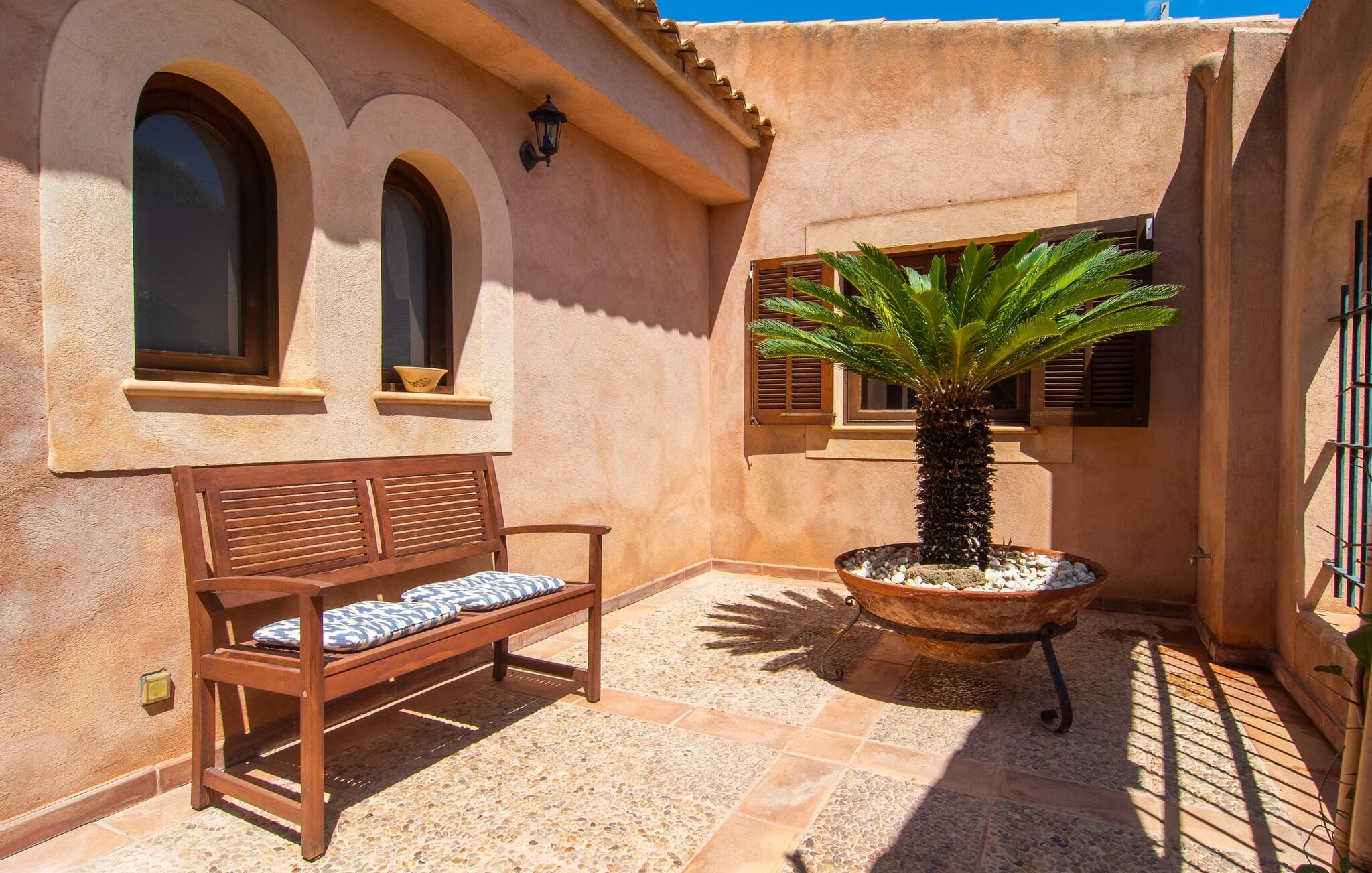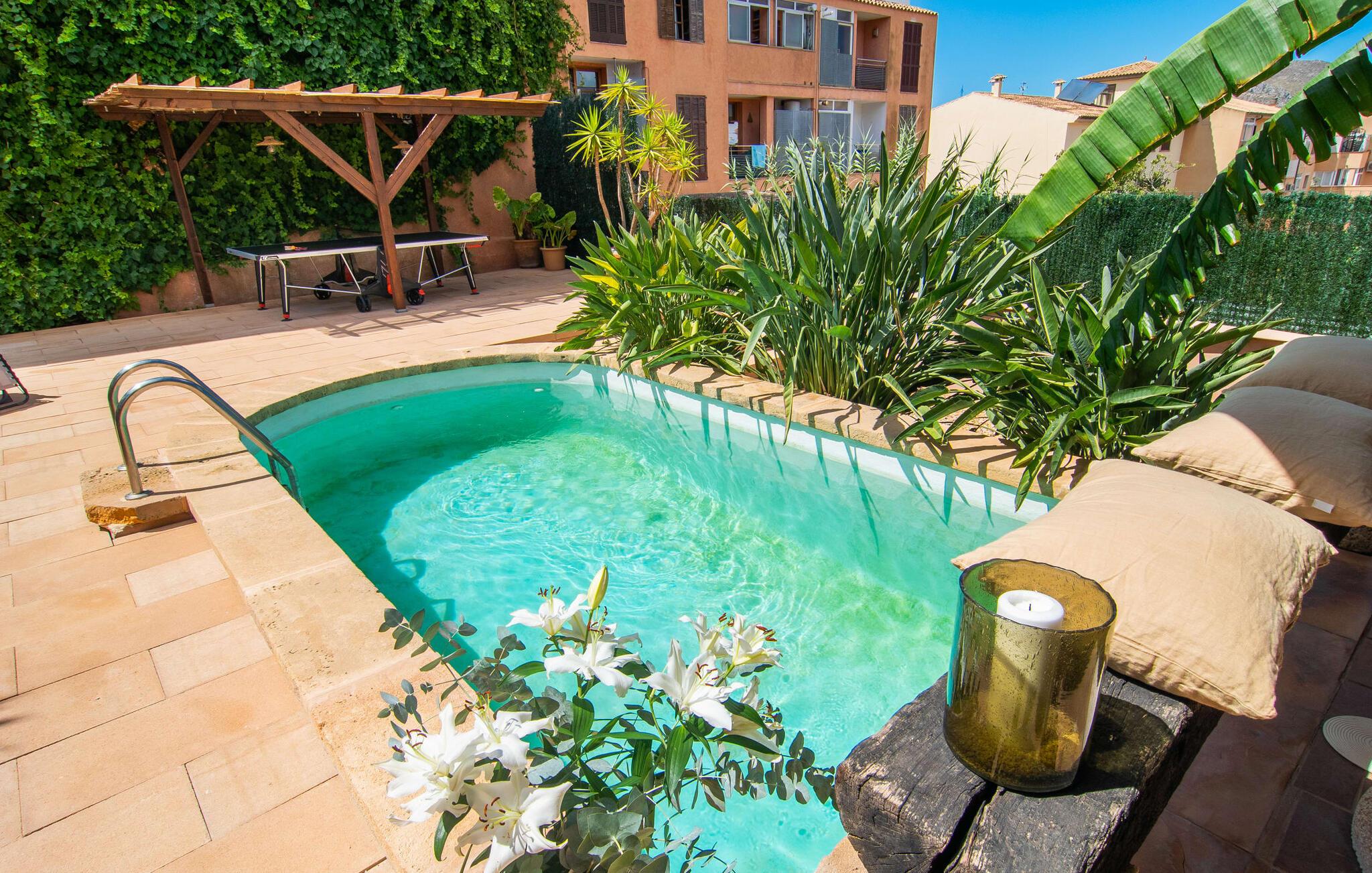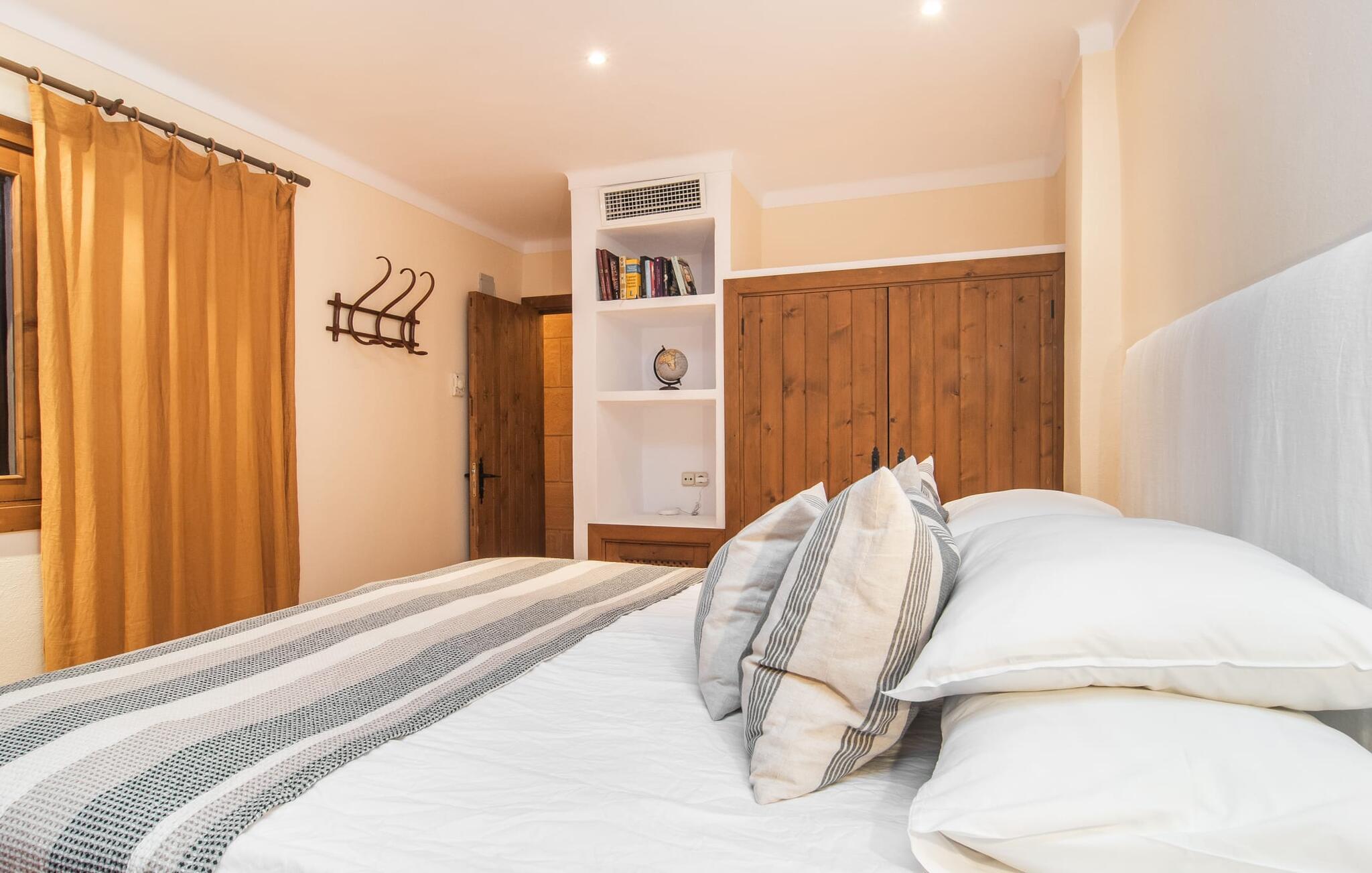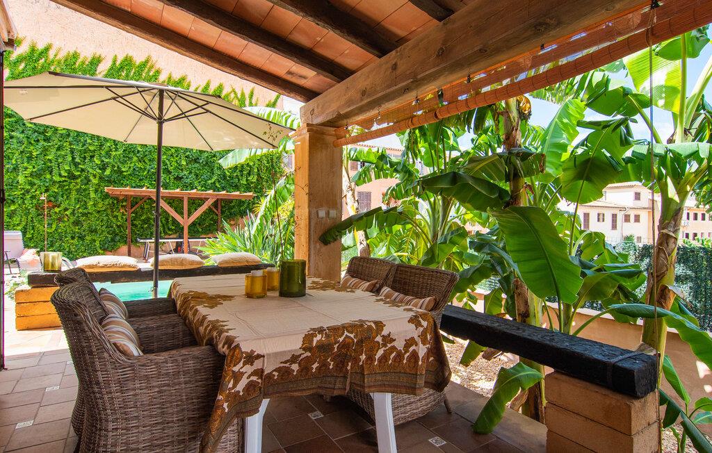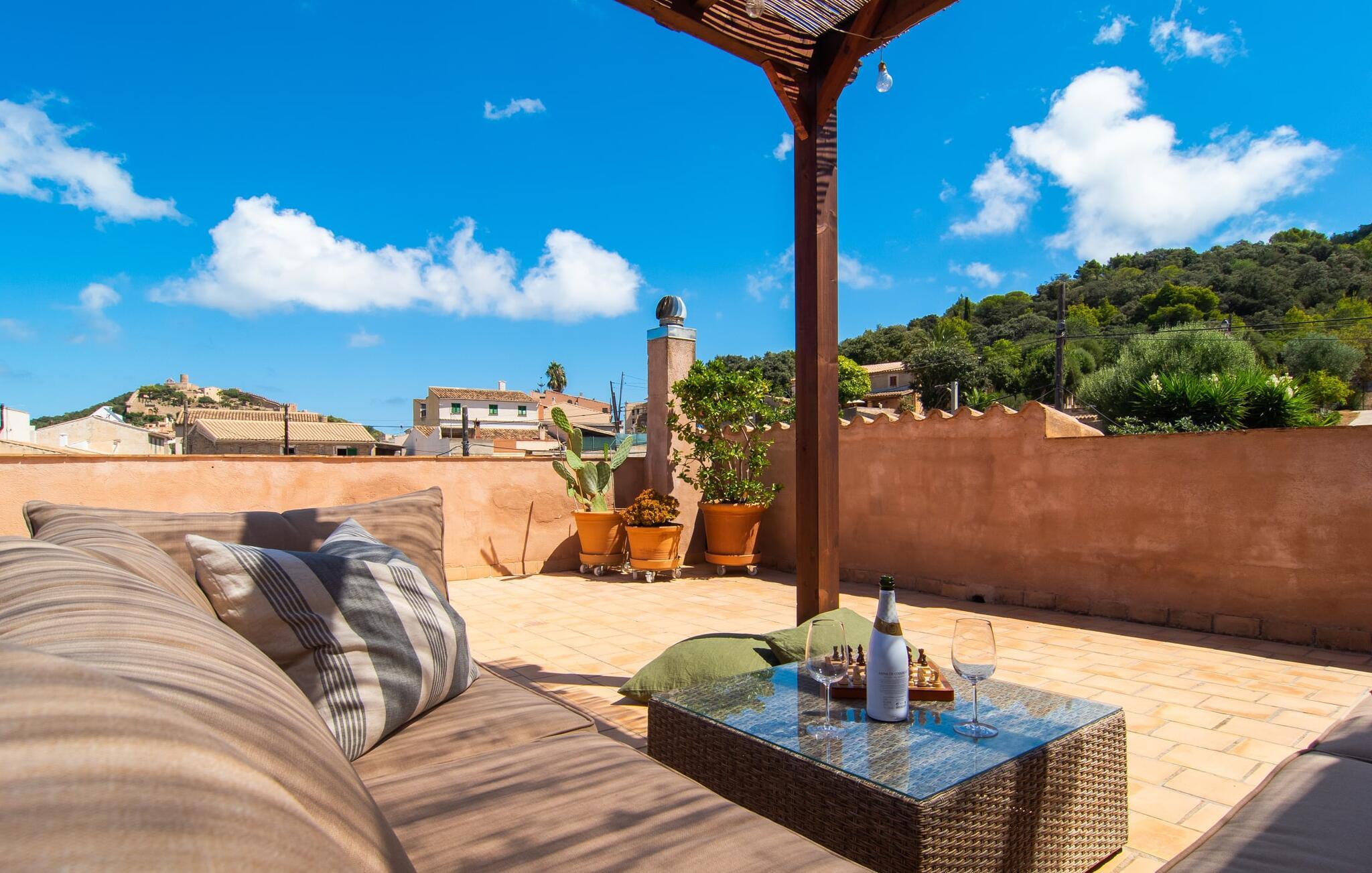 Tingene I kan finde gemt i gårdhaverne! Nabohusets væg er beklædt med klatreplanter, så jeres have føles som en juvel beskyttet fra alle sider, når I sidder på den rustikke gamle træbjælke, der knejser over den hyggelige pool. Hvis I vil perfektionere jeres kravlefærdigheder på ferien, er det bedre at tage til den nærmeste strand, men hvis I bare sætter pris på følelsen af afslapning, som en pool giver, vil I tilbringe mange salige timer i denne gårdhave brolagt med lokalt grus og fliser i den traditionelt smukke mallorcanske farve . Hvis I vil være aktiv, er bordtennisbordet med skygge af en pergola praktisk. I har valget mellem, hvor I vil nyde øens sol: enten direkte ved poolen eller ved siden af huset. Med BBQ'en skaber I et kulinarisk højdepunkt, så ikke kun jeres hud og sjæl, men også jeres gane bliver forkælet under jeres ferie. En overdækket terrasse inviterer jer til at blive hængende og slappe af i skyggen. Når mørket falder på, tænder den udvendige belysning som ved et trylleslag, og haven får straks en anden form. Benyt lejligheden til at opleve det, mens I har det sjovt med et spil skak eller et rimeligt udfordrende puslespil. Med stor sans for detaljer har ejeren også formået at skabe et unikt look i interiøret. Små, nænsomt arrangerede detaljer understreger det særlige ved spisestuen, der har spisebord og teknisk set er en del af udearealet, når terrassedøren er helt åben, så ø-luften kan strømme ind. De antikke møblers ædle mørke trætone i kombination med det beherskede udvalg af dekorative genstande skaber en behagelig atmosfære, som rundes af af pejsens blide knitren. En af stuevæggene har typisk mallorcansk arkitektur med natursten og træbjælker, som også kan findes i loftet. Stueetagen rummer også køkkenet, som er udstyret til max med farverige gule klinker. Der er et træbord i midten af køkkenet, som giver jer plads nok til at tilberede større måltider. Adgang til de to soveværelser og to badeværelser sker via den dekorative gang med stenmosaikgulve. Et af soveværelserne har en dobbeltseng, det andet har to enkeltsenge. Et af badeværelserne har også et badekar, der giver mulighed for et hyggeligt badekar med levende lys. En trappe fører fra stuen op til et vaskerum og en idyllisk tagterrasse, delvist overdækket af en pergola, der automatisk oplyses ved mørkets frembrud. En loungegruppe inviterer jer til at nyde, men denne gang med en bonusudsigt over havet af røde tage og slottet. På grund af sin placering i byen kan den gade, som rækkehuset ligger på, nogle gange høres under trafikken. På den anden side kan I direkte nyde infrastrukturen på et sted, der har bevaret sin autentiske karakter: der er mange steder at stoppe for en aftentur, og I er kun et stenkast fra den smarte badeby Cala Ratjada med dens strande, idyllisk havn og talrige barer og restauranter. Denne kyststrækning er særlig populær for sine uberørte strande og bugter, der veksler med kystklipper. Der er meget at opdage - uanset om I vil besøge den unikke natur i Parc Natural, 13 km nordøst for Artà, eller om I foretrækker at gå en tur i Artà med dens middelalderlige bymidte, der ligger 8 km væk. Villaen "Es Regaro" passer komfortabelt ind i det harmoniske ensemble i den traditionelle by Capdepera. Fra tagterrassen kan I se det karakteristiske slot og det varierede omkringliggende landskab. Efter cirka 3 km kan I fordybe jer i strandlivet i Cala Ratjada med dets utallige barer, restauranter og indkøbsmuligheder eller blot gå en tur langs strandpromenaden. Roligere strande på østkysten er også nemme at nå.