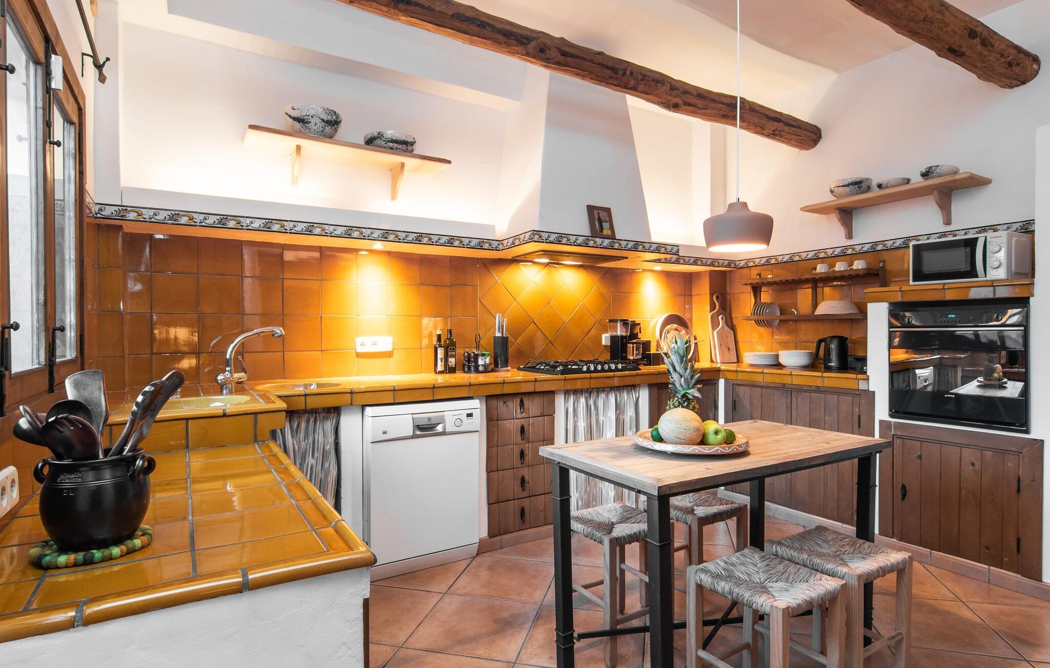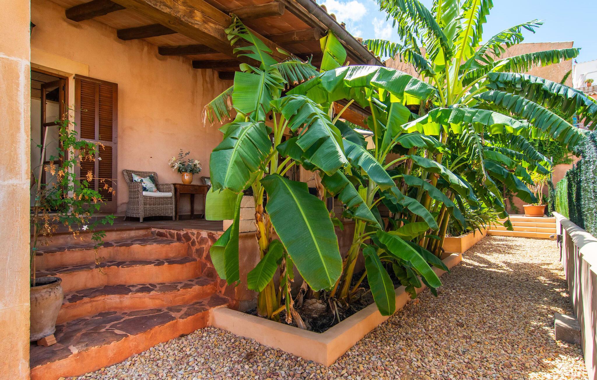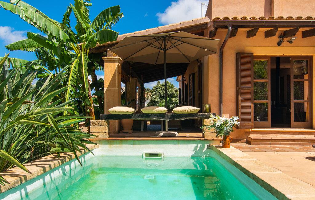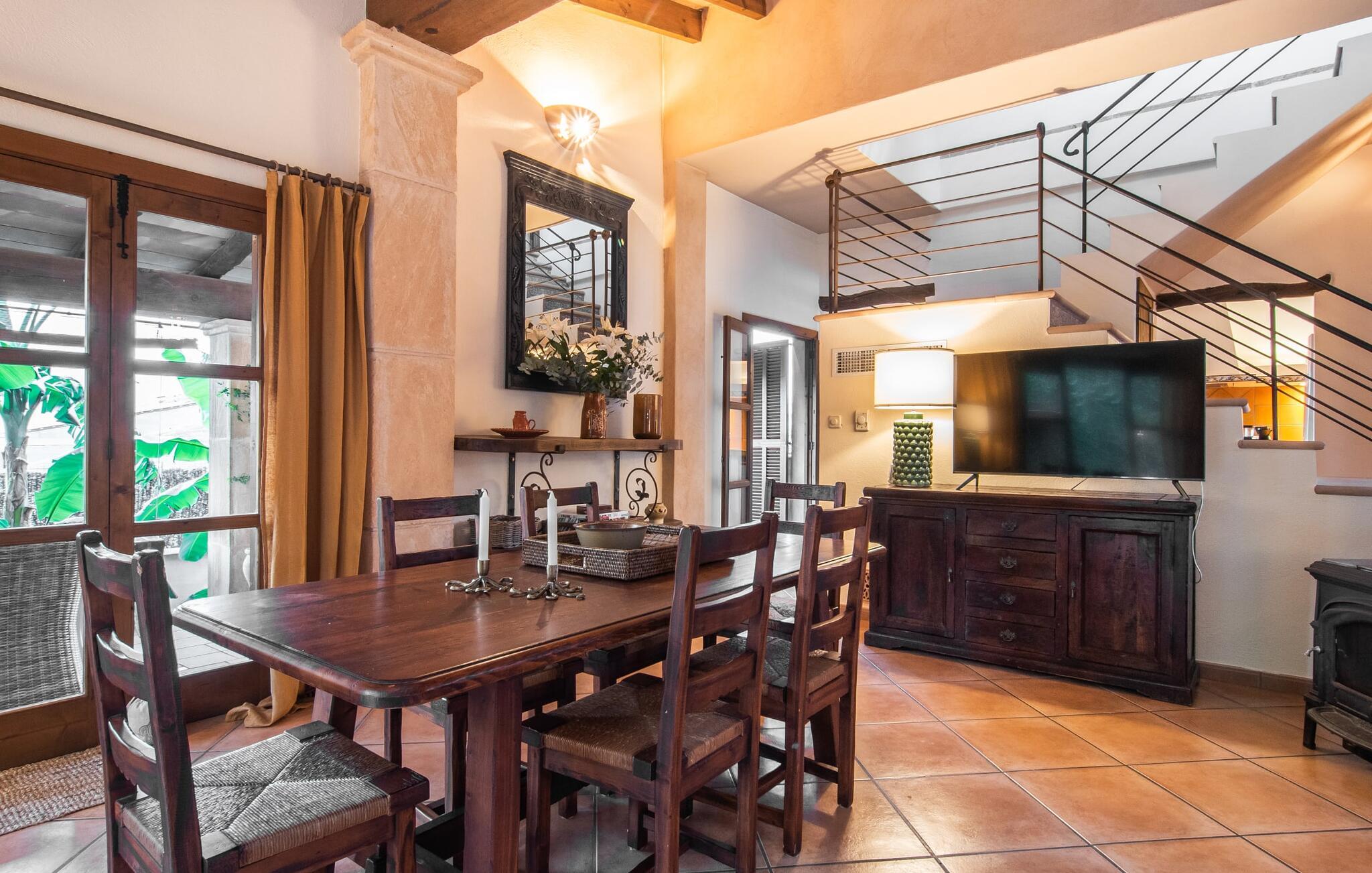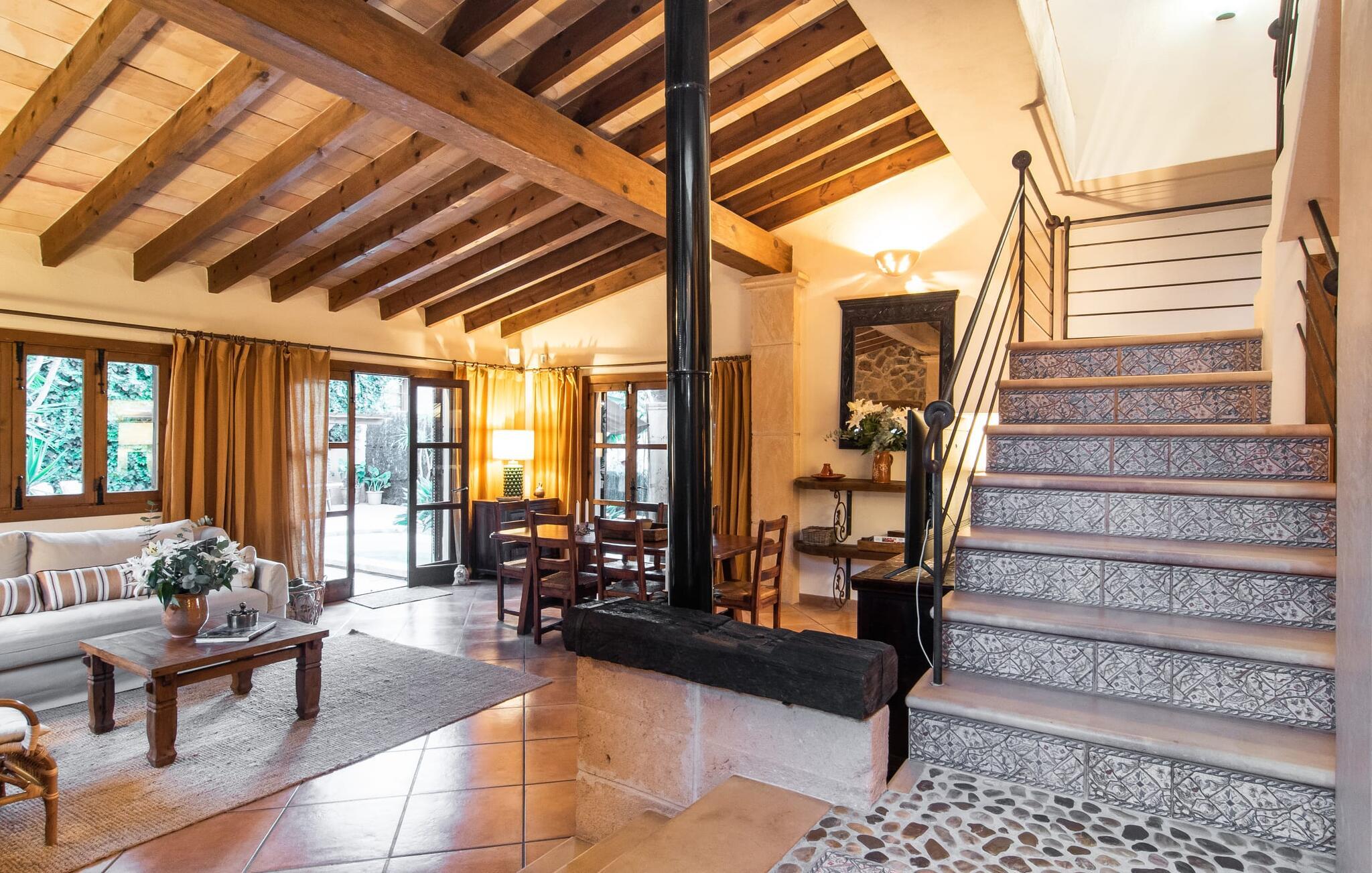 Tingene I kan finde gemt i gårdhaverne! Nabohusets væg er beklædt med klatreplanter, så jeres have føles som en juvel beskyttet fra alle sider, når I sidder på den rustikke gamle træbjælke, der knejser over den hyggelige pool. Hvis I vil perfektionere jeres kravlefærdigheder på ferien, er det bedre at tage til den nærmeste strand, men hvis I bare sætter pris på følelsen af afslapning, som en pool giver, vil I tilbringe mange salige timer i denne gårdhave brolagt med lokalt grus og fliser i den traditionelt smukke mallorcanske farve . Hvis I vil være aktiv, er bordtennisbordet med skygge af en pergola praktisk. I har valget mellem, hvor I vil nyde øens sol: enten direkte ved poolen eller ved siden af huset. Med BBQ'en skaber I et kulinarisk højdepunkt, så ikke kun jeres hud og sjæl, men også jeres gane bliver forkælet under jeres ferie. En overdækket terrasse inviterer jer til at blive hængende og slappe af i skyggen. Når mørket falder på, tænder den udvendige belysning som ved et trylleslag, og haven får straks en anden form. Benyt lejligheden til at opleve det, mens I har det sjovt med et spil skak eller et rimeligt udfordrende puslespil. Med stor sans for detaljer har ejeren også formået at skabe et unikt look i interiøret. Små, nænsomt arrangerede detaljer understreger det særlige ved spisestuen, der har spisebord og teknisk set er en del af udearealet, når terrassedøren er helt åben, så ø-luften kan strømme ind. De antikke møblers ædle mørke trætone i kombination med det beherskede udvalg af dekorative genstande skaber en behagelig atmosfære, som rundes af af pejsens blide knitren. En af stuevæggene har typisk mallorcansk arkitektur med natursten og træbjælker, som også kan findes i loftet. Stueetagen rummer også køkkenet, som er udstyret til max med farverige gule klinker. Der er et træbord i midten af køkkenet, som giver jer plads nok til at tilberede større måltider. Adgang til de to soveværelser og to badeværelser sker via den dekorative gang med stenmosaikgulve. Et af soveværelserne har en dobbeltseng, det andet har to enkeltsenge. Et af badeværelserne har også et badekar, der giver mulighed for et hyggeligt badekar med levende lys. En trappe fører fra stuen op til et vaskerum og en idyllisk tagterrasse, delvist overdækket af en pergola, der automatisk oplyses ved mørkets frembrud. En loungegruppe inviterer jer til at nyde, men denne gang med en bonusudsigt over havet af røde tage og slottet. På grund af sin placering i byen kan den gade, som rækkehuset ligger på, nogle gange høres under trafikken. På den anden side kan I direkte nyde infrastrukturen på et sted, der har bevaret sin autentiske karakter: der er mange steder at stoppe for en aftentur, og I er kun et stenkast fra den smarte badeby Cala Ratjada med dens strande, idyllisk havn og talrige barer og restauranter. Denne kyststrækning er særlig populær for sine uberørte strande og bugter, der veksler med kystklipper. Der er meget at opdage - uanset om I vil besøge den unikke natur i Parc Natural, 13 km nordøst for Artà, eller om I foretrækker at gå en tur i Artà med dens middelalderlige bymidte, der ligger 8 km væk. Villaen "Es Regaro" passer komfortabelt ind i det harmoniske ensemble i den traditionelle by Capdepera. Fra tagterrassen kan I se det karakteristiske slot og det varierede omkringliggende landskab. Efter cirka 3 km kan I fordybe jer i strandlivet i Cala Ratjada med dets utallige barer, restauranter og indkøbsmuligheder eller blot gå en tur langs strandpromenaden. Roligere strande på østkysten er også nemme at nå.