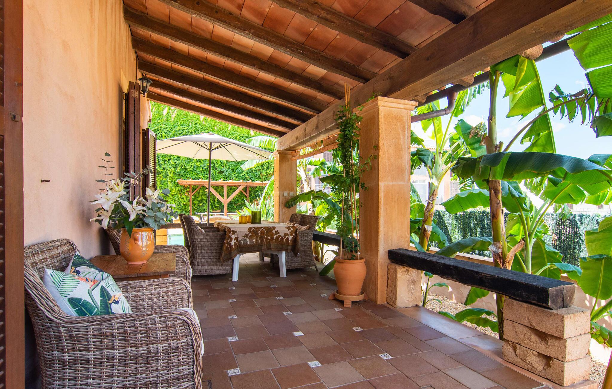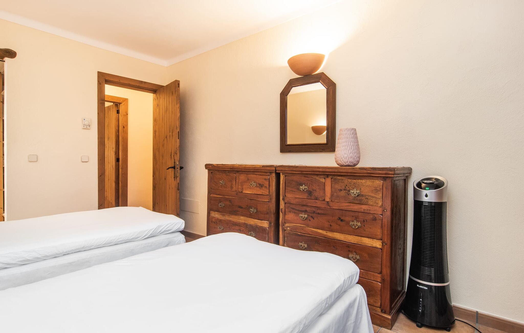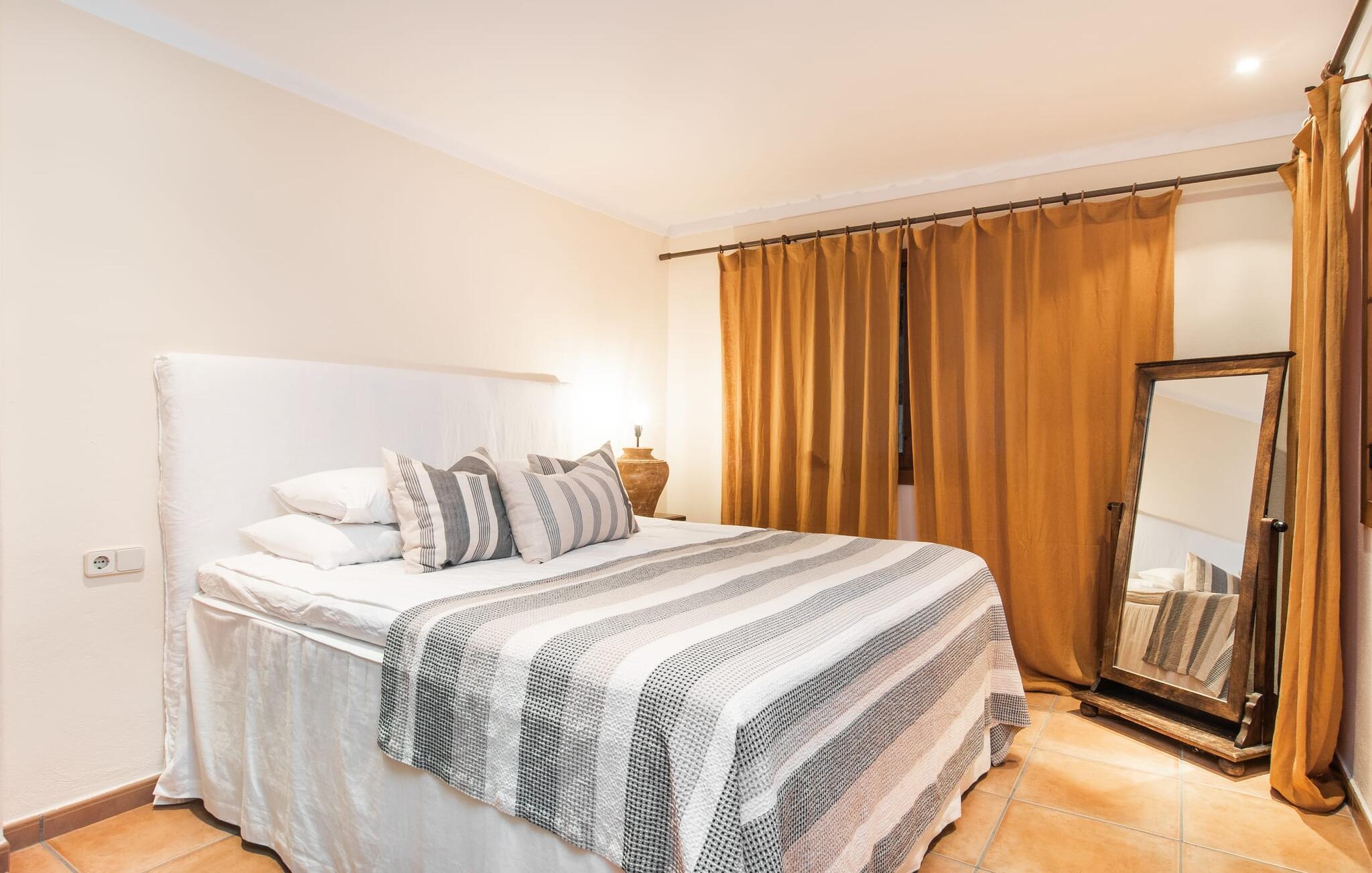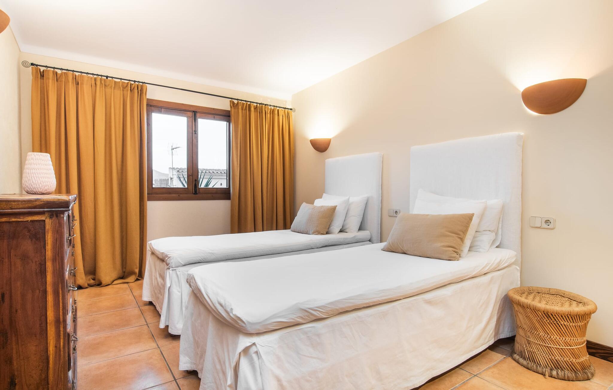 Tingene I kan finde gemt i gårdhaverne! Nabohusets væg er beklædt med klatreplanter, så jeres have føles som en juvel beskyttet fra alle sider, når I sidder på den rustikke gamle træbjælke, der knejser over den hyggelige pool. Hvis I vil perfektionere jeres kravlefærdigheder på ferien, er det bedre at tage til den nærmeste strand, men hvis I bare sætter pris på følelsen af afslapning, som en pool giver, vil I tilbringe mange salige timer i denne gårdhave brolagt med lokalt grus og fliser i den traditionelt smukke mallorcanske farve . Hvis I vil være aktiv, er bordtennisbordet med skygge af en pergola praktisk. I har valget mellem, hvor I vil nyde øens sol: enten direkte ved poolen eller ved siden af huset. Med BBQ'en skaber I et kulinarisk højdepunkt, så ikke kun jeres hud og sjæl, men også jeres gane bliver forkælet under jeres ferie. En overdækket terrasse inviterer jer til at blive hængende og slappe af i skyggen. Når mørket falder på, tænder den udvendige belysning som ved et trylleslag, og haven får straks en anden form. Benyt lejligheden til at opleve det, mens I har det sjovt med et spil skak eller et rimeligt udfordrende puslespil. Med stor sans for detaljer har ejeren også formået at skabe et unikt look i interiøret. Små, nænsomt arrangerede detaljer understreger det særlige ved spisestuen, der har spisebord og teknisk set er en del af udearealet, når terrassedøren er helt åben, så ø-luften kan strømme ind. De antikke møblers ædle mørke trætone i kombination med det beherskede udvalg af dekorative genstande skaber en behagelig atmosfære, som rundes af af pejsens blide knitren. En af stuevæggene har typisk mallorcansk arkitektur med natursten og træbjælker, som også kan findes i loftet. Stueetagen rummer også køkkenet, som er udstyret til max med farverige gule klinker. Der er et træbord i midten af køkkenet, som giver jer plads nok til at tilberede større måltider. Adgang til de to soveværelser og to badeværelser sker via den dekorative gang med stenmosaikgulve. Et af soveværelserne har en dobbeltseng, det andet har to enkeltsenge. Et af badeværelserne har også et badekar, der giver mulighed for et hyggeligt badekar med levende lys. En trappe fører fra stuen op til et vaskerum og en idyllisk tagterrasse, delvist overdækket af en pergola, der automatisk oplyses ved mørkets frembrud. En loungegruppe inviterer jer til at nyde, men denne gang med en bonusudsigt over havet af røde tage og slottet. På grund af sin placering i byen kan den gade, som rækkehuset ligger på, nogle gange høres under trafikken. På den anden side kan I direkte nyde infrastrukturen på et sted, der har bevaret sin autentiske karakter: der er mange steder at stoppe for en aftentur, og I er kun et stenkast fra den smarte badeby Cala Ratjada med dens strande, idyllisk havn og talrige barer og restauranter. Denne kyststrækning er særlig populær for sine uberørte strande og bugter, der veksler med kystklipper. Der er meget at opdage - uanset om I vil besøge den unikke natur i Parc Natural, 13 km nordøst for Artà, eller om I foretrækker at gå en tur i Artà med dens middelalderlige bymidte, der ligger 8 km væk. Villaen "Es Regaro" passer komfortabelt ind i det harmoniske ensemble i den traditionelle by Capdepera. Fra tagterrassen kan I se det karakteristiske slot og det varierede omkringliggende landskab. Efter cirka 3 km kan I fordybe jer i strandlivet i Cala Ratjada med dets utallige barer, restauranter og indkøbsmuligheder eller blot gå en tur langs strandpromenaden. Roligere strande på østkysten er også nemme at nå.