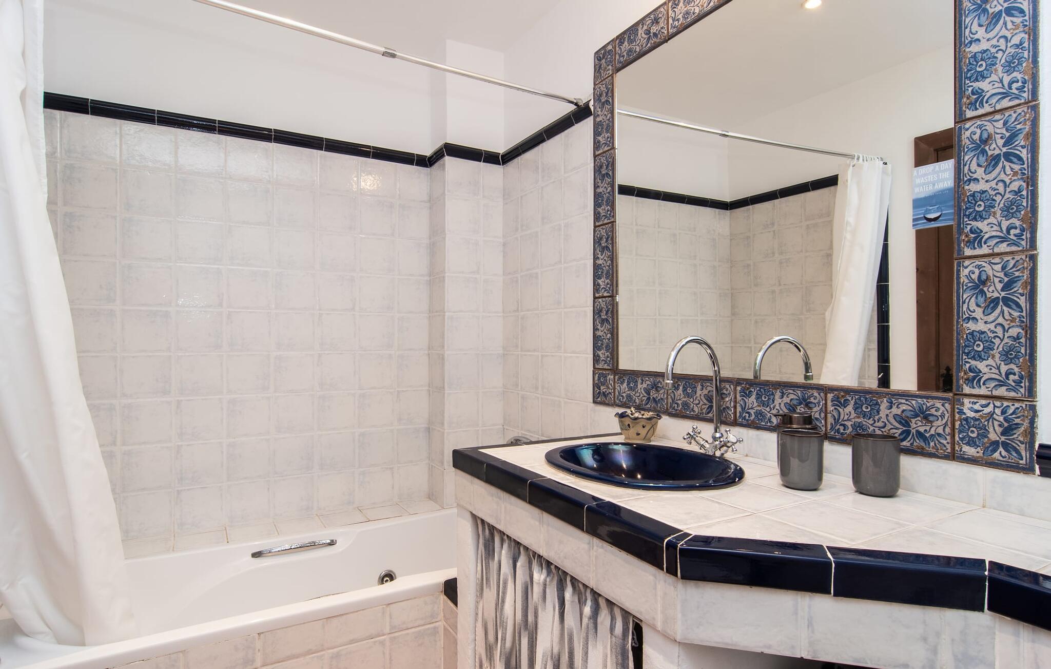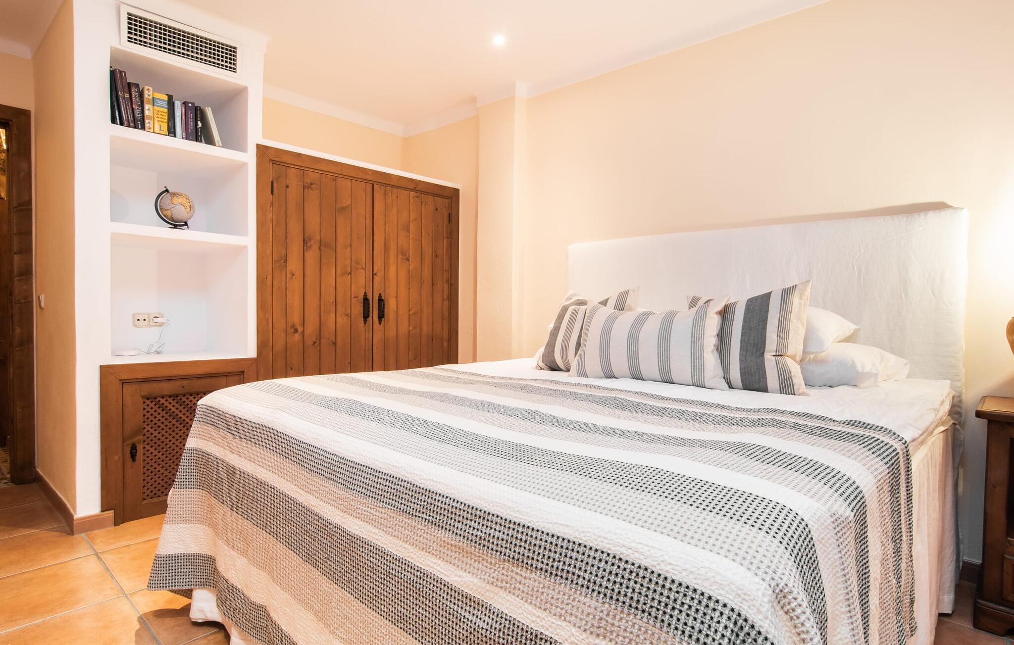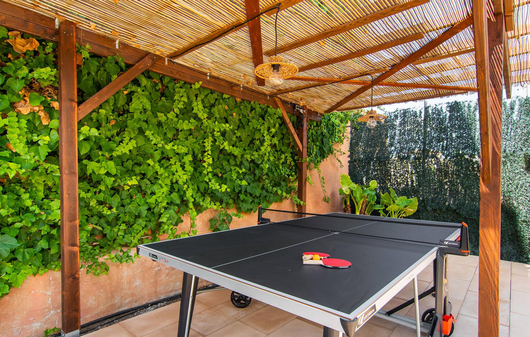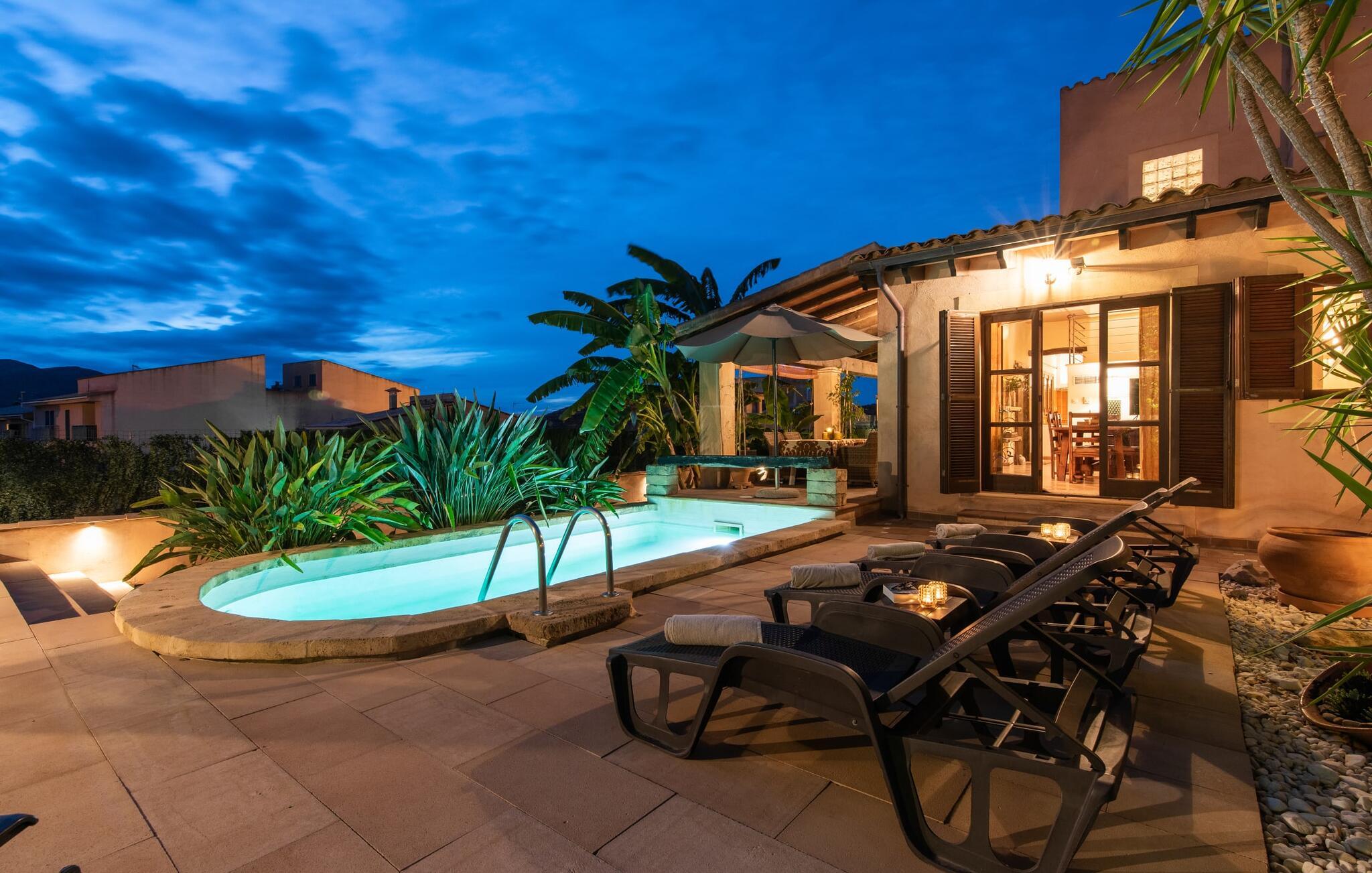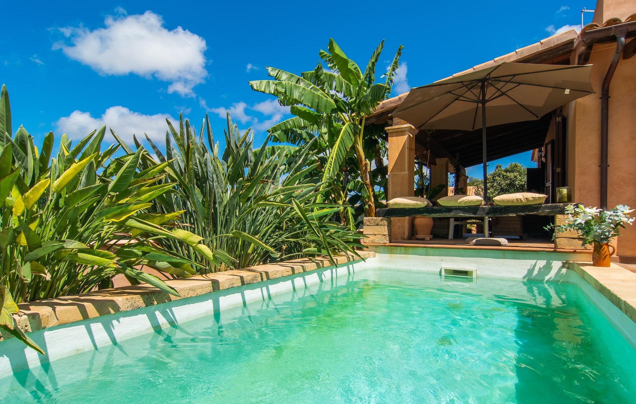 Tingene I kan finde gemt i gårdhaverne! Nabohusets væg er beklædt med klatreplanter, så jeres have føles som en juvel beskyttet fra alle sider, når I sidder på den rustikke gamle træbjælke, der knejser over den hyggelige pool. Hvis I vil perfektionere jeres kravlefærdigheder på ferien, er det bedre at tage til den nærmeste strand, men hvis I bare sætter pris på følelsen af afslapning, som en pool giver, vil I tilbringe mange salige timer i denne gårdhave brolagt med lokalt grus og fliser i den traditionelt smukke mallorcanske farve . Hvis I vil være aktiv, er bordtennisbordet med skygge af en pergola praktisk. I har valget mellem, hvor I vil nyde øens sol: enten direkte ved poolen eller ved siden af huset. Med BBQ'en skaber I et kulinarisk højdepunkt, så ikke kun jeres hud og sjæl, men også jeres gane bliver forkælet under jeres ferie. En overdækket terrasse inviterer jer til at blive hængende og slappe af i skyggen. Når mørket falder på, tænder den udvendige belysning som ved et trylleslag, og haven får straks en anden form. Benyt lejligheden til at opleve det, mens I har det sjovt med et spil skak eller et rimeligt udfordrende puslespil. Med stor sans for detaljer har ejeren også formået at skabe et unikt look i interiøret. Små, nænsomt arrangerede detaljer understreger det særlige ved spisestuen, der har spisebord og teknisk set er en del af udearealet, når terrassedøren er helt åben, så ø-luften kan strømme ind. De antikke møblers ædle mørke trætone i kombination med det beherskede udvalg af dekorative genstande skaber en behagelig atmosfære, som rundes af af pejsens blide knitren. En af stuevæggene har typisk mallorcansk arkitektur med natursten og træbjælker, som også kan findes i loftet. Stueetagen rummer også køkkenet, som er udstyret til max med farverige gule klinker. Der er et træbord i midten af køkkenet, som giver jer plads nok til at tilberede større måltider. Adgang til de to soveværelser og to badeværelser sker via den dekorative gang med stenmosaikgulve. Et af soveværelserne har en dobbeltseng, det andet har to enkeltsenge. Et af badeværelserne har også et badekar, der giver mulighed for et hyggeligt badekar med levende lys. En trappe fører fra stuen op til et vaskerum og en idyllisk tagterrasse, delvist overdækket af en pergola, der automatisk oplyses ved mørkets frembrud. En loungegruppe inviterer jer til at nyde, men denne gang med en bonusudsigt over havet af røde tage og slottet. På grund af sin placering i byen kan den gade, som rækkehuset ligger på, nogle gange høres under trafikken. På den anden side kan I direkte nyde infrastrukturen på et sted, der har bevaret sin autentiske karakter: der er mange steder at stoppe for en aftentur, og I er kun et stenkast fra den smarte badeby Cala Ratjada med dens strande, idyllisk havn og talrige barer og restauranter. Denne kyststrækning er særlig populær for sine uberørte strande og bugter, der veksler med kystklipper. Der er meget at opdage - uanset om I vil besøge den unikke natur i Parc Natural, 13 km nordøst for Artà, eller om I foretrækker at gå en tur i Artà med dens middelalderlige bymidte, der ligger 8 km væk. Villaen "Es Regaro" passer komfortabelt ind i det harmoniske ensemble i den traditionelle by Capdepera. Fra tagterrassen kan I se det karakteristiske slot og det varierede omkringliggende landskab. Efter cirka 3 km kan I fordybe jer i strandlivet i Cala Ratjada med dets utallige barer, restauranter og indkøbsmuligheder eller blot gå en tur langs strandpromenaden. Roligere strande på østkysten er også nemme at nå.