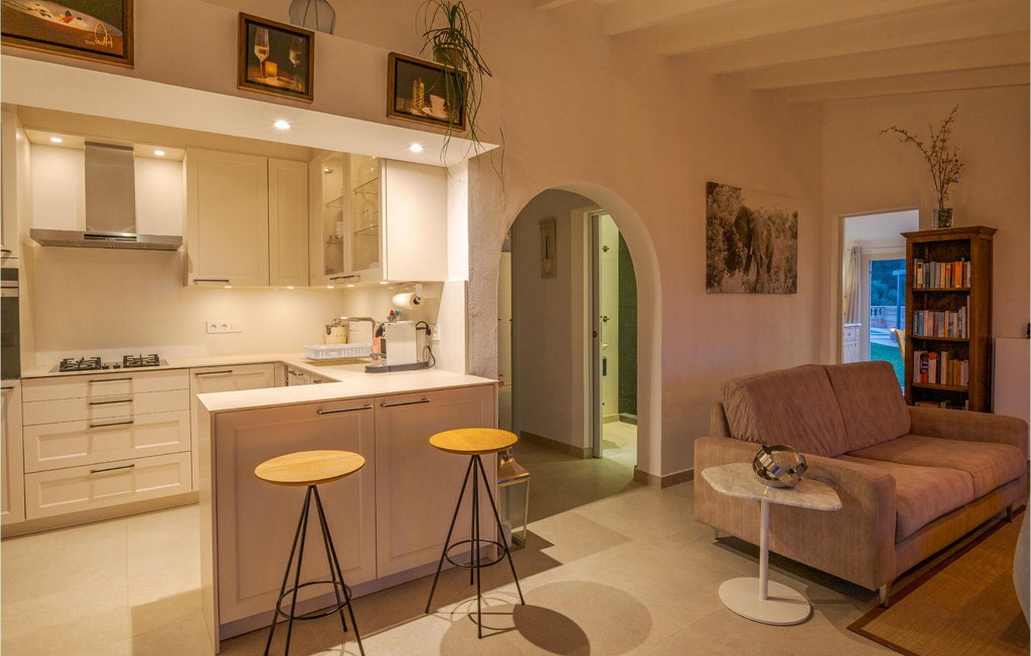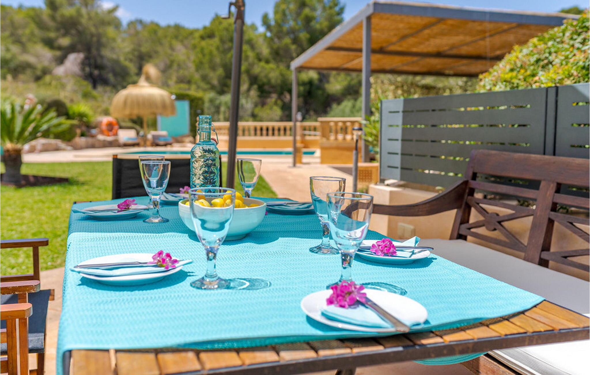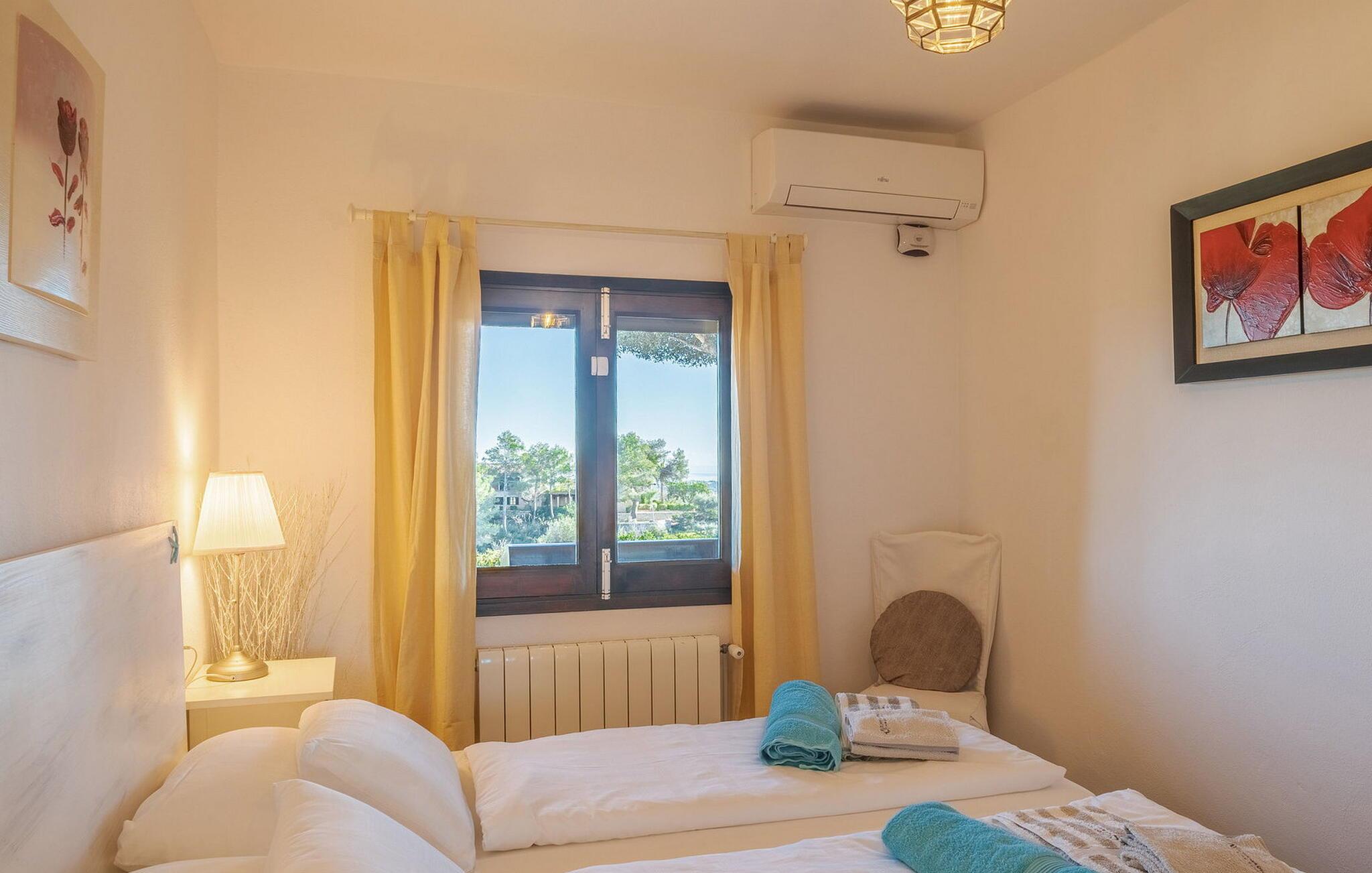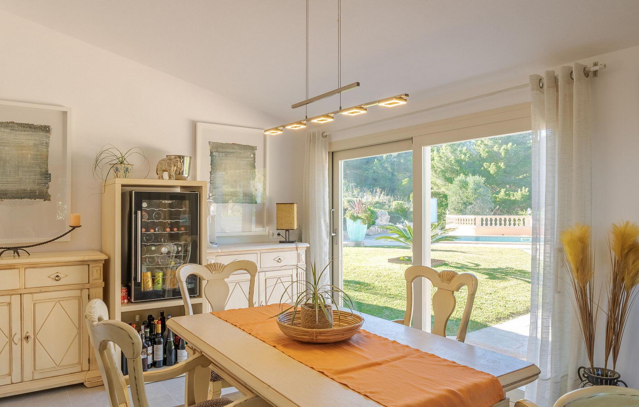 Når I træder ind i "Es Socorrat", vil I blive mødt af en varm og indbydende atmosfære. jeres hjem byder på en blanding af moderne møbler og charmerende landlige detaljer. Hvide vægge, klinkegulve og lyse loftsbjælker skaber en behagelig opholdsatmosfære. Store vinduer fylder rummet med lys og tilbyder en betagende udsigt. Indretningen omfatter en spiseplads med fantastisk havudsigt, en separat spisestue og en hyggelig stue. Det åbne køkken er udstyret med alle nødvendige faciliteter til at tilberede lækre måltider. Ejendommen har tre smukt møblerede soveværelser og to moderne badeværelser, hvilket sikrer et behageligt ophold.