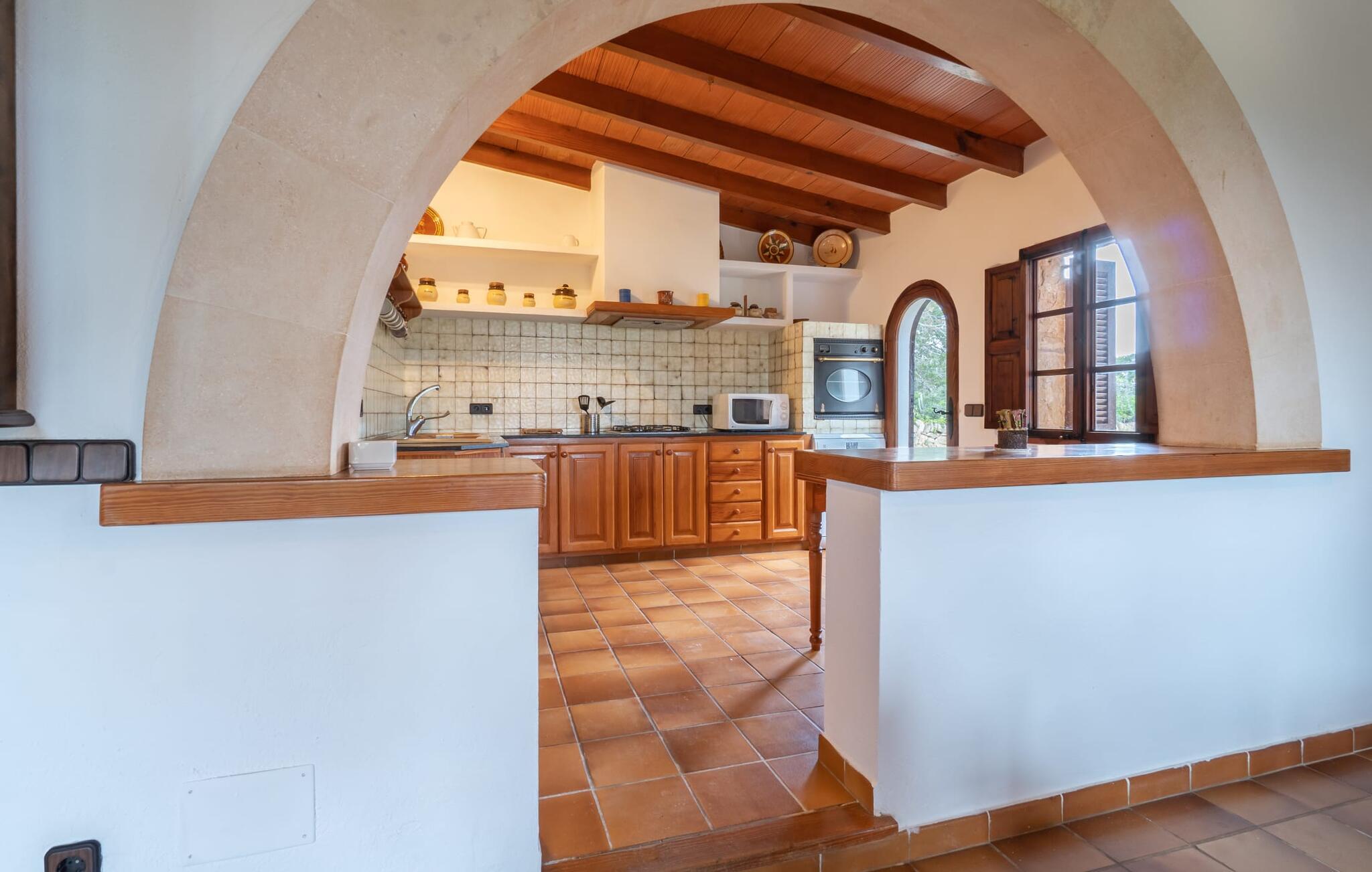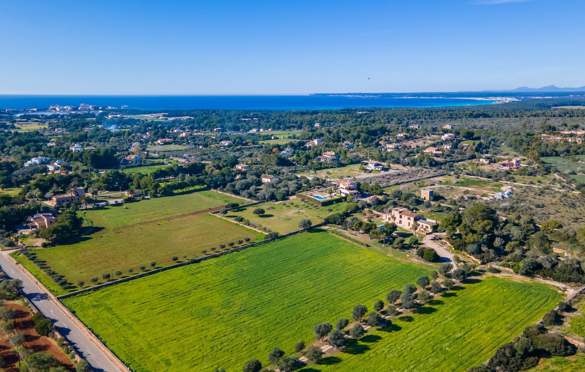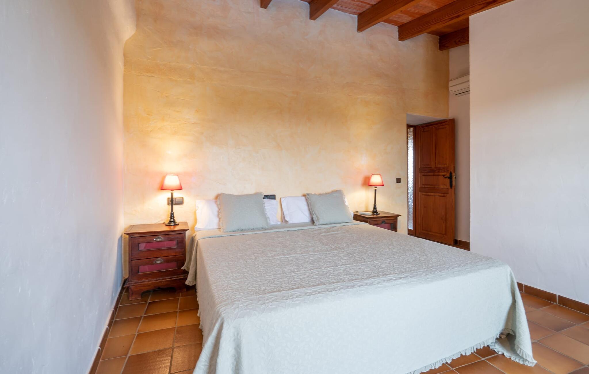 Sol, afslapning, masser af privatliv, en smuk udsigt, at bo tæt på Mallorcas smukkeste strande - alt dette er muligt i lejligheden "Es Turo Cabrera", der præsenterer sig selv som et meget alsidigt feriehus for to gæster. På det enorme, parkagtige og naturområde kan I nyde en lang række perspektiver på korte gåture og lade blikket vandre i fred og ro. Nogle steder kan vise sig at være yndlingssteder, herunder at sidde og ligge ved poolen, på græsplænen, direkte under åben himmel eller i den luftige naturlige skygge af et træ. Den indbydende udendørsservering direkte ved lejligheden og på tagterrassen byder på helt vidunderlige muligheder for at sidde udenfor og slappe af og nyde. Selve lejligheden har en hyggelig, rustik flair: hvide vægge, terracotta fliser, synlige bjælkelofter, træ og typiske mallorcanske møbler som gyngestole formidler straks den autentiske ø-følelse. En rummelig stue-spisestue med pejs og TV tilbyder alle mulige muligheder for elegante indendørs ophold. Køkkenet, smukt adskilt af en bred bue og en disk, er fuldt udstyret og ideelt til omfattende måltidstilberedning. Der er endda plads til endnu et bord. Der er også et lille badeværelse med bruser på denne stueplan. I kan slappe af i to hyggelige soveværelser på øverste etage, som hver er udstyret med dobbeltsenge (bestående af to enkeltmadrasser). Denne hyggelige ferierede er derfor ideel til en lille familie eller to par, der rejser sammen. De to badeværelser - rummelige og med naturligt lys - har hver en suite og har badekar. En meget behagelig funktion er det varme/kolde klimaanlæg, som giver jer mulighed for at have behagelige indendørstemperaturer året rundt. Vores konklusion: "Es Turo Cabrera" har bestemt en portion original Mallorca ombord uden at ofre komforten. Denne lejlighed er en af fem boligenheder på ejendommen. De kaldes også "S'Hort des Turó Eivissa", "S'Hort des Turó Menorca", "S'Hort des Turó Mallorca" og "S'Hort des Turó Formentera" og kan alle bookes gennem Fincallorca. Lejligheden "Es Turo Cabrera" er beliggende på landet på ejendommen "S'Hort des Turó de ses Illes" og kun 3 km sydvest for Ses Salines. Ejendommen på 28.520 m² byder på masser af plads. De umiddelbare omgivelser inviterer til lange gåture gennem naturen. Takket være den strategisk gode beliggenhed er omkringliggende landsbyer og strande også nemme at nå. Colonia de Sant Jordi (ca. 2,7 km) har to smukke sandstrande, den nordlige, Es Trenc, er den største naturlige strand på Mallorca.