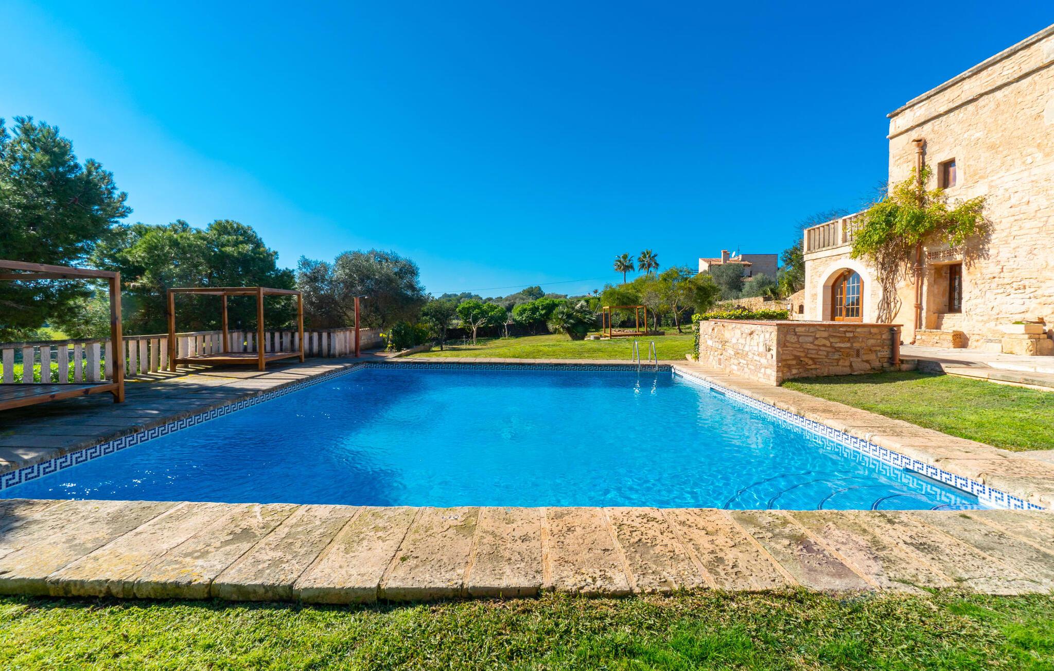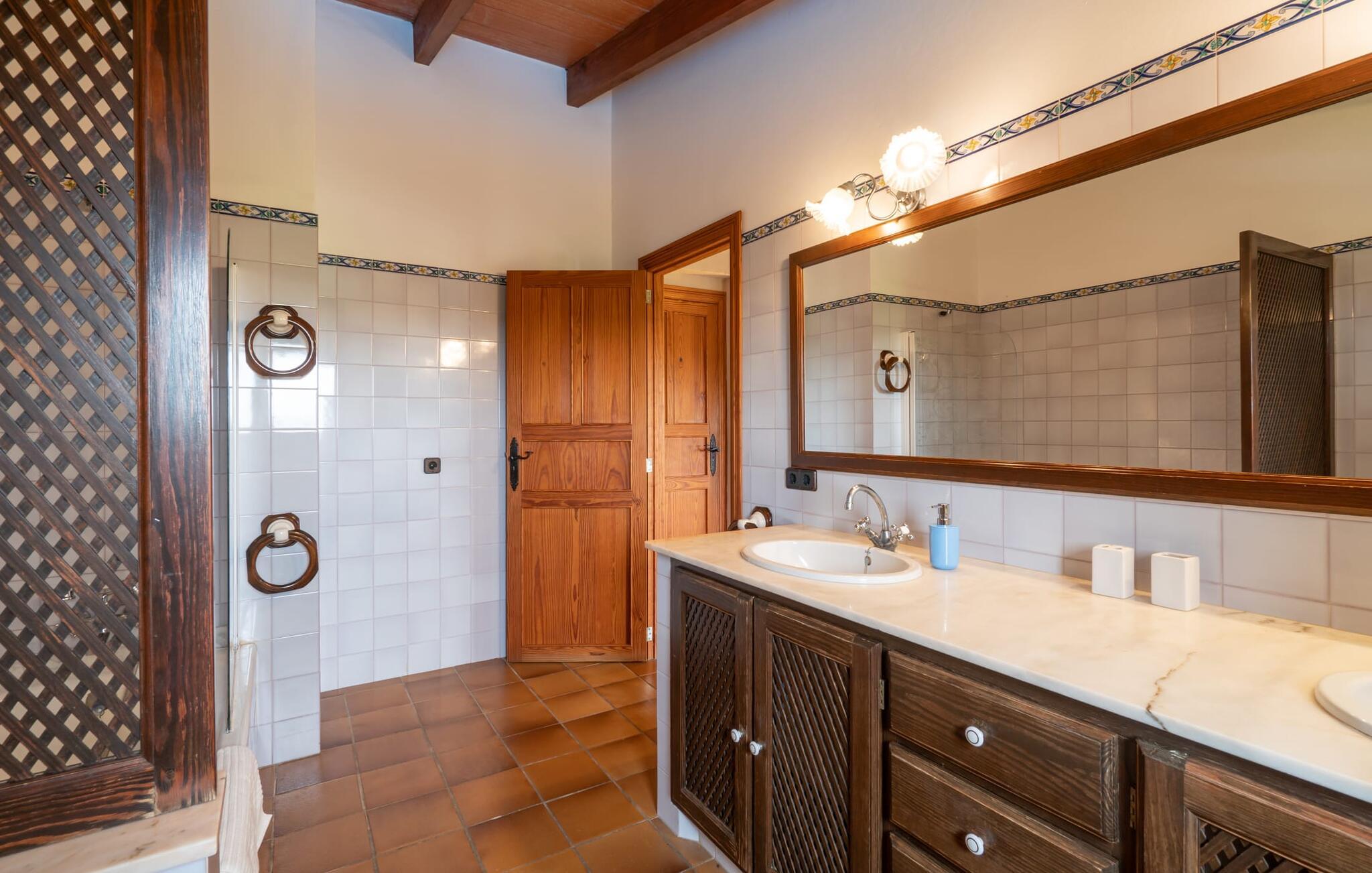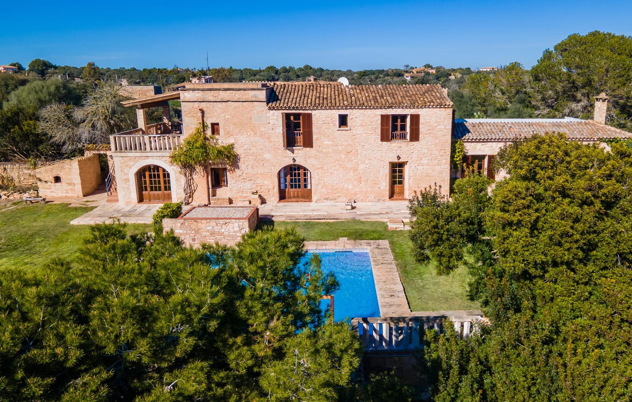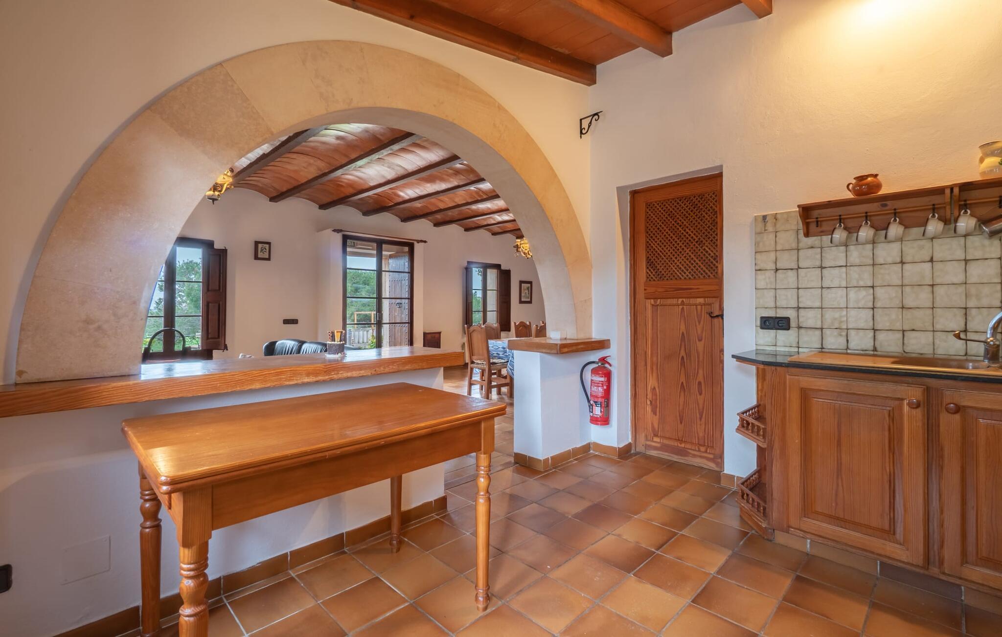 Sol, afslapning, masser af privatliv, en smuk udsigt, at bo tæt på Mallorcas smukkeste strande - alt dette er muligt i lejligheden "Es Turo Cabrera", der præsenterer sig selv som et meget alsidigt feriehus for to gæster. På det enorme, parkagtige og naturområde kan I nyde en lang række perspektiver på korte gåture og lade blikket vandre i fred og ro. Nogle steder kan vise sig at være yndlingssteder, herunder at sidde og ligge ved poolen, på græsplænen, direkte under åben himmel eller i den luftige naturlige skygge af et træ. Den indbydende udendørsservering direkte ved lejligheden og på tagterrassen byder på helt vidunderlige muligheder for at sidde udenfor og slappe af og nyde. Selve lejligheden har en hyggelig, rustik flair: hvide vægge, terracotta fliser, synlige bjælkelofter, træ og typiske mallorcanske møbler som gyngestole formidler straks den autentiske ø-følelse. En rummelig stue-spisestue med pejs og TV tilbyder alle mulige muligheder for elegante indendørs ophold. Køkkenet, smukt adskilt af en bred bue og en disk, er fuldt udstyret og ideelt til omfattende måltidstilberedning. Der er endda plads til endnu et bord. Der er også et lille badeværelse med bruser på denne stueplan. I kan slappe af i to hyggelige soveværelser på øverste etage, som hver er udstyret med dobbeltsenge (bestående af to enkeltmadrasser). Denne hyggelige ferierede er derfor ideel til en lille familie eller to par, der rejser sammen. De to badeværelser - rummelige og med naturligt lys - har hver en suite og har badekar. En meget behagelig funktion er det varme/kolde klimaanlæg, som giver jer mulighed for at have behagelige indendørstemperaturer året rundt. Vores konklusion: "Es Turo Cabrera" har bestemt en portion original Mallorca ombord uden at ofre komforten. Denne lejlighed er en af fem boligenheder på ejendommen. De kaldes også "S'Hort des Turó Eivissa", "S'Hort des Turó Menorca", "S'Hort des Turó Mallorca" og "S'Hort des Turó Formentera" og kan alle bookes gennem Fincallorca. Lejligheden "Es Turo Cabrera" er beliggende på landet på ejendommen "S'Hort des Turó de ses Illes" og kun 3 km sydvest for Ses Salines. Ejendommen på 28.520 m² byder på masser af plads. De umiddelbare omgivelser inviterer til lange gåture gennem naturen. Takket være den strategisk gode beliggenhed er omkringliggende landsbyer og strande også nemme at nå. Colonia de Sant Jordi (ca. 2,7 km) har to smukke sandstrande, den nordlige, Es Trenc, er den største naturlige strand på Mallorca.