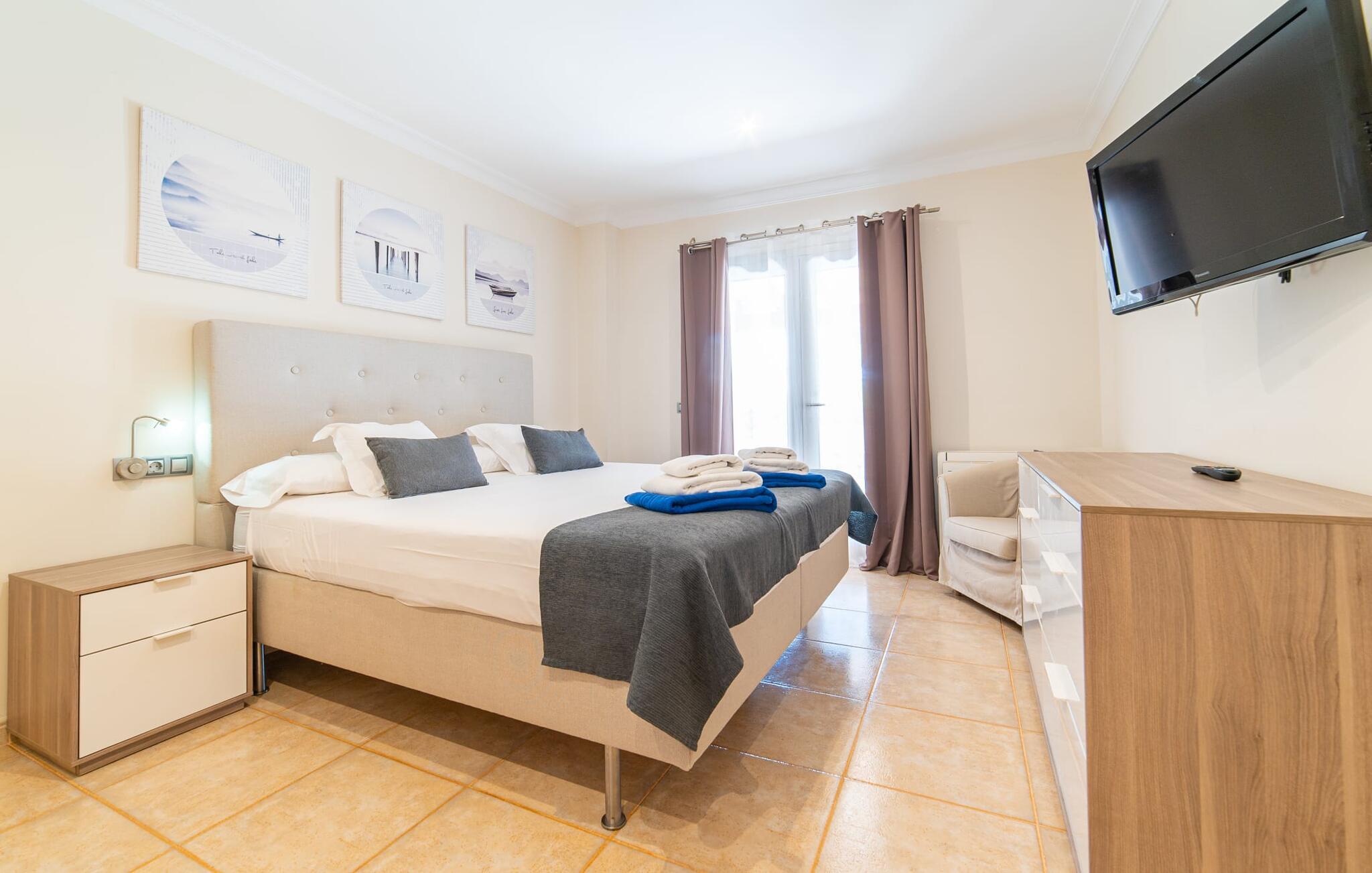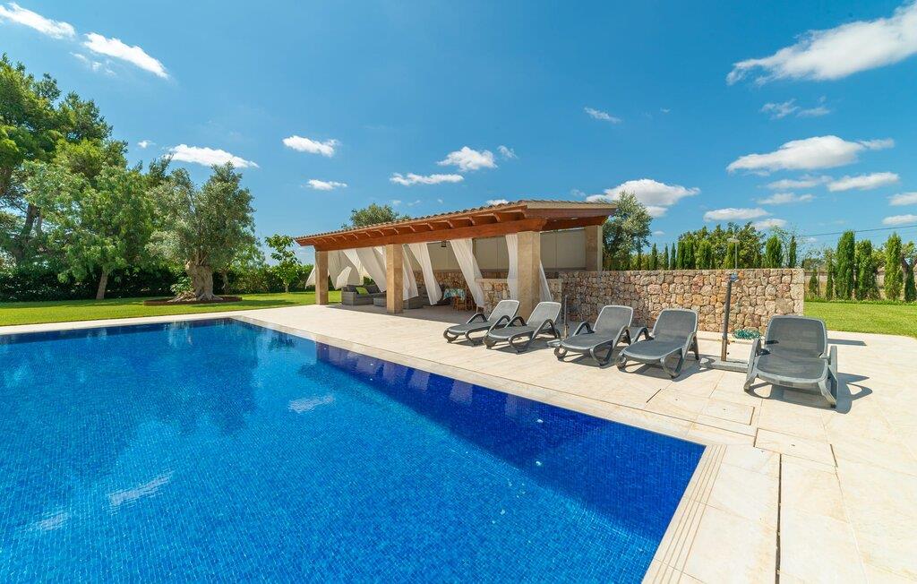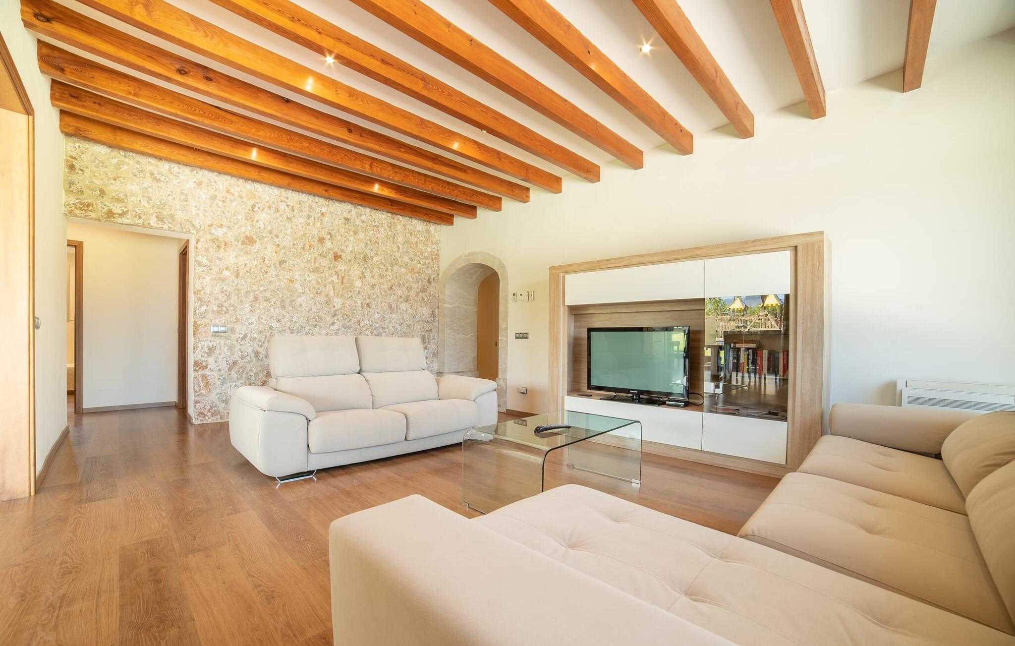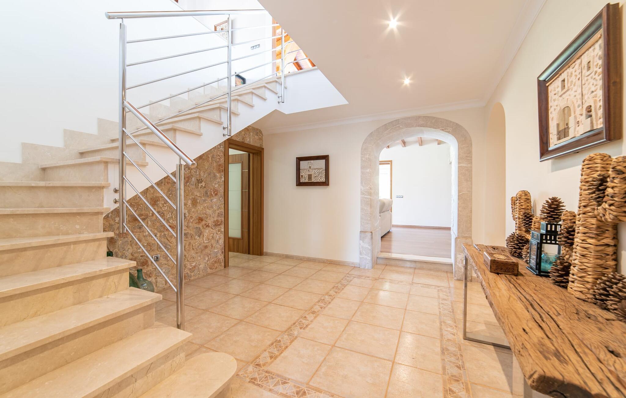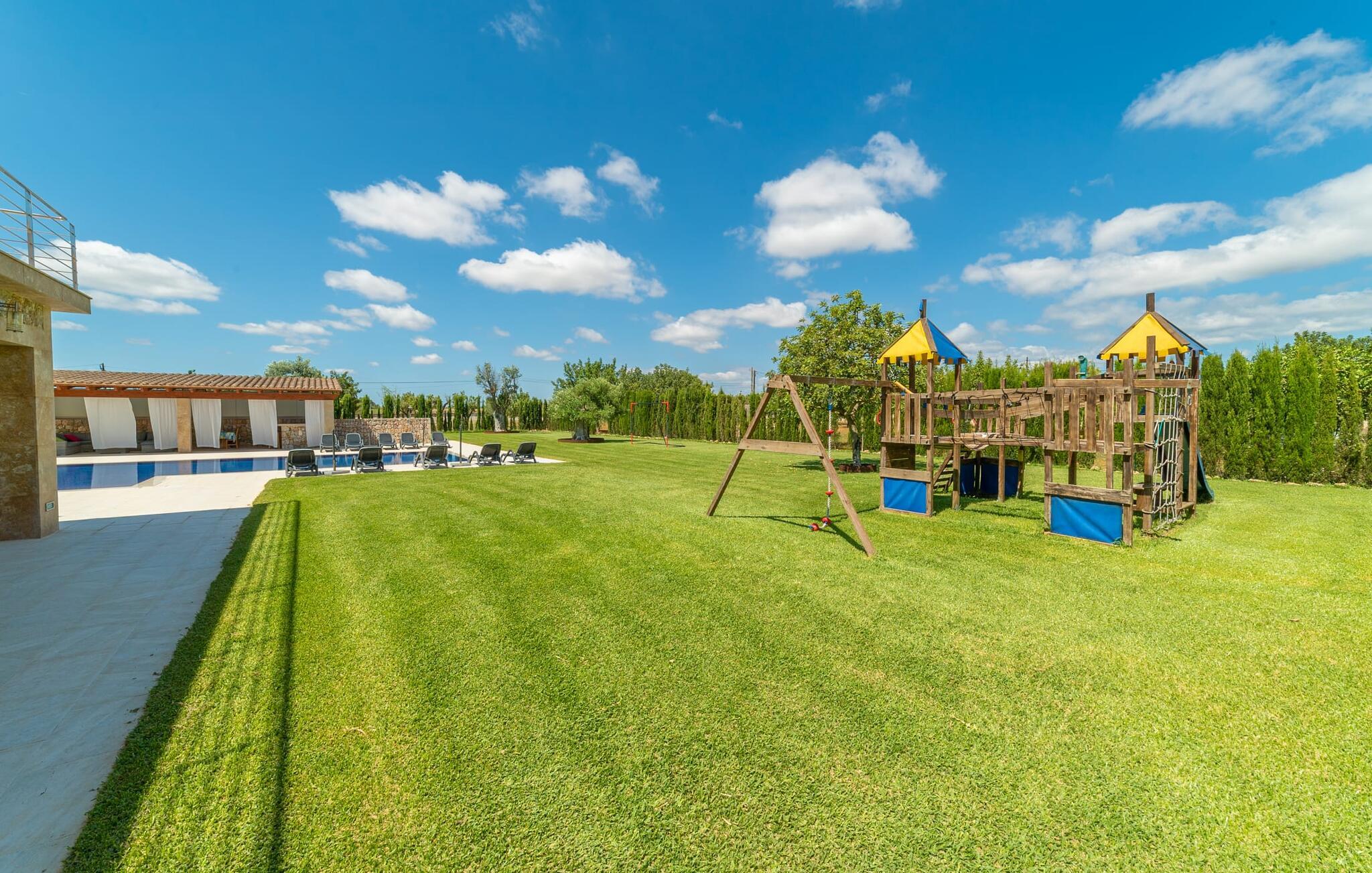 Finca for familier, grupper er ikke tilladt! Villaen i villastil "Es Velar" emmer af luksus fra hvert hjørne, mens den friske, enkle arkitektur i dette hjem stadig fastholder mallorcanske traditioner. Nyplantede cyprestræer udgør sammen med oliven- og fyrretræer og frodige grønne græsplæner landskabet i denne lukkede have. Denne villa kan varmt anbefales til familier, ikke mindst på grund af trampolinen, fodboldmålet og andre legeredskaber i haven. Den sydvendte villaejendom har naturligvis en tilsvarende stor pool med gradueret dybde, omgivet af en kæmpe terrasse, der strækker sig til huset. Efter svømning kan I bruge den væggede udendørs bruser og derefter slappe af på en af de otte liggestole - fire parasoller giver masser af skygge, hvis det kræves. Huset har overdækket terrasse med belysning og spiseplads. Dette er det rigtige sted at nyde en grill og forkæle jeres smagsløg med den lækre, intense smag af hjemmelavede friske baleariske produkter. Der er også et andet udendørs opholdsområde på balkonen på øverste etage af villaen, som tilbyder en spektakulær udsigt over Tramuntana-bjergene og de omkringliggende vinmarker. At sidde her ved solnedgang eller en klar stjerneklar nat og nyde et godt glas af den lokale rød- eller hvidvin kan bringe jeres dag til en harmonisk afslutning. Det velholdte udendørsområde danner de perfekte rammer for den to-etagers juvel i denne villa. Mens facaden er lavet af traditionel stenbrud, skiller det arkitektoniske design sig ud fra mængden med sin mere kubistiske stil og panoramavinduer, hvilket skaber en moderne villa, hvis udseende stadig passer godt sammen med øen. Da vi træder ind i den overdådige bygning, bliver vi mødt af store, lyse rum. Men bare rolig, de store panoramavinduer er udstyret med persienner for at holde varme og lys ude, og alle værelser har aircondition. I stueetagen finder vi den ene af de to rummelige stuer. Den er udstyret med en lys lædersofa, perfekt til en hyggelig aften med fjernsyn. Herfra træder I ind i spisestuen med sit stilfulde bord lavet af massive træplader med glasplade, omgivet af smarte højryggede spisestuestole, klar til fælles måltider. Det separate køkken opfylder de høje standarder for denne villa. Sorte møbler og arbejdsflader i granit supplerer trækøkkenfronternes naturmateriale. Et sådant drømmehus inkluderer naturligvis også et køkken af høj kvalitet inklusive et væghængt tv, alt udstyr til selvforplejning og endda en pejs. De private værelser er også for det meste i stueetagen: et af master soveværelserne med eget badeværelse samt et "drenge" og et "pige" værelse, som er let genkendelige på det blå eller pink og lilla farveskema. Det lyserøde og lilla værelse har en konvertibel køjeseng, mens det blå værelse har en enkeltseng. Begge børneværelser har også en udtræksseng til et andet barn. Børnene deler et af de skønne badeværelser. På villaens øverste etage finder I endnu en stue med vinterhavefornemmelse takket være de glaserede vægge. Et landskab af sorte lædersofaer suppleres af en pejs og moderne fladskærms-tv, hvilket gør det til et dejligt sted at tilbringe køligere aftener. Hvis I har brug for at indhente e-mails, er der et separat arbejdsværelse med et skrivebord, ideelt til dette formål. Det andet soveværelse støder op til stuen og har også eget badeværelse. Badeværelserne har alle en upåklagelig højglans finish og er udstyret med enten bruser eller badekar. Et af badeværelserne er mere en wellness-oase, med walk-in dobbelt bruser og et vidunderligt spabad med plads nok til, at to personer kan slappe af og nyde udsigten over Tramuntana-bjergene. Alt i alt er dette en exceptionel femstjernet luksusvilla i enhver henseende. Denne elegante ejendom er beliggende i centrum af en vinregion nær Binissalem, en lille by med adskillige vingårde. Den frugtbare region i centrum af øen, kendt som "Plà de Mallorca", er dækket af appelsin- og mandeltræer og utallige vinmarker. Talrige bodegaer og vinkældre tilbyder vinsmagninger og vine til salg hele året rundt, som I kan nyde i fred og ro i den storslåede villa "Es Velar" og få jeres egen idé om mallorcanske druers sundhed. Da villaen ligger midt i en vinregion, kan I på ingen tid være på en af de mange vingårde. Villaen ligger tæt på vejen, der fører fra den nordlige del af øen forbi Binissalem og videre til øens hovedstad Palma (der kan være noget trafikstøj). Dette gør enhver destination efter eget valg nem at nå. Hvis I kan lide at vandre, vil I nyde den betagende natur i Serra de Tramuntana-bjergene. I kan opdage skønheden på øen på godt afmærkede vandrestier. Med så mange forskellige tilbud, vil I hurtigt sætte pris på appellen - både af øen og jeres beliggenhed - for en afslappende villaferie. Ikke mindst fordi I tilbragte jeres tid i sådan en attraktiv villa som "Es Velar". Ikke underligt, at den får vores fulde anbefaling! Den ultra-chikke villa "Es Velar", nybygget i villastil med en fantastisk have og udsigt over Tramuntana-bjergene, ligger nær Binissalem. Den lille by med alle jeres daglige fornødenheder er kun fem minutters kørsel væk. Takket være sin centrale beliggenhed er hovedstaden Palma og de smukke strande og promenader i byer som Cuidad Jardin kun en kort køretur væk. Bemærk venligst, at denne ejendom ikke accepterer ungdomsgrupper eller polterabender. En ungdomsgruppe på denne ejendom består af personer i alderen [30] eller yngre. Book ikke denne ejendom, hvis I er en ungdomsgruppe eller en polterabendgruppe, da jeres reservation vil blive afvist, når den er booket, hvilket også kan være tilfældet ved ankomst til ejendommen eller under jeres ophold, og I vil ikke modtage en refusion.