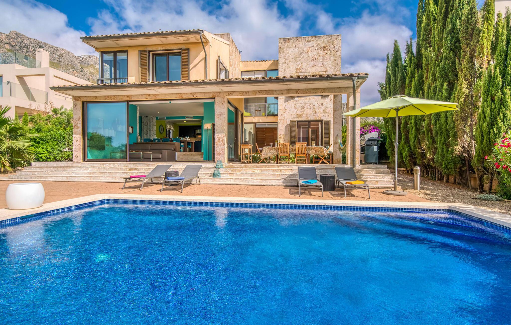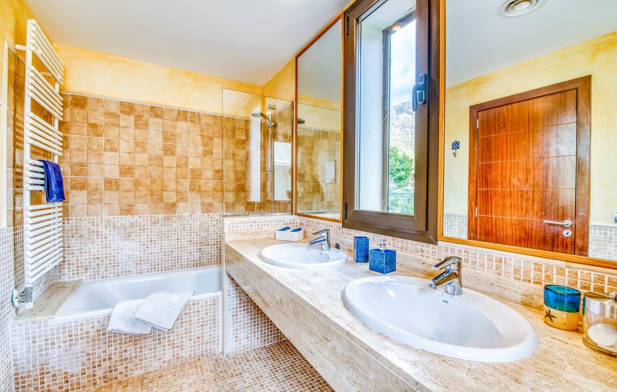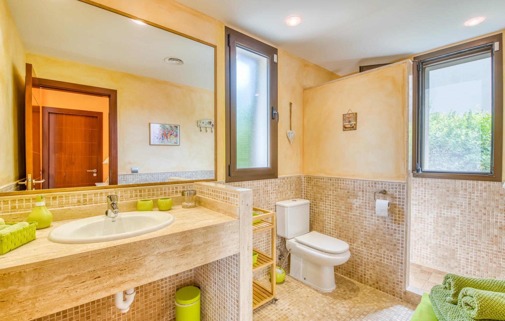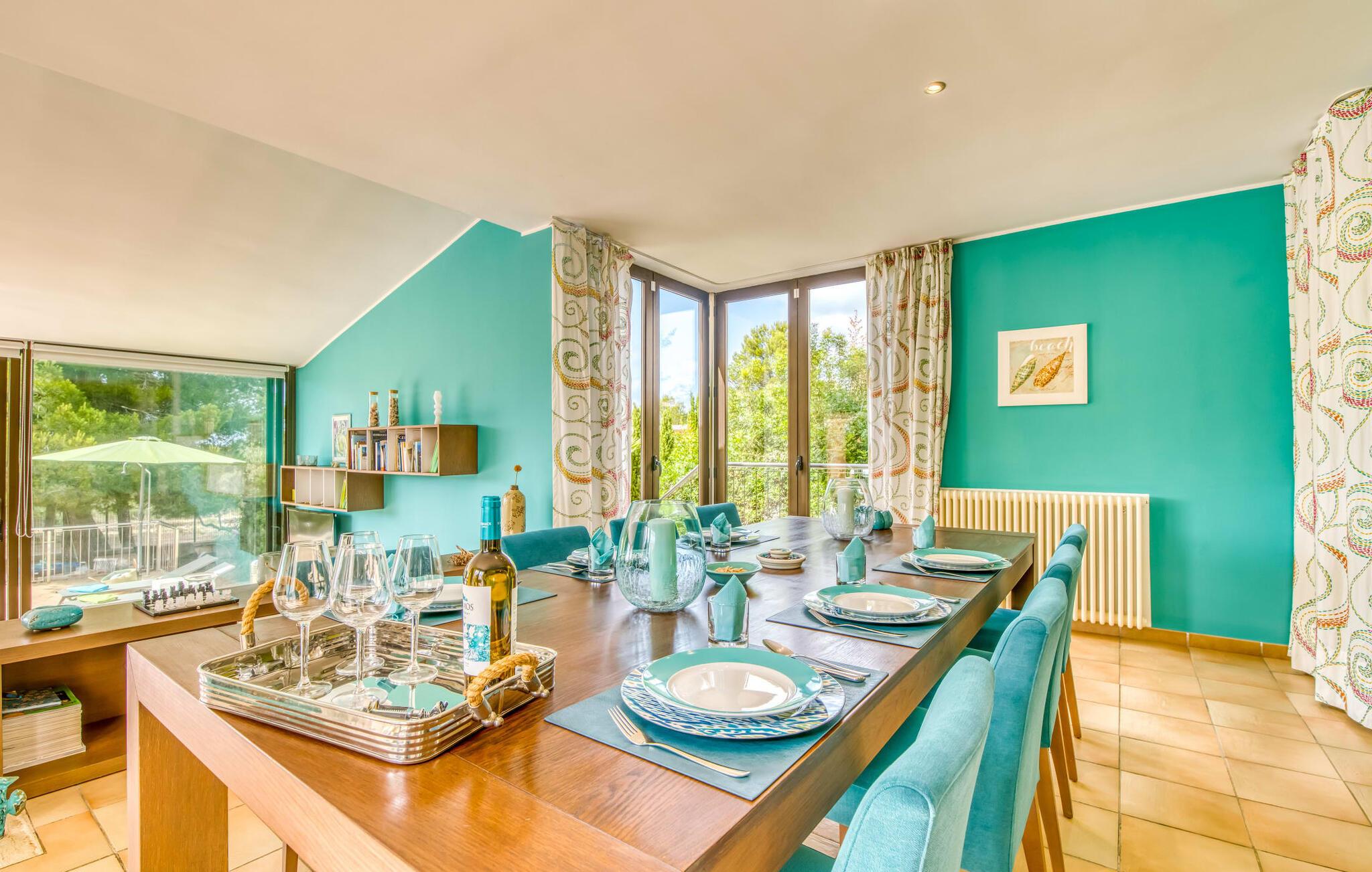 Villa "Esmeralda Turquesa" bruger naturlige lyskilder som en del af arkitekturen og genopfrisker den med levende og dynamisk interiør. De friske farver giver hvert værelse sin individuelle karakter. Uhindret dagslys kommer ind i rummet gennem panoramavinduerne. Typisk for Mallorca understreger lyse sandstensvægge villaens muntre farveaccenter, som er synlige fra alle vinkler. Huset har tre soveværelser, hver med en dobbeltseng (180 x 200 cm). Ejendommens ejere vil med glæde give jer en barneseng, hvis det kræves. Et badeværelse støder direkte op til to af værelserne. To har et badekar, ideelt til et afslappende bad. Villaen er ideel til tre par, der ønsker at nyde deres tid sammen, mens de nyder en vis grad af uafhængighed og privatliv. Tre badeværelser! Køkkenet er veludstyret: opvaskemaskine, komfur og emhætte, kaffe- og espressomaskine, et godt udvalg af urter og krydderier til jeres yndlingsopskrifter. Morgenmadsbaren er perfekt til en hurtig snack ind imellem eller til at starte dagen alene med en skål korn. Et gratis glas vin venter på jer ved ankomsten. I den tilstødende spisestue byder et stort egetræsbord på plads nok til otte personer. I tilknytning til køkkenet ligger den åbne stue, som også kan nås via trappen. Der kan I tilbringe hyggelige timer på den komfortable lædersofa. Uanset om I bare vil sætte fødderne op og se en film på fladskærms-tv'et, nyde udsigten over middelhavshaven fra terrassen eller se ud til havet i baggrunden. Galleriet på første sal garanterer den bedste udsigt til at se den spektakulære solnedgang. Strandudstyr som parasoller, strandmåtter, køletasker og liggestole samt legetøj til børnene står klar til gæsterne i huset.