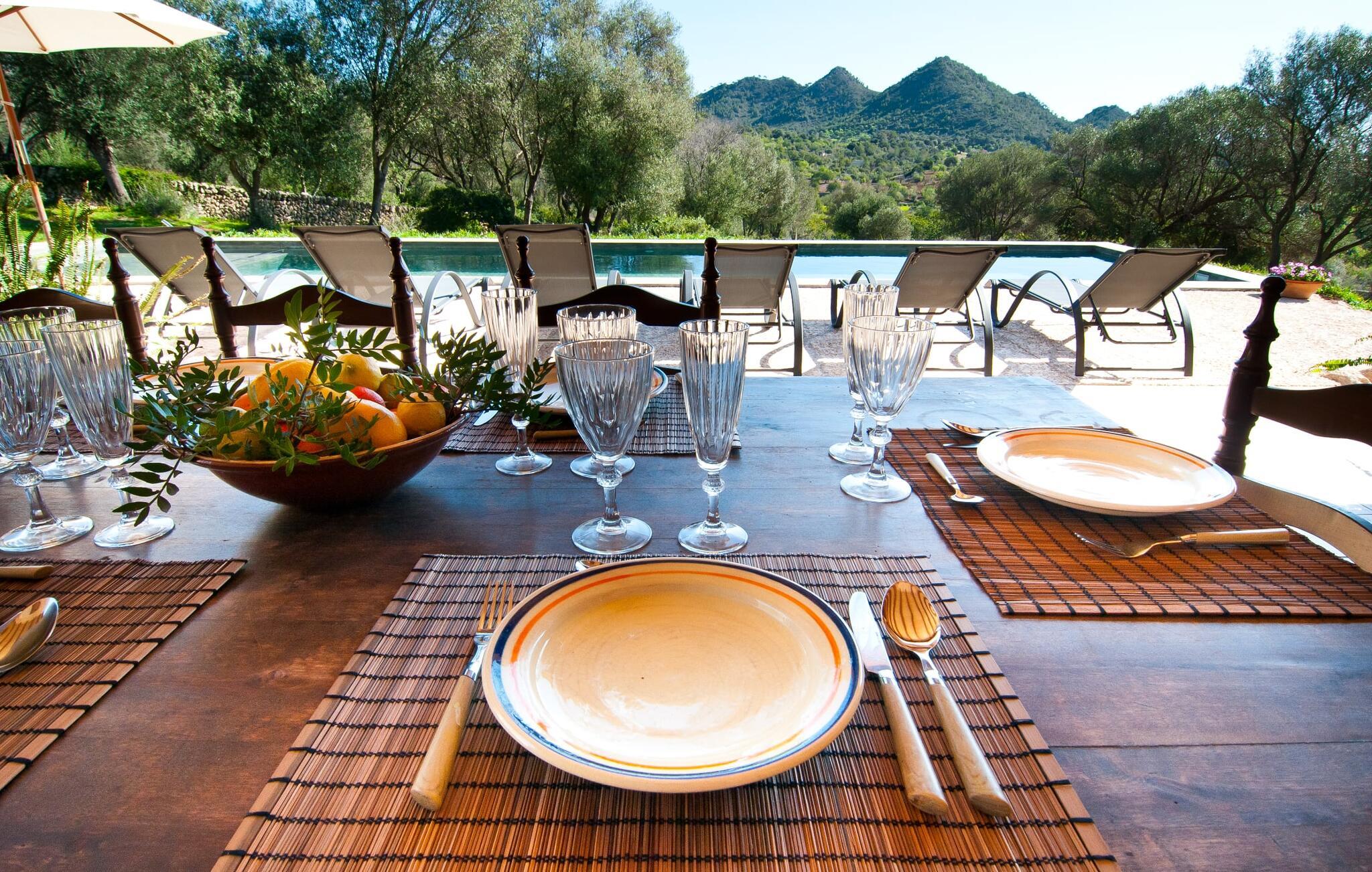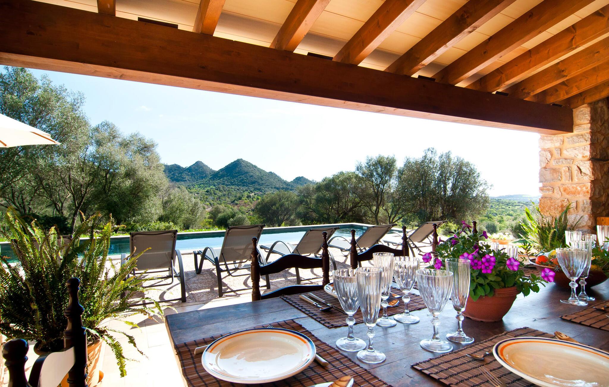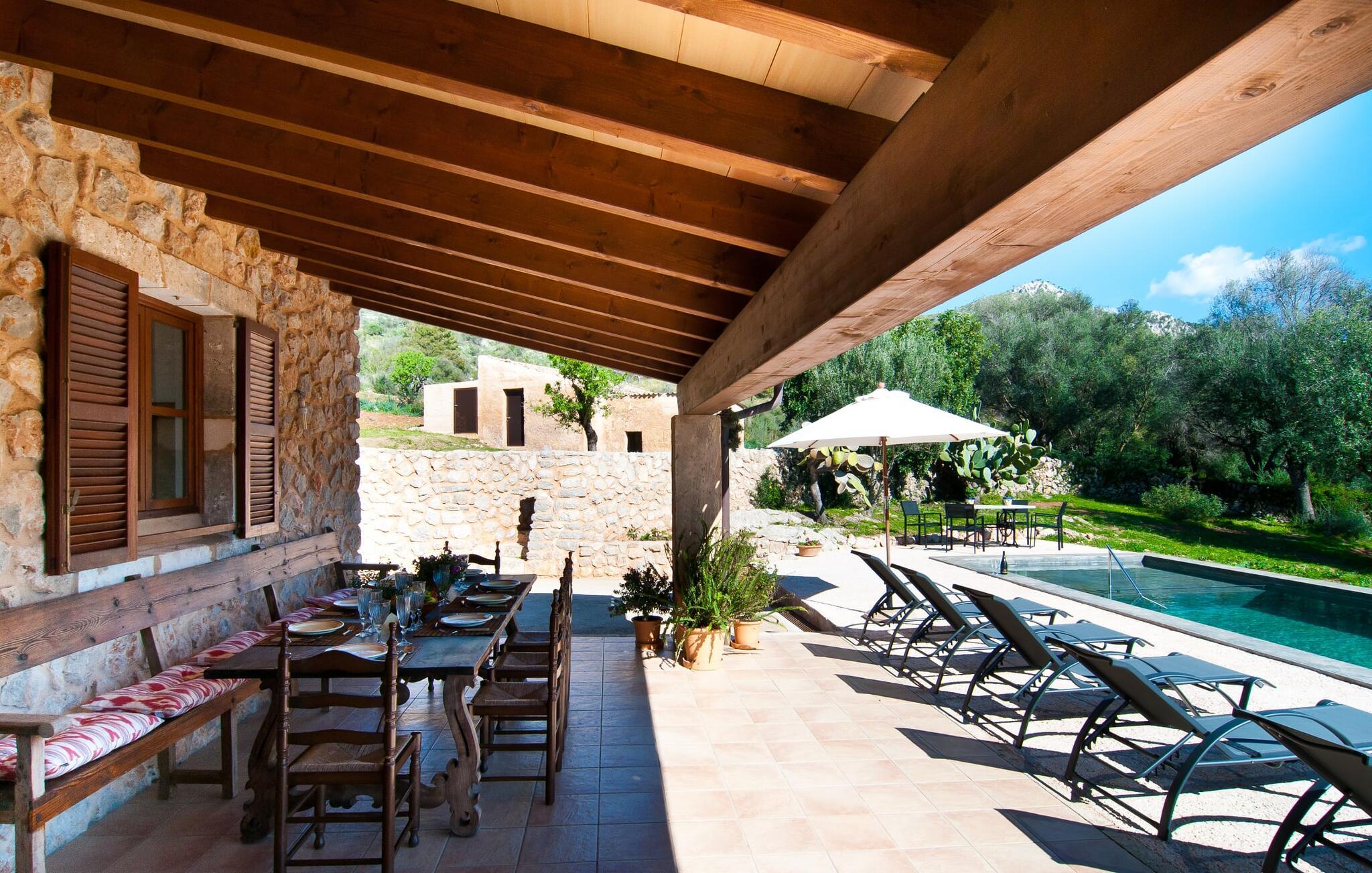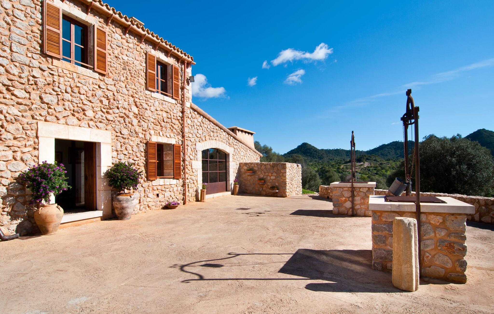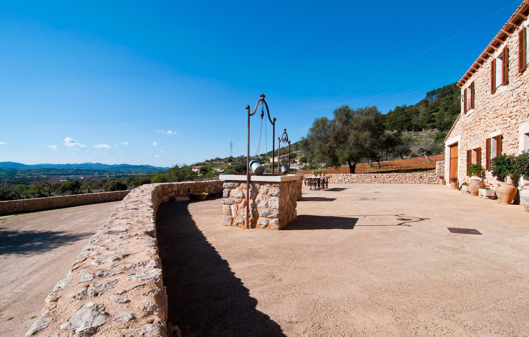 Så snart I træder ind i villaen "Esteparo", er husets typiske mallorcanske arkitektur - natursten, brede vægge, træskodder - behageligt mærkbar for den besøgende. Ejendommen har en enestående størrelse på 175.000 m², er delvist udformet som et dekorativt atrium og en smuk have og er smukt indlejret i de bakkede omgivelser. Indgangsfacaden og forpladsområdet byder gæster velkommen i en meget velholdt og smagfuld atmosfære. Det giver straks lyst til at gå ind og se på interiøret. Men lad os blive udenfor for nu, for her er meget at opdage. At gå med uret rundt om huset fører jer til det meget indbydende overdækkede terrasseområde, hvor I kan sidde i den blæsende skygge og nyde en smuk udsigt over poolen, den smukke grønne have og langt videre. Dette er det ideelle sted at hilse dagen velkommen med en forfriskende morgenmad om morgenen og lægge planer for den kommende spændende dag. Et nostalgisk, stort træbord med bænk og stole, kombineret med de imponerende træbjælker i loftet, giver dette område en helt særlig flair. Dette kan også fejres med fornøjelse om aftenen. Den permanente grill, der er installeret lige ved siden af, vil helt sikkert tjene jer godt og tilberede friske, regionale delikatesser. I kan forfriske jer selv til jeres hjertes lyst i den overdimensionerede pool. Poolen har en særdeles behagelig indgang og støder op til loungeterrassen, hvor I kan slappe af under middelhavshimlen. Bliver sollyset for stærkt, kan og bør en parasol bruges. Der er i alt 10 komfortable liggestole til jeres rådighed, og yderligere dejlige siddepladser venter nær poolindgangen.