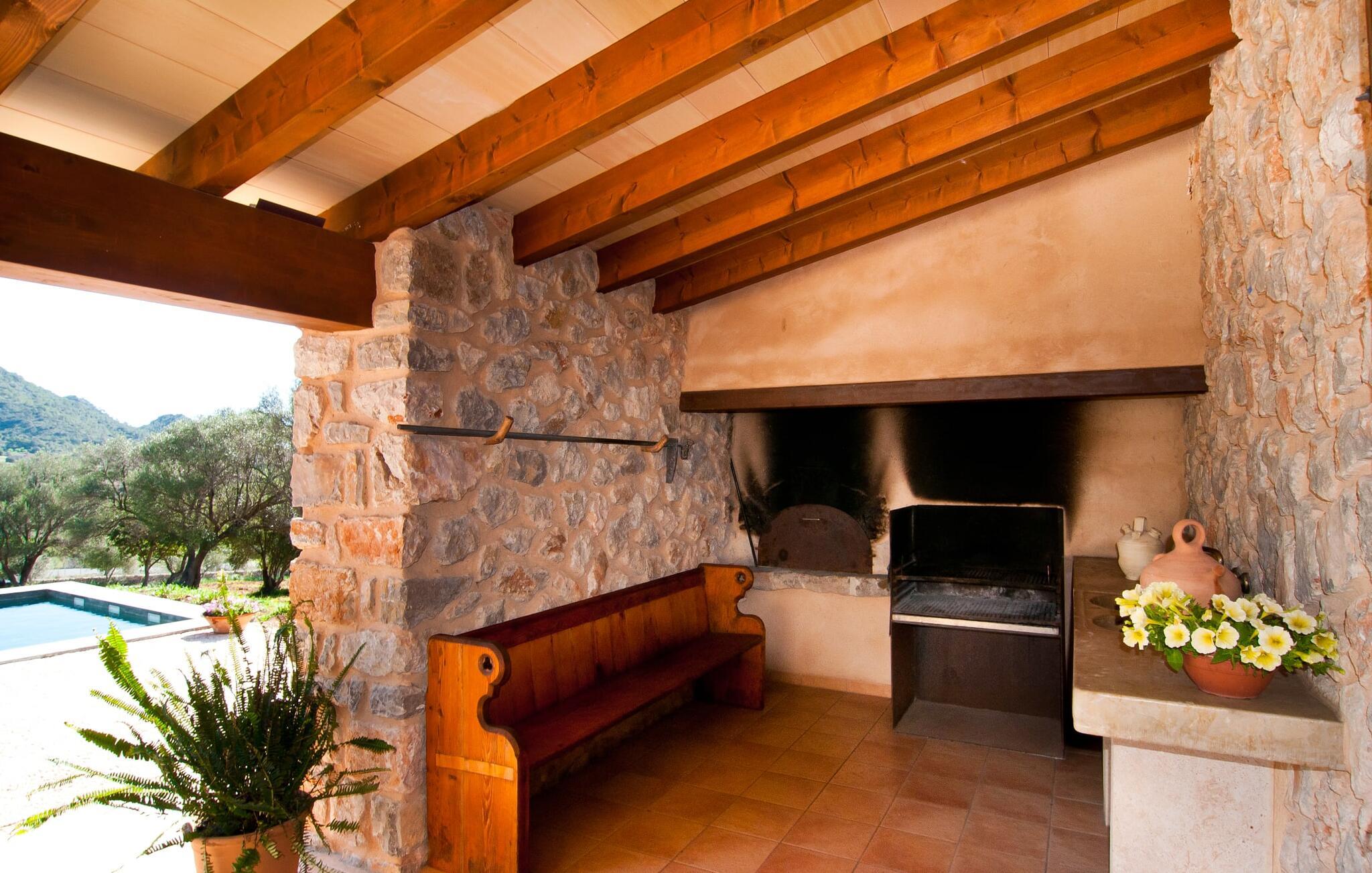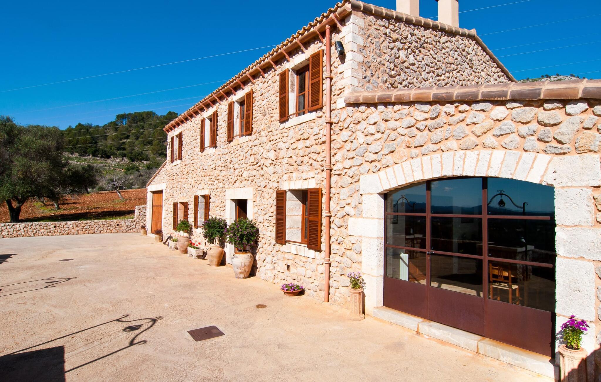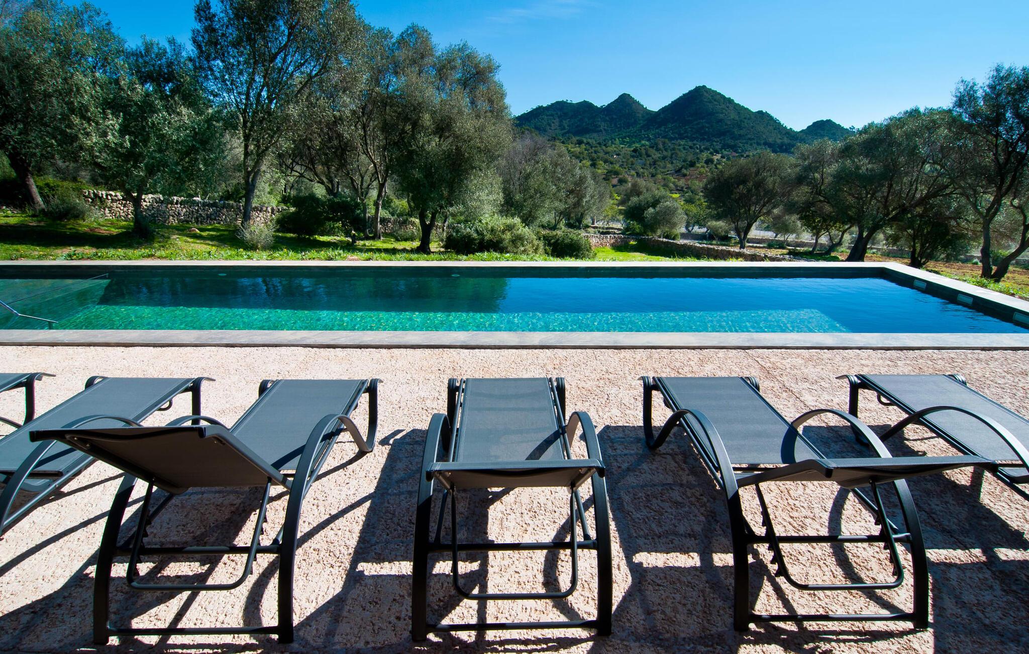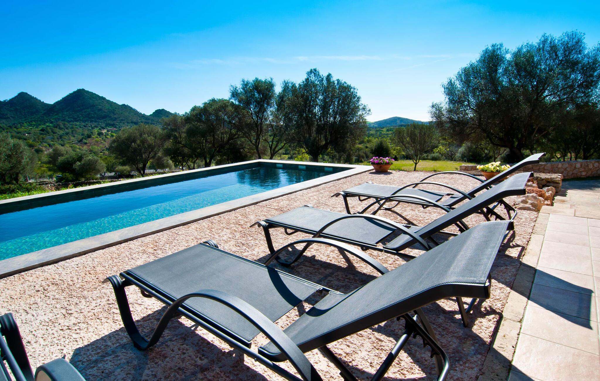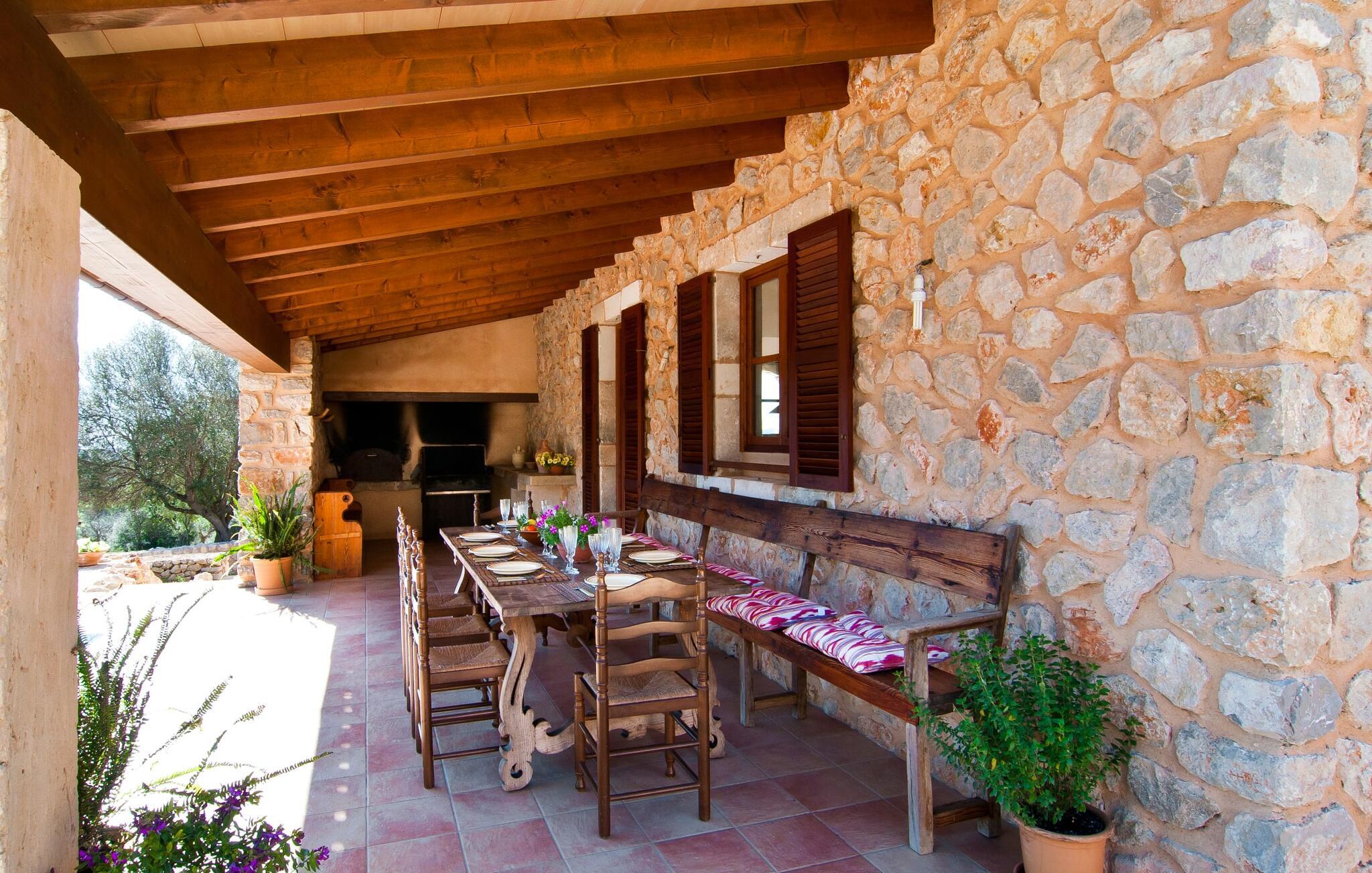 Så snart I træder ind i villaen "Esteparo", er husets typiske mallorcanske arkitektur - natursten, brede vægge, træskodder - behageligt mærkbar for den besøgende. Ejendommen har en enestående størrelse på 175.000 m², er delvist udformet som et dekorativt atrium og en smuk have og er smukt indlejret i de bakkede omgivelser. Indgangsfacaden og forpladsområdet byder gæster velkommen i en meget velholdt og smagfuld atmosfære. Det giver straks lyst til at gå ind og se på interiøret. Men lad os blive udenfor for nu, for her er meget at opdage. At gå med uret rundt om huset fører jer til det meget indbydende overdækkede terrasseområde, hvor I kan sidde i den blæsende skygge og nyde en smuk udsigt over poolen, den smukke grønne have og langt videre. Dette er det ideelle sted at hilse dagen velkommen med en forfriskende morgenmad om morgenen og lægge planer for den kommende spændende dag. Et nostalgisk, stort træbord med bænk og stole, kombineret med de imponerende træbjælker i loftet, giver dette område en helt særlig flair. Dette kan også fejres med fornøjelse om aftenen. Den permanente grill, der er installeret lige ved siden af, vil helt sikkert tjene jer godt og tilberede friske, regionale delikatesser. I kan forfriske jer selv til jeres hjertes lyst i den overdimensionerede pool. Poolen har en særdeles behagelig indgang og støder op til loungeterrassen, hvor I kan slappe af under middelhavshimlen. Bliver sollyset for stærkt, kan og bør en parasol bruges. Der er i alt 10 komfortable liggestole til jeres rådighed, og yderligere dejlige siddepladser venter nær poolindgangen.