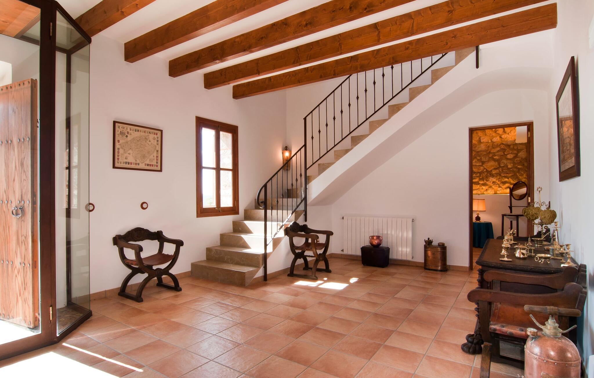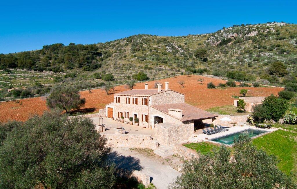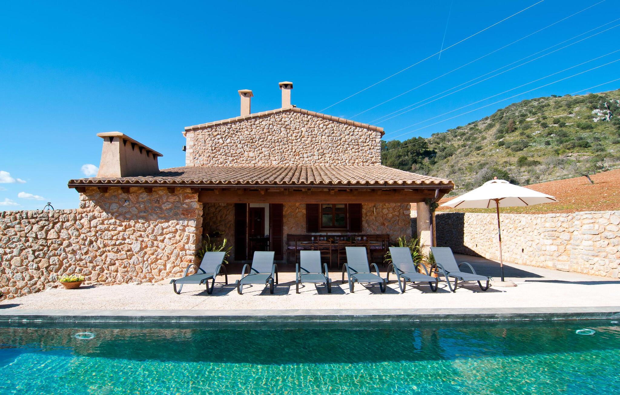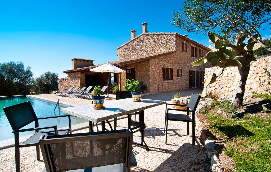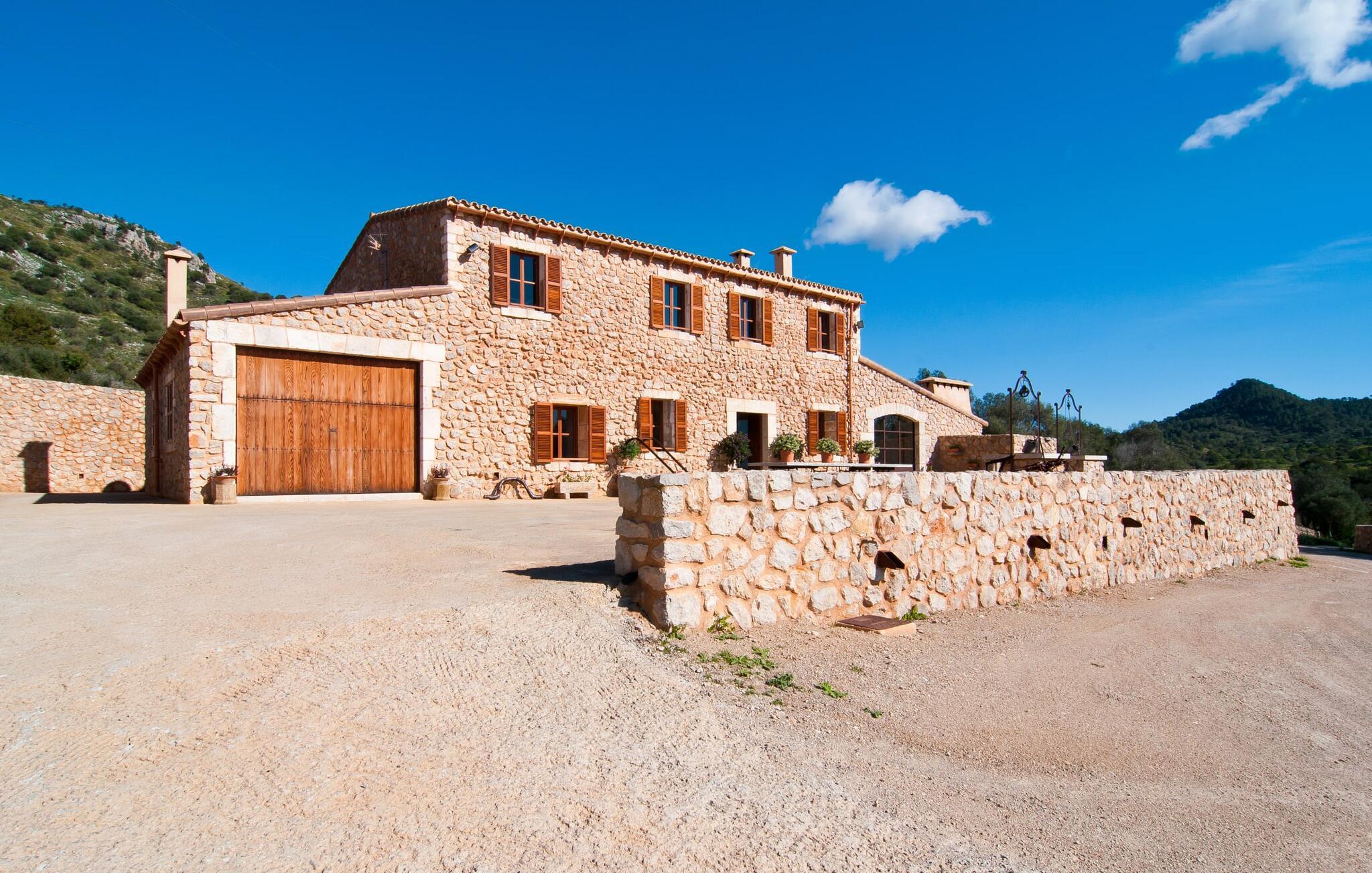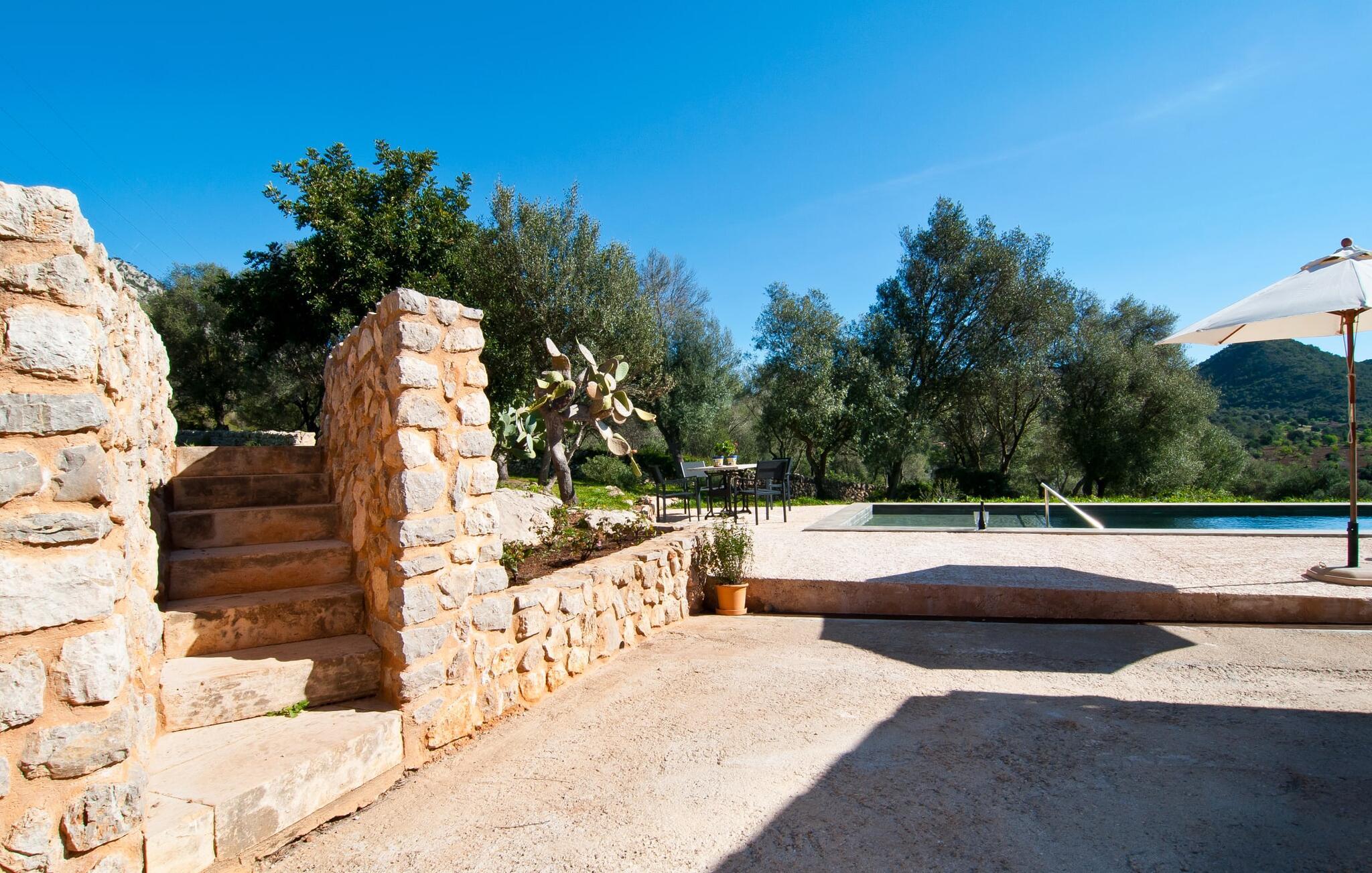 Så snart I træder ind i villaen "Esteparo", er husets typiske mallorcanske arkitektur - natursten, brede vægge, træskodder - behageligt mærkbar for den besøgende. Ejendommen har en enestående størrelse på 175.000 m², er delvist udformet som et dekorativt atrium og en smuk have og er smukt indlejret i de bakkede omgivelser. Indgangsfacaden og forpladsområdet byder gæster velkommen i en meget velholdt og smagfuld atmosfære. Det giver straks lyst til at gå ind og se på interiøret. Men lad os blive udenfor for nu, for her er meget at opdage. At gå med uret rundt om huset fører jer til det meget indbydende overdækkede terrasseområde, hvor I kan sidde i den blæsende skygge og nyde en smuk udsigt over poolen, den smukke grønne have og langt videre. Dette er det ideelle sted at hilse dagen velkommen med en forfriskende morgenmad om morgenen og lægge planer for den kommende spændende dag. Et nostalgisk, stort træbord med bænk og stole, kombineret med de imponerende træbjælker i loftet, giver dette område en helt særlig flair. Dette kan også fejres med fornøjelse om aftenen. Den permanente grill, der er installeret lige ved siden af, vil helt sikkert tjene jer godt og tilberede friske, regionale delikatesser. I kan forfriske jer selv til jeres hjertes lyst i den overdimensionerede pool. Poolen har en særdeles behagelig indgang og støder op til loungeterrassen, hvor I kan slappe af under middelhavshimlen. Bliver sollyset for stærkt, kan og bør en parasol bruges. Der er i alt 10 komfortable liggestole til jeres rådighed, og yderligere dejlige siddepladser venter nær poolindgangen.