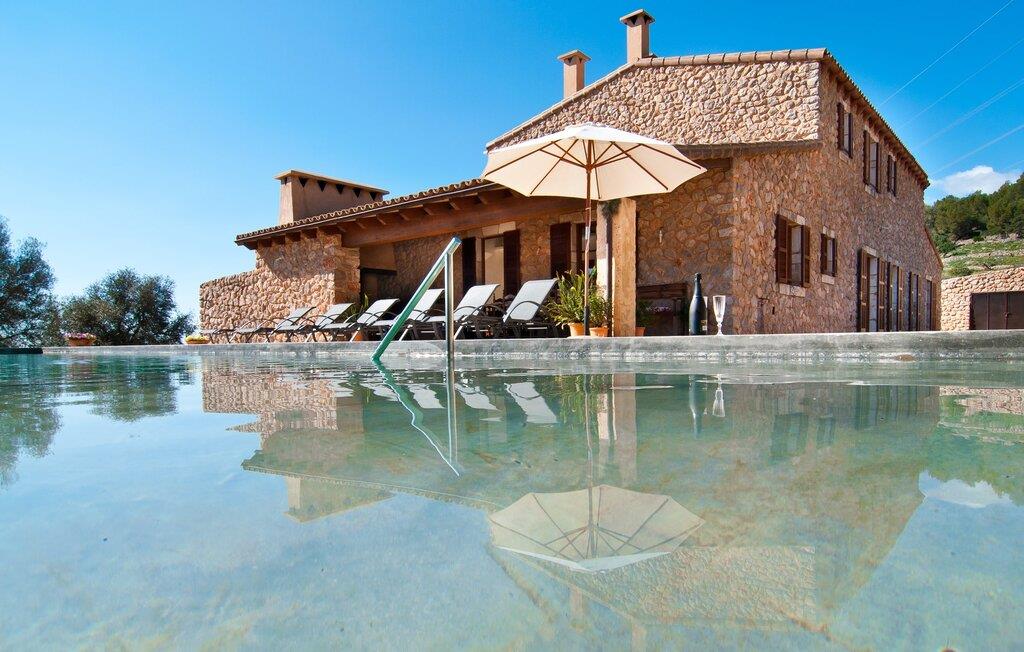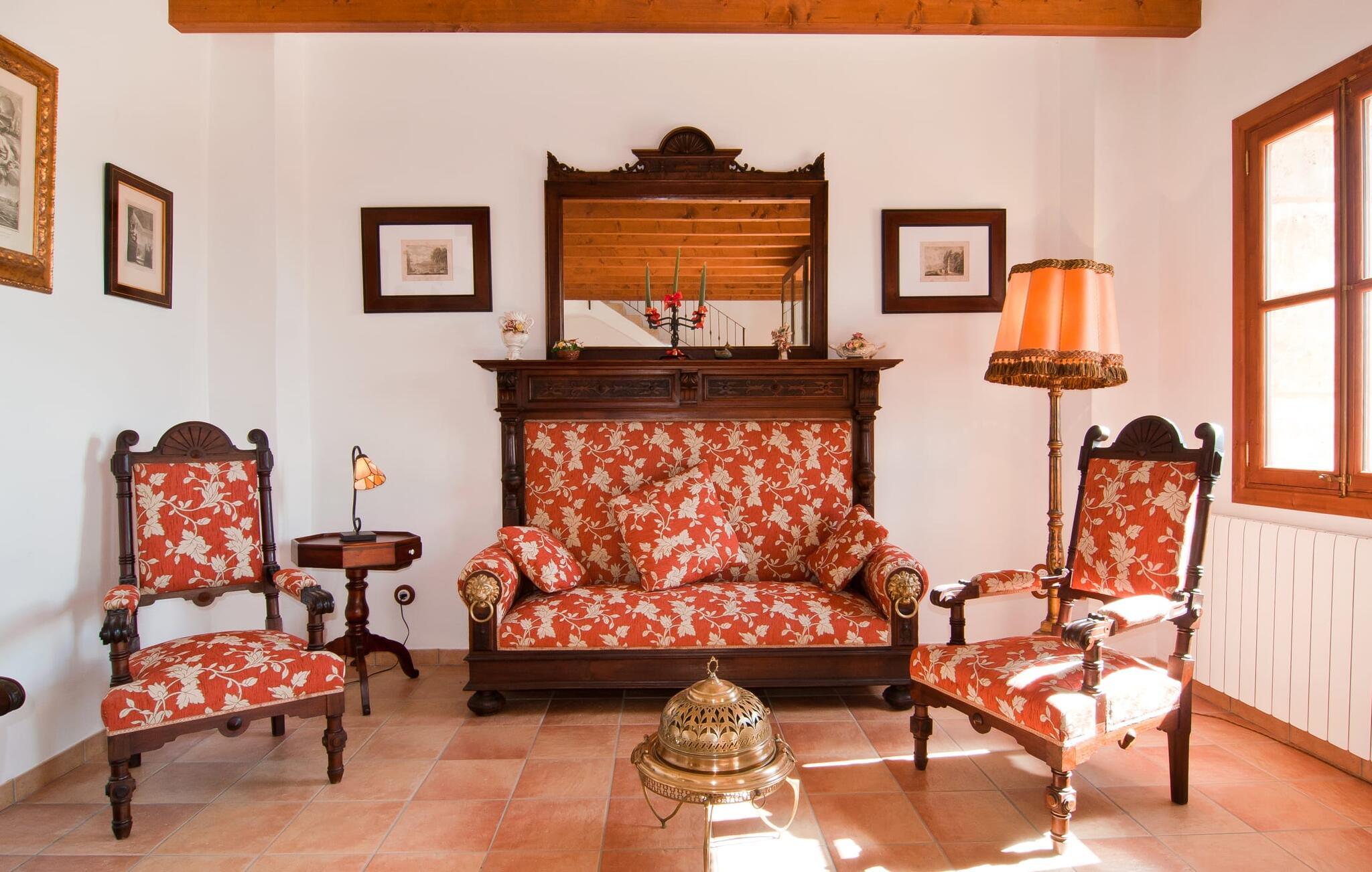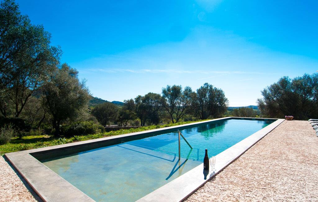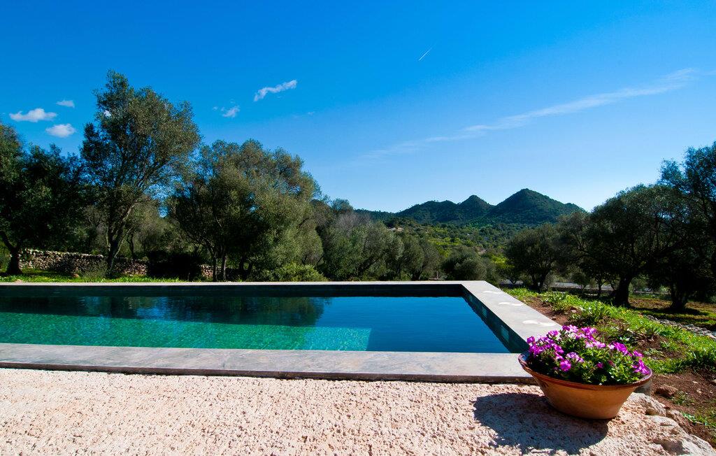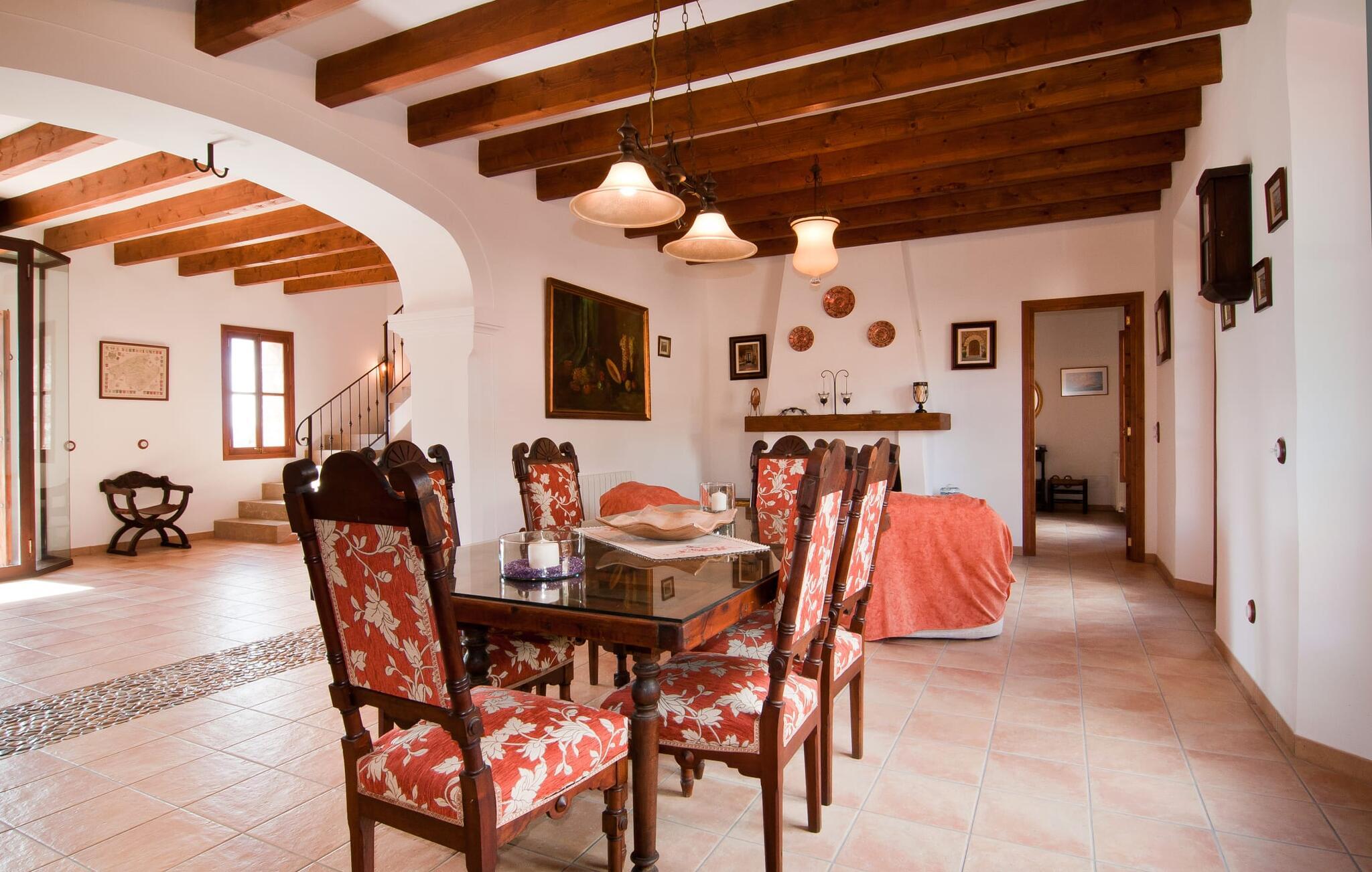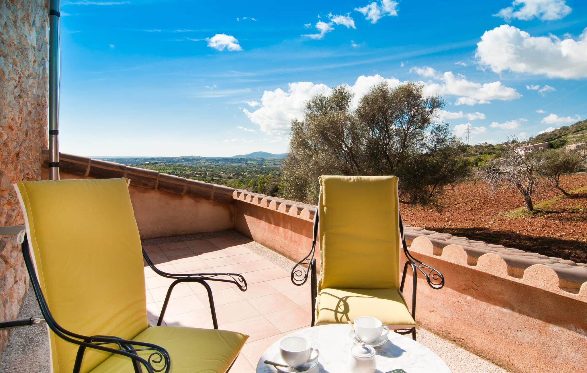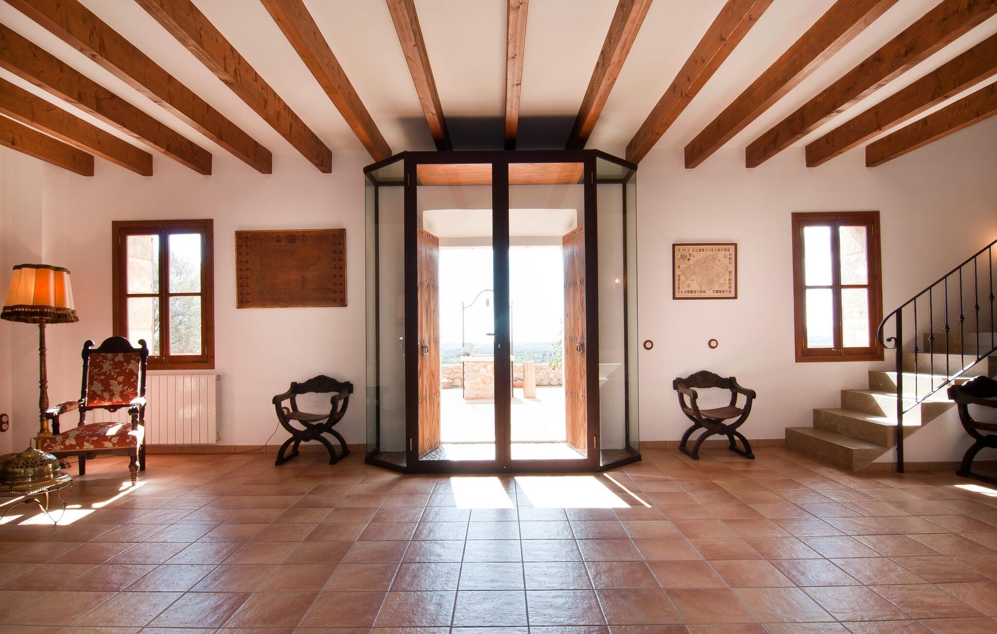 Så snart I træder ind i villaen "Esteparo", er husets typiske mallorcanske arkitektur - natursten, brede vægge, træskodder - behageligt mærkbar for den besøgende. Ejendommen har en enestående størrelse på 175.000 m², er delvist udformet som et dekorativt atrium og en smuk have og er smukt indlejret i de bakkede omgivelser. Indgangsfacaden og forpladsområdet byder gæster velkommen i en meget velholdt og smagfuld atmosfære. Det giver straks lyst til at gå ind og se på interiøret. Men lad os blive udenfor for nu, for her er meget at opdage. At gå med uret rundt om huset fører jer til det meget indbydende overdækkede terrasseområde, hvor I kan sidde i den blæsende skygge og nyde en smuk udsigt over poolen, den smukke grønne have og langt videre. Dette er det ideelle sted at hilse dagen velkommen med en forfriskende morgenmad om morgenen og lægge planer for den kommende spændende dag. Et nostalgisk, stort træbord med bænk og stole, kombineret med de imponerende træbjælker i loftet, giver dette område en helt særlig flair. Dette kan også fejres med fornøjelse om aftenen. Den permanente grill, der er installeret lige ved siden af, vil helt sikkert tjene jer godt og tilberede friske, regionale delikatesser. I kan forfriske jer selv til jeres hjertes lyst i den overdimensionerede pool. Poolen har en særdeles behagelig indgang og støder op til loungeterrassen, hvor I kan slappe af under middelhavshimlen. Bliver sollyset for stærkt, kan og bør en parasol bruges. Der er i alt 10 komfortable liggestole til jeres rådighed, og yderligere dejlige siddepladser venter nær poolindgangen.