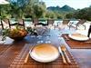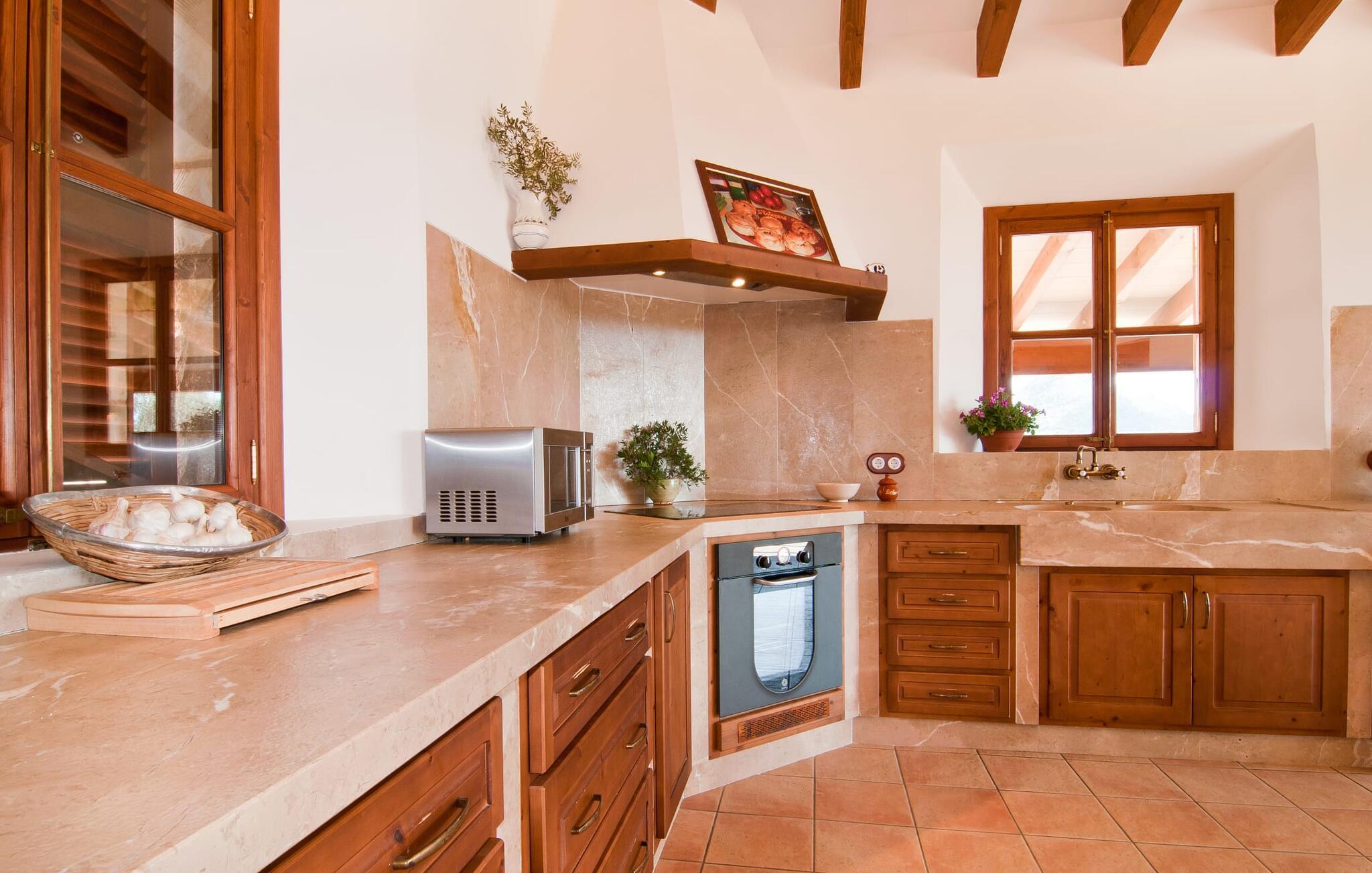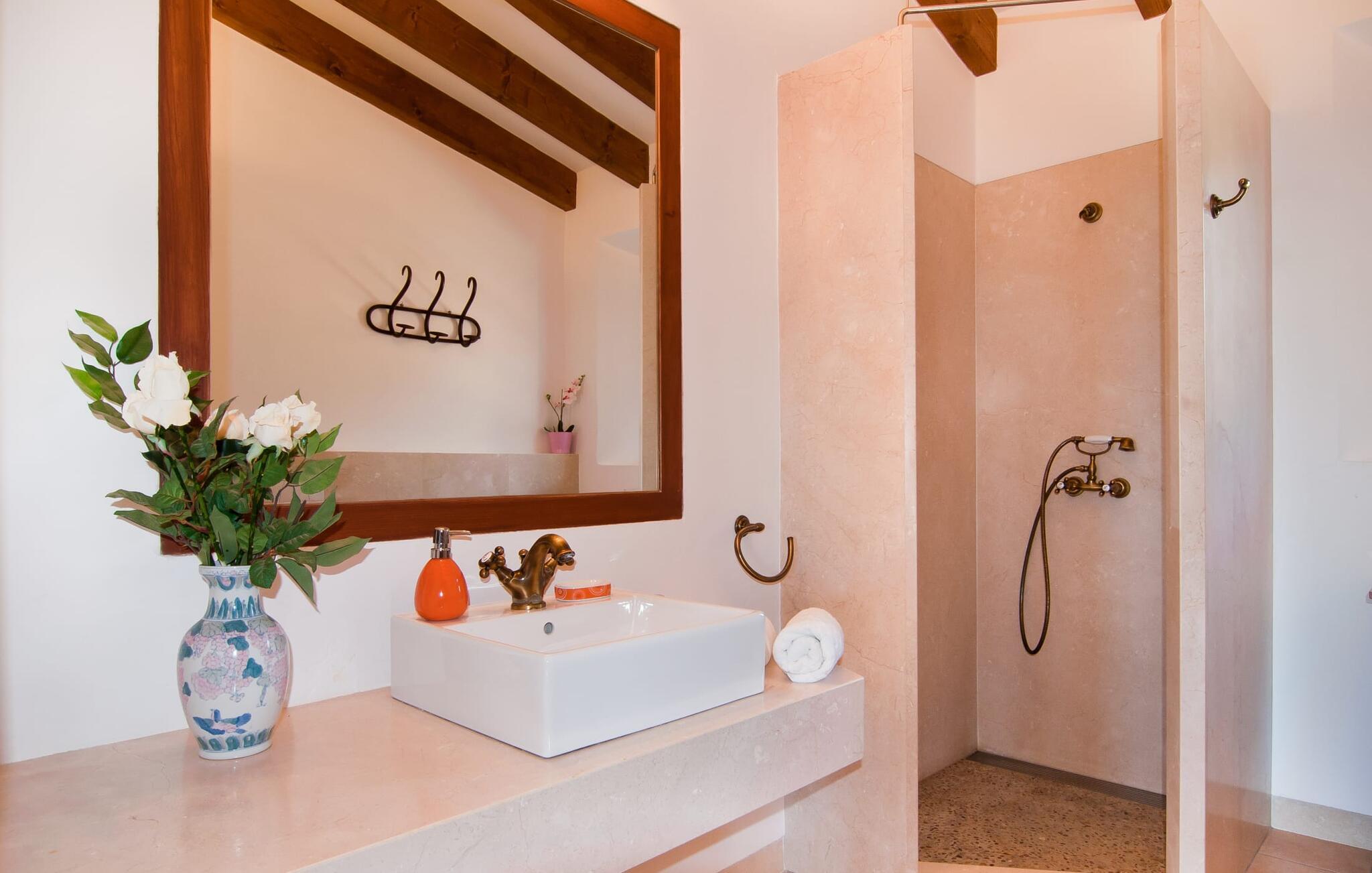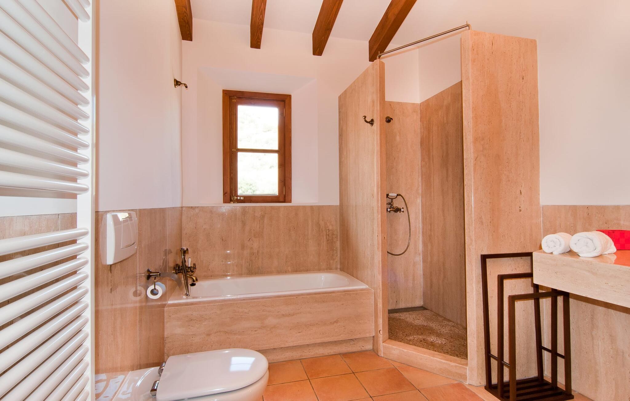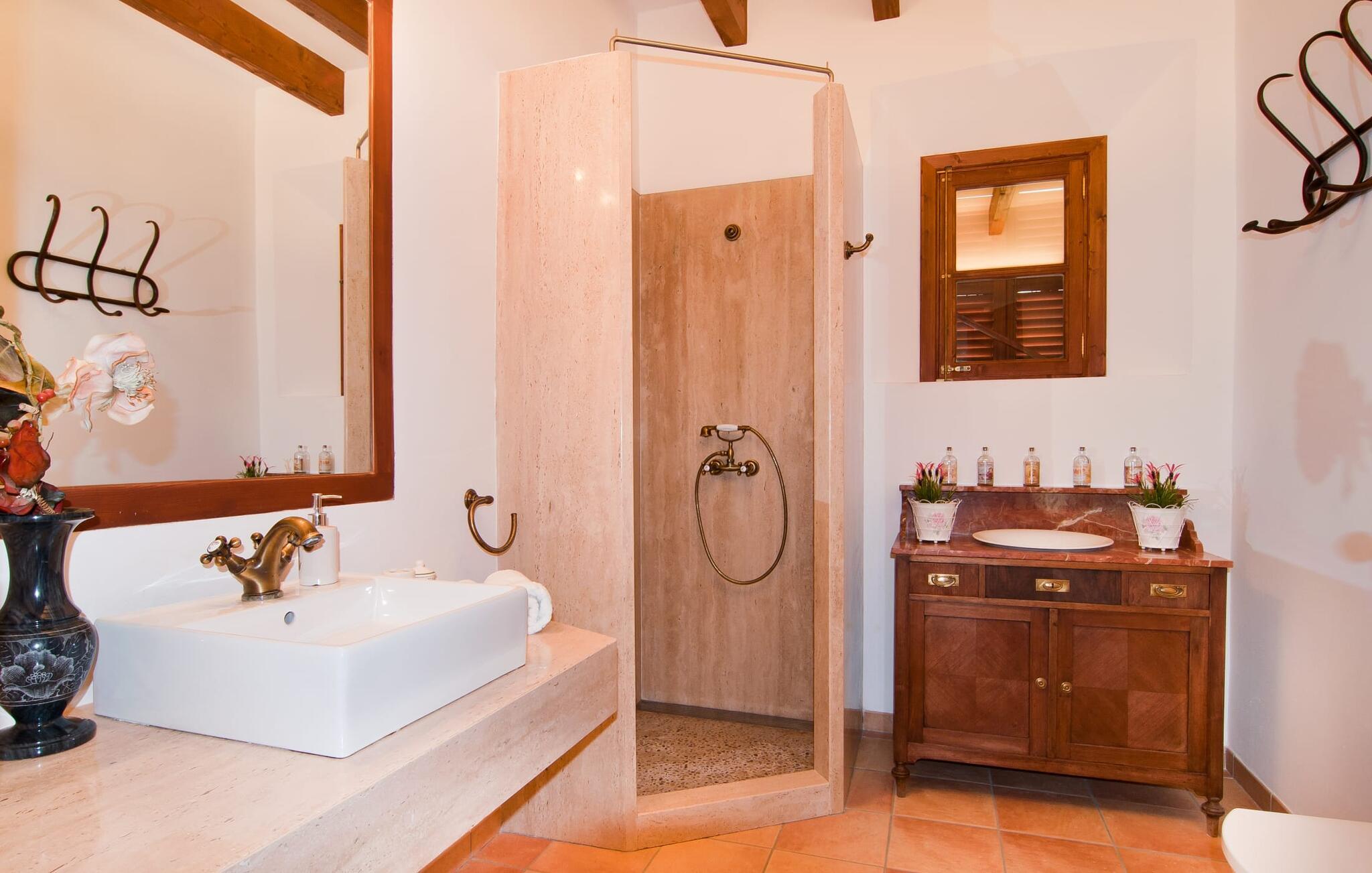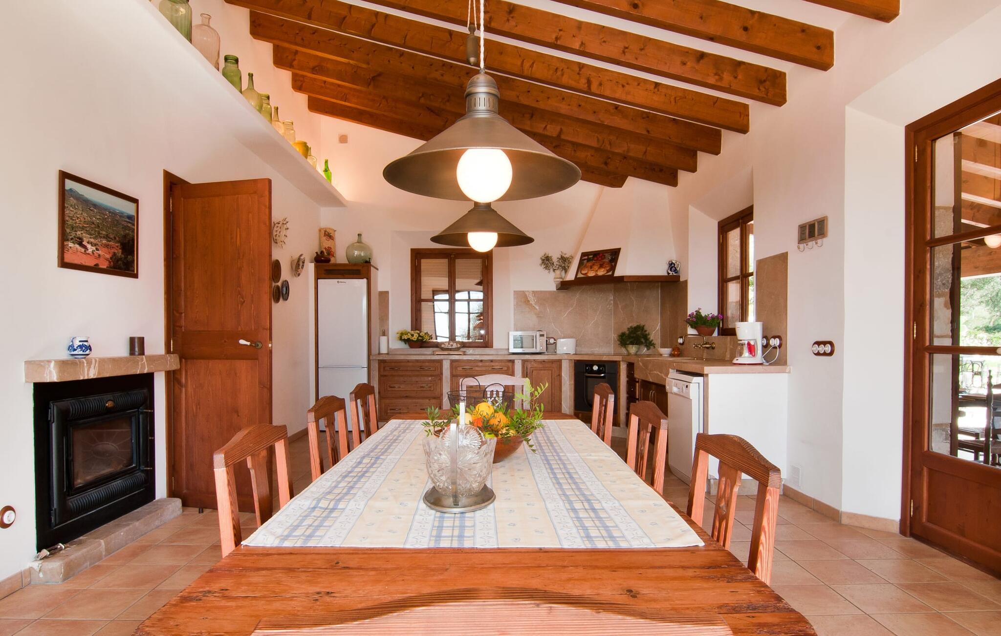 Så snart I træder ind i villaen "Esteparo", er husets typiske mallorcanske arkitektur - natursten, brede vægge, træskodder - behageligt mærkbar for den besøgende. Ejendommen har en enestående størrelse på 175.000 m², er delvist udformet som et dekorativt atrium og en smuk have og er smukt indlejret i de bakkede omgivelser. Indgangsfacaden og forpladsområdet byder gæster velkommen i en meget velholdt og smagfuld atmosfære. Det giver straks lyst til at gå ind og se på interiøret. Men lad os blive udenfor for nu, for her er meget at opdage. At gå med uret rundt om huset fører jer til det meget indbydende overdækkede terrasseområde, hvor I kan sidde i den blæsende skygge og nyde en smuk udsigt over poolen, den smukke grønne have og langt videre. Dette er det ideelle sted at hilse dagen velkommen med en forfriskende morgenmad om morgenen og lægge planer for den kommende spændende dag. Et nostalgisk, stort træbord med bænk og stole, kombineret med de imponerende træbjælker i loftet, giver dette område en helt særlig flair. Dette kan også fejres med fornøjelse om aftenen. Den permanente grill, der er installeret lige ved siden af, vil helt sikkert tjene jer godt og tilberede friske, regionale delikatesser. I kan forfriske jer selv til jeres hjertes lyst i den overdimensionerede pool. Poolen har en særdeles behagelig indgang og støder op til loungeterrassen, hvor I kan slappe af under middelhavshimlen. Bliver sollyset for stærkt, kan og bør en parasol bruges. Der er i alt 10 komfortable liggestole til jeres rådighed, og yderligere dejlige siddepladser venter nær poolindgangen.