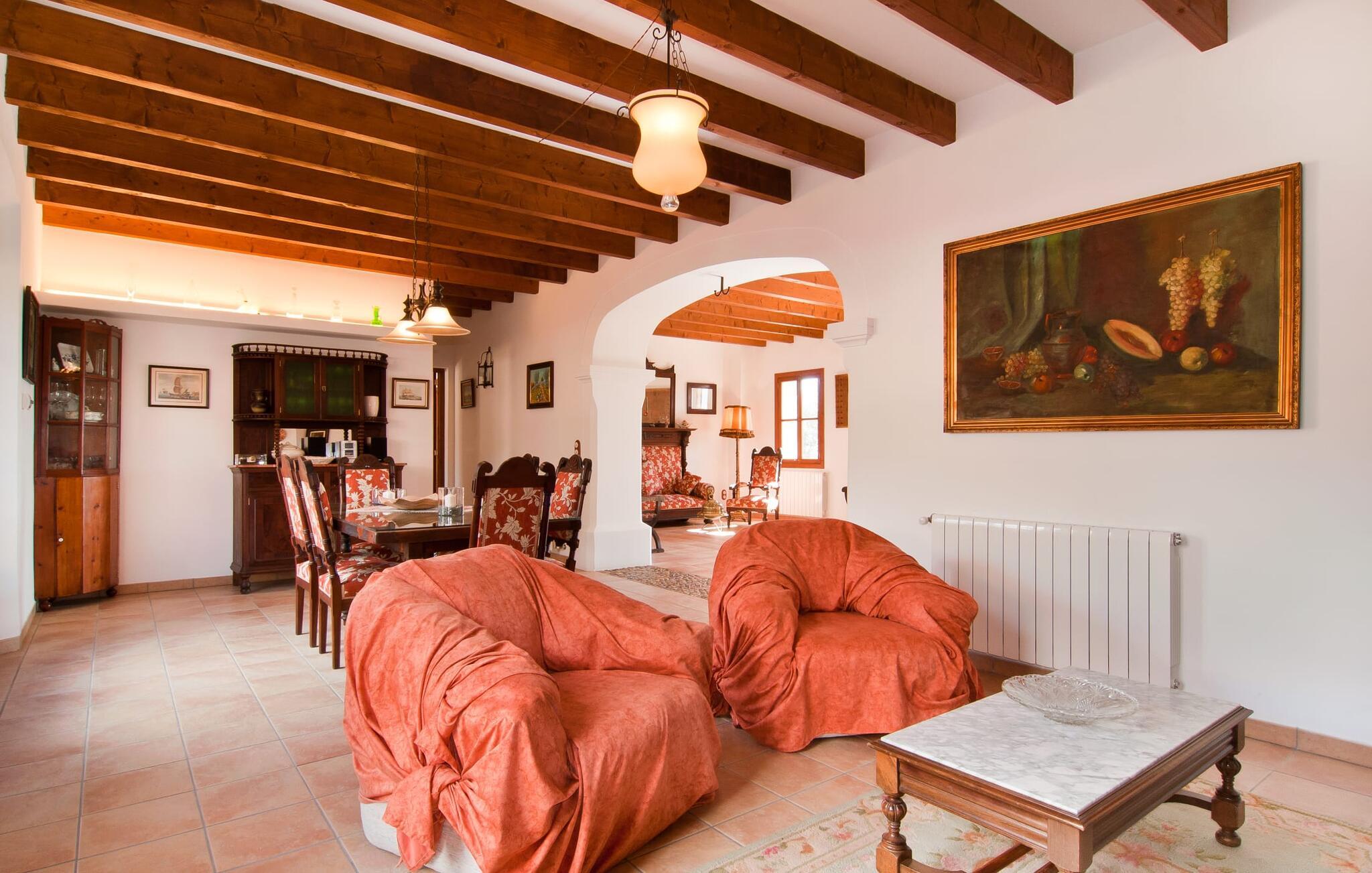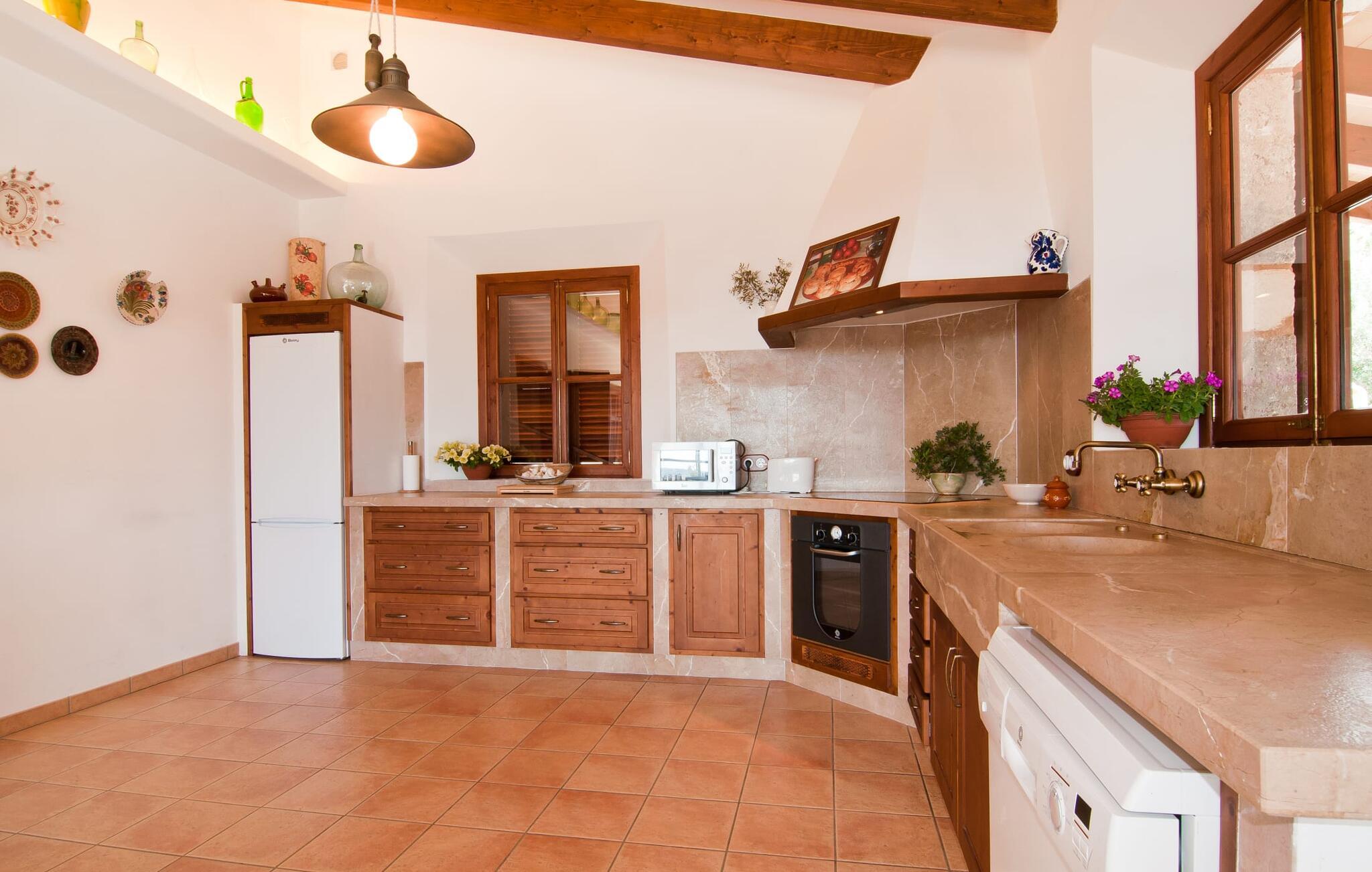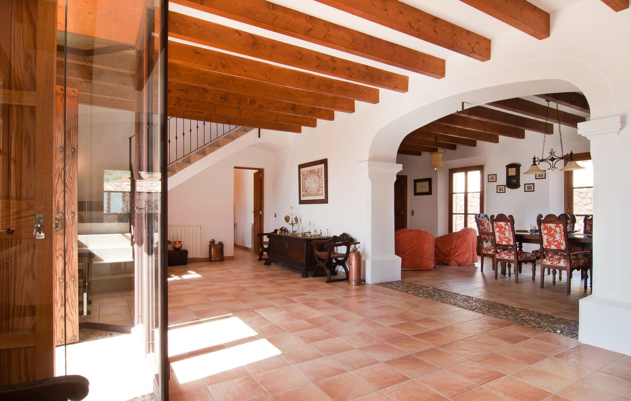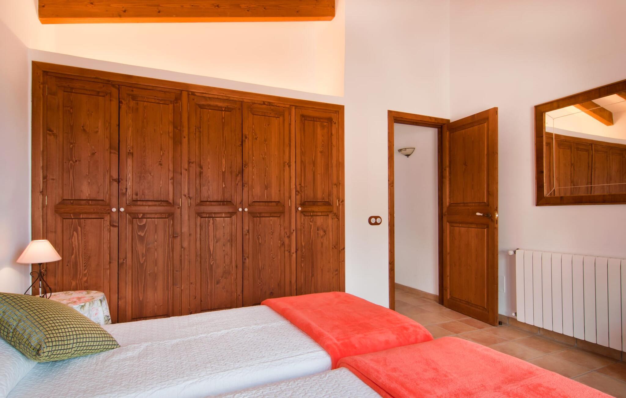 Det, der umiddelbart slår jer, når I træder ind i huset: plads. Plads til at leve. At blomstre. Til jeres helt egen, måske endda udvidede radius. Mellem moderne synlige bjælkelofter over, matchende terracotta-fliser på gulvet og lyse hvide vægge rundt omkring, er der udsøgte møbler, der muliggør en absolut kultiveret livsstil. Rummelige opholdsrum præger huset og giver det et meget individuelt præg, som frihedsglade mennesker især sætter pris på. I kan nemt rejse hertil med en større gruppe uden at skulle bekymre jer om nok privatliv. Da boligarealet er fordelt på to etager, forstærkes indtrykket af rummelighed yderligere. Hvis I har lyst, kan I spise jeres måltider alene indendørs tre forskellige steder: enten i en af de fint indrettede spisepladser. Eller i det enorme køkken, et fantastisk stort spisekøkken, hvor der kan laves mad og derefter nydes sammen. På køligere aftener kan I finde jer godt tilpas her ved pejsen. Det æstetiske tekøkken, delvist dekoreret med marmor og bygget i en L-form, byder på alt, hvad I behøver til hverdagsbrug i en højkvalitets form og form. Der medfølger også en filterkaffemaskine. Sofazoner er fordelt i hele huset, lige så generøst som spisebordene. De tilbyder plads til at slappe af, hvad enten det er at læse, have dybdegående samtaler eller se tv på stedet med fladskærms-tv. Elegante og romantisk indrettede soveværelser inviterer jer til at få en afslappende nattesøvn. I denne atmosfære kan I slappe dybt af og finde jeres center uden nogen irriterende klokker og fløjter. Træ, masser af hvidt og et par smart placerede strejf af farve fremkalder en drømmende atmosfære. I alt er der tre værelser med dobbeltsenge og to værelser med to enkeltsenge. Indretning af høj kvalitet og moderne design findes på badeværelserne, hvoraf det ene er et luksuriøst en-suite badeværelse. Et strygejern og en hårtørrer er til rådighed i huset, så I behøver ikke at tage dem med.