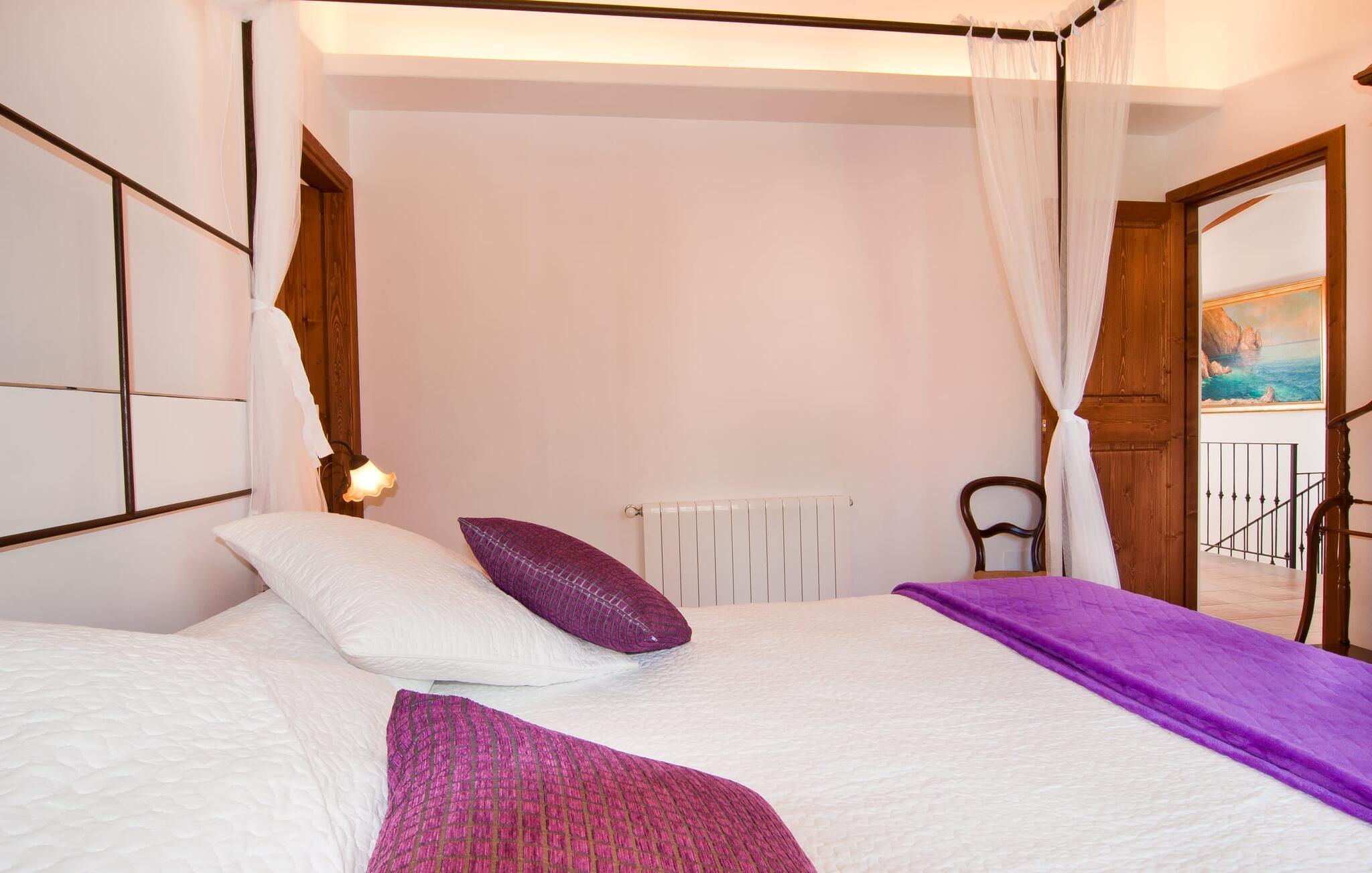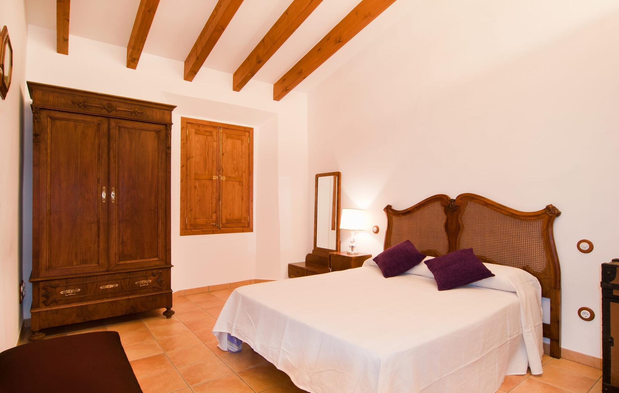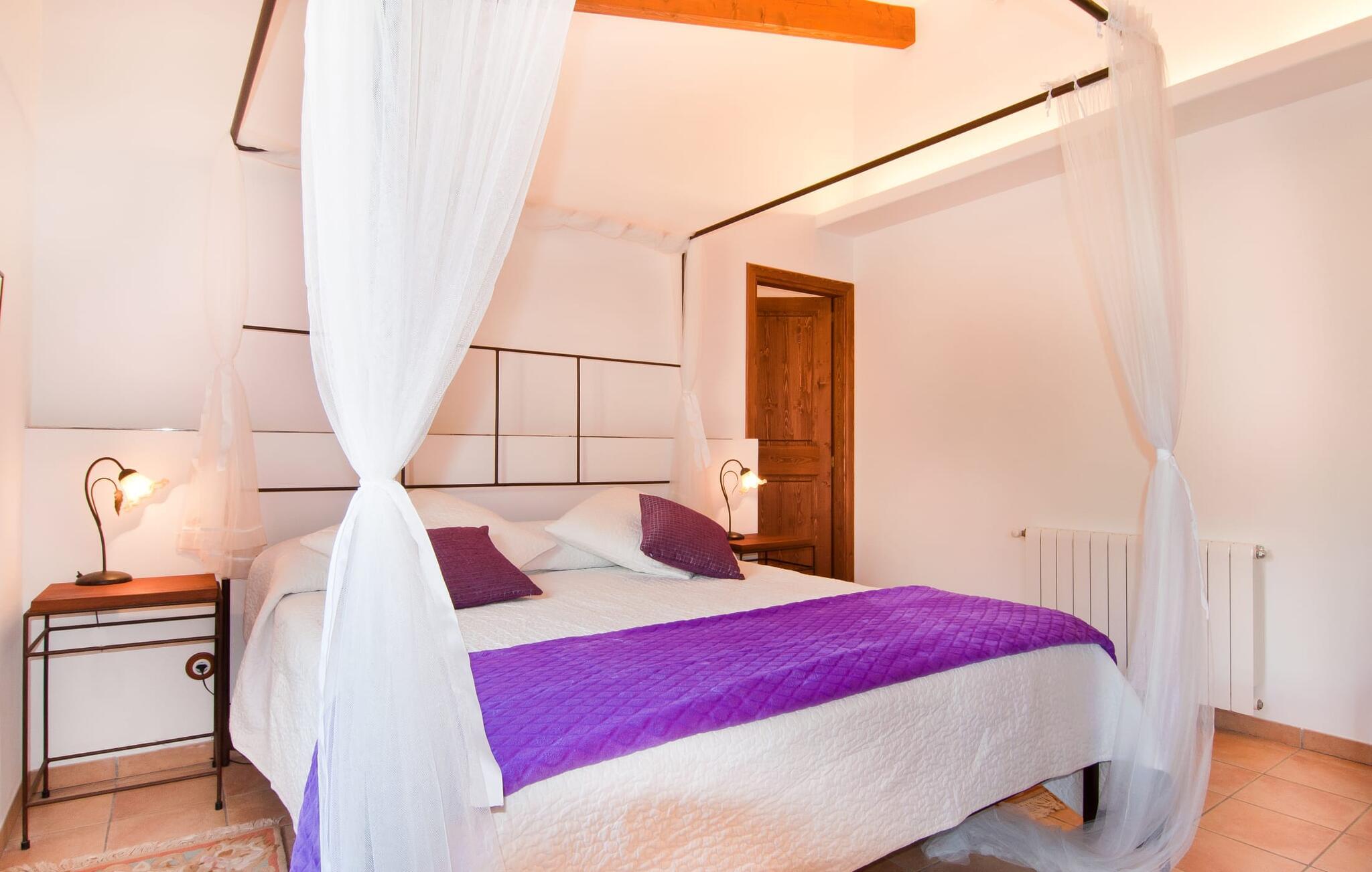 Det, der umiddelbart slår jer, når I træder ind i huset: plads. Plads til at leve. At blomstre. Til jeres helt egen, måske endda udvidede radius. Mellem moderne synlige bjælkelofter over, matchende terracotta-fliser på gulvet og lyse hvide vægge rundt omkring, er der udsøgte møbler, der muliggør en absolut kultiveret livsstil. Rummelige opholdsrum præger huset og giver det et meget individuelt præg, som frihedsglade mennesker især sætter pris på. I kan nemt rejse hertil med en større gruppe uden at skulle bekymre jer om nok privatliv. Da boligarealet er fordelt på to etager, forstærkes indtrykket af rummelighed yderligere. Hvis I har lyst, kan I spise jeres måltider alene indendørs tre forskellige steder: enten i en af de fint indrettede spisepladser. Eller i det enorme køkken, et fantastisk stort spisekøkken, hvor der kan laves mad og derefter nydes sammen. På køligere aftener kan I finde jer godt tilpas her ved pejsen. Det æstetiske tekøkken, delvist dekoreret med marmor og bygget i en L-form, byder på alt, hvad I behøver til hverdagsbrug i en højkvalitets form og form. Der medfølger også en filterkaffemaskine. Sofazoner er fordelt i hele huset, lige så generøst som spisebordene. De tilbyder plads til at slappe af, hvad enten det er at læse, have dybdegående samtaler eller se tv på stedet med fladskærms-tv. Elegante og romantisk indrettede soveværelser inviterer jer til at få en afslappende nattesøvn. I denne atmosfære kan I slappe dybt af og finde jeres center uden nogen irriterende klokker og fløjter. Træ, masser af hvidt og et par smart placerede strejf af farve fremkalder en drømmende atmosfære. I alt er der tre værelser med dobbeltsenge og to værelser med to enkeltsenge. Indretning af høj kvalitet og moderne design findes på badeværelserne, hvoraf det ene er et luksuriøst en-suite badeværelse. Et strygejern og en hårtørrer er til rådighed i huset, så I behøver ikke at tage dem med.
