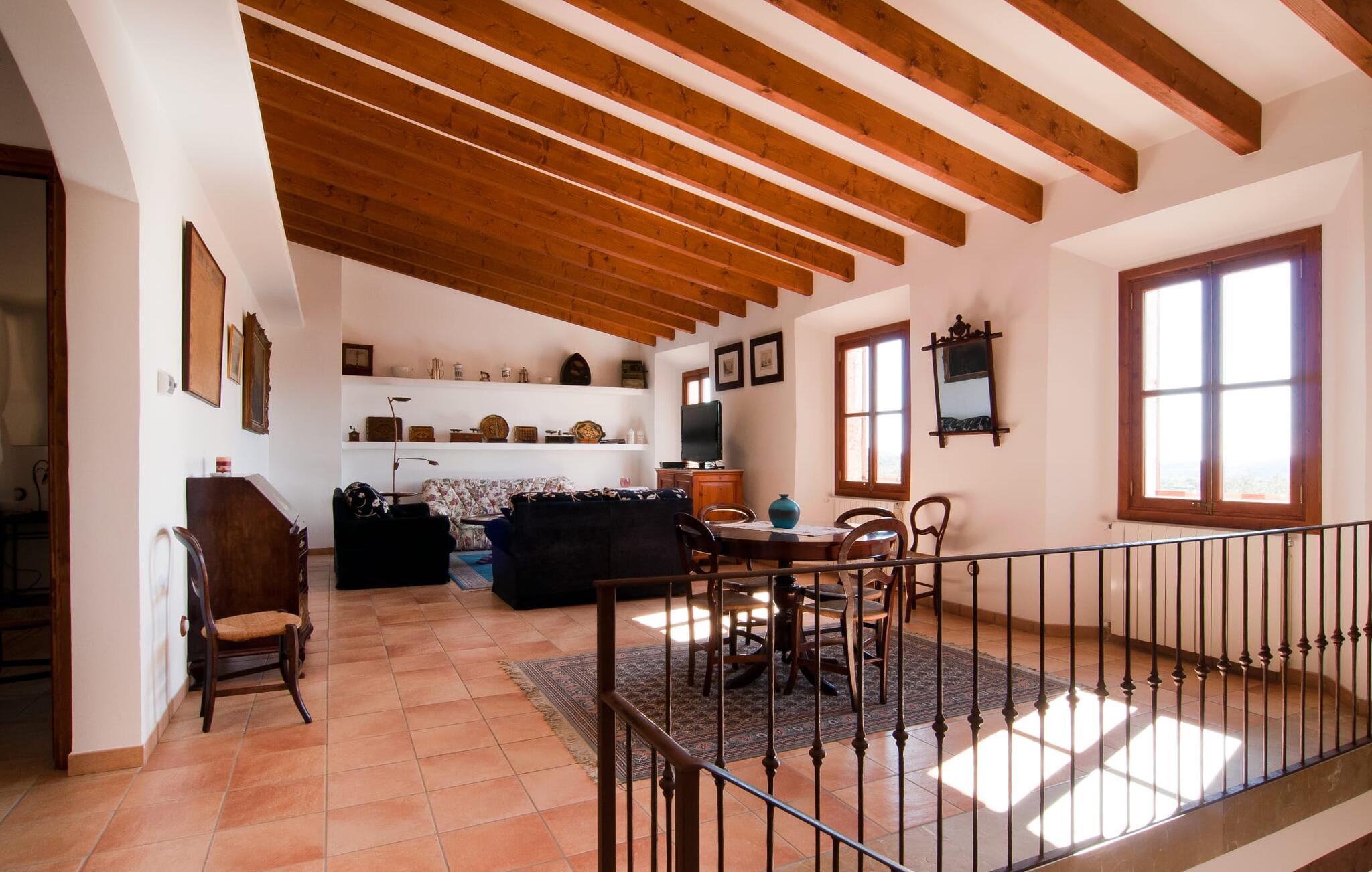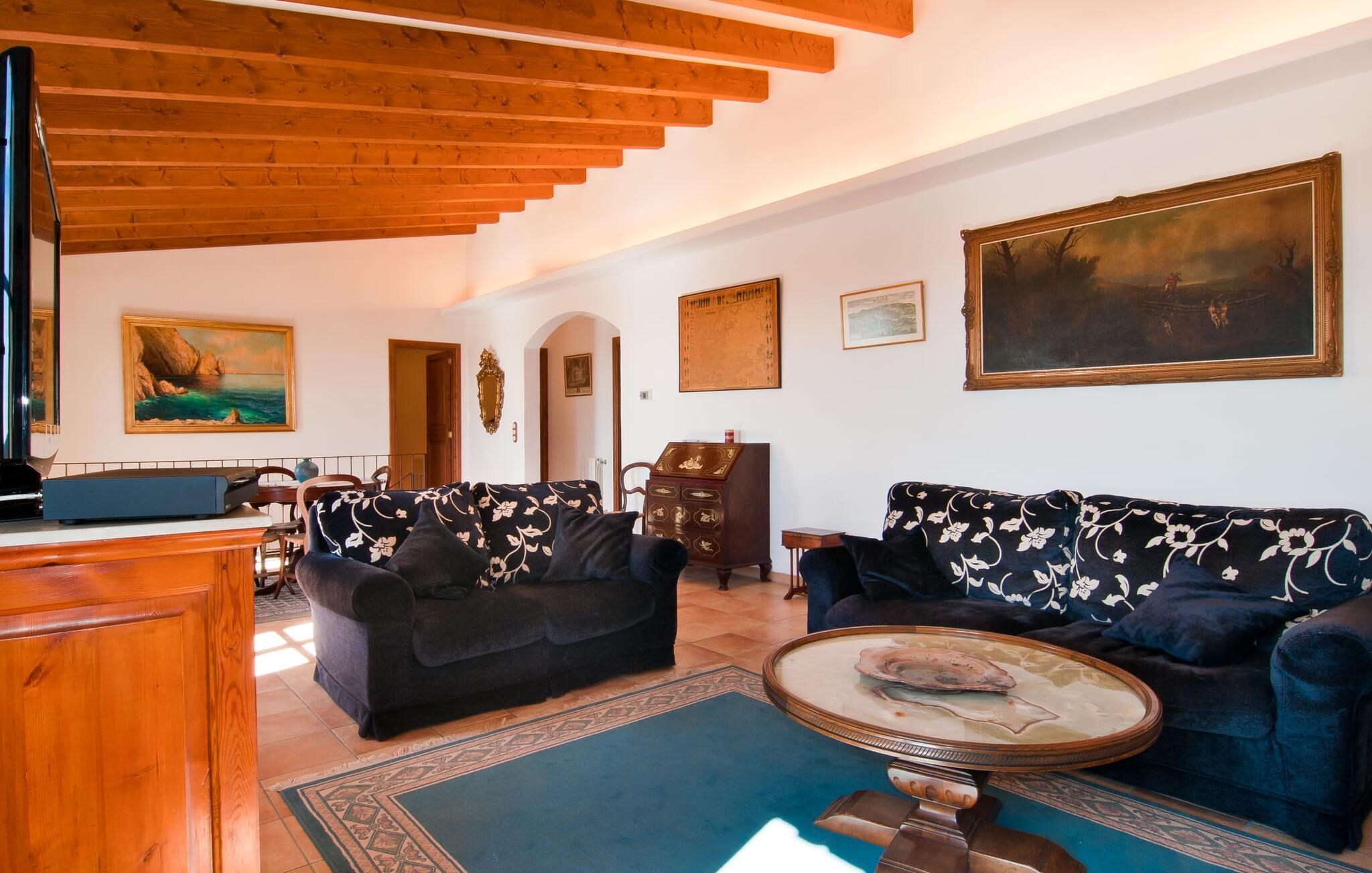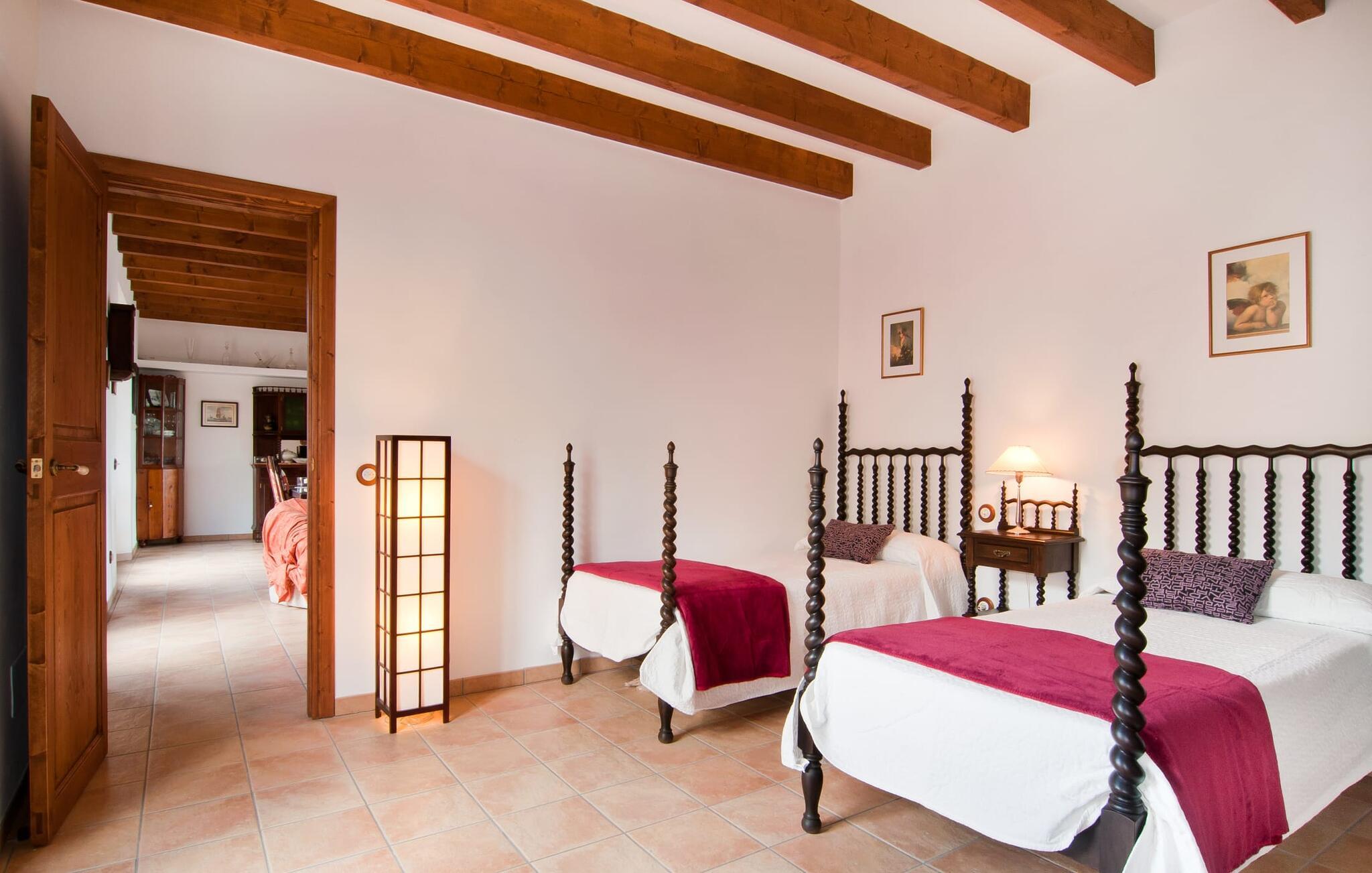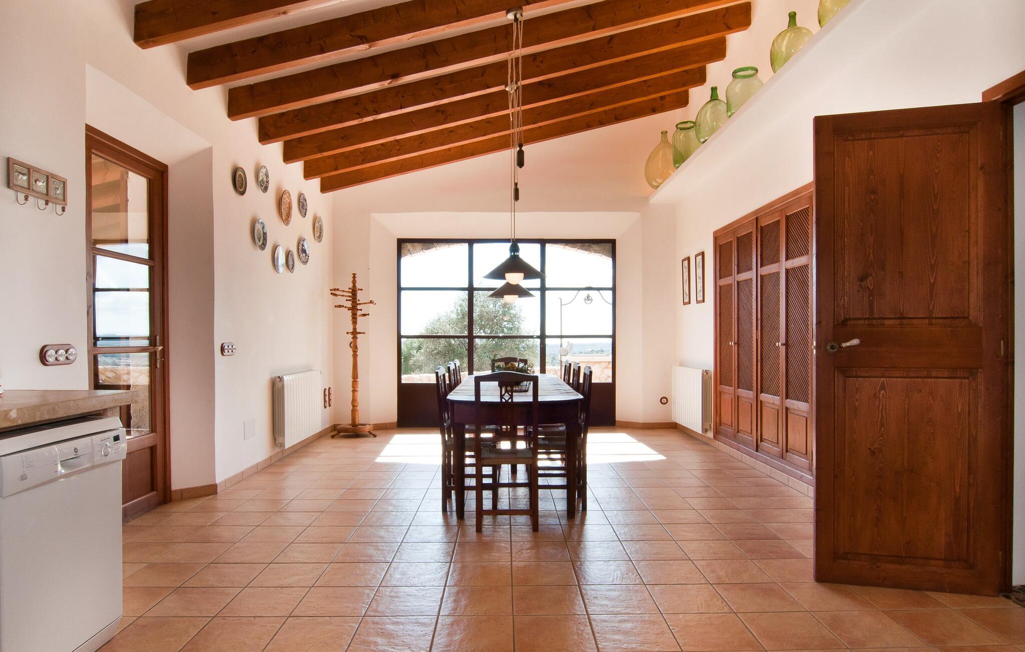 Det, der umiddelbart slår jer, når I træder ind i huset: plads. Plads til at leve. At blomstre. Til jeres helt egen, måske endda udvidede radius. Mellem moderne synlige bjælkelofter over, matchende terracotta-fliser på gulvet og lyse hvide vægge rundt omkring, er der udsøgte møbler, der muliggør en absolut kultiveret livsstil. Rummelige opholdsrum præger huset og giver det et meget individuelt præg, som frihedsglade mennesker især sætter pris på. I kan nemt rejse hertil med en større gruppe uden at skulle bekymre jer om nok privatliv. Da boligarealet er fordelt på to etager, forstærkes indtrykket af rummelighed yderligere. Hvis I har lyst, kan I spise jeres måltider alene indendørs tre forskellige steder: enten i en af de fint indrettede spisepladser. Eller i det enorme køkken, et fantastisk stort spisekøkken, hvor der kan laves mad og derefter nydes sammen. På køligere aftener kan I finde jer godt tilpas her ved pejsen. Det æstetiske tekøkken, delvist dekoreret med marmor og bygget i en L-form, byder på alt, hvad I behøver til hverdagsbrug i en højkvalitets form og form. Der medfølger også en filterkaffemaskine. Sofazoner er fordelt i hele huset, lige så generøst som spisebordene. De tilbyder plads til at slappe af, hvad enten det er at læse, have dybdegående samtaler eller se tv på stedet med fladskærms-tv. Elegante og romantisk indrettede soveværelser inviterer jer til at få en afslappende nattesøvn. I denne atmosfære kan I slappe dybt af og finde jeres center uden nogen irriterende klokker og fløjter. Træ, masser af hvidt og et par smart placerede strejf af farve fremkalder en drømmende atmosfære. I alt er der tre værelser med dobbeltsenge og to værelser med to enkeltsenge. Indretning af høj kvalitet og moderne design findes på badeværelserne, hvoraf det ene er et luksuriøst en-suite badeværelse. Et strygejern og en hårtørrer er til rådighed i huset, så I behøver ikke at tage dem med.