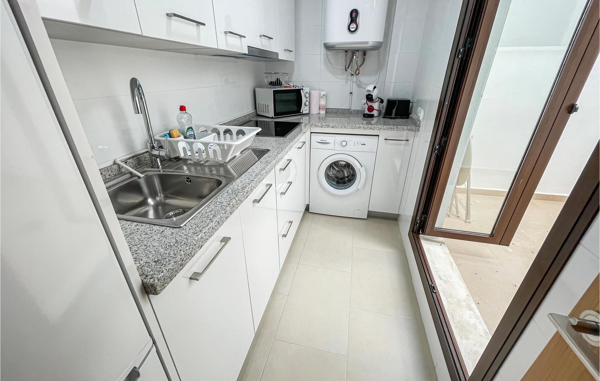Lejligheden venter sine gæster på 1. sal i en bygning med elevator. Med to soveværelser og to ekstra senge i stuen er der plads til op til 6 personer. Interiøret er lyst og moderne. Takket være aircondition kan I altid nyde behagelige stuetemperaturer, selv om sommeren.