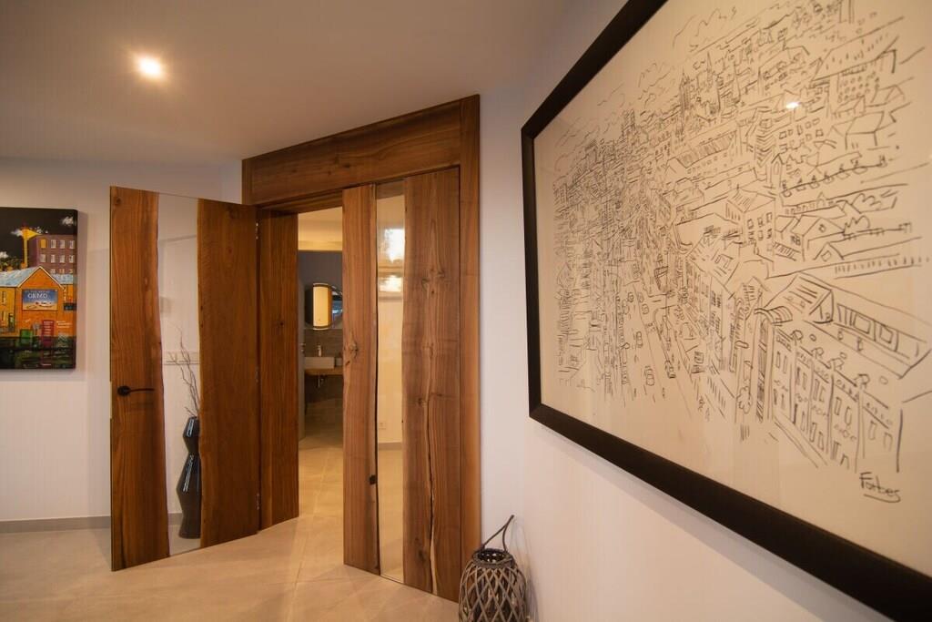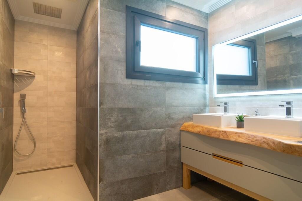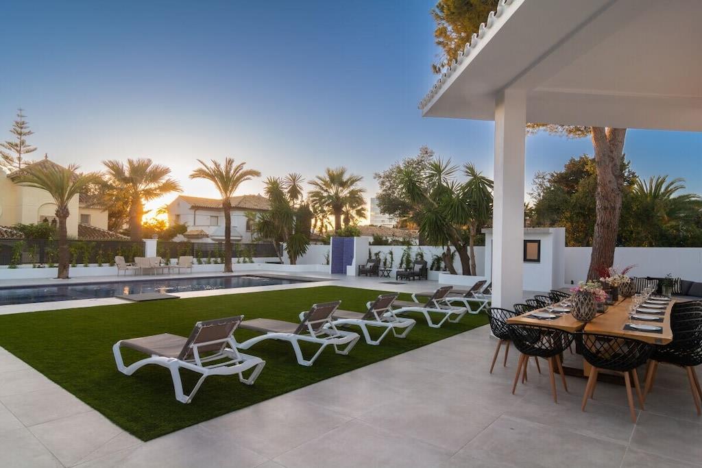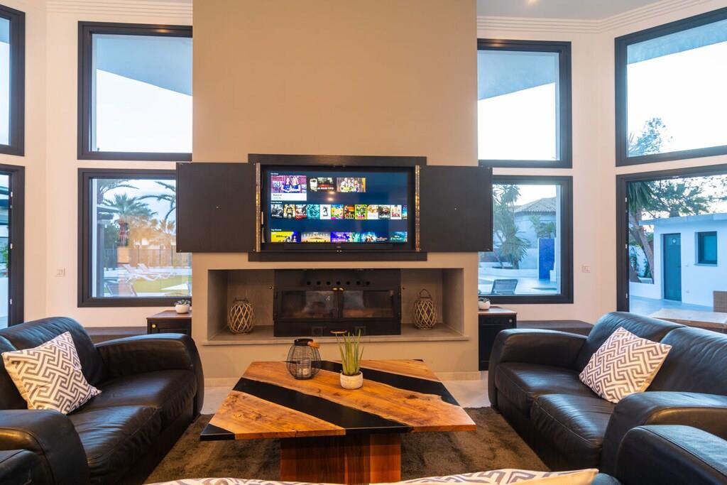 Wenn Sie die wahre Erfahrung eines Urlaubs im sonnenverwöhnten Südspanien machen wollen, wählen Sie einfach unsere wunderschöne Villa mit 5 Schlafzimmern (300m2). Sie können sich in unserem gepflegten Garten (1000m2), der von einer beeindruckenden Pinie und wunderschönen Palmen dominiert wird, entspannen, auf den Sonnenliegen auf der mit Marmor gefliesten Terrasse liegen, die südliche Sonne rund um den beheizten Pool (10mx5m) mit Jacuzzi (2,4mx2,4m) genießen, eine unvergessliche Zeit mit Ihrer Familie und Freunden verbringen, indem Sie den Gas- oder Holzkohlegrill und das mittlere Feuer auf einer vielseitigen Terrasse (120m2) nutzen, die sich an jedes Wetter anpassen kann. Der außergewöhnliche 4 Meter lange Esstisch aus massivem Holz, der von einem örtlichen Holzschnitzer nach Maß gefertigt wurde, bietet Platz für 18 Gäste. Die gesamte Außeneinrichtung wurde sorgfältig ausgewählt, um den Raum auszufüllen und jede Menge Komfort zu bieten. Und es gibt noch mehr! ~ Innen Diese wunderschöne Villa (300m2), die auf zwei Ebenen gebaut wurde, ist mit gutem Geschmack entworfen und stilvoll eingerichtet. Der Haupteingang führt in eine Halle, die Zugang zu den verschiedenen Ebenen der Villa gibt. Sie werden sofort die schönen hölzernen Accessoires bemerken: Türrahmen, Türen, Tische, Arbeitsplatten und Waschbeckenhalter. Sie sind alle von einem lokalen Künstler handgefertigt und unterstreichen das exquisite Design der Villa. Im Erdgeschoss befinden sich ein geräumiges und helles Wohnzimmer mit einer doppelten Deckenhöhe, drei Schlafzimmer, die Küche und eine Waschküche. Im ersten Stock befinden sich zwei beeindruckende Schlafzimmer mit eigenem Bad und schöner Aussicht. Das spektakuläre Wohnzimmer hat eine doppelte Deckenhöhe, große Fenster, einen schönen Holzkamin, der direkt vor der Sitzecke mit 3 bequemen Ledersofas und einem großen Couchtisch aus Holz steht. Es lädt einfach zum gemütlichen Beisammensein ein! Sie haben hier einen 55-Zoll-Fernseher von Samsung mit direkter Internetverbindung und einer Soundbar, mit der Sie sich mit jeder Streaming-App verbinden können. Ein Essbereich für 8 Personen bietet einen schönen Blick auf den Garten. Der Glastisch bietet bequem Platz für acht Gäste. Vom Wohnzimmer aus haben Sie durch eine große Glasschiebetür Zugang zum Garten. Die Küche ist komplett ausgestattet mit Backofen, Mikrowelle, Ceranfeld, Kühlschrank, Gefrierschrank, Wasserkocher, Toaster, Kaffeemaschine, Mixer und Geschirrspüler. Sie haben kochendes Wasser für Tee in der Küche und einen Filter für Trinkwasser. Sie haben hier auch einen 32-Zoll-Fernseher. Die Küche hat einen Frühstückstisch für 4 Personen und bietet Zugang zur Waschküche (Waschmaschine, Trockner, Waschbecken). Vom Flur aus haben Sie Zugang zu einer Service-Toilette mit Waschbecken, Spiegel und einem Fenster. Die beiden Hauptschlafzimmer im Erdgeschoss teilen sich ein Familienbadezimmer und können als separate Wohnung genutzt werden, so dass Sie, wenn Sie mit Freunden verreisen, die nötige Privatsphäre genießen können. Das erste Schlafzimmer hat ein großes Doppelbett mit Holzrahmen (180 cm), Nachttische mit Lampen, einen Tisch für den Laptop, einen 50-Zoll-Fernseher, einen Spiegel und große Kleiderschränke mit Licht und Spiegel. Das zweite Schlafzimmer hat zwei Einzelbetten (200cmx90cm) mit einem Nachttisch, einer Lampe, einem Tisch für den Laptop, einem 50-Zoll-Fernseher und großen Kleiderschränken. Es bietet auch einen Ausgang zum Hof. Beide Schlafzimmer haben Moskitonetze an den Fenstern. Beide Schlafzimmer haben einen Ausgang in den Garten. Zwischen den beiden Schlafzimmern befindet sich ein voll ausgestattetes Badezimmer mit einer begehbaren Duschkabine, einer Regenkopfdusche, einem Doppelwaschbecken, einem Spiegel und einem Fenster. Um in das Service-Schlafzimmer zu gelangen, müssen Sie ein paar Stufen hinuntergehen. Dieses Schlafzimmer hat ein Doppelbett (150cmx200cm), Nachttische mit Lampen, einen Holztisch für einen Laptop, einen 50-Zoll-Fernseher, einen Spiegel und einen Einbauschrank. Die Fenster sind mit Moskitonetzen versehen und bieten einen Blick auf den Hof. Das eigene Badezimmer hat eine begehbare Duschkabine, ein Waschbecken, eine Toilette und einen Spiegel. Auf der ersten Etage befindet sich das vierte Schlafzimmer mit zwei Einzelbetten (90cmx200cm), zwei Nachttischen mit Lampen und großen Einbauschränken. Das eigene Badezimmer ist mit einer begehbaren Dusche mit Regenbrause, einem Waschbecken, einem Spiegel und einem Fenster ausgestattet. Ein paar Stufen nach oben gelangt man in das Hauptschlafzimmer mit einem beeindruckenden Kingsize-Bett (180 cm x 200 cm) mit einem handgefertigten Holzrahmen. Es gibt Nachttische mit Lampen, ein bequemes Sofa, einen Tisch für den Laptop, einen Spiegel, einen 32-Zoll-Fernseher, einen kleinen Tisch und Fenster, die den Blick auf den Hof und die Siedlung freigeben. Das eigene Badezimmer hat eine Badewanne, eine begehbare Dusche, Fenster, ein Doppelwaschbecken auf einem Holzständer und einen großen Spiegel. Beide Schlafzimmer im ersten Stock haben Moskitonetze an den Fenstern. Alle Fernseher sind von Samsung und verfügen über verschiedene Apps zum Streamen. Das Glasfasernetz garantiert Ihnen eine schnelle und zuverlässige Internetverbindung. ~ Terrassen/Garten Bei dem herrlichen Wetter in Marbella werden Sie sicher die meiste Zeit im 1000 m2 großen Garten oder auf der 120 m2 großen Terrasse verbringen oder einfach nur am Pool (10m x 5m) mit Jacuzzi (2,4m x 2,4m) liegen. Das Outdoor-Musiksystem, das Sie über Streaming-Apps von Ihrem Telefon aus steuern können, lädt Sie ein, nach draußen zu gehen und die Seele baumeln zu lassen. Der Garten dieser Villa ist ein gepflegter, aber sehr naturnaher Bereich. Er verfügt über Terrassen mit Marmorfliesen, aber auch über eine beeindruckende Pinie und Palmen, unter denen Sie den wahren Charme der südspanischen Flora genießen können. Hier haben Sie verschiede