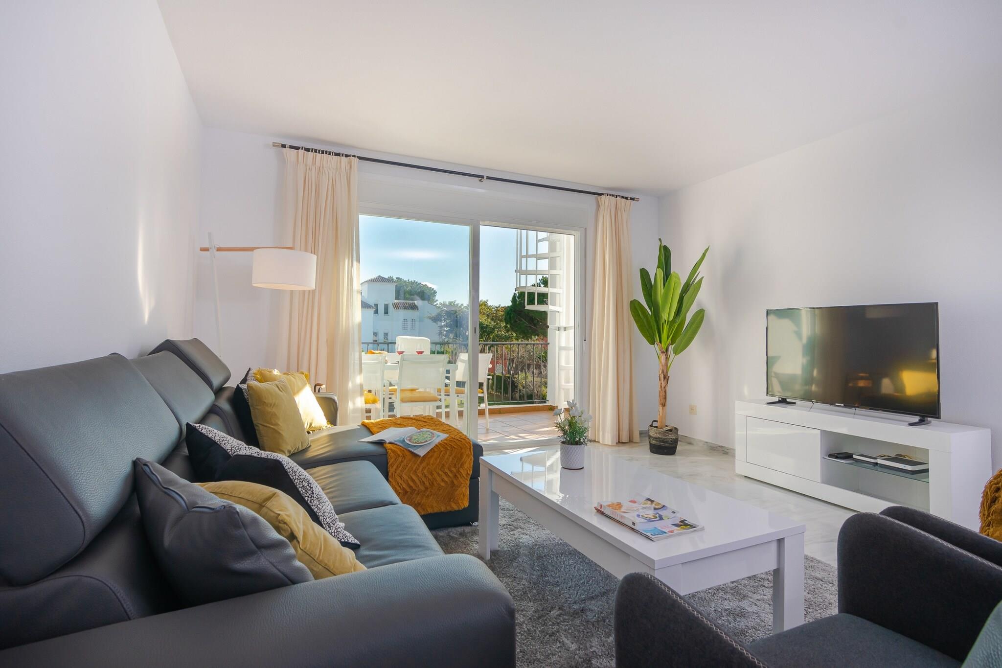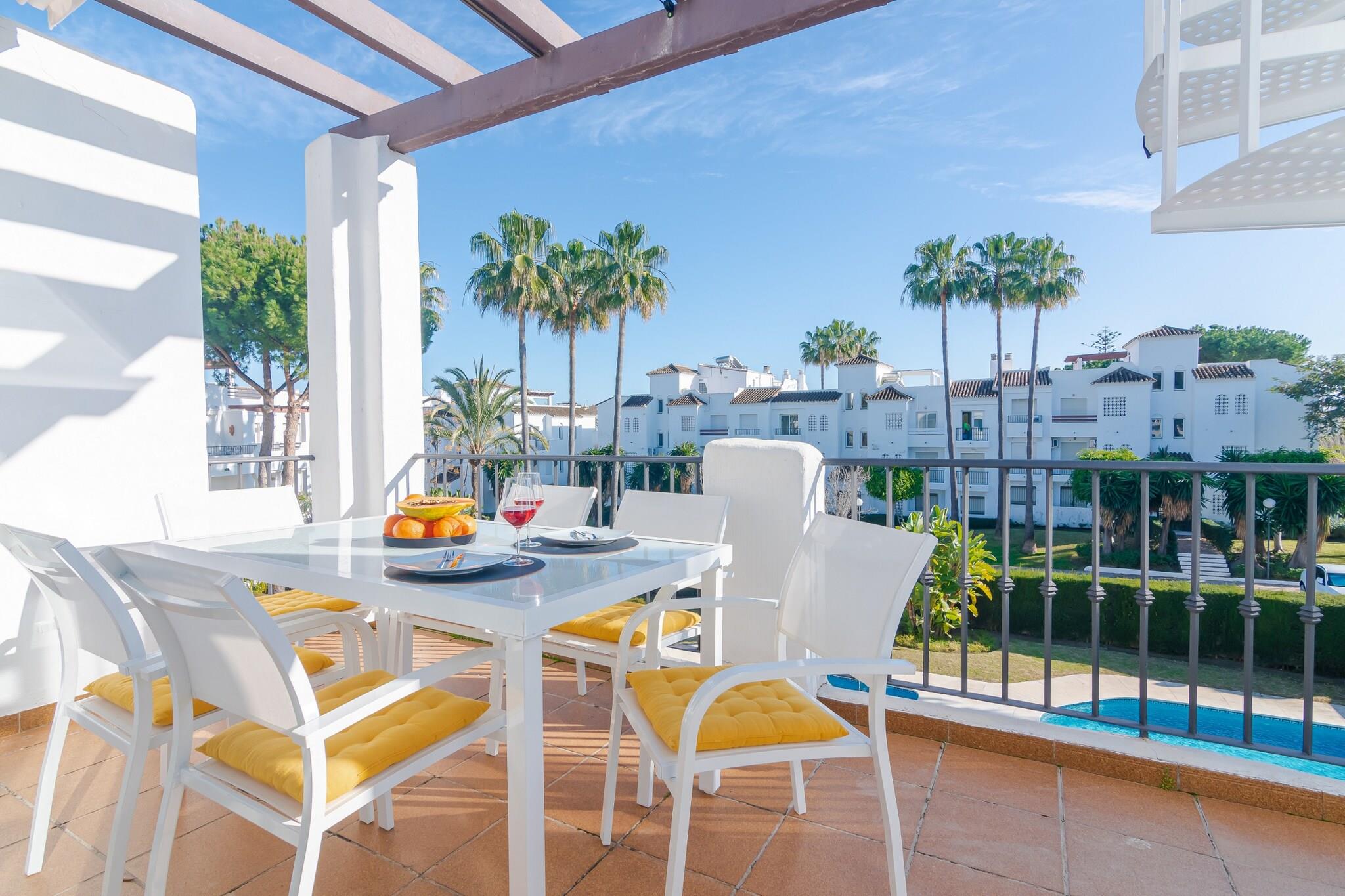 Denne moderne penthouse ved stranden i Estepona tilbyder stilfuld indkvartering til op til seks gæster og er ideelt placeret kun en kort gåtur fra det gyldne sand på Cancelada og kyststierne langs Spaniens Costa del Sol. Ejendommen kombinerer moderne design med lyse, åbne opholdsrum – hvilket gør den til det perfekte valg for gæster, der ønsker havbrise, nem adgang til stranden og udendørsliv alt sammen på ét sted. Når du træder ind, finder du et fuldt udstyret, moderne køkken, der åbner ud mod en komfortabel stue og spiseplads til seks personer, indrettet med moderne møbler og rigeligt med naturligt lys. Tre velindrettede soveværelser giver mulighed for fleksible gruppeophold: en master-suite med dobbeltseng og eget badeværelse med brusebad, et andet soveværelse med dobbeltseng og et tredje soveværelse med to enkeltsenge. Et fælles badeværelse sikrer daglig bekvemmelighed, mens aircondition og gratis Wi-Fi hjælper med at holde dig komfortabel under hele dit ophold. Penthouse-lejlighedens udendørsarealer er et fremtrædende træk. Fra stuen fører skydedøre ud til en terrasse, der er indrettet til udendørs spisning, perfekt til måltider i det fri eller drinks om aftenen. En trappe fører op til den private tagterrasse, hvor fire liggestole står klar og tilbyder et førsteklasses sted at nyde solen eller den panoramiske havudsigt efter en dag på stranden. Denne penthouse ligger i et lukket boligområde med anlagte haver og en fælles swimmingpool og placerer dig inden for rækkevidde af Esteponas strande, strandklubber og spisesteder, samtidig med at den ligger en kort køretur fra de livlige centre i San Pedro og Marbella. Med sin blanding af indendørs komfort og indbydende udendørsarealer er denne ejendom et fremragende udgangspunkt for at nyde den afslappede charme ved Costa del Sol.
