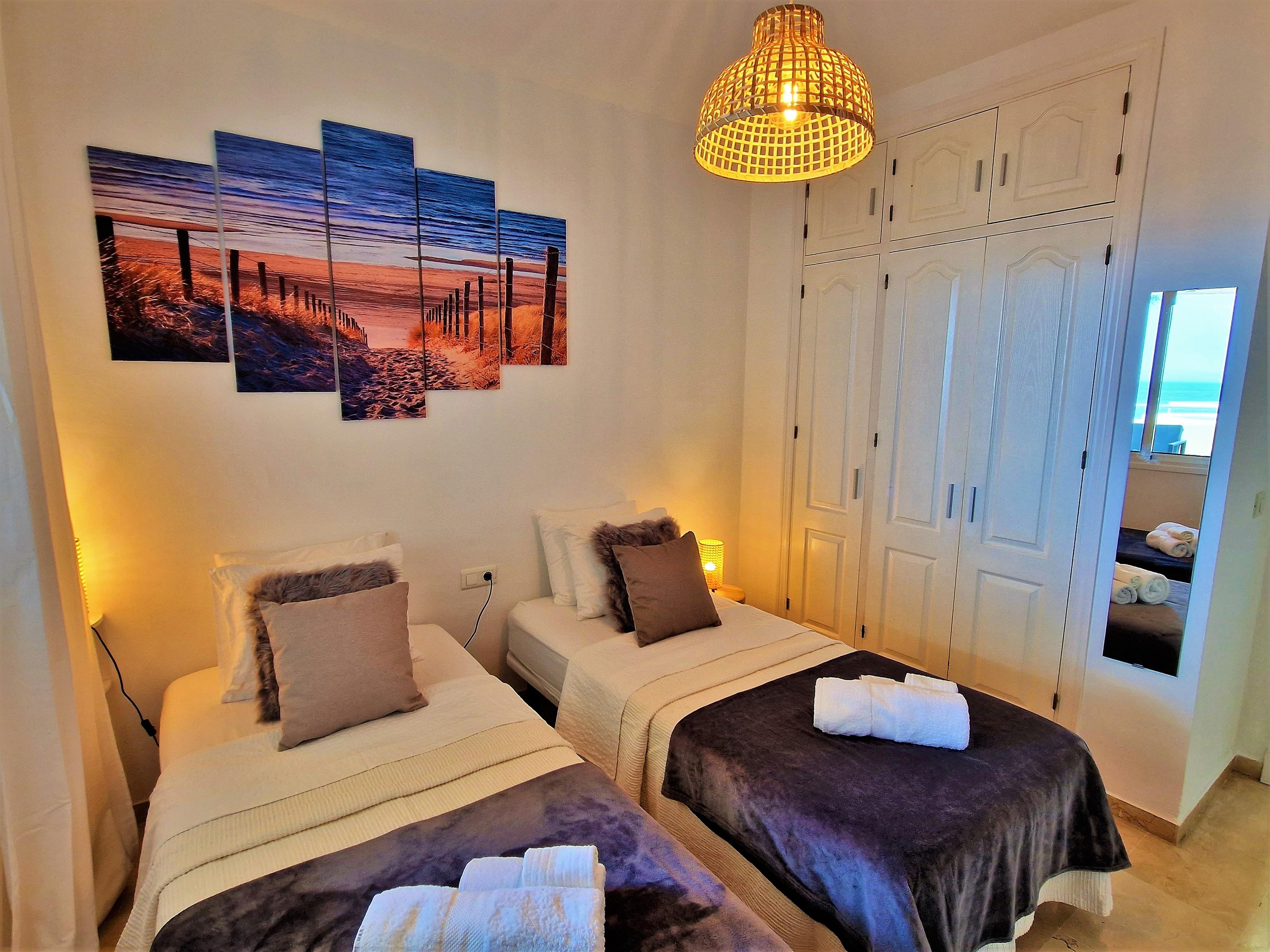 Das zweite Schlafzimmer bietet 2 Einzelbetten, direkte Meersicht und verfügt über ein Bad im Gang. Dieses Schlafzimmer bietet einen Schreibtisch mit Stuhl und einen grossen eingebauten Kleiderschrank.
