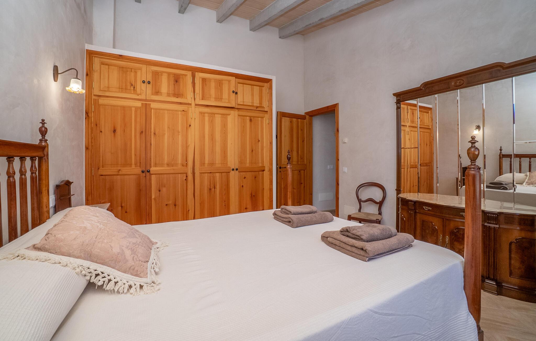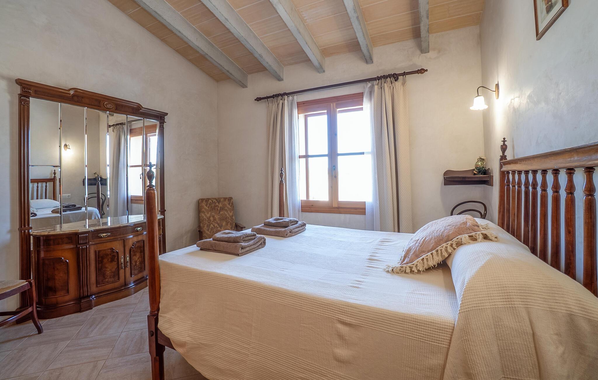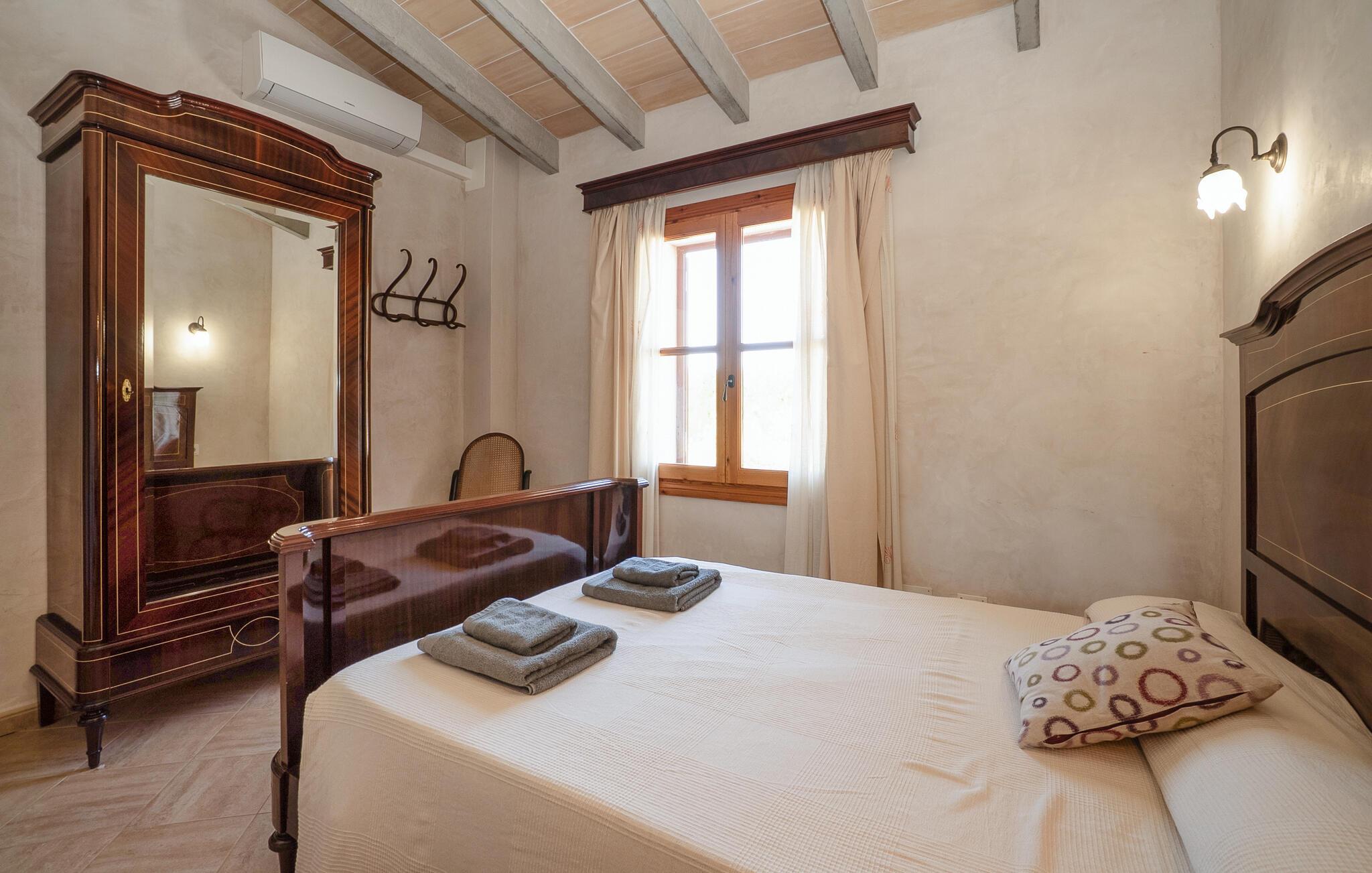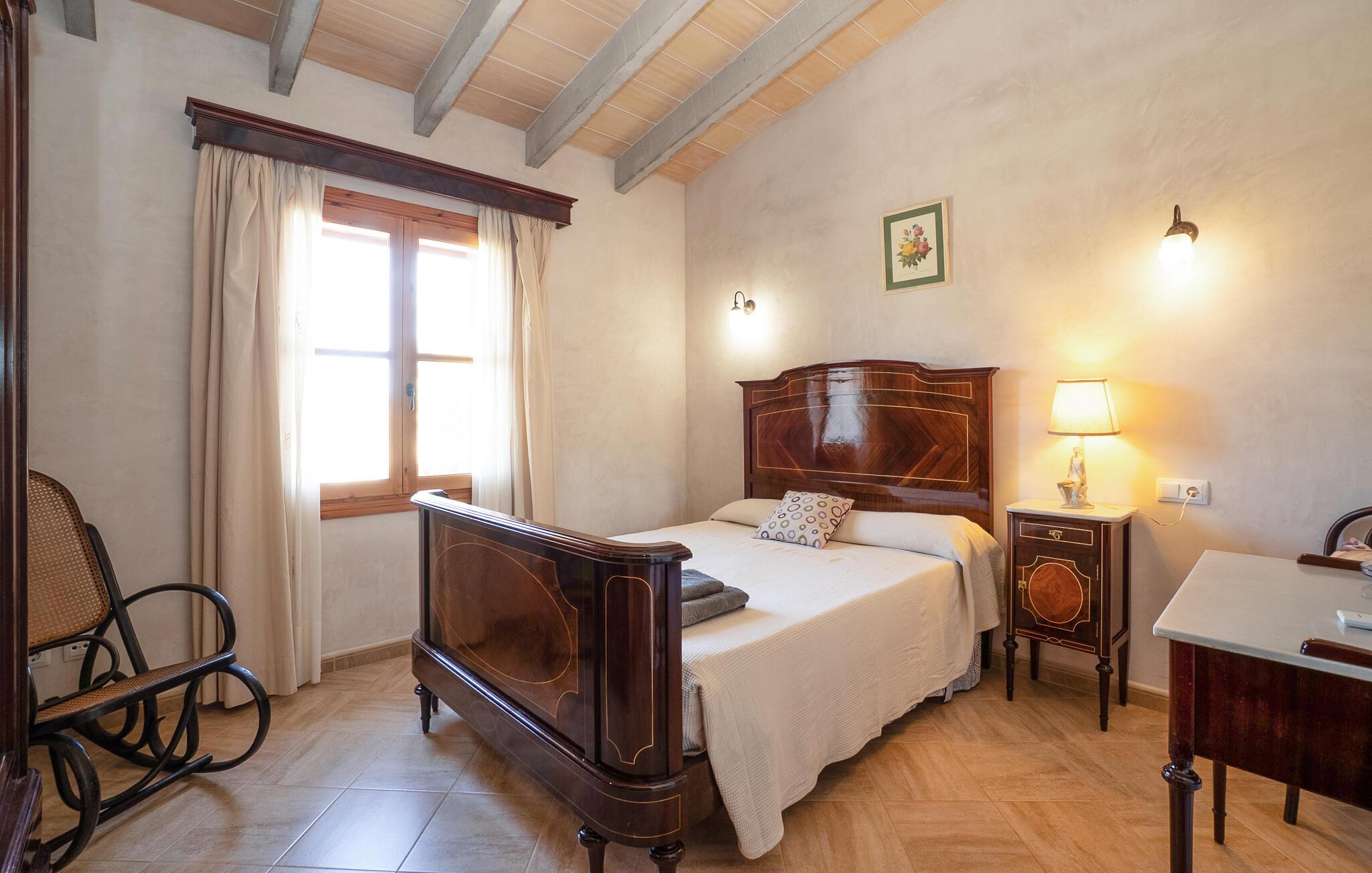 Dette indbydende feriehus i hjertet af Mallorca emmer af en varm hygge, der straks vil få jer til at føle jer hjemme. De kærlige møbler og rustikke elementer i stenhuset skaber en autentisk atmosfære. Tilbered måltider sammen i det veludstyrede køkken, nyd dem på den skyggefulde veranda og slap derefter af med en filmaften i den hyggelige stue. Den store have med pool og liggestole er det ideelle sted at nyde middelhavslandskabet.