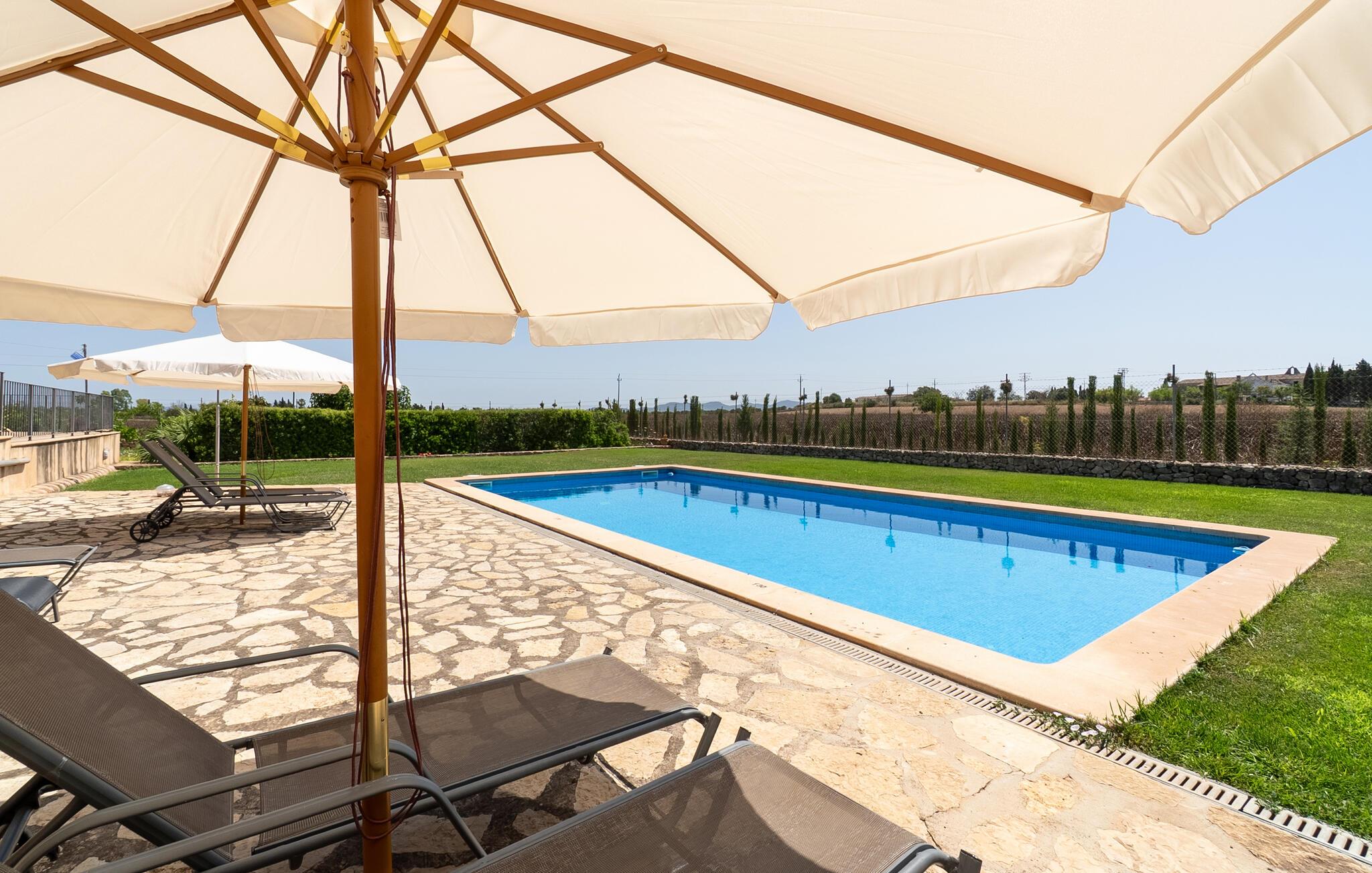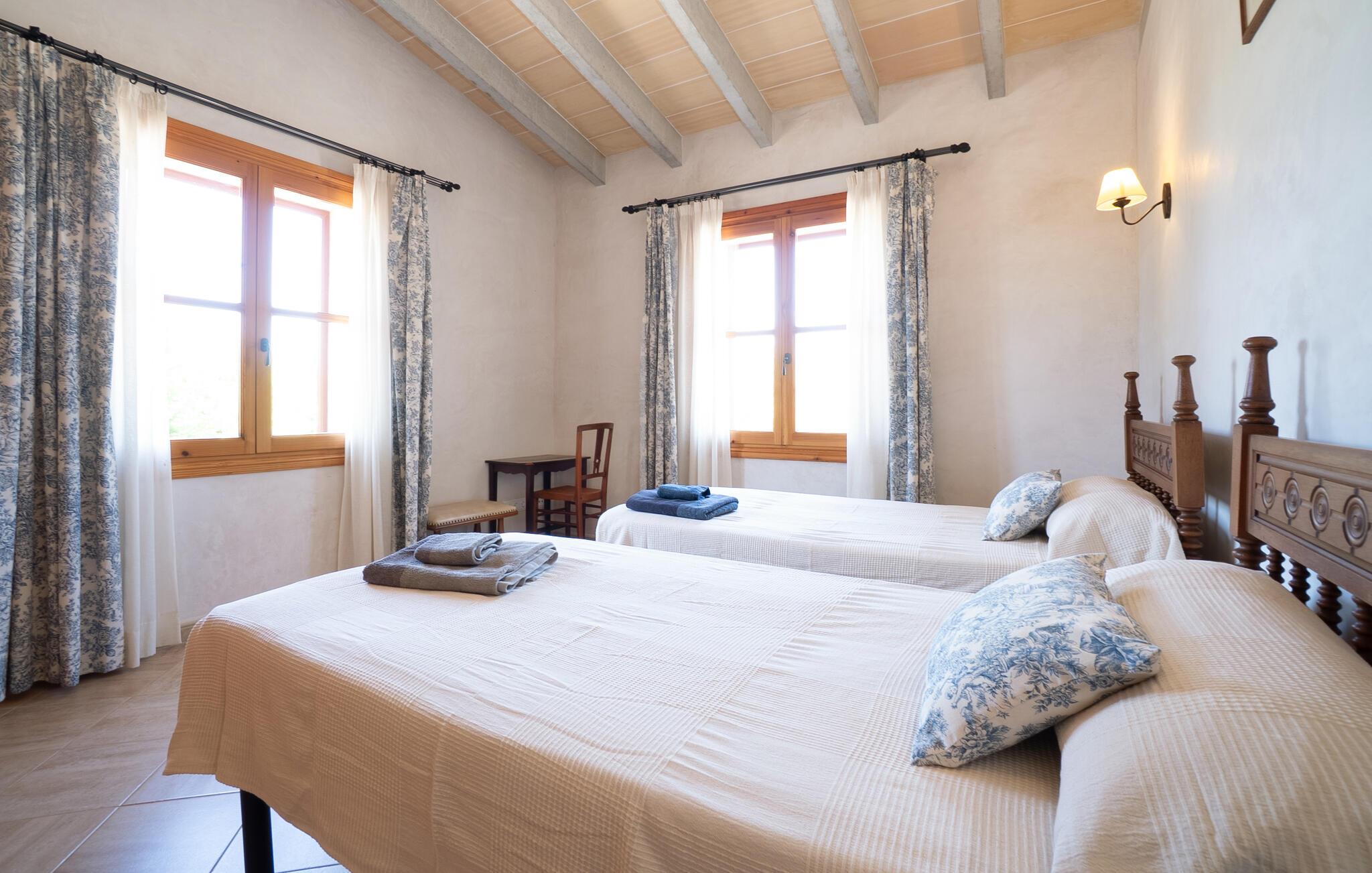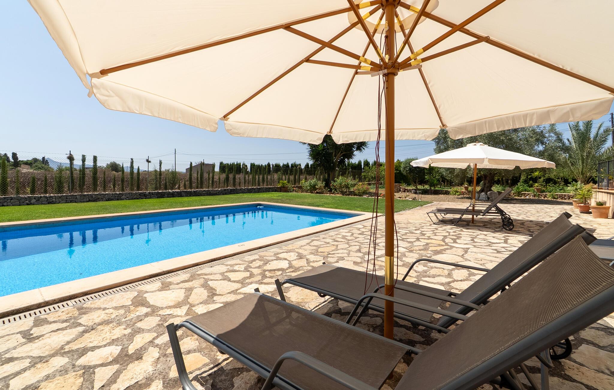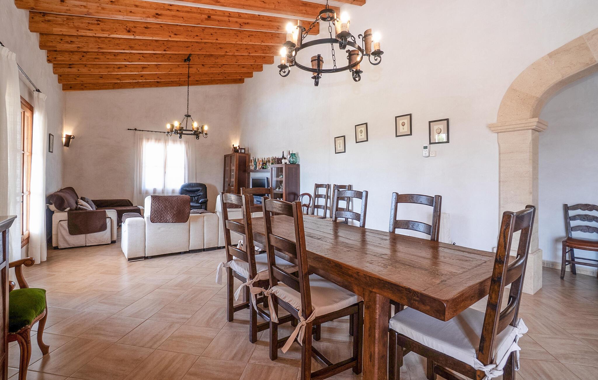 Dette indbydende feriehus i hjertet af Mallorca emmer af en varm hygge, der straks vil få jer til at føle jer hjemme. De kærlige møbler og rustikke elementer i stenhuset skaber en autentisk atmosfære. Tilbered måltider sammen i det veludstyrede køkken, nyd dem på den skyggefulde veranda og slap derefter af med en filmaften i den hyggelige stue. Den store have med pool og liggestole er det ideelle sted at nyde middelhavslandskabet.