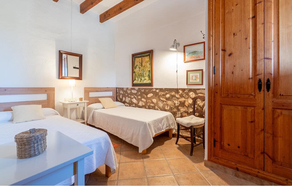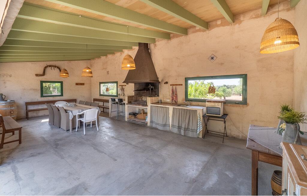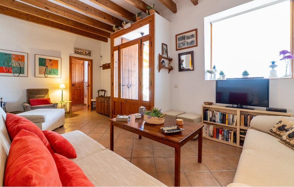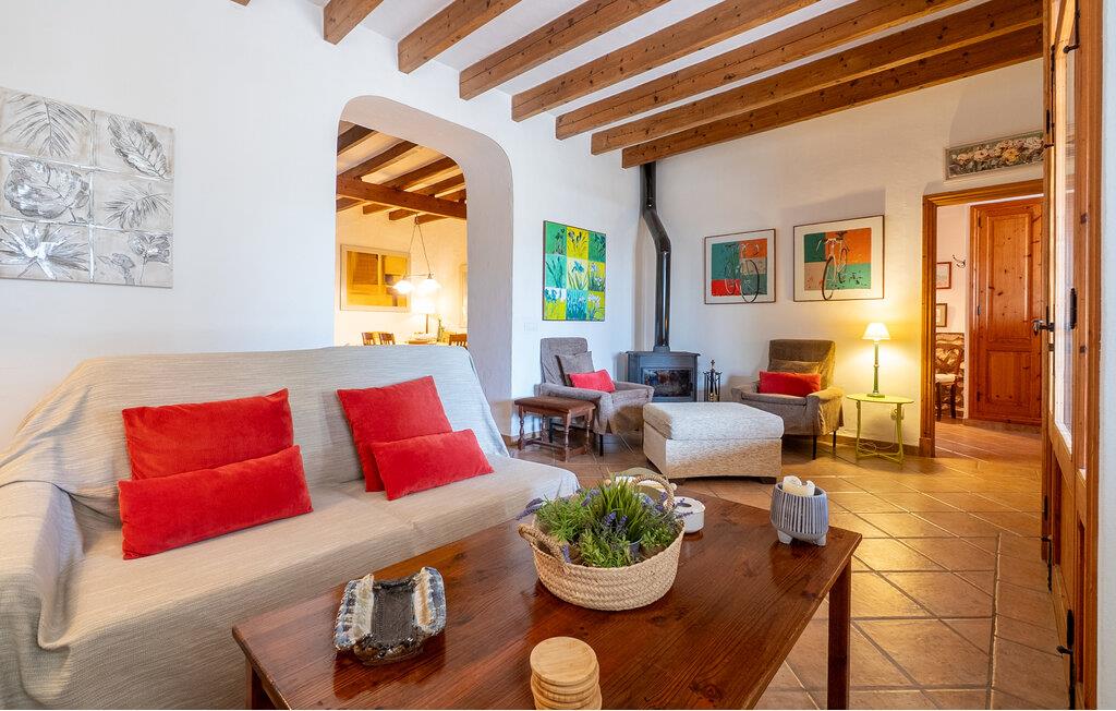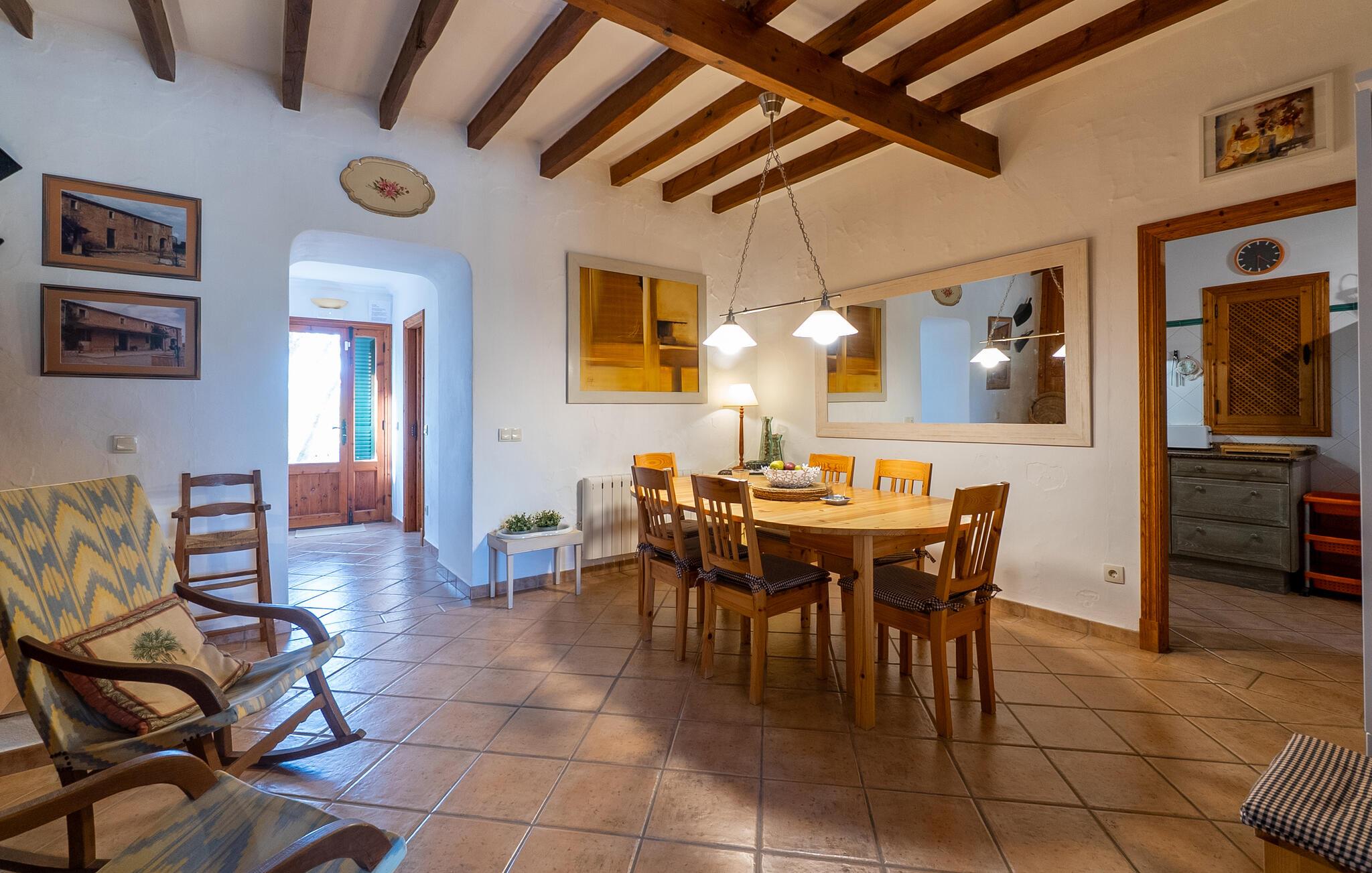 Velkommen til denne fortryllende finca, hvor en afslappende pause fra hverdagen venter jer. Her skaber rustikke træbjælker, traditionelle mallorcanske møbler og hyggelig belysning en autentisk stemning og en hyggelig atmosfære. Glæd jer til hyggelige måltider i den indbydende spiseplads, stemningsfulde aftener ved brændeovnen og afslappende timer i den charmerende stue.