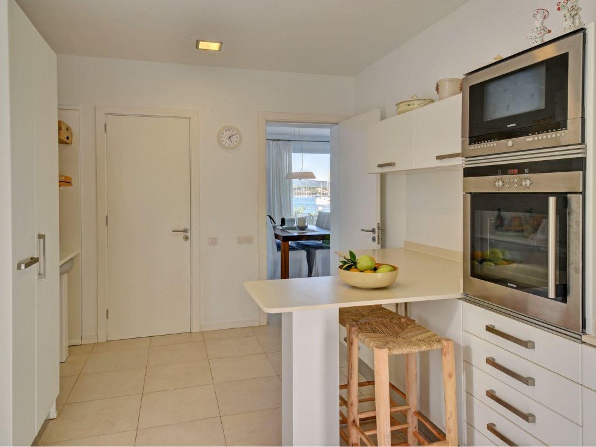 The long, corner terrace offers magnificent views over the water and the harbour of Porto Colom. Beautiful outdoor furniture and a mobile barbecue invite you to enjoy long, relaxed and cosy dinners. The rectangular pool (10 m x 4 m, depth min. 1.10 m, max. 1.70 m) below the terrace is fenced and therefore child-proof. The spacious lawn next to it invites you to sunbathe.