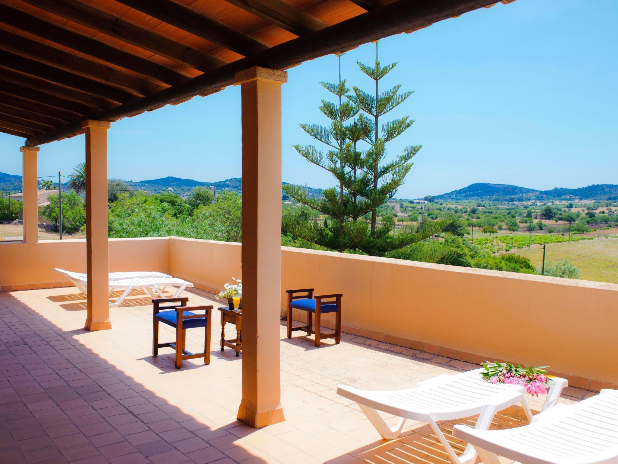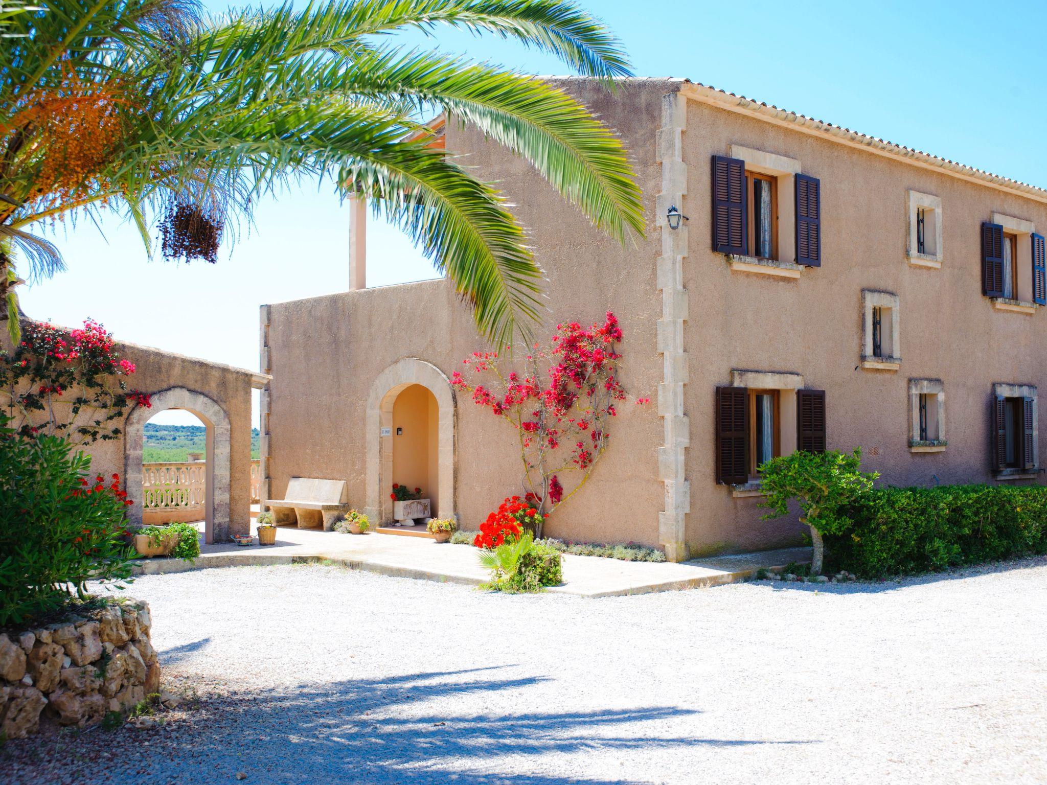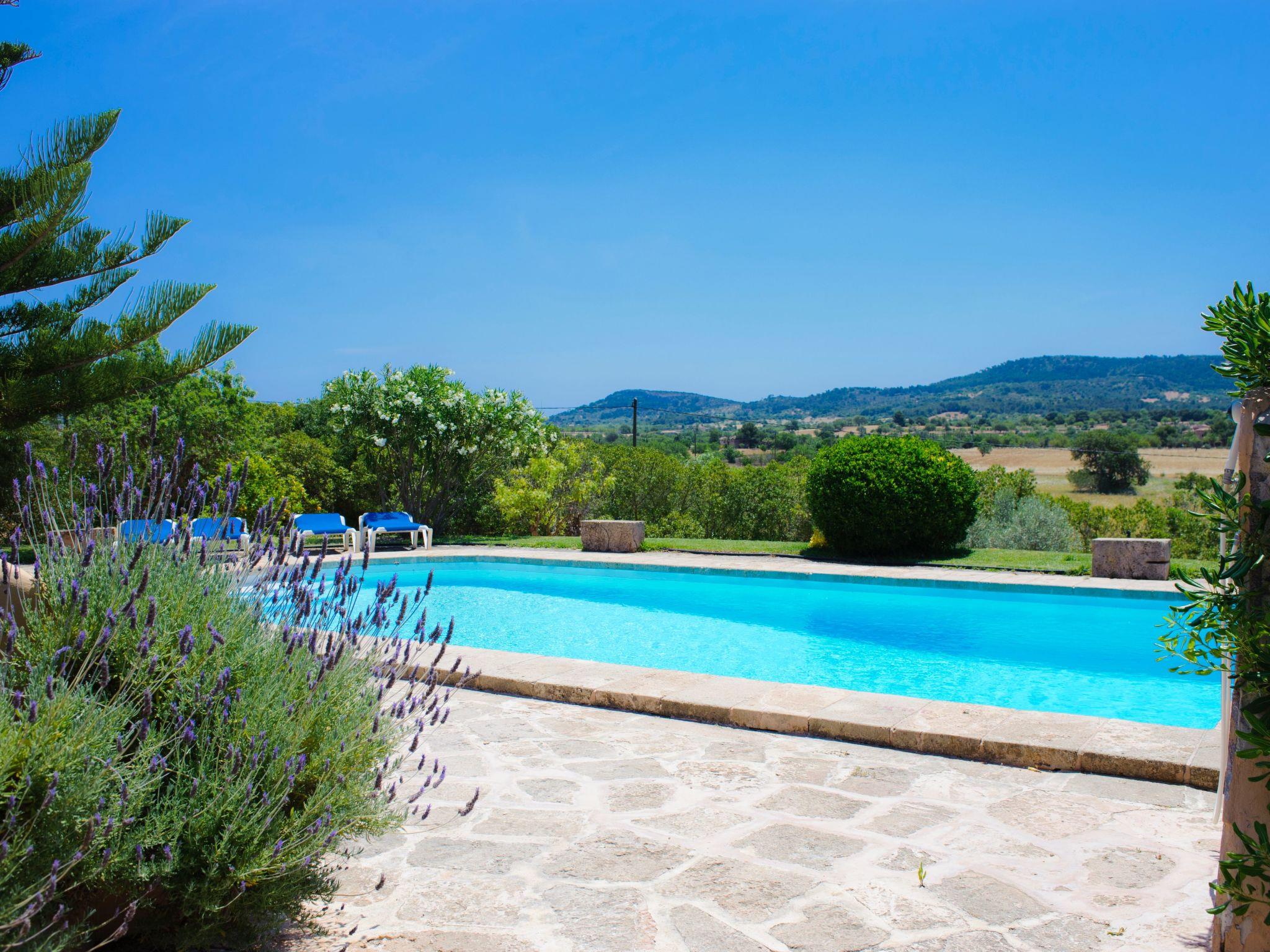 The finca "Era des Pou" is a typical country farmhouse, nestled in a 5500 m² plot of land, 1000 m² of which is laid out as a garden with bougainvillea, hibiscus, palm trees and oleander. Large wooden doors lead from the partially covered terrace with brick barbecue into the large living/dining room. The room is furnished for 8 people. The kitchen is equipped for holiday use. There is also a bedroom on the ground floor with a double bed and en-suite bathroom with shower. Bed and en-suite bathroom with shower and a twin bedroom with separate bathroom. On the upper floor there are two further bedrooms, each with 2 single beds, and a separate bathroom. The large partially covered terrace allows a great view over the garden and pool and the landscape spreading out in front of you.