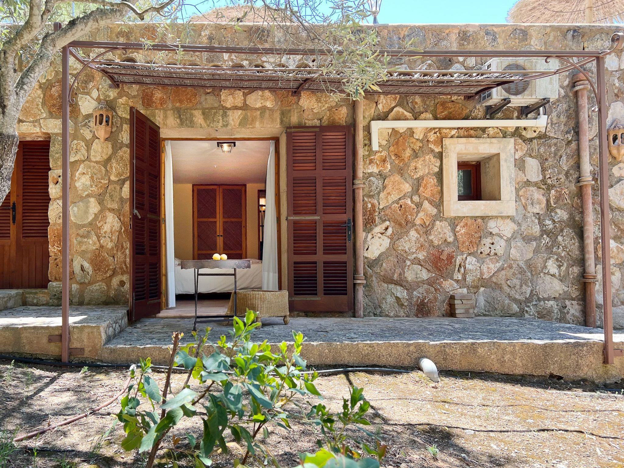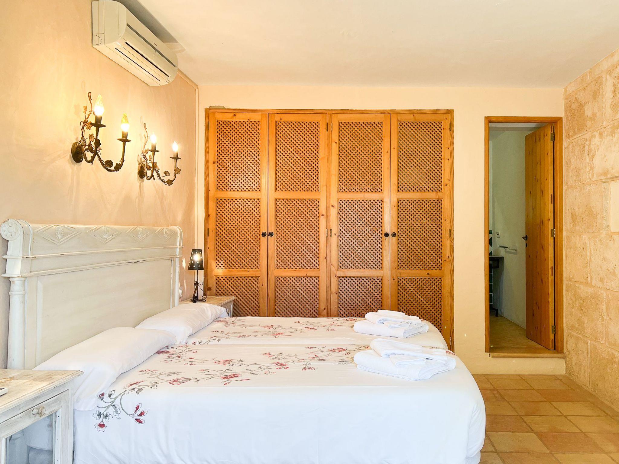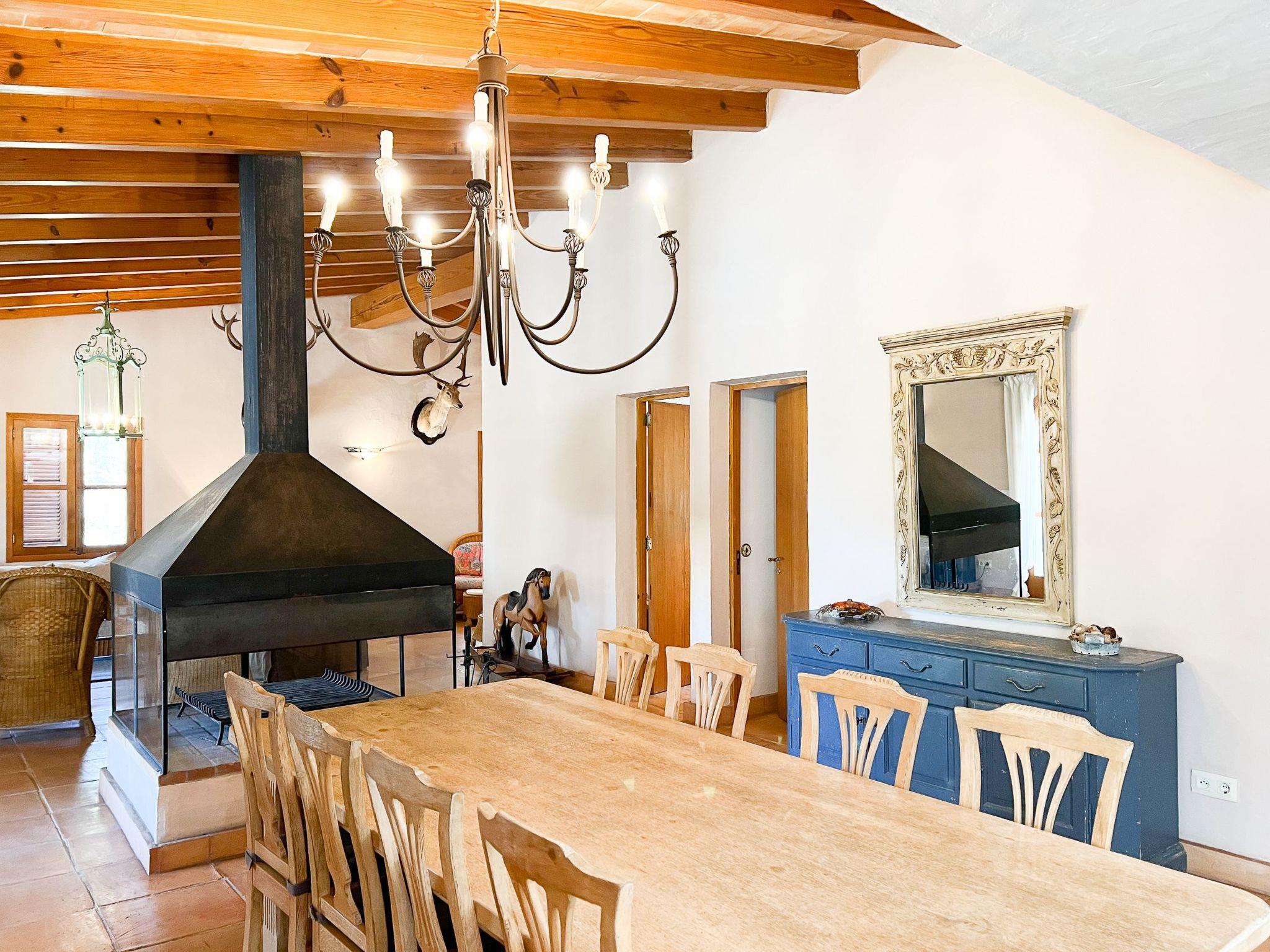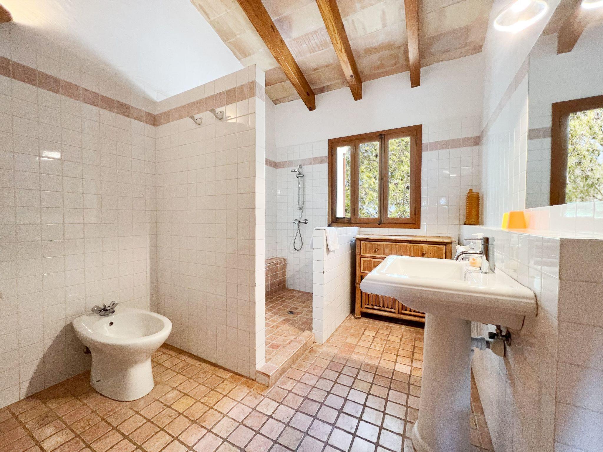 Finca Binifarda Dor is a marvellous country house with a typical country house design, such as high ceilings with wooden beams. The spacious house has plenty of natural light. The main house houses the kitchen, the living and dining area and 2 bedrooms. The other three bedrooms are located separately near the pool and from the outside a few steps lead us into the main house. On the ground floor there is a large open-plan area where the kitchen and the living/dining room are located. The furnishings are in a rustic style. The kitchen has a cooking island and is well equipped. A large dining table and a comfortable seating area invite you to linger. There is a great fireplace between the dining and living area. Next to the kitchen is the utility room and on the ground floor there is a bedroom for 1 person with access to the outside and a separate shower. A narrow wooden staircase leads to the upper floor with a double bed and an en-suite bathroom with a large corner bath. The bedroom can also be accessed from the outside. The other three bedrooms are located separately from the house on a lower level with access from the outside. There is one double bedroom with en-suite shower room and two twin bedrooms each with en-suite bathrooms. The bedroom on the first floor and the three separate bedrooms have hot/cold air conditioning with fixed and limited hours of use.