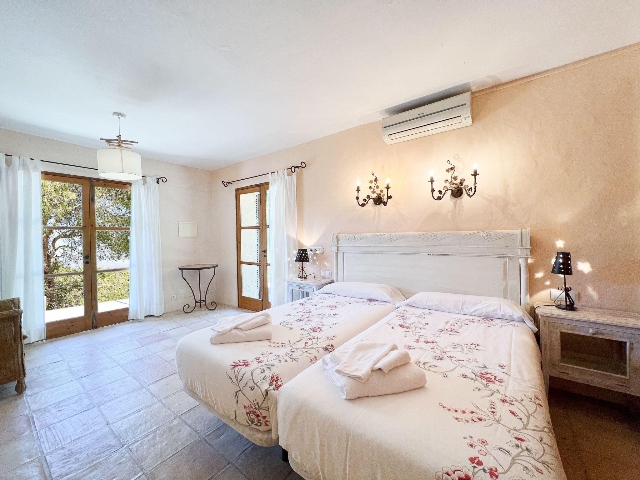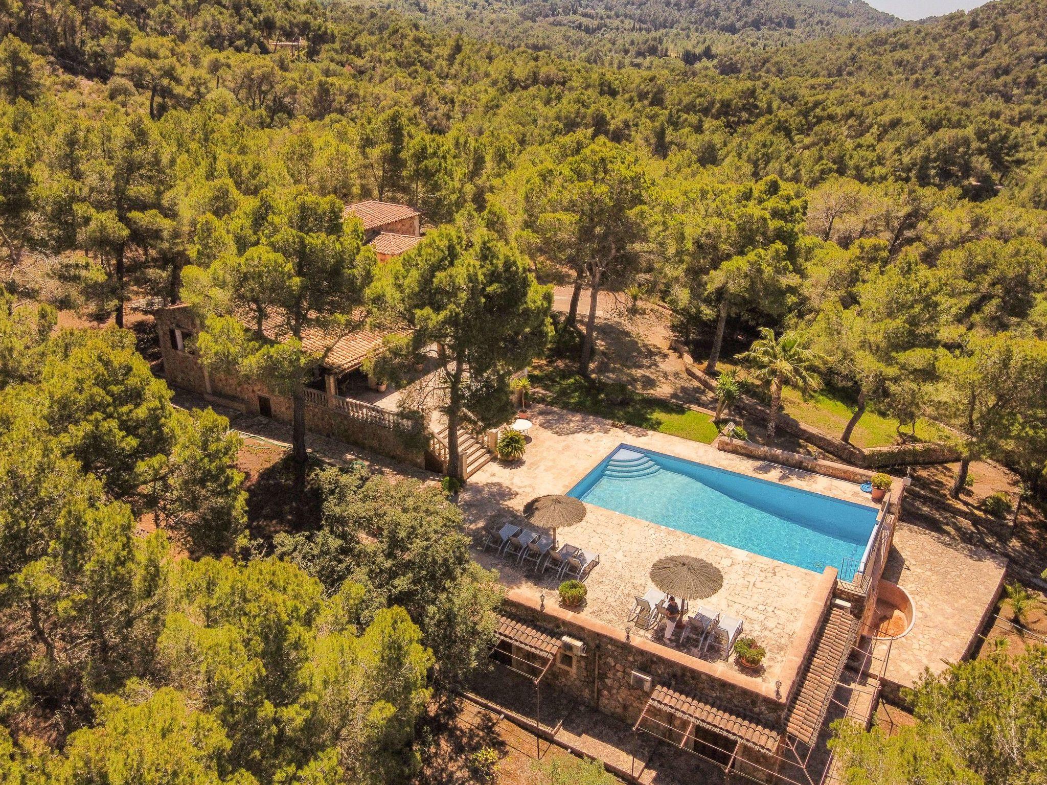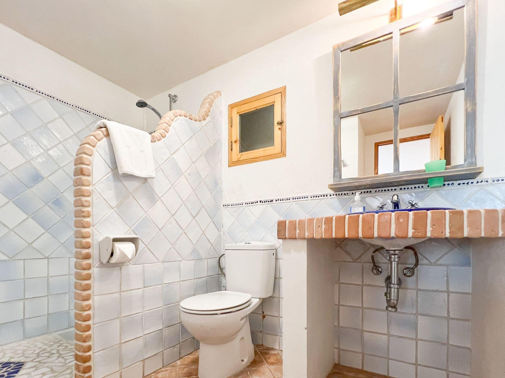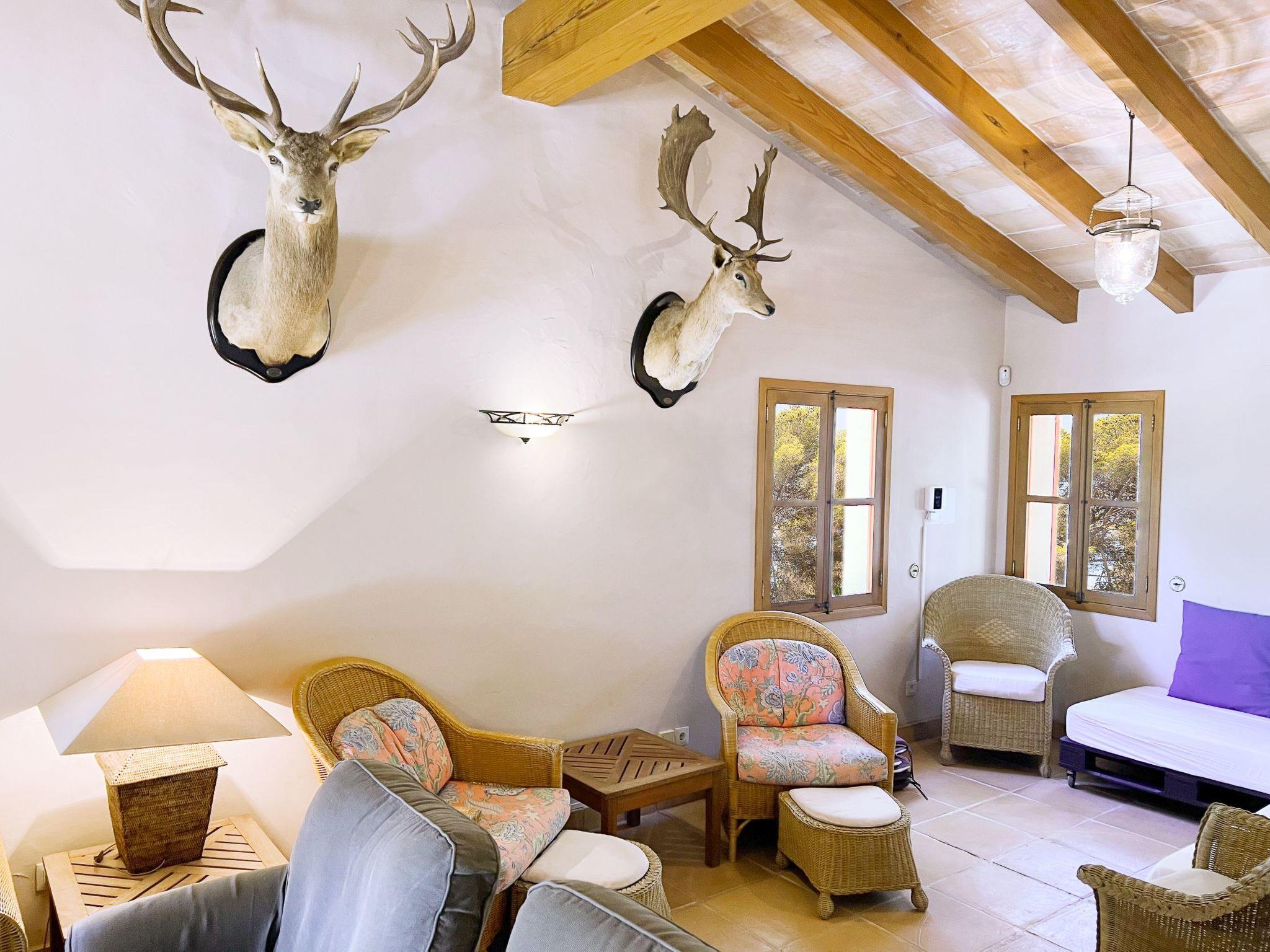 Finca Binifarda Dor is a marvellous country house with a typical country house design, such as high ceilings with wooden beams. The spacious house has plenty of natural light. The main house houses the kitchen, the living and dining area and 2 bedrooms. The other three bedrooms are located separately near the pool and from the outside a few steps lead us into the main house. On the ground floor there is a large open-plan area where the kitchen and the living/dining room are located. The furnishings are in a rustic style. The kitchen has a cooking island and is well equipped. A large dining table and a comfortable seating area invite you to linger. There is a great fireplace between the dining and living area. Next to the kitchen is the utility room and on the ground floor there is a bedroom for 1 person with access to the outside and a separate shower. A narrow wooden staircase leads to the upper floor with a double bed and an en-suite bathroom with a large corner bath. The bedroom can also be accessed from the outside. The other three bedrooms are located separately from the house on a lower level with access from the outside. There is one double bedroom with en-suite shower room and two twin bedrooms each with en-suite bathrooms. The bedroom on the first floor and the three separate bedrooms have hot/cold air conditioning with fixed and limited hours of use.